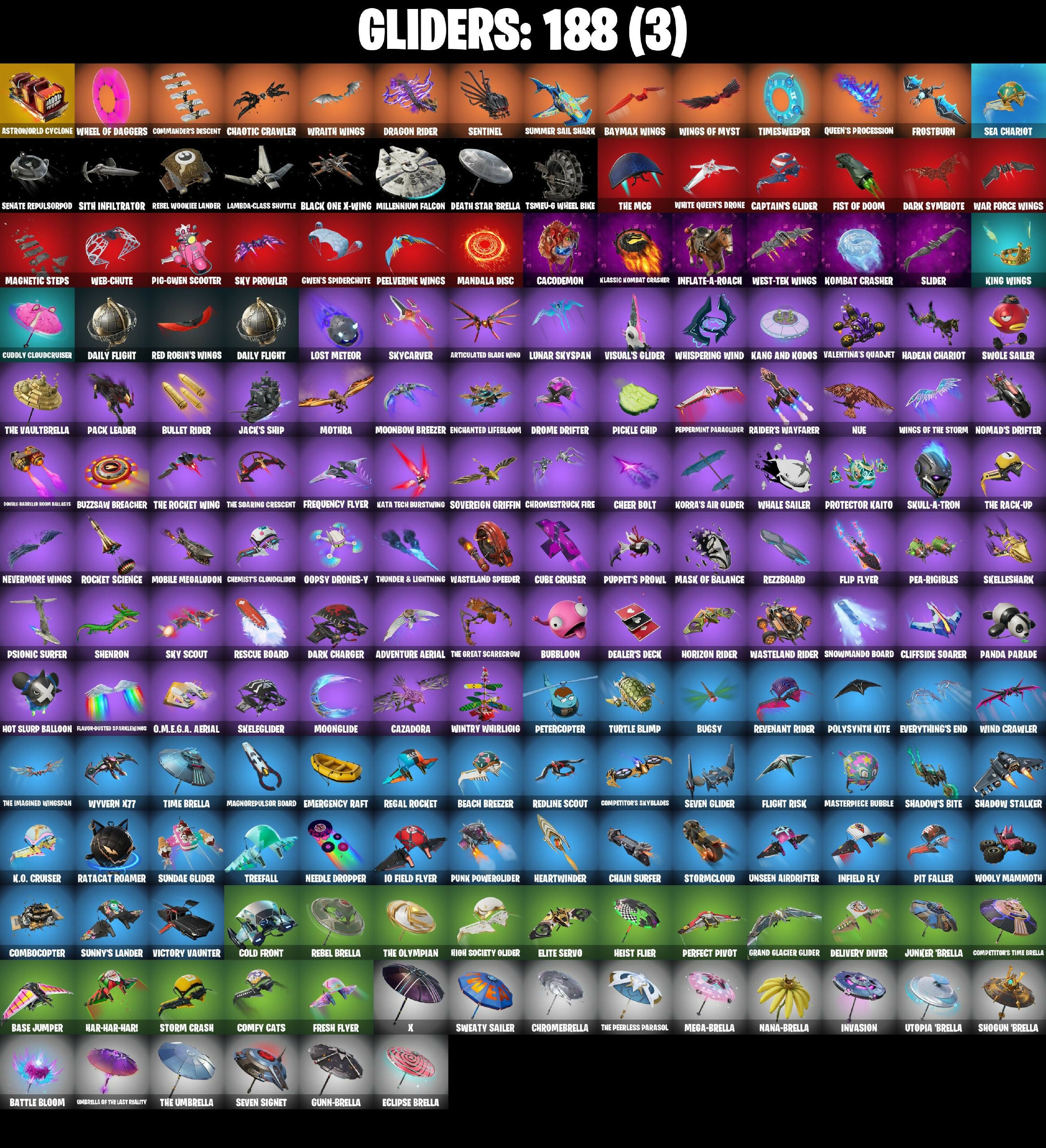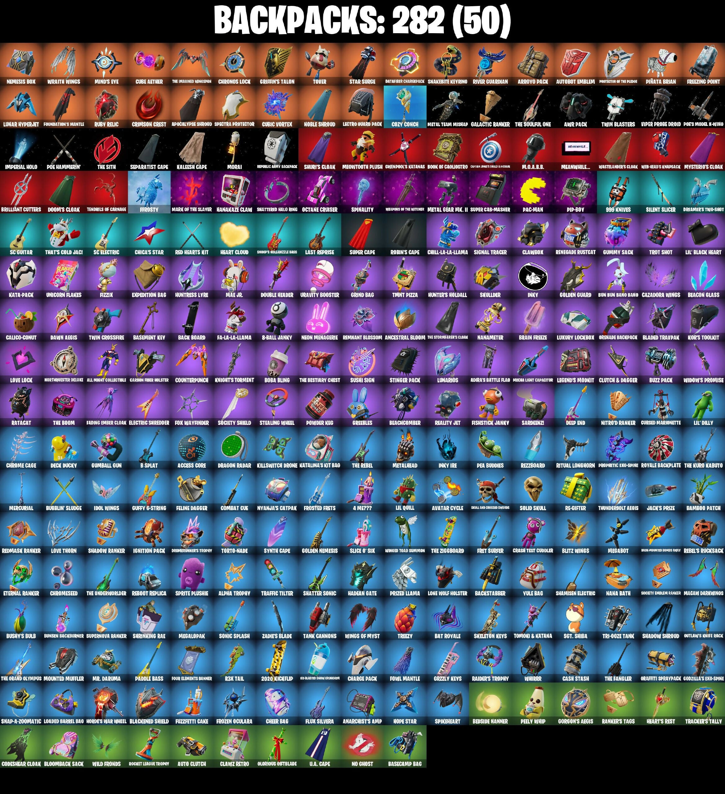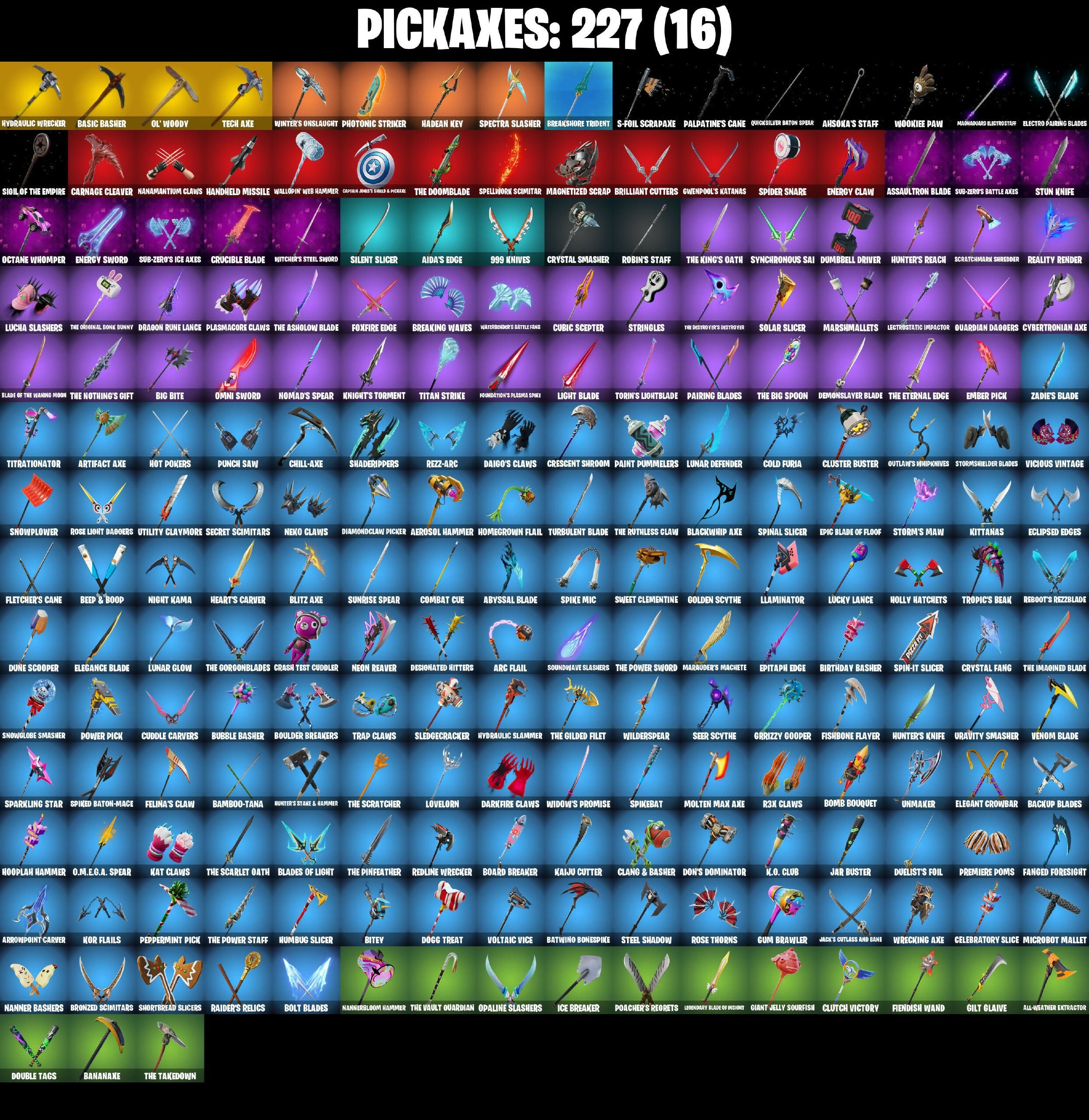 (Sniktt!), 1-Ball, 2020 Kickflip, 4 Me???, 8-Ball Janky, 999 Knives, AWR Pack, Absenz, Abyssal Blade, Access Core, Adira, Adira's Battle Flag, Adventure Aerial, Aerosol Hammer, Agent Patch, Ahsoka Tano, Ahsoka's Staff, Aida's Edge, All Might Collectible, All-weather Extractor, Alpha Trophy, Anarchist's Amp, Ancestral Bloom, Antonia, Aphrodite, Apocalypse Shroud, Apprentice Evie, Arachnrobatics, Arc Flail, Arcane Research, Arctic Adeline, Arrowpoint Carver, Arroyo Pack, Artemis, Articulated Blade Wings, Artifact Axe, Ascension Nezumi, Assaultron Blade, Astro Armor, Astroworld Cyclone, Augury, Aurelian, Aurorn Eques, Auto Clutch, Autobot Emblem, Avatar Cycle, Avatar's Flourish, Aw, Shucks., Ayla Quinn, B Splat, Back Board, Backstabber, Backup Blades, Balance Board, Balanced, Bamboo Patch, Bamboo-Tana, Bananaxe, Baron's Hoard, Base Jumper, Basecamp Bag, Basement Key, Basic Basher, Bat Royale, Battle Blessing, Battle Bloom, Battle-Tested, Batwino Bonespike, Baymax Wings, Beach Breezer, Beachcomber, Beacon Glass, Beatzbunny, Bedside Nanner, Beep & Boop, Bernie, Bi-Man, Big Bite, Big Dill, Big Fan, Bike To Go, Birdarang Flourish, Birthday Basher, Bitey, Black One X-Wing, Blackened Shield, Blackwhip Axe, Blade of the Waxing Moon, Bladed Travpak, Blades of Light, Blazing Fire Cerberus, Blitz Axe, Blitz Wings, Bloomback Sack, Blowin' Up, Blue Blood, Board Breaker, Boba Bling, Bolt Blades, Bomb Bouquet, Bone Breaker, Boogie Down, Book Of Cagliostro, Boosting Ki, Bora Snack, Boulder Breakers, Bow Go, Brain Freeze, Breaking Waves, Breakshore Trident, Brilliant Cutters, Brite Moves, Brite Raider, Bromerunner's Trophy, Bronzed Scimitars, Bubble Basher, Bubblegum Kigawire, Bubblin' Sludge, Bubblodon, Bugsy, Bullet Rider, Bullpen Breaker Dusty, Bun Bun Bang Bang, Bunsen Backburner, Burning Ember, Bushy's Bulb, Buzz Pack, Buzzsaw Breacher, Bytes, Cacodemon, Caffeinated, Calico-Conut, Call Me, Called Shot, Camo War Machine, Captain Jones, Captain Jones' Stella & Oculus, Captain Jones's Steel & Pickaxe, Captain Llamerica, Captain Phasma, Captain's Glider, Carbon Fiber Holster, Card Drop, Carnage, Carnage Cleaver, Cash Stash, Cassidy Quinn, Cauldron Chill, Cazadora, Cazadora Wings, Celebratory Slice, Cerberus, Chain Surfer, Chalked Up 1-Ball, Chaos Director, Chaotic Crawler, Charge Pack, Charging Up, Charlotte, Check The Map, Cheer Bag, Cheer Bolt, Chef's Special, Chemist's Cloudglider, Chica, Chica's Star, Chill-La-La-Llama, Chill-axe, Choice Knit, Chrome Cage, Chrome Punk, Chromebrella, Chromeseed, Chromestruck Fire, Chronos Lock, Chun-Li, Clang & Basher, Clawbox, Clawz Retro, Clean Sweep, Cliffside Soarer, Clone Trooper, Club President Elsie, Cluster Buster, Clutch & Dagger, Clutch Victory, Codeswear Cloak, Codsworth's Cleanup, Cold Blooded Ace, Cold Front, Cold Furia, Collector Kaido Thorne, Combat Cue, Combat Elite, Combocopter, Comfy Cats, Commander's Descent, Competitor's Skyblades, Competitor's Time Brella, Conch Call, Conjure Weapon, Count It!, Counterpunch, Cozy Conch, Crack It, Crash Test Cuddler, Crescent Shroom, Crimson Crest, Crowning Achievement, Crucible Blade, Crystal Fang, Crystal Smasher, Crystalline, Cube Aether, Cube Cruiser, Cubic Scepter, Cubic Vortex, Cuddle Carvers, Cuddly Cloudcruiser, Cursed Marionette, Cybertronian Axe, Cyclo Curl, Dagger Dance, Daigo, Daigo's Claws, Daily Flight, Danica, Dark Charger, Dark Gwenpool, Dark Symbiote, Darkfire Claws, Darklands Brite Raider, Darth Vader, Datafiber Chargepack, Dawn Aegis, Dawn Dulset Nisha, Deadnotstruck Director, Dealer's Deck, Death Star 'Brella, Deck Ducky, Deep End, Delivery Diver, Demon Hunter Hope, Demonslayer Blade, Designated Hitters, Diamond Armor Grrz, Diamond Throne, Diamondclaw Picker, Dice Roll, Die With A Smile, Die With A Smile Bruno, Dillinger The Orror, Dino Menozzoro, Dirtbike Challenge, Do The Split, Doctor Strange, Dogg Treat, Don's Dominator, Doom, Doom Slayer, Doom's Cloak, Doom's Domain, Double Header, Double Tags, Double-Barreled Doom Ballista, Doze Dab, Dragon Radar, Dragon Rider, Dragon Rune Lance, Dramatic Flares, Dreamer's Two-Shot, Drome Drifter, Duelist's Card Trick, Duelist's Foil, Dumbbell Driver, Dune Scooper, Duske Knight, Dusty, Dynamo Tintina, Dynamo Tintoon-0, Eclipse Brella, Eclipsed Edges, Electric Shredder, Electro Pairing Blades, Electrostatic Impactor, Elegance Blade, Elegant Crowbar, Elite Servo, Ember Pick, Emergency Raft, Emma Frost, Emperor Palpatine, Empress Fan Dance, Enchanted Lifebloom, Energized Godzilla, Energy Claw, Energy Sword, Epic Blade of Floof, Epitaph Edge, Era, Eren Jaeger, Erisa, Eternal Ranker, Everything's End, Evie, Expedition Bag, Explorer Emilie, Expressionism, Fa-La-La-Llama, Fabio Sparklebane, Fading Ember Cloak, Fang Dance, Fanged Foresight, Fashstick Janky, Feel The Force, Felina, Felina's Claw, Feline Dagger, Fiendish Wand, Fire Show, Fish Thicc, Fishbone Flayer, Fist Bump, Fist of Doom, Fizzik, Flaky Feast, Flashback Breakdown, Fletcher Kane, Fletcher's Cane, Flight Risk, Flip Flyer, Flippin' Away, Flux Silvera, Foil Flex, Force Lightning, Foundation's Mantle, Foundation's Plasma Spike, Four Elements Banner, Fowl Mantle, Fox Wayfinder, Foxfire Edge, Freezing Point, Frequency Flyer, Fresh Flyer, Fret Surfer, Frostbite, Frostburn, Frosted Frets, Frosty, Frozen Oculara, Frozen Treat Cart, Full Tilt, Fuzzetti Cake, Galactic Ranker, General Grievous, Geralt Of Rivia, Get Griddy, Get Out Of Your Mind, Giant Jelly Sourfish, Gildhart, Gilt Glaive, Givenpool's Katanas, Glorious Outblade, Godzilla Evolved, Godzilla's Exo-Spine, Gold Blooded Ace, Golden Guard, Golden Nemesis, Golden Rune Charlotte, Golden Rune Fabio, Golden Scythe, Golden Shade (Pink & Mix), Good Game, Well Played, Good Guy, Gorgon's Aegis, Graffiti Spraypack, Grand Glacier Glider, Greebles, Grenade Backpack, Griffin's Talon, Grind Bag, Grizzly Keys, Grizzy Gooper, Grrz, Guardian Daggers, Guffy 6-String, Gum Brawler, Gumball Gun, Gumbo, Gummy Sack, Gunn-Brella, Gunnar, Gwen Stacy, Gwen's Spiderchute, Gwen-S