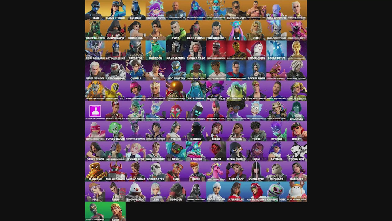8-Ball, Abbey, Agent Jones (Jump 31), Agent Patch, Ahsoka Tano, Alli, Ambush, Antonia, Anvil, Arctic Adeline, Artemis, Ascension Neon, Ascension Nezumi, Astro Armor, Astro Gamer Default Set, Aura, Axe, Axeroni, Axiom, Backbreaker, Backlash (Pixelheart), Backpacker, Balanced, Bash, Basic Basher, Bass Blaster, Battle Hawk, Battle Pikes, Beater, Big Chill, Biter Long Traveling, Blackheart, Blade, Blazing Claw, Blazing Fire Cerberus, Blazing Top Cressida, Blockbuster, Blue Viper, Bone Axe, Bone Club, Bone Spike, Bonesaw, Bonetooth, Boulder Breaker, Breaker, Breakin' Point, Brogo, Bugcha, Bunker Jonesy, Burnout, Bytes (Lone Traveler), CCU Pick, CONTACT WRENCH, Calamity, Candy Axe, Carnage (Maximum), Carnage (Premium), Cerberus, Chad Axe, Chalked Up 1-Ball, Chaos Director, Charlotte, Chestnut, Chisel, Chop Shop, Chrome Punk, Chun-Li, Clark Kent (Superman), Claw, Claws, Cleet's Shield, Cloud Striker, Cluck, Cluck (Slurpy), Clutch Power, Cobalt Overdrive, Collector, Colorpop, Conqueror, Cooler, Cosmic Cleaver, Council Slash, Cozy Coif, Cracked IQ, Crewmate Pickaxe, Crooked Fang, Crowbar, Crusher, Crystal Clearing, Crystal Scythe, Cupcake Shredder, Cutlass, Cymitar, DJ Yonder, Dagger, Daggers, Dark Axe, Dark Bomber, Dark Violet, Darvel Dixon, Deadpool, Deadpool 2099, Default Pickaxe, Deimos, Dino Megazord, Dire, Doctor Doom, Doctor Slone (Prismatic), Doctor Strange, Doom, Dr. Guggimon, Dragon Axe, Dragon's Claw, Dusk, Dusty, Dynamo Tintina, Elevation, Eli Tomuz, Energy Axe, Evacuator, Event Pickaxe, Fade (Solstice), Famious Hunter, Famo (Splash Damage), Fang, Feat, Fixer, Flawless Scythe, Flintknuckle, Flip Knife, Fluffy Flurry, Flurry Foam, Foamy, Forbidden Grove, Fossa, Frost (Cyberstrike), Frost Squad, Frostbite, Frozen Fishstick, Fusion, Fusion Scythe, Galaxy Scythe, Gale Force, Ghost (Skull Beauty), Gift Box, Glacier Pick, Glooper Stick, Gold Midas, Golden Scythe, Grace, Green Arrow, Grenade Launcher, Grid, Gridiron, Grim's Glow, Grriz, Guaco Drop-O, Guggimon (Prismatic), Guiding Star, Gumbo (Sour), Gunslinger, Gut Wrench, Halcyon's Memento, Half Pipe, Hangtime, Harlowe (Helmet), Harmonica, Harpoon, Harvester, Haven (Tropical Gusher), Hawkman, Head (Droopv), Head (Droopy), Headcrasher (Skull Beauty), Heartbreaker Aphrodite, Heat Rock, Heist, Helsie, High Hoops, Holiday Helper, Hollow Point, Hookjaw, Horizon Edge, Hot Rod, Hybrid, Ice Breaker, Ice King Axe, Ice Pop, Ice Shard, Icebreaker, Icicle, Iconic Era, Icy Pick, Imani, Immortal Form, Inferno Axe, Ink, Iris, Iron Man, J.B. Chimpanski (Helmet), Jack-o'-Smasher, Jawbreak, Jetstream, John Wick, Jolt, Jonesy, Jupiter, Jury Rig, Kado Thorne, Koi (Trenchcoat), Kondor, Kor (Trenchcoat), Krisabelle, Kymera, L.A. Waveform (Default Set), LTM Rewards, La Elefanta (Helmet), Lance, Lancer, Laser Lance, Laserlight (Gold Anniversary), Leatherback, Legendary Axe, Lennox Rose, Lexa, Llama Axe, Llambro, Lollipopper, Lorenzo The Reckless, Lt. John Llama, Lt. John Llama (Gold Revolver), Lynx, Mae, Maeve, Magnum, Mags, Mancake, Mandalorian, Marauder, Mariposa, Master Chief, Meow Skulls, Meowdas, Metal Team Leader, Midas, Midnight Skye, Millionaire's Pick, Minty Pickaxe, Mister Shield, Mittens, Moonlight, Mutiny, Mysterious Box, Mystery Box, Mystica, Neeka (Doodle Master), Neon Brawler Merrie Flames, Neon Strike, Nerf Axe, Neymar Jr (Exhibition), Night Dagger, Night Noxah (LRND), Nite Scythe, Nitehare, Nitelite, Nolan Chance, Ocean, Ol' Woody, Old One's Axe, Optimus Prime, Overbite, P-Ball, P.A.N.D.A Team Leader, Paradigm (Aurelian), Paradox (Default Set), Pedestal Pickaxe, Peely, Penetrator, Perfect Point, Pick Squeak, Pierce, Piercer, Piper Pace, Plasma Axe, Plunja Pickaxe, Point Patrol, Poki, Polar Bear, Polar Peely, Pole Axe, Pop Axe, Poseidon, Positron, Predator, Prybar, Purple Side New Vigor, Rachel Roth, Rainslasher, Raptor, Raven, Raven Reaver, Raven's Claw, Raz, Razorblade, Reaper, Red Jade, Red Nose, Red Revolver, Redline, Reef Cake Fish Thicc, Reef Gamerfish Toad, Reese, Regal Axe, Reiyuki, Rejects, Relik, Remedy, Renegade, Renzo The Destroyer, Revenge, Revenge Hammer, Rian, Rick Sanchez, Rick Sanchez (Prismatic), Ripe Fire, Ripjack, Ripjaw, Ripper, Road Warden, Ronin (Cape), Rose Glow, Rox, Ruby (Cracked Try-Hard), Ryu, Saber, Saberwing, Samurai, Sandstone Joey, Santana, Scarlet Commander, Scorcher, Scrap Shredder, Scratch, Scuba Jonesy, Scythe, Scythe of the Lost, Sgt. Winter, Sha'rta (Neonpops), Shadow, Shadow Stake, Shanta (Headpiece), Shimmering Edge, Shooky, Shortcut, Shortstab, Shortstop, Signature Axe, Silk Sonic, Sing Along, Siona, Skin Stash, Skull Sickle, Slayer Juice Wild, Sled Ready Buff, Sledgehammer, Slice, Slone's Pick, Slugger, Slushy Swinger, Snowdog, Snowflake, Snowman, Snowmando, Solid Striker, Specialist Peely, Spectre, Spew the Brew, Spider-Gwen, Spider-Man, Spider-Man (Gilded Beauty), Spike, Spiked Knuckles, Spire Assassin, Spiritbreaker, Splashdown, Square Up, Squire, Staff of Doom, Stakeout, Star Wand, Starsteel, Steel Shadow, Stellar Axe, Stone Sorceress Medium, Stop Axe, Storm, Sultura, Summit Seeker, Sunlit Selene, Sunny (Prismatic), Sunny (Psychetrak), Sweet Tooth, Swift Axe, Synaptic Hatchets, Tac-Axe, Tackle, Tall Tale, Tango, Tarana, Tarana (Knightston Armor), Teknique, Tenderizer, Terra Squadron Marauder, Thanos Watches!, The Ageless, The Crowbar, The Cube Queen (Islander), The Foundation (Helmet Off), The Foundation Default Set, The Ice King, The Ice Queen, The Mandalorian, The Reaper, The Sharp Classical Default Set, TheSigma, Thor, Thrash, Thrasher Massai, Thrasher Mossad, Throwback Axe, Thunder, Thunderclap, Tickle Me Tomatoes, Tiger's Claw, Timebreaker, Titan Pick, Tomahawk, Tony Stark, Toona Fish, Torin (Sideways Warrior), Trace, Traditional Hanby, Traditional Khaby, Trapjaw, Travis Scott, Trident, Trog, Tusk Breaker, Tusk Crushers, Twitch Prime, Twyn, Typhoon, UNSC Spartan, Ultimate Ghoul Trooper, Valor, Van Gogh, Veggie Pole, Venomizer, Vibroblade, Viking Axe, Viking Pick, Vindertech, Vindertech Axe, Viper S