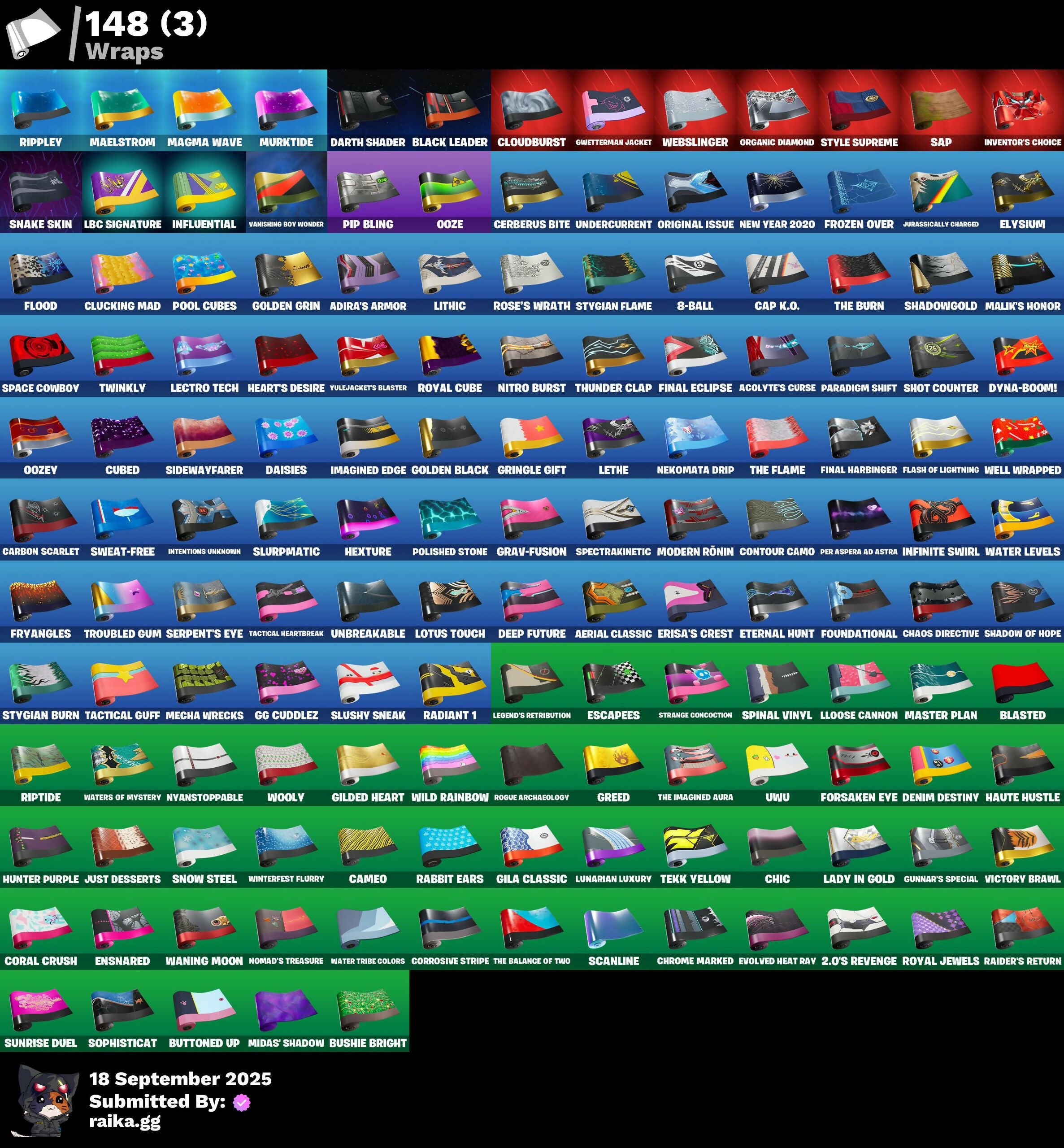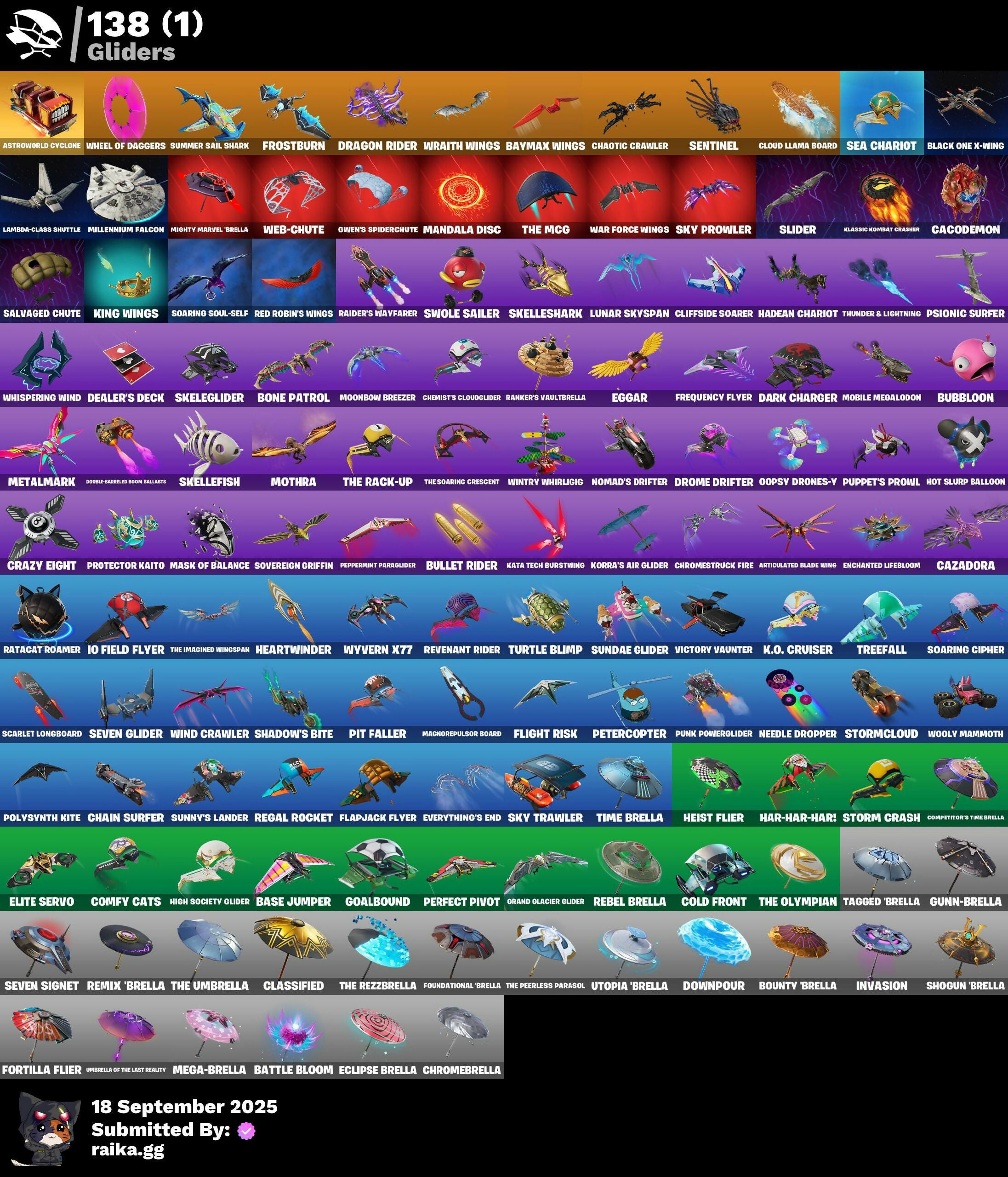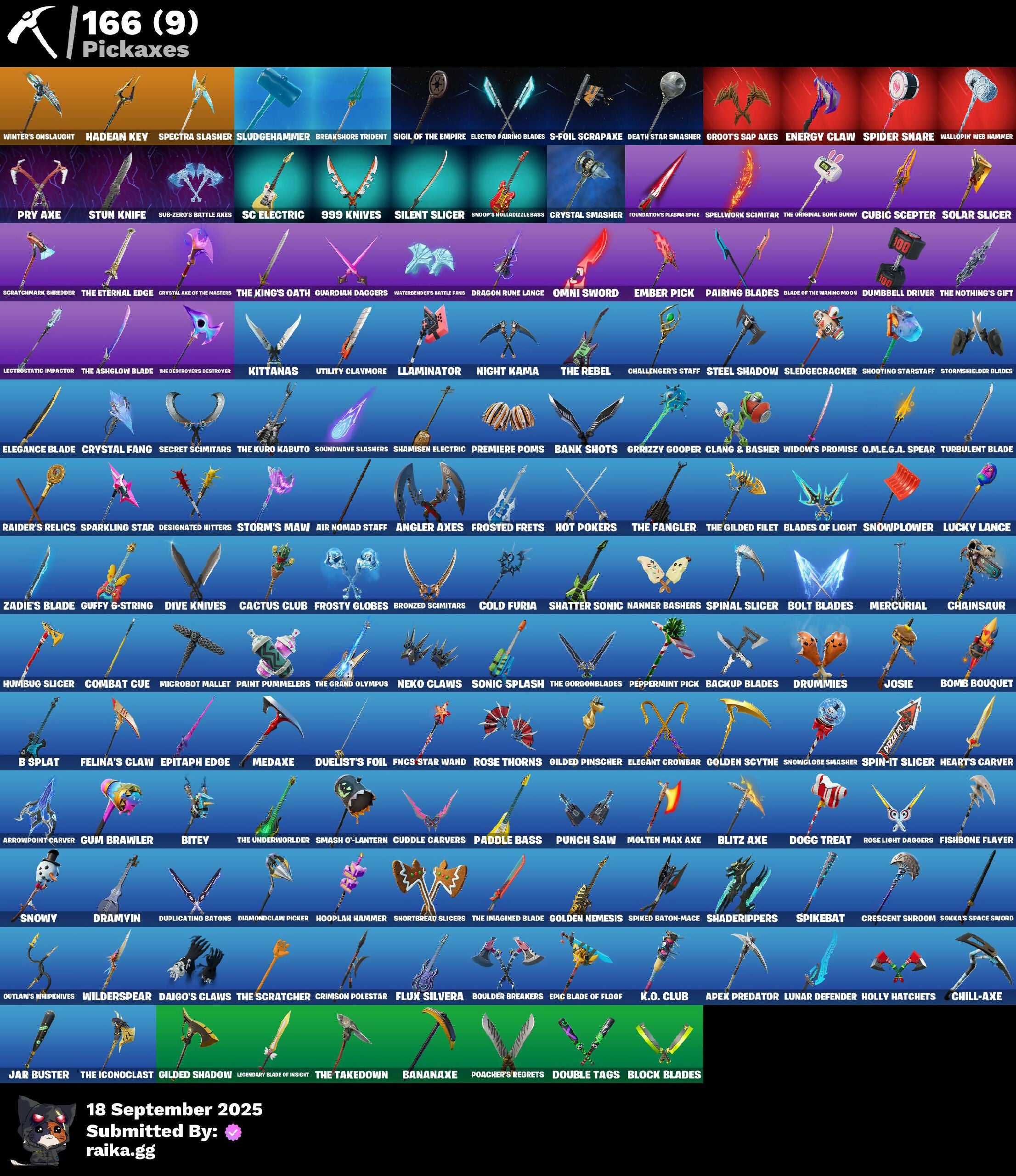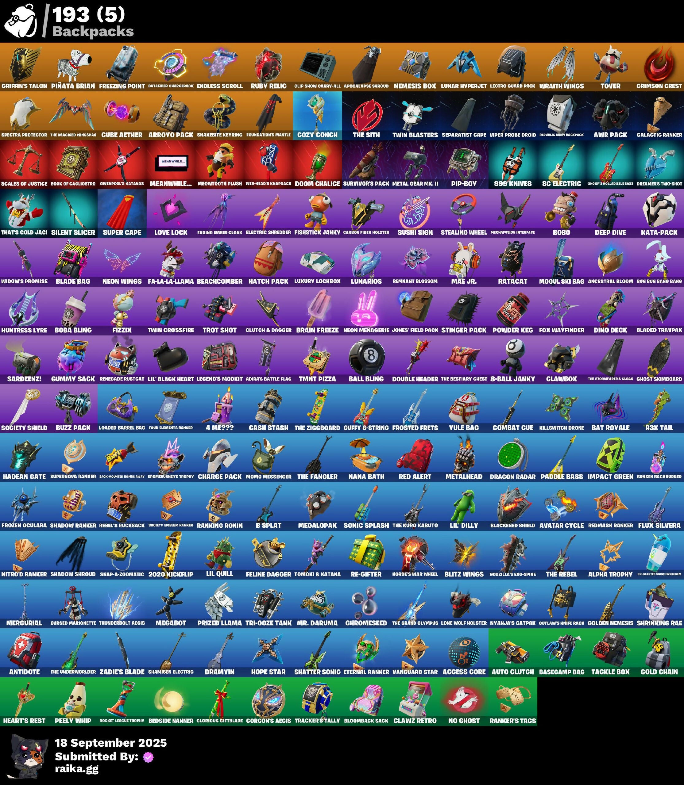 1-Ball, 2.0's Revenge, 2020 Kickflip, 2022, 4 Me???, 8-Ball, 8-Ball Janky, 8-Ball Vs Scratch, 999 Knives, A.L.T.E.R., Aang, Aang's Air Sphere, Access Core, Acolyte's Curse, Adira, Adira (Battle Mask), Adira's Armor, Adira's Battle Flag, Aerial, Aerial Classic, Aerial Swagger, Agent Jones, Agent Jones (Jump 31), Agent Peely, Alpha Trophy, Ancestral Bloom, Angler Axes, Antidote, Antonia, Antonia in Action, Apex Predator, Aphrodite, Apocalypse Shroud, Arachnrobatics, Arctic Achiever, Arctic Adeline, Arrowpoint Carver, Arroyo Pack, Artemis, Articulated Blade Wing, Astro Jack, Astroworld Cyclone, Aura, Auto Clutch, Avatar Aang, Avatar Cycle, Avatar State Aang, Avatar’s Flourish, Awr Pack, Axo's Big Moment, B Splat, B.R.U.T.E. Competitor, Babygirl!!!, Back-Mounted Bombs Away, Backup Blades, Balanced, Ball Bling, Bananaxe, Bank Shots, Baron Kane, Baron's Hoard, Base Jumper, Basecamp Bag, Bat Royale, Battle Blessing, Battle Bloom, Battle Mode, Bawk Off, Baymax Wings, Beachcomber, Bedside Nanner, Beef Blade, Beep Beep, Bees!, Big Guns, Bitey, Bitter Sweets, Black Leader, Black One X-Wing, Blackened Shield, Blade Bag, Bladed Travpak, Blades of Light, Blasted, Blitz Axe, Blitz Wings, Block Blades, Blocko, Bloomback Sack, Blowin' Up, Boba Bling, Bobo, Bolt Blades, Bomb Bouquet, Bombastic Winterfest, Bone Patrol, Boogie Down, Book of Cagliostro, Boots 'N' Cats, Both Eyes Open, Boulder Breakers, Bounty 'Brella, Brain Freeze, Breakshore Trident, Brite & Speedy, Bronzed Scimitars, Bubbloon, Bullet Rider, Bullseye, Bun Bun Bang Bang, Bun Bun Blast, Bunsen Backburner, Burning Ambition Valeria, Bushie Bright, Buttoned Up, Buzz Pack, Bytes, Bytes (Lone Traveler), Bytes' Sigil, C'Mere, Cacodemon, Cactus Club, Call Me, Cameo, Cameo Vs Chic, Cap K.O., Carbon Fiber Holster, Carbon Scarlet, Card Drop, Cardistry, Cash Grab, Cash Stash, Cazadora, Cerberus, Cerberus Bite, Cerberus Medallion, Chain Surfer, Chainsaur, Chalked Up 1-Ball, Challenger Cerberus, Challenger's Staff, Chaos Directive, Chaos Director, Chaotic Crawler, Chapter 3 Season 2 Level 100, Charge Pack, Charlotte's Logo, Chemist's Cloudglider, Chic, Chill-Axe, Chillshot, Chipmanks Wants You, Choice Knit, Chomp Cudi!, Choose Naughty, Choppy, Chrome Marked, Chrome Punk, Chromebrella, Chromeseed, Chromestruck Fire, Clang & Basher, Classified, Clawbox, Clawz Retro, Clean Sweep, Cliffside Soarer, Cloud Llama Board, Cloudburst, Cluck, Cluck (Slurpy), Clucking Mad, Clutch & Dagger, Cold Front, Cold Furia, Combat Cue, Combat Giller, Comfy Cats, Competition Medusa, Competitor's Time Brella, Conch Call, Conjure Weapon, Console Cup, Contour Camo, Controlled Chaos, Coral Crush, Corrosive Stripe, Count It!, Courageous Mikasa, Cowboy Chat, Cozy Conch, Crack It, Crashed Chiller, Crazy Eight, Creed's Gloves, Crescent Shroom, Crimson Crest, Crimson Polestar, Cross Your Heart, Crowning Achievement, Crystal, Crystal Fang, Crystal Smasher, Cube Aether, Cube Marking, Cubed, Cubic Scepter, Cuddle Carvers, Cuddles' Garden, Curling Iron, Cursed Marionette, Cyclo Curl, D.C. 63, Dagger Dance, Daigo, Daigo's Claws, Daisies, Dark Charger, Dark Side Rising, Darth Shader, Darth Vader, Datafiber Chargepack, Daughter of Trigon, Dawn Duelist Nisha, Dealer's Deck, Death Star Smasher, Deep Dive, Deep Future, Deku, Demon Hunter Hope, Demons Beware, Denim Destiny, Designated Hitters, Determined Kendo, Determined Korra, Determined Renegade, Diamond Claw Picker, Diamond Shapes, Diamond Throne, Dice Roll, Dino Deck, Direct The Chaos, Dirtbike Challenge, Diva's Grin, Dive Knives, Do The Split, Doctor Doom, Doctor Strange, Dogg Treat, Doggo, Doom Chalice, Doomerunner's Trophy, Double Header, Double Tags, Double-Barreled Boom Ballasts, Downpour, Doze Dab, Dragon Radar, Dragon Rider, Dragon Rune Lance, Dragon Rune Lances, Dragon Spirit, Dramvin, Dramyin, Dreamer's Two-Shot, Drome Drifter, Drones-y View, Droop, Dropout, Drummies, Duelist's Foil, Dumbbell Driver, Dumbell Driver, Dupli-Kate, Duplicating Batons, Duplikates, Dusk Knight, Dyna-Boom!, Dynamic Tntina, Dynamo, Dynamo TNToon-A, Dynamo Tntina, E.G.O., Easter Egg, Eclipse Brella, Eggar, Electric Shredder, Electro Pairing Blades, Elegance Blade, Elegant Crowbar, Elemental Cycle, Elite Servo, Elysian Artemis, Elysium, Ember Pick, Emma's Influence, Enchanted Lifebloom, Endless Scroll, Energized Godzilla, Energy Claw, Ensnared, Epic Blade of Floof, Epitaph Edge, Erisa, Erisa (Stealth Silver), Erisa Alert, Erisa's Crest, Escapees, Eternal Hunt, Eternal Ranker, Evasive Maneuvers, Everything's End, Everything's Fine, Evie, Evie (Summer Strider), Evolved Heat Ray, Eye of Agomotto, Fa-La-La-Llama, Fading Ember Cloak, Fan Attack, Fancy Peter Griffin, Felina, Felina's Claw, Feline Dagger, Final Eclipse, Final Harbinger, Fish Hook, Fish Thicc, Fishbone Flayer, Fishtick Janky, Fist Bump, Fizzix, Flaky Feast, Flapjack Flyer, Flash of Lightning, Flashback Breakdown, Flight Risk, Flippin' Away, Flood, Flux Silvera, Fngs Star Wand, Foil Flex, Forsaken Eye, Fortilla Flier, Foundation's Mantle, Foundational, Foundational 'Brella, Four Elements Banner, Fox Wayfinder, Freezing Point, Frequency Flyer, Frostbite, Frostburn, Frosted Frets, Frosty Globes, Frozen Oculata, Frozen Over, Fryangles, Fusion!, Galactic Ranker, Gangnam Style, Geared Up, Get Griddy, Gg Cuddlez, Ghost Skimboard, Gila Classic, Gilded Heart, Gilded Pinscher, Gilded Shadow, Glorious Giftblade, Glyph Master, Goalbound, Godzilla Awaits, Godzilla Evolved, Godzilla's Exo-Spine, Gold Chain, Golden Black, Golden Goal, Golden Grin, Golden Nemesis, Golden Scythe, Golden Wolf, Good Game, Well Played, Gorgon's Aegis, Grand Glacier Glider, Grav-Fusion, Greed, Griffin's Talon, Grim King Hades, Gringle Gift, Grizzly Gooper, Groots Sap Axes, Groovy!, Grriz, Grriz (Wild Beary Grriz), Grrizzy Gunz, Guardian Daggers, Guardian Jade, Gucci Was Here, Guffy 6-String, Guffy G-String, Guild, Gum Brawler, Gumbo, Gumbo (Sour), Gummy Sack, Gunn-Brella, Gunnar, Gunnar's Special, Gwen's Spiderchute, Gwenpool's Katanas, 