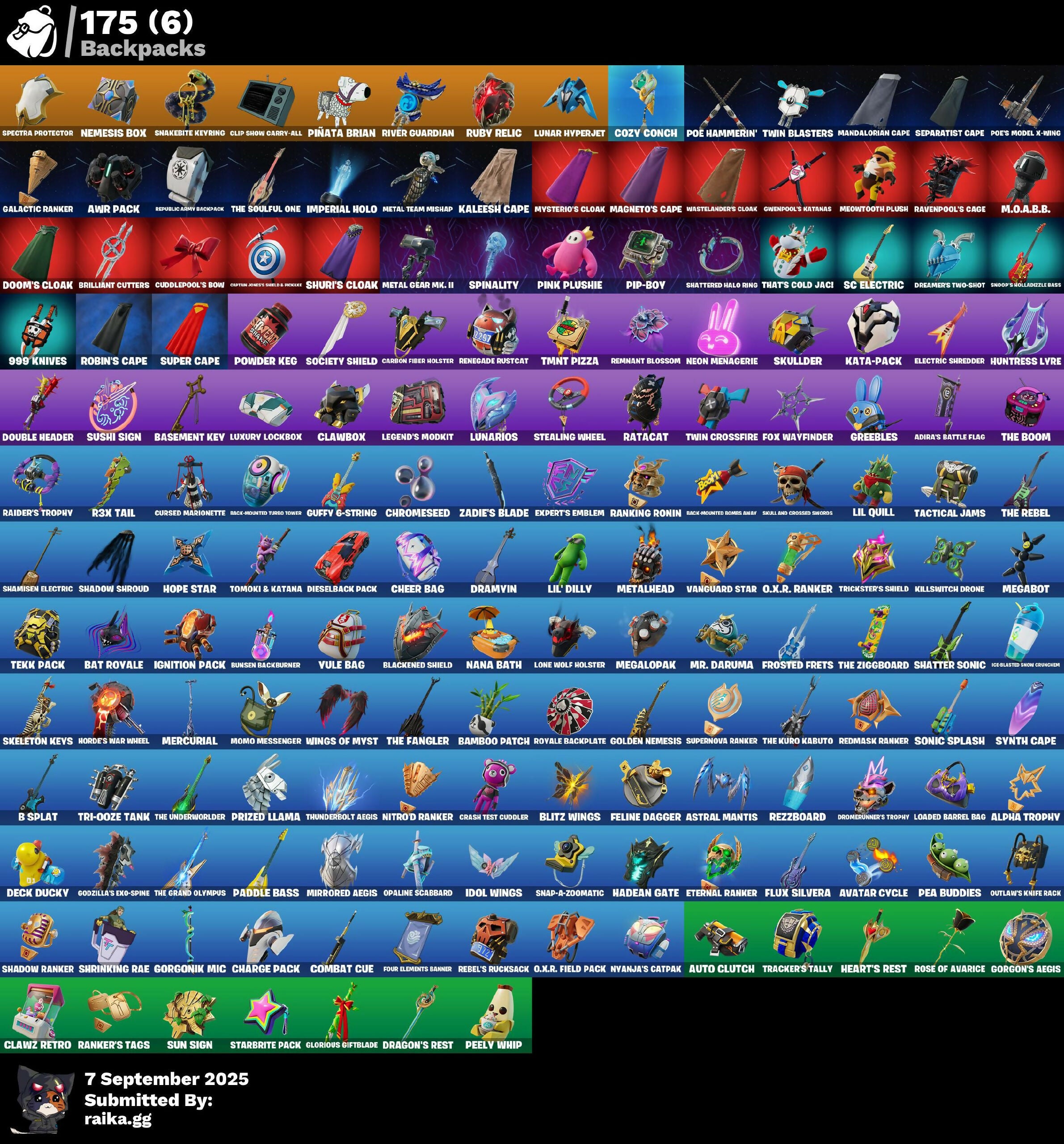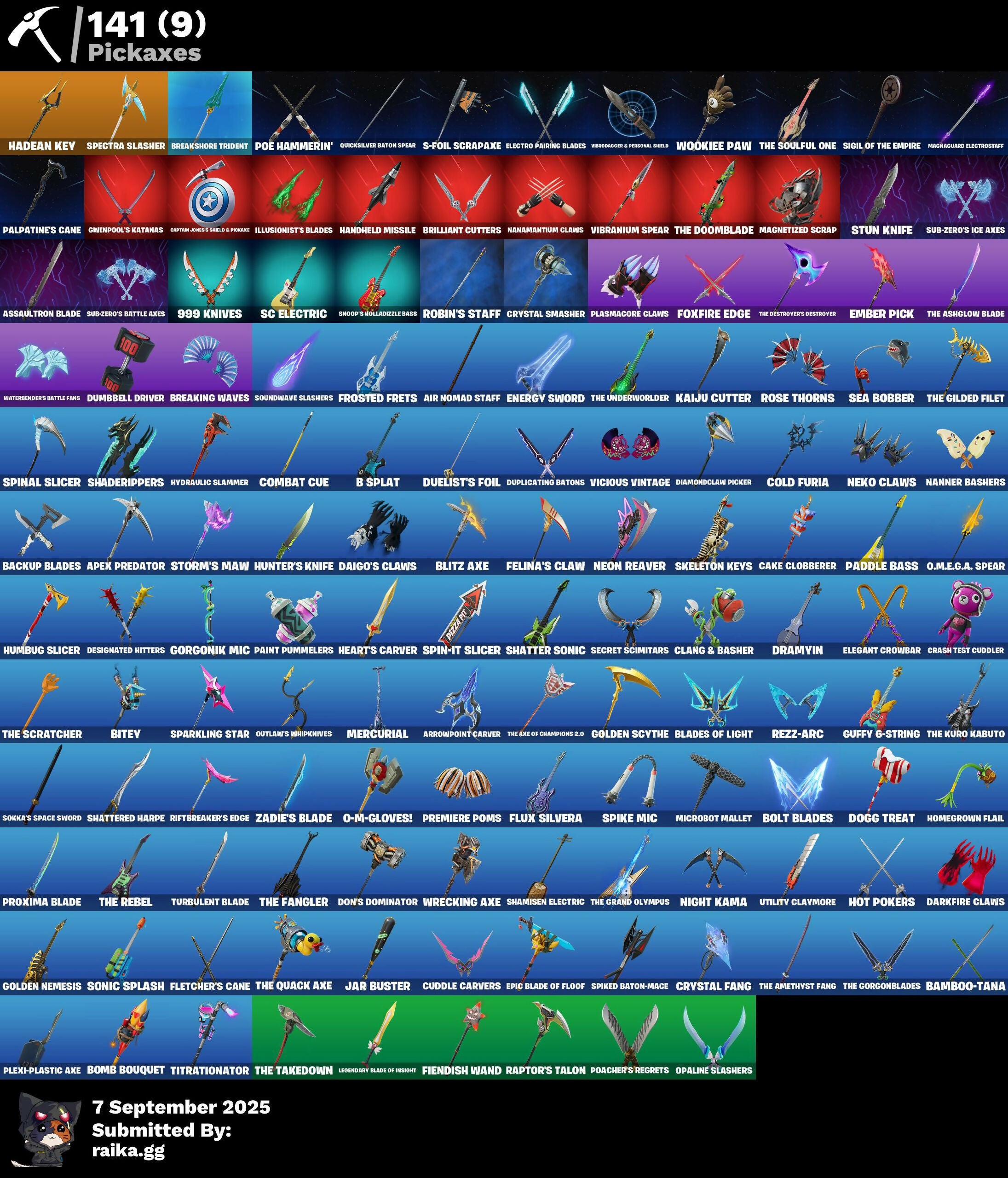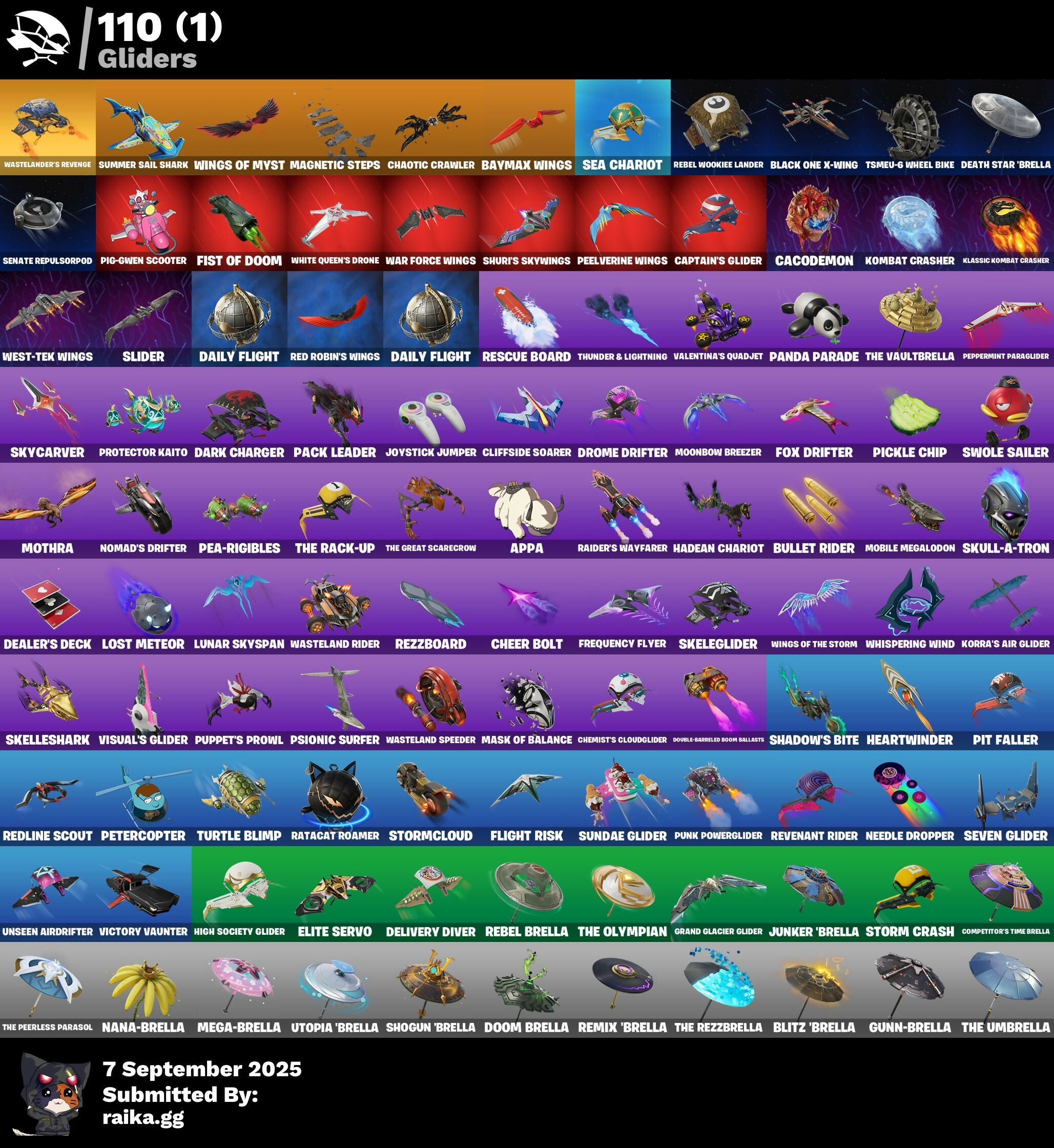 (SnikT!), 1-Ball, 212th Battalion Trooper, 501st Trooper, 999 Knives, A-W-R Pack, Aang, Aang's Air Sphere, Ace Pilot Poe, Ad Victoriam!, Adira's Armor, Adira's Battle Flag, Aerial, Aerial Classic, Aerial Swagger, Agent Patch, Ahsoka Tano, Ahsoka's Clone Trooper, Air Nomad Staff, All-Nighter, Alpha Trophy, Apex Predator, Aphrodite, Appa, Appeeling Drive, Apprentice Evie, Arcade Cat, Arcane Research, Arctic Achiever, Armored Victory, Arrowpoint Carver, Artemis, Artemis Insignia, Assaultron Blade, Astral Mantis, Auntie Dot, Auto Clutch, Avatar Aang, Avatar Cycle, Avatar State Aang, Avatar's Flourish, Axo's Big Moment, B Splat, BabyGirl!!, Back-Mounted Bombs Away, Back-Mounted Turbo Tower, Backup Blades, Balanced, Bam-Boom!, Bamboo Patch, Bamboo-Tana, Baron's Hoard, Basement Key, Bat Royale, Battle Blessing, Battle Gamer Mae, Battle Mode, Battle Ready Poe, Baymax Wings, Belt It!, Beskar Forge, Bi-Han, Big Dill, Bike To Go, Birdarang Flourish, Birthday Bud, Bitev, Black Knight T-60 Power Armor, Black Leader, Black One X-Wing, Black Panther (Shuri), Black Queen, Blackened Shield, Blades of Light, Blazing Fire Cerberus, Blitz 'Brella, Blitz Axe, Blitz Wings, Blocko, Bolt Blades, Bomb Bouquet, Boogie Down, Boot It, Breaking Waves, Breakshore Trident, Brilliant Cutters, Brite & Speedy, Brite Agent, Brite Moves, Brite Raider, Bullet Rider, Bunsen Backburner, Burning Ambition Valeria, Bushie Bright, Bytes' Sigil, C.T.L, Cacodemon, Cake Clobberer, Camo War Machine, Captain Jones, Captain Jones's Shell & Pickaxe, Captain Llamerica, Captain's Glider, Carbon Fiber Holster, Card Drop, Cassidy Quinn, Cauldron Chill, Cerberus, Cerberus Bite, Cerberus Medallion, Chalked Up 1-Ball, Chaos Directive, Chaos Director, Chaotic Crawler, Charge Pack, Cheer Bag, Cheer Bolt, Chef's Special, Chemist's Cloudglider, Choose Naughty, Chrome Marked, Chromeseed, Clang & Basher, Classic Peelverine, Clawbox, Clawz Retro, Cliffside Soarer, Clip Show Carry-All, Clone Trooper, Codsworth's Cleanup, Cold Furia, Combat Cue, Competitor's Time Brella, Conch Call, Confident Iridia, Conjuring Mysterio, Contour Camo, Controlled Chaos, Coral Crush, Corrosive Stripe, Corrosive Tag, Coruscant Guard, Courageous Mikasa, Cozy Conch, Crash Test Cuddler, Crashed Chiller, Crashed Shield, Cross' Grand Entrance, Crowning Achievement, Crystal Fang, Crystal Smasher, Cuddle Carvers, Cuddle's Garden, Cuddlepool, Cuddlepool's Bow, Cuddly Games, Cursed Marionette, Cyclo Curl, Daigo, Daigo's Claws, Daily Flight, Daisies, Dark Charger, Darkfire Claws, Darth Jar Jar, Dawn Duelist Nisha, Dealer's Deck, Death Star 'Brella, Deck Ducky, Delivery Diver, Demogorgon, Demon Hunter Hope, Designated Hitters, Destroyer Signature, Determined Kendo, Determined Korra, Determined Renegade, Diamond Throne, Diamondclaw Picker, Dice Roll, Dieselback Pack, Dill With It, Dillicious, Dillinger The Gherk, Disassemble, Diva's Grin, Dogg Treat, Don Target, Don's Dominator, Don't Mess With Patch, Doom, Doom Brella, Doom's Cloak, Doom's Domain, Double Header, Double-Barreled Boom Ballasts, Double-Suited Queen, Dragon Rune Lances, Dragon Spirit, Dragon's Rest, Dramvin, Dramyin, Dreamer's Two-Shot, Drome Drifter, Dronerunner's Trophy, Duelist's Card Trick, Duelist's Foil, Dumbbell Driver, Dumbell Driver, Dusk Knight, Dyna-Boom!, Dynamic Tintina, Dynamo, Dynamo Tntina, Dynamo Tntoon-A, Electric Shredder, Elegant Crowbar, Elemental Cycle, Elite Servo, Elysian Artemis, Elysium, Ember Pick, Emma Frost, Emma's Influence, Emperor Palpatine, Emperor's Might, Empress Fan Dance, Energized Godzilla, Energy Sword, Epic Blade of Floof, Eren's Faceoff, Escapees, Eternal Hunt, Eternal Ranker, Evie's Force Balance, Evie's Saber Attack, Evolved Heat Ray, Expert's Emblem, Explorer Emilie, Expressionism, Eye of Agamotto, Fan Attack, Fancy Peter Griffin, Feel The Force, Felina, Felina's Claw, Feline Dagger, Feral Finisher, Fiendish Wand, Fire Show, Fireworks Salvo, Fish Thicc, Fist Bump, Fist Of Doom, Flaky Feast, Flash Of Lightning, Flashback Breakdown, Fletcher Kane, Fletcher's Cane, Flight Risk, Flood, Flux Silvera, Foil Flex, For Mandalore, Force Lightning, Forsaken Eye, Four Elements Banner, Fox Drifter, Fox Fire, Fox Wayfinder, Foxfire Edge, Fractal Zero, Frequency Flyer, Frosted Frets, Frozen Treat Cart, Full Moon Fletcher Kane, Fully Charged Drift, GG Cuddlez, Galactic Ranker, General Grievous, Gila Classic, Gilded Heart, Glorious Giftblade, Glory To Latveria, Godzilla Awaits, Godzilla Evolved, Godzilla's Exo-Spine, Golden Ghoul, Golden Grin, Golden Nemesis, Golden Scythe, Golden Wolf, Good Game!, Good Sportsmanship, Gorgon's Aegis, Gorgonik Mic, Gothic Morgan, Grand Glacier Glider, Greebles, Grievous Stare, Grim King Hades, Groovy!, Grriz, Guarded Games, Guardian Jade, Guardian Lin, Guffy 6-String, Gunmetal Idol, Gunn-Brella, Gunnar's Special, Gunslinger Outlaw Midas, Gwen-Step, Gwenpool, Gwenpool's Glee, Gwenpool's Katanas, Gwetterman Jacket, Hadean Chariot, Hadean Gate, Hadean Key, Hades, Hades Insignia, Hand of Trace, Handheld Missile, Haute Hustle, Haylee Skye, Heart Collector, Heart's Carver, Heart's Rest, Heartbreaker Aphrodite, Heartwinder, Heavy Metal Omega, Hellfire Dance, Hero Baymax, Heroic Baymax, High Society Glider, Highwire, Highwire Hop, Highwired, Holiday Boxy, Homegrown Flail, Honk for Nitro, Hope, Hope Star, Hope's Look, Horde's War Wheel, Horizon’s Call, Hot 'n Sour, Hot Pokers, Howlin', Humbug Slicer, Hunter's Knife, Huntress Lyre, Hydraulic Slammer, Hype!, Hypno-Bat, I'm A Mystery, Ice-Blasted Snow Cruncher, Idol Lights, Idol Wings, Ignition Pack, Illusion Master, Illusionist's Blades, Illusory Mysterio, Imani, Immortal Form, Immortal Zeus, Imperial Holo, Imperial March, Incoming Illusion, Infinite Swirl, Intentions Unknown, Invisible Cut, It Is Finished, It's Chemistry!, Jade, Jade's Curse, Jar Buster, Je Suis Montague, Jelly Jammin', Jet Signals, Jones Underground, Joss, Joss' Chaos, Joystick Jumper, Jujutsu Kaisen Emblem, Junker 'Brella, Justice Reigns, Ka Boom!, Ka