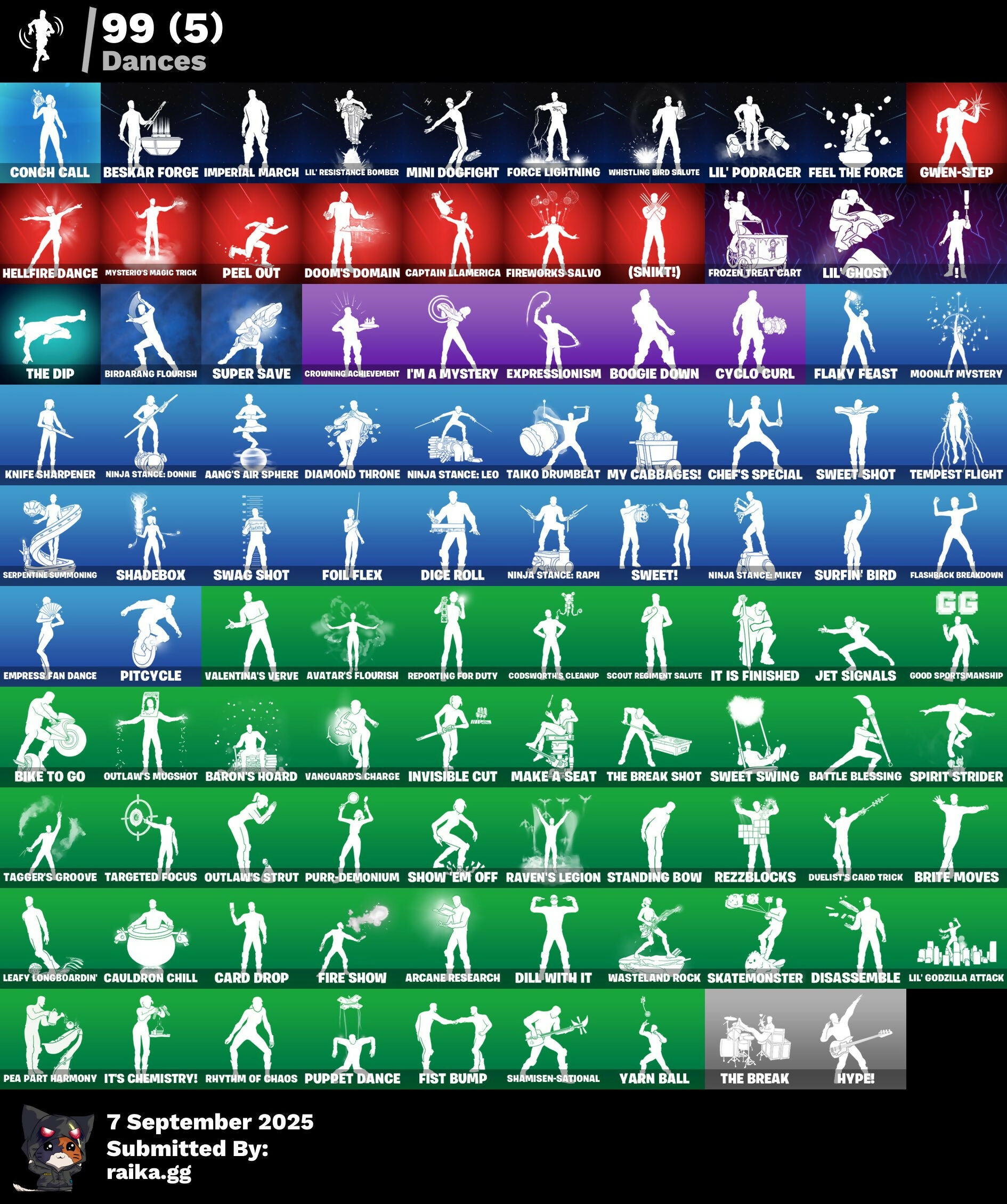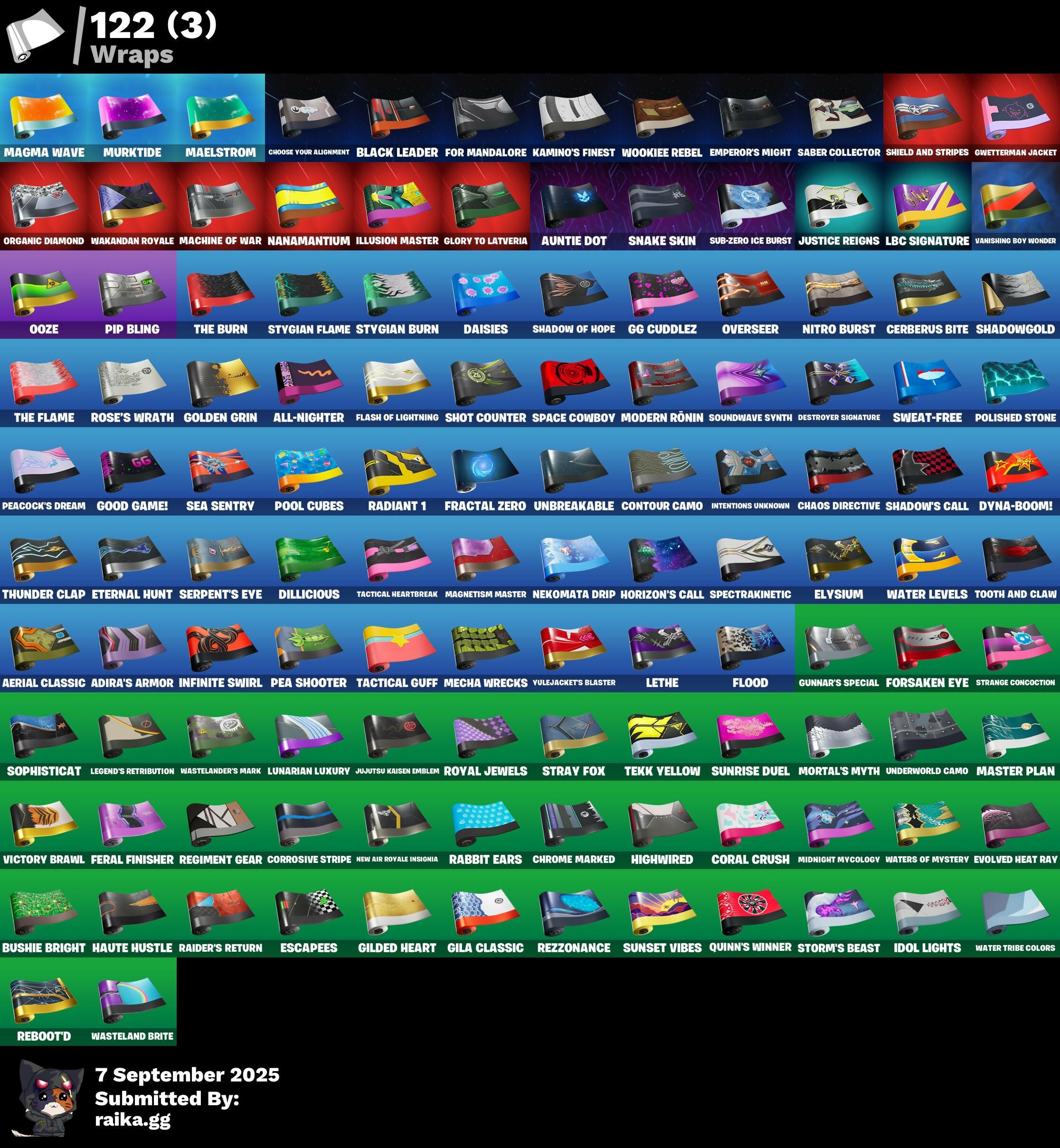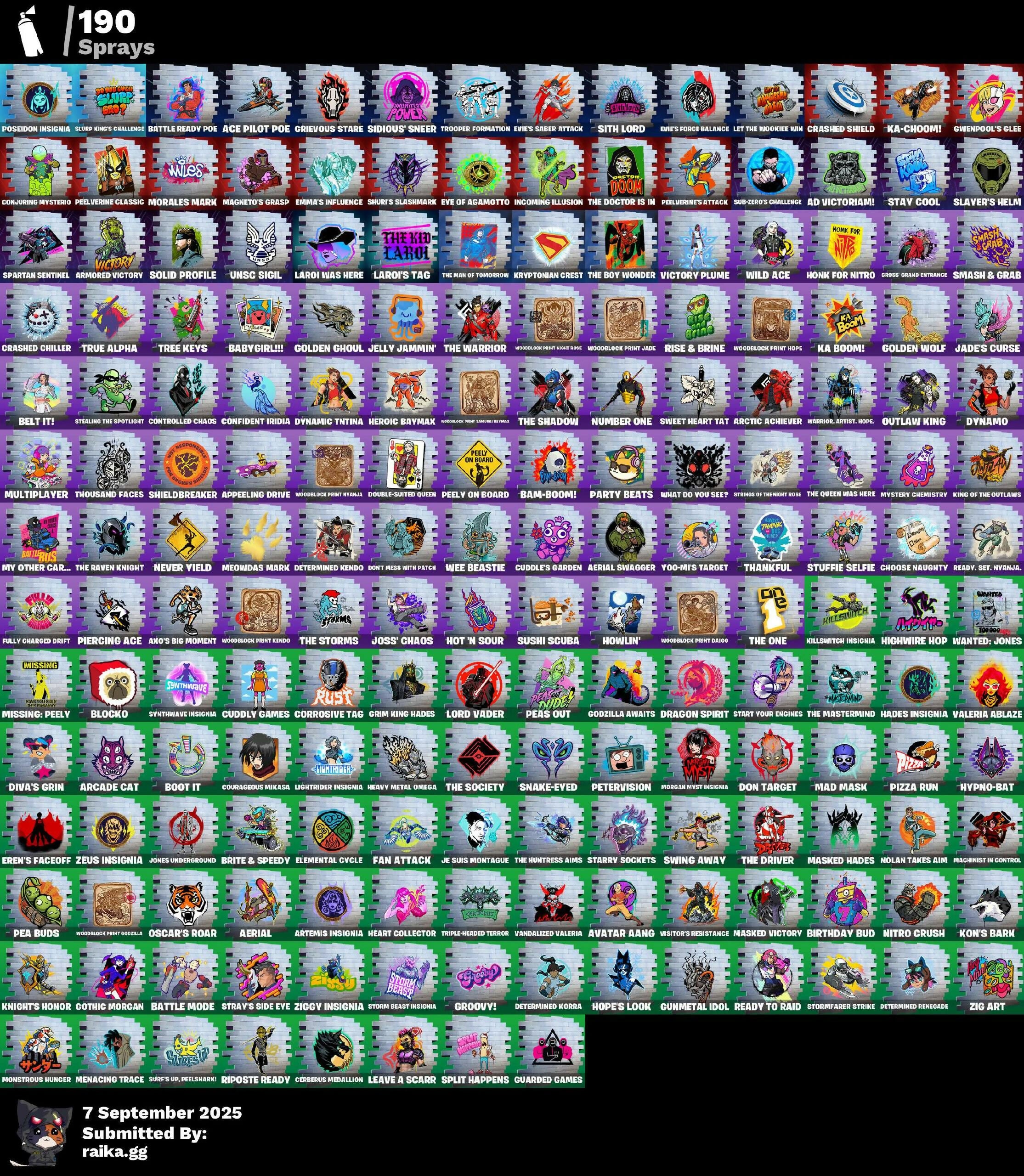 (SnikT!), 1-Ball, 212th Battalion Trooper, 501st Trooper, 999 Knives, A-W-R Pack, Aang, Aang's Air Sphere, Ace Pilot Poe, Ad Victoriam!, Adira's Armor, Adira's Battle Flag, Aerial, Aerial Classic, Aerial Swagger, Agent Patch, Ahsoka Tano, Ahsoka's Clone Trooper, Air Nomad Staff, All-Nighter, Alpha Trophy, Apex Predator, Aphrodite, Appa, Appeeling Drive, Apprentice Evie, Arcade Cat, Arcane Research, Arctic Achiever, Armored Victory, Arrowpoint Carver, Artemis, Artemis Insignia, Assaultron Blade, Astral Mantis, Auntie Dot, Auto Clutch, Avatar Aang, Avatar Cycle, Avatar State Aang, Avatar's Flourish, Axo's Big Moment, B Splat, BabyGirl!!, Back-Mounted Bombs Away, Back-Mounted Turbo Tower, Backup Blades, Balanced, Bam-Boom!, Bamboo Patch, Bamboo-Tana, Baron's Hoard, Basement Key, Bat Royale, Battle Blessing, Battle Gamer Mae, Battle Mode, Battle Ready Poe, Baymax Wings, Belt It!, Beskar Forge, Bi-Han, Big Dill, Bike To Go, Birdarang Flourish, Birthday Bud, Bitev, Black Knight T-60 Power Armor, Black Leader, Black One X-Wing, Black Panther (Shuri), Black Queen, Blackened Shield, Blades of Light, Blazing Fire Cerberus, Blitz 'Brella, Blitz Axe, Blitz Wings, Blocko, Bolt Blades, Bomb Bouquet, Boogie Down, Boot It, Breaking Waves, Breakshore Trident, Brilliant Cutters, Brite & Speedy, Brite Agent, Brite Moves, Brite Raider, Bullet Rider, Bunsen Backburner, Burning Ambition Valeria, Bushie Bright, Bytes' Sigil, C.T.L, Cacodemon, Cake Clobberer, Camo War Machine, Captain Jones, Captain Jones's Shell & Pickaxe, Captain Llamerica, Captain's Glider, Carbon Fiber Holster, Card Drop, Cassidy Quinn, Cauldron Chill, Cerberus, Cerberus Bite, Cerberus Medallion, Chalked Up 1-Ball, Chaos Directive, Chaos Director, Chaotic Crawler, Charge Pack, Cheer Bag, Cheer Bolt, Chef's Special, Chemist's Cloudglider, Choose Naughty, Chrome Marked, Chromeseed, Clang & Basher, Classic Peelverine, Clawbox, Clawz Retro, Cliffside Soarer, Clip Show Carry-All, Clone Trooper, Codsworth's Cleanup, Cold Furia, Combat Cue, Competitor's Time Brella, Conch Call, Confident Iridia, Conjuring Mysterio, Contour Camo, Controlled Chaos, Coral Crush, Corrosive Stripe, Corrosive Tag, Coruscant Guard, Courageous Mikasa, Cozy Conch, Crash Test Cuddler, Crashed Chiller, Crashed Shield, Cross' Grand Entrance, Crowning Achievement, Crystal Fang, Crystal Smasher, Cuddle Carvers, Cuddle's Garden, Cuddlepool, Cuddlepool's Bow, Cuddly Games, Cursed Marionette, Cyclo Curl, Daigo, Daigo's Claws, Daily Flight, Daisies, Dark Charger, Darkfire Claws, Darth Jar Jar, Dawn Duelist Nisha, Dealer's Deck, Death Star 'Brella, Deck Ducky, Delivery Diver, Demogorgon, Demon Hunter Hope, Designated Hitters, Destroyer Signature, Determined Kendo, Determined Korra, Determined Renegade, Diamond Throne, Diamondclaw Picker, Dice Roll, Dieselback Pack, Dill With It, Dillicious, Dillinger The Gherk, Disassemble, Diva's Grin, Dogg Treat, Don Target, Don's Dominator, Don't Mess With Patch, Doom, Doom Brella, Doom's Cloak, Doom's Domain, Double Header, Double-Barreled Boom Ballasts, Double-Suited Queen, Dragon Rune Lances, Dragon Spirit, Dragon's Rest, Dramvin, Dramyin, Dreamer's Two-Shot, Drome Drifter, Dronerunner's Trophy, Duelist's Card Trick, Duelist's Foil, Dumbbell Driver, Dumbell Driver, Dusk Knight, Dyna-Boom!, Dynamic Tintina, Dynamo, Dynamo Tntina, Dynamo Tntoon-A, Electric Shredder, Elegant Crowbar, Elemental Cycle, Elite Servo, Elysian Artemis, Elysium, Ember Pick, Emma Frost, Emma's Influence, Emperor Palpatine, Emperor's Might, Empress Fan Dance, Energized Godzilla, Energy Sword, Epic Blade of Floof, Eren's Faceoff, Escapees, Eternal Hunt, Eternal Ranker, Evie's Force Balance, Evie's Saber Attack, Evolved Heat Ray, Expert's Emblem, Explorer Emilie, Expressionism, Eye of Agamotto, Fan Attack, Fancy Peter Griffin, Feel The Force, Felina, Felina's Claw, Feline Dagger, Feral Finisher, Fiendish Wand, Fire Show, Fireworks Salvo, Fish Thicc, Fist Bump, Fist Of Doom, Flaky Feast, Flash Of Lightning, Flashback Breakdown, Fletcher Kane, Fletcher's Cane, Flight Risk, Flood, Flux Silvera, Foil Flex, For Mandalore, Force Lightning, Forsaken Eye, Four Elements Banner, Fox Drifter, Fox Fire, Fox Wayfinder, Foxfire Edge, Fractal Zero, Frequency Flyer, Frosted Frets, Frozen Treat Cart, Full Moon Fletcher Kane, Fully Charged Drift, GG Cuddlez, Galactic Ranker, General Grievous, Gila Classic, Gilded Heart, Glorious Giftblade, Glory To Latveria, Godzilla Awaits, Godzilla Evolved, Godzilla's Exo-Spine, Golden Ghoul, Golden Grin, Golden Nemesis, Golden Scythe, Golden Wolf, Good Game!, Good Sportsmanship, Gorgon's Aegis, Gorgonik Mic, Gothic Morgan, Grand Glacier Glider, Greebles, Grievous Stare, Grim King Hades, Groovy!, Grriz, Guarded Games, Guardian Jade, Guardian Lin, Guffy 6-String, Gunmetal Idol, Gunn-Brella, Gunnar's Special, Gunslinger Outlaw Midas, Gwen-Step, Gwenpool, Gwenpool's Glee, Gwenpool's Katanas, Gwetterman Jacket, Hadean Chariot, Hadean Gate, Hadean Key, Hades, Hades Insignia, Hand of Trace, Handheld Missile, Haute Hustle, Haylee Skye, Heart Collector, Heart's Carver, Heart's Rest, Heartbreaker Aphrodite, Heartwinder, Heavy Metal Omega, Hellfire Dance, Hero Baymax, Heroic Baymax, High Society Glider, Highwire, Highwire Hop, Highwired, Holiday Boxy, Homegrown Flail, Honk for Nitro, Hope, Hope Star, Hope's Look, Horde's War Wheel, Horizon’s Call, Hot 'n Sour, Hot Pokers, Howlin', Humbug Slicer, Hunter's Knife, Huntress Lyre, Hydraulic Slammer, Hype!, Hypno-Bat, I'm A Mystery, Ice-Blasted Snow Cruncher, Idol Lights, Idol Wings, Ignition Pack, Illusion Master, Illusionist's Blades, Illusory Mysterio, Imani, Immortal Form, Immortal Zeus, Imperial Holo, Imperial March, Incoming Illusion, Infinite Swirl, Intentions Unknown, Invisible Cut, It Is Finished, It's Chemistry!, Jade, Jade's Curse, Jar Buster, Je Suis Montague, Jelly Jammin', Jet Signals, Jones Underground, Joss, Joss' Chaos, Joystick Jumper, Jujutsu Kaisen Emblem, Junker 'Brella, Justice Reigns, Ka Boom!, Ka