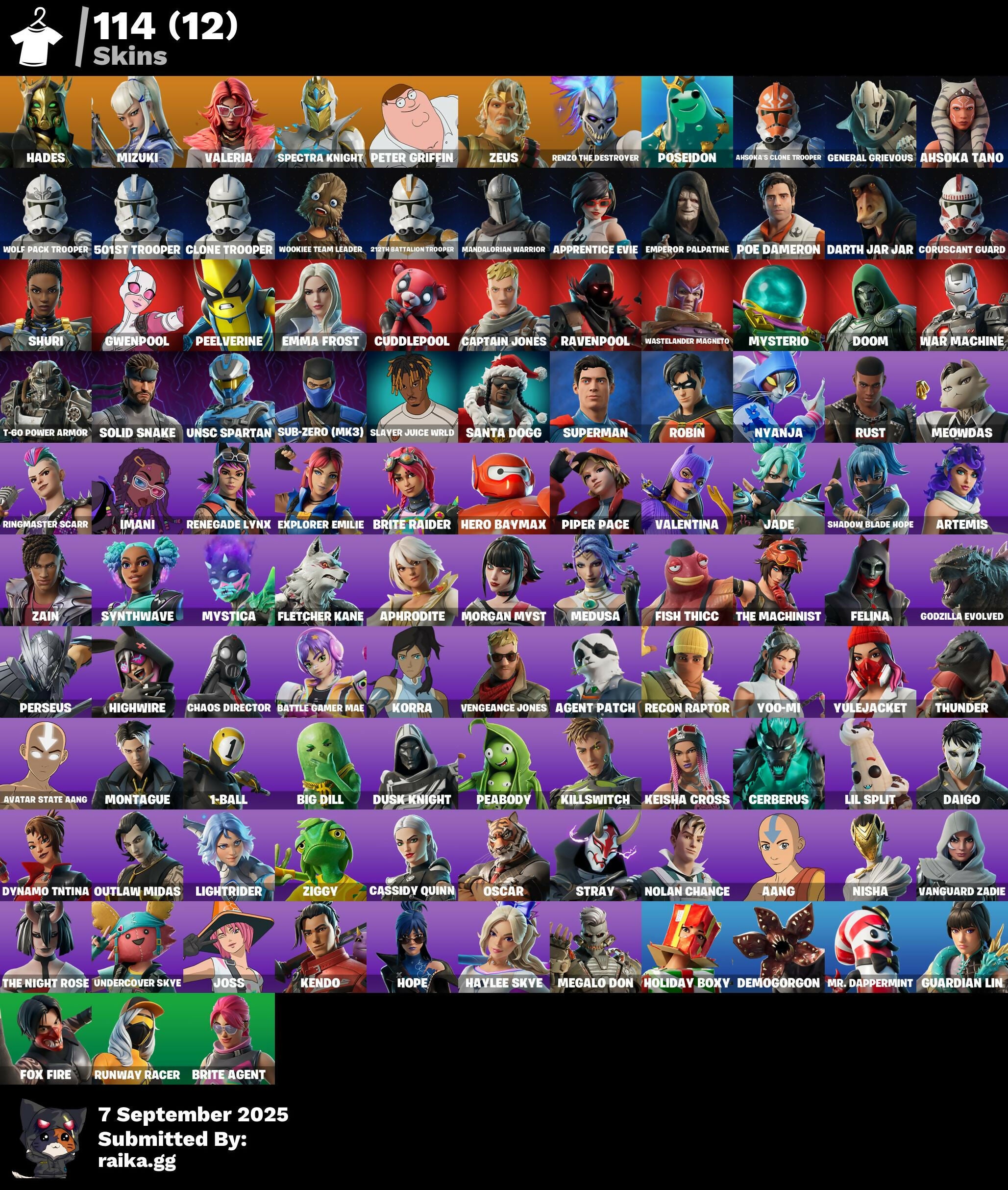 [PC/PSN/XBOX] 114 skins | Hades | Mizuki | Valeria | Spectra Knight | Peter Griffin | Zeus | Renzo the Destroyer | Poseidon | Ahsoka's Clone Trooper | 850 VB / Fortnite