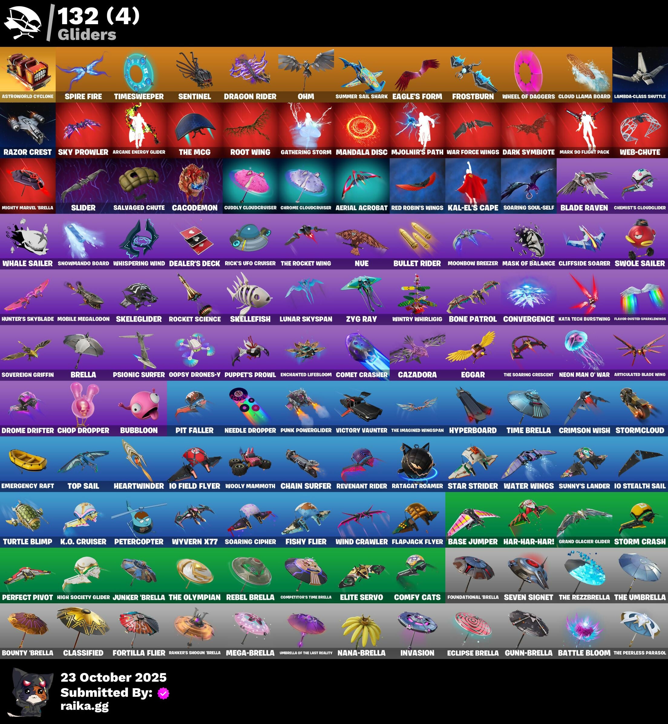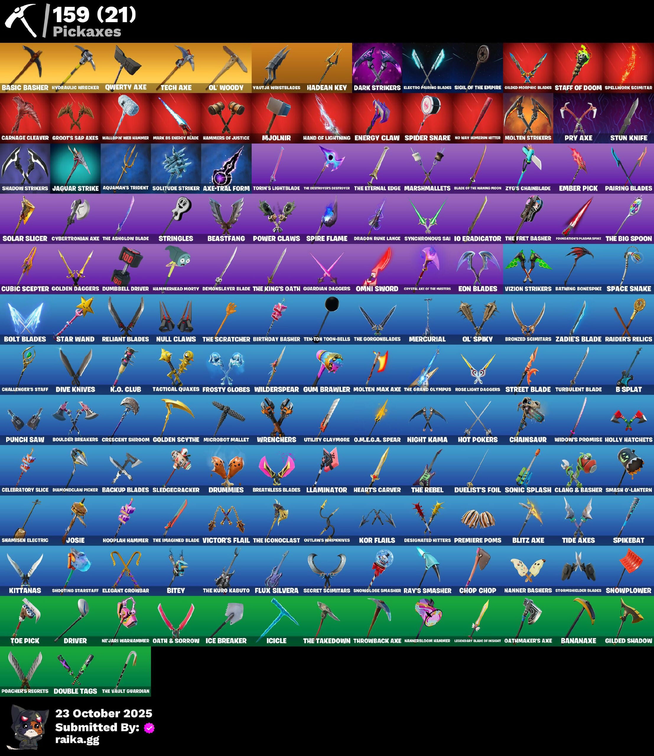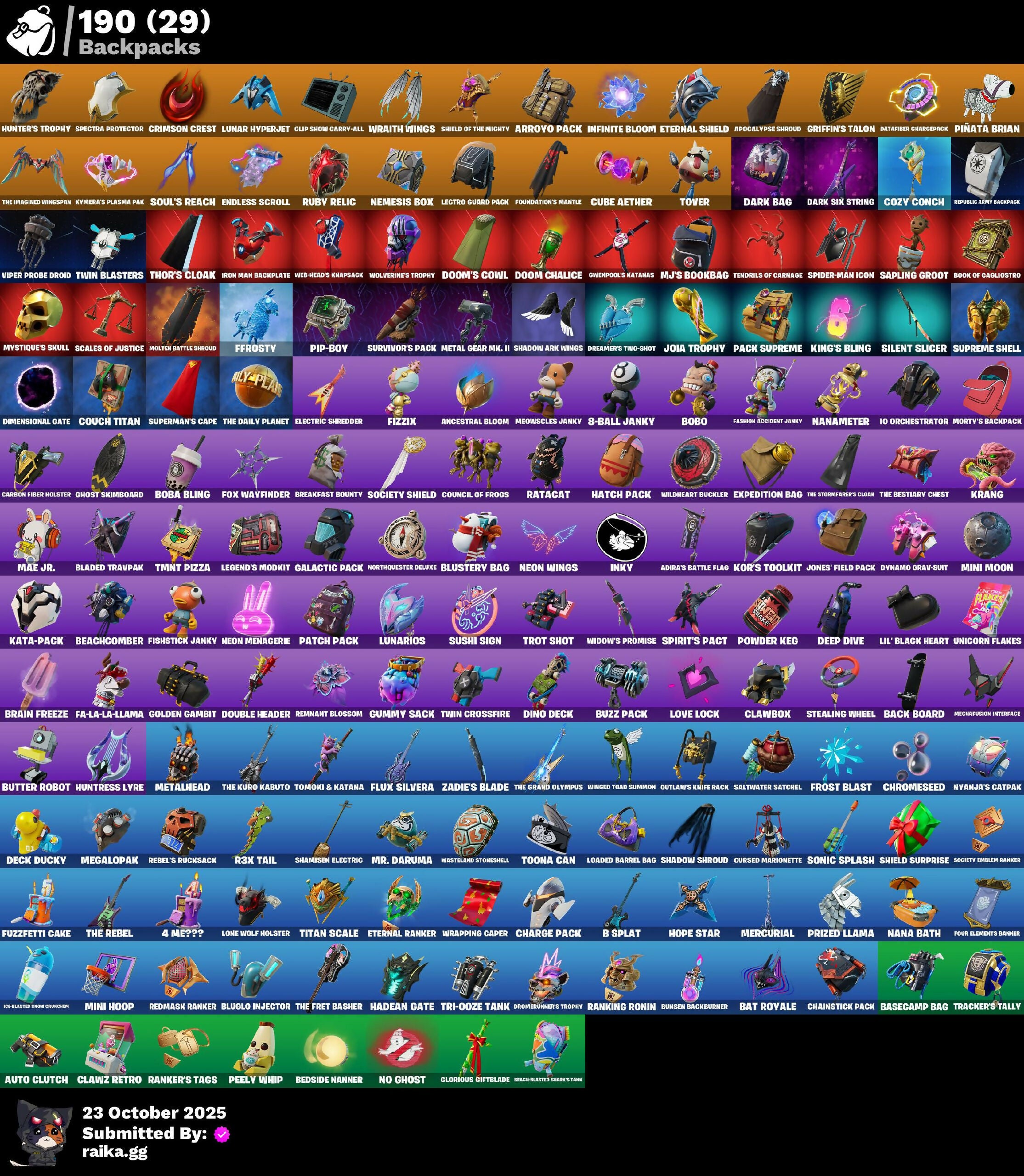 01 Optimus Prime, 2.0's Revenge, 2022, 4 Me???, 8-Ball Janky, A Warrior Prepares, Abduction, Acolyte's Curse, Adira, Adira's Armor, Adira's Battle Flag, Aerial, Aerial Acrobat, Aerial Classic, Aerial Swagger, Afterparty, Agent Jones, Agent Jones (Jump 31), Agent Peely, Air Shredder, Ancestral Bloom, Apocalypse Shroud, Aquaman, Aquaman's Trident, Arcane Energy Glider, Arcane Steel, Arctic Adeline, Arroyo Pack, Arthur Curry, Articulated Blade Wing, Astro Jack, Astroworld Cyclone, Atlantean Fishstick, Auto Clutch, Axe-tral Form, Azarath Metrion Zinthos!, B Splat, B.R.U.T.E. Competitor, Back Board, Backup Blades, Bananaxe, Banner, Banner Icon, Baron's Hoard, Base Jumper, Basecamp Bag, Basic Basher, Basketball Hoop, Bat Royale, Battle Bloom, Battle Mode, Batwing Bonespike, Bawk Off, Be The Mastermind, Beach Ball, Beach-Blasted Sadik's Tank, Beachcomber, Beamers, Bean Bag, Bear Hug, Beast Boy, Beast Boy & Raven, Beastfang, Bedside Nanner, Beef Blade, Beep Beep, Berserker Barrage, Beskar, Big Fan, Big Guns, Big Mouth, Birthday Basher, Birthday Dash, Bitey, Bitter Sweets, Black Eternal Knight, Blade Raven, Blade of the Waning Moon, Bladed Travpak, Blasted, Blitz Axe, Blocko, Blowin' Up, Bluglo Injector, Blustery Bag, Boba Bling, Bobo, Bolt Blades, Bombastic Winterfest, Bone Patrol, Boogie Down, Book of Cagliostro, Boomin', Boot It, Boots 'N' Cats, Both Eyes Open, Boulder Breakers, Bounty 'Brella, Brain Freeze, Breakfast Bounty, Breaking Point, Breathless Blades, Brella, Bring It Around, Brite & Speedy, Bronzed Scimitars, Bubbloon, Bullet Rider, Bunsen Backburner, Burning Ambition Valeria, Bushie Bright, Butter Buddy, Butter Robot, Buttoned Up, Buzz Pack, Bytes' Sigil, Cacodemon, Call Me, Cap K.O., Cap Kick, Carbon Fiber Holster, Carbon Scarlet, Card Drop, Cardistry, Carnage, Carnage Cleaver, Cash Grab, Cazadora, Celebratory Slice, Cerberus Bite, Cerberus Medallion, Chain Surfer, Chainsaur, Chainstick Pack, Challenger Cerberus, Challenger Menace - Flame, Challenger's Staff, Chaos Directive, Charge Pack, Charlotte, Charlotte's Logo, Chemist's Cloudglider, Chibi, Chimichanga!, Chimpanski Wants You, Choice Knit, Chomp Cud!!, Chop Chop, Chop Dropper, Choppy, Chrome Cloudcruiser, Chrome Marked, Chromeseed, Chronos Lock, Clang & Basher, Clark Kent, Classified, Clawbox, Clawz Retro, Clean Groove, Clean Sweep, Cliffside Soarer, Clip Show Carry-All, Cloud Llama Board, Cloudburst, Cluck, Cluck (Slurpy), Clucking Mad, Combat Elite, Combat Giller, Comet, Comet Crasher, Comfy Cats, Competitor Medusa, Competitor's Time Brella, Confetti, Conjure Weapon, Console Cup, Contour Camo, Convergence, Corrosive Stripe, Cosmic Sun, Couch Titan, Council of Frogs, Count It!, Courageous Mikasa, Cowboy Chat, Cozy Conch, Crabby King, Crescent Shroom, Crimson Crest, Crimson Wish, Crowning Achievement, Crystal Axe of the Masters, Cube Aether, Cube Marking, Cubed, Cubic Scepter, Cuddle Scream Leader, Cuddly Cloudcruiser, Curling Iron, Cursed Marionette, Cybertronian Axe, Cyclo Curl, D.C. 63, Dagger Dance, Daisies, Dancin' Domino, Dark Angular Shift, Dark Bag, Dark Bomber, Dark Power Chord, Dark Side Rising, Dark Six String, Dark Strikers, Dark Symbiote, Darth Shader, Darth Vader, Datafiber Chargepack, Daughter Of Trigon, Dawn Duelist Nisha, Dealer's Deck, Deck Ducky, Deep Dab, Deep Dive, Deep Future, Demons Beware, Demonslayer Blade, Denim Destiny, Designated Hitters, Diamond Throne, Diamondclaw Picker, Dimensional Camo, Dimensional Gate, Dino Deck, Dive Knives, Division, Doctor Doom, Doctor Slone, Doctor Slone (Prismatic), Doctor Strange, Dolphin, Doom Chalice, Doom's Cowl, Double Header, Double Tags, Doze Dab, Dragon Rider, Dragon Rune Lance, Dragon Rune Lances, Dragon Spirit, Dreamer's Two-Shot, Driver, Drome Drifter, Dromedowner's Trophy, Drones-V View, Drooly, Droopy, Dropout, Drummies, Duelist's Foil, Dumbbell Driver, Dynamo Grav-Suit, E.G.O., Eagle's Form, Eclipse Brella, Eggar, Electric Shredder, Electro Pairing Blades, Elegant Crowbar, Elemental Cycle, Elite Servo, Ember Pick, Emergency Raft, Enchanted Lifebloom, Endless Scroll, Energy Claw, Ensnared, Eon Blades, Erisa, Erisa Alert, Erisa's Crest, Escapees, Eternal Emblem, Eternal Knight, Eternal Ranker, Eternal Shield, Evasive Maneuvers, Everything's Fine, Evie, Expedition Bag, Eye Of Agamotto, Fa-La-La-Llama, Fabio Sparklemane, Fade, Fade Out, Fan Attack, Fancy Peter Griffin, Fashion Accident Janky, Ferocious, Ffrosty, Final Eclipse, Fish Hook, Fishstick, Fishstick Janky, Fishy Flier, Fist, Fist Bump, Fizzix, Flapjack Flyer, Flavor-Dusted Sparklewings, Flippin' Away, Flood, Flux Silvera, Focused, Foil Flex, Fortilla Flier, Foundation's Mantle, Foundation's Plasma Spike, Foundational, Foundational 'Brella, Four Elements Banner, Fox Wayfinder, Frost Blast, Frost Squad, Frostburn, Frosty Globes, Fry Angles, Fuzzfetti Cake, G.O.A.T., Gage, Galactic Pack, Gameface, Gathering Storm, Geared Up, Get Griddy, Get Schwifty, Ghost Skimboard, Gila Classic, Gilded Morphic Blades, Gilded Shadow, Glorious Giftbrade, Glyph Master, God Emperor Doom, Golden Black, Golden Daggers, Golden Gambit, Golden Scythe, Golden Wolf, Gommy Sack, Good Guy, Grand Glacier Glider, Grav-Fusion, Greed, Griffin's Talon, Grim King Hades, Gringle Gift, Groot, Groot Glow, Groot's Sap Axes, Grriz, Guardian Daggers, Guggi Was Here, Guggimon, Guggimon (Prismatic), Gugmon, Gum Brawler, Gumbo, Gun Show, Gunn-Brella, Gunnar, Gunnar's Special, Gwenpool's Katanas, Gwertterman Jacket, Hadean Gate, Hadean Key, Hades Insignia, Hammerhead, Hammerhead Morty, Hammers of Justice, Hand Of Trace, Hand of Lightning, Hand-Forged, Hang Loose Celebration, Happy Kit, Har-Har-Har!, Harbinger Of Victory, Harlowe, Hatch Pack, Haute Hustle, Have A Seat, Haven, Headpiece, Heart Of A King, Heart Sign, Heart's Desire, Heart-Rizon, Heartburst, Hearts Carver, Heartwinder, Heat Vision Hunter, Heavy Metal Omega, Helmet, Here Comes Trubble, Hidden Haven, High Society Glider, Highwire Hop, Hit It, Holiday Boxy, Holly Hatchets, Hookshot, Hoopl