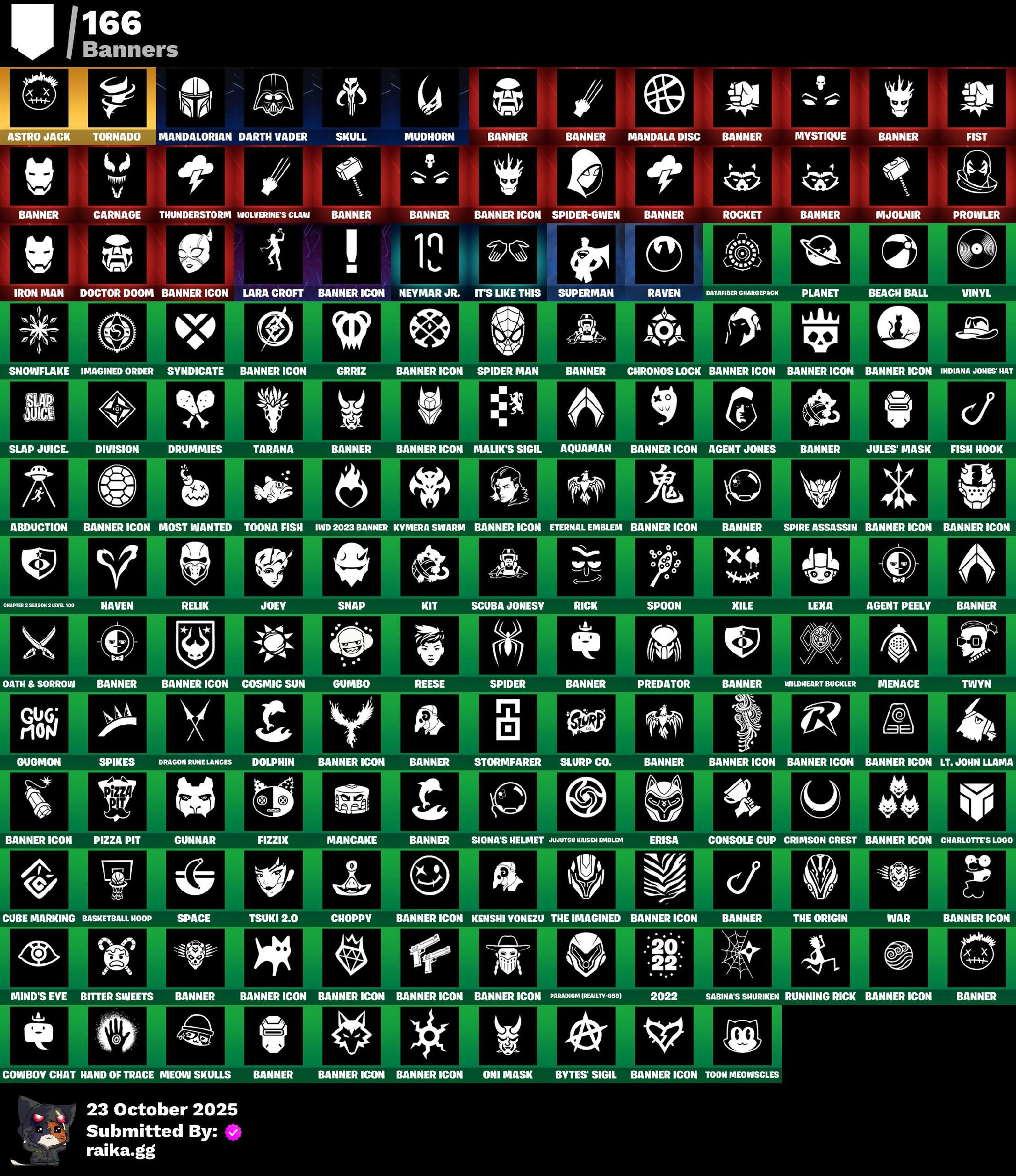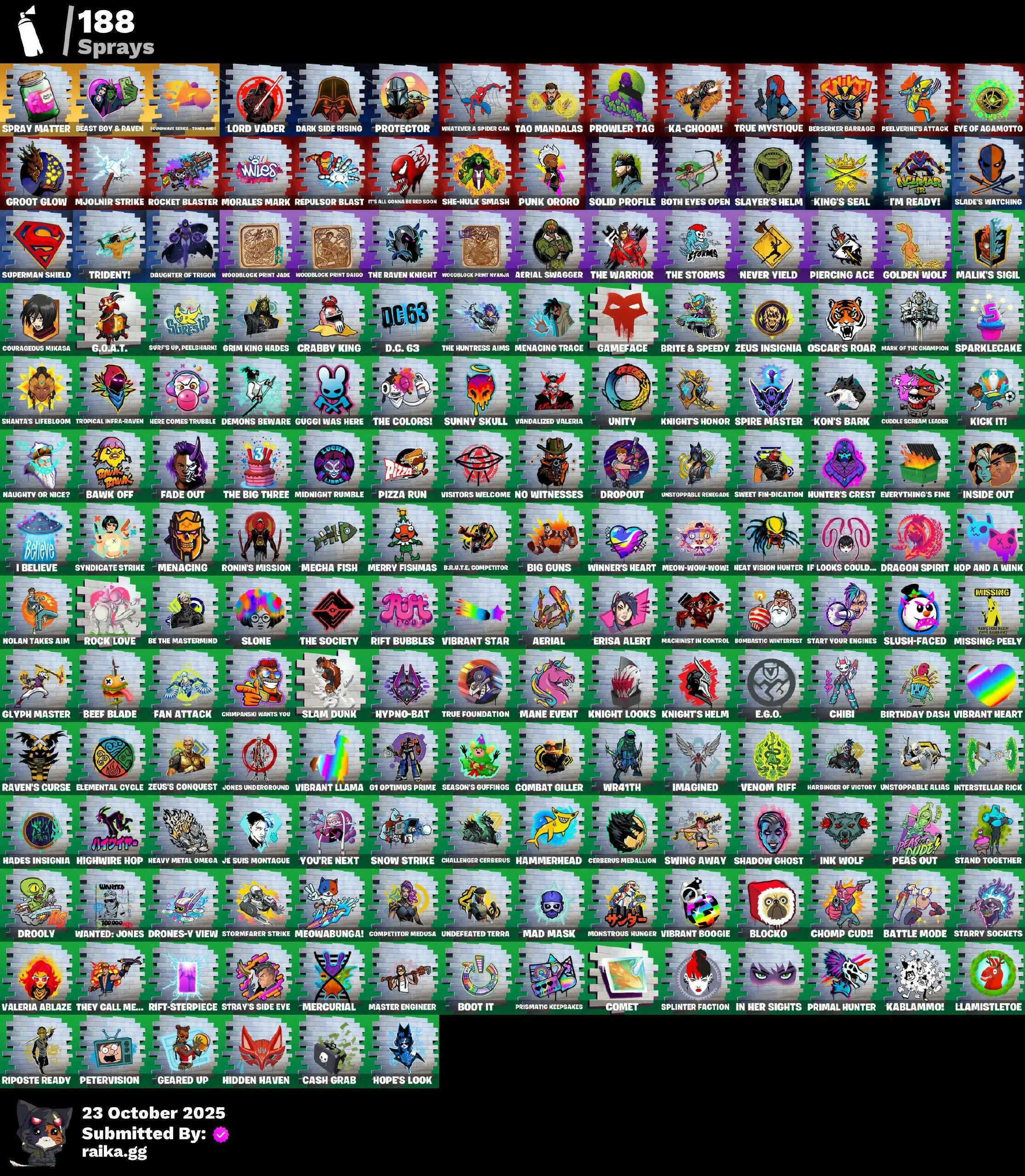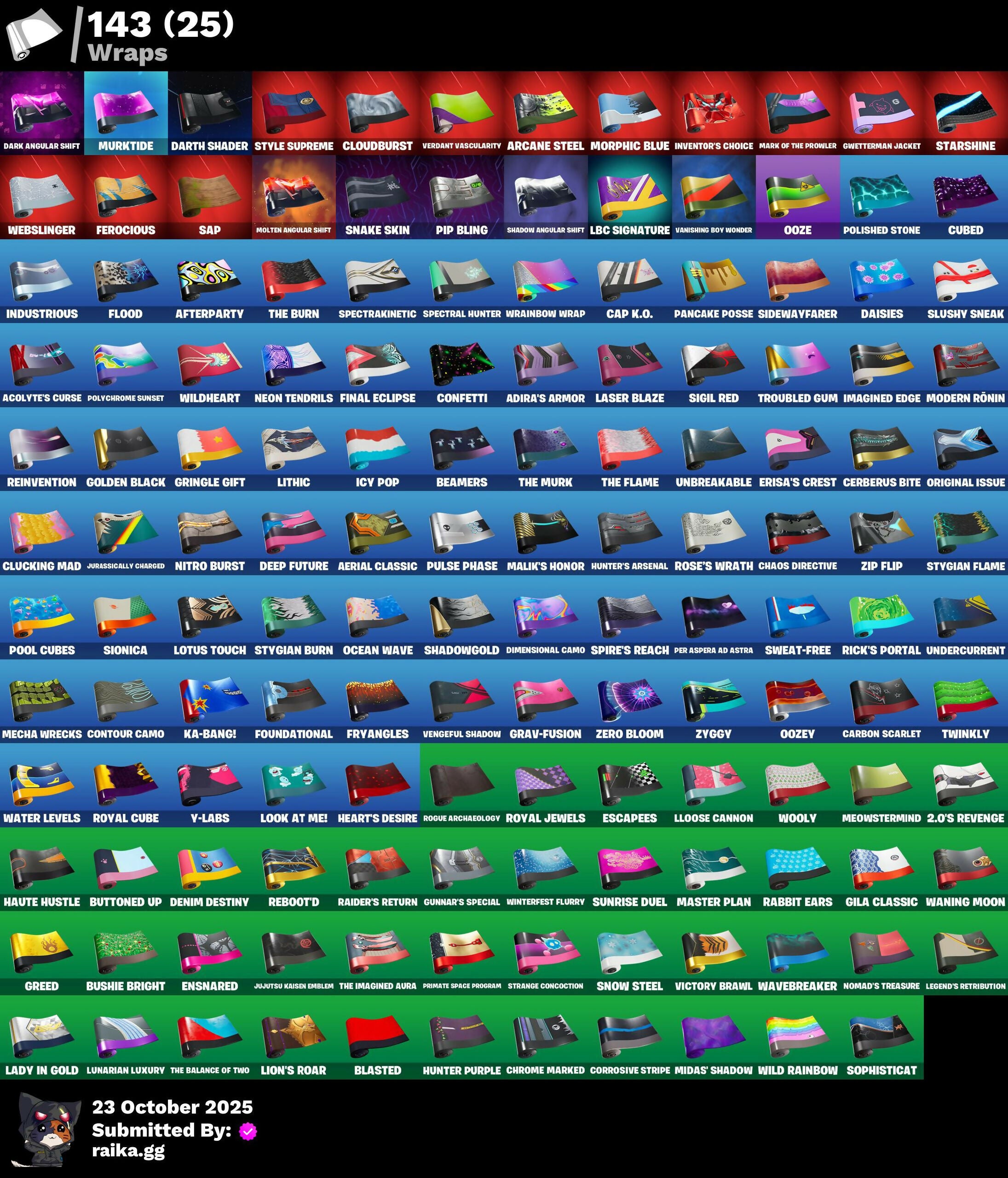 01 Optimus Prime, 2.0's Revenge, 2022, 4 Me???, 8-Ball Janky, A Warrior Prepares, Abduction, Acolyte's Curse, Adira, Adira's Armor, Adira's Battle Flag, Aerial, Aerial Acrobat, Aerial Classic, Aerial Swagger, Afterparty, Agent Jones, Agent Jones (Jump 31), Agent Peely, Air Shredder, Ancestral Bloom, Apocalypse Shroud, Aquaman, Aquaman's Trident, Arcane Energy Glider, Arcane Steel, Arctic Adeline, Arroyo Pack, Arthur Curry, Articulated Blade Wing, Astro Jack, Astroworld Cyclone, Atlantean Fishstick, Auto Clutch, Axe-tral Form, Azarath Metrion Zinthos!, B Splat, B.R.U.T.E. Competitor, Back Board, Backup Blades, Bananaxe, Banner, Banner Icon, Baron's Hoard, Base Jumper, Basecamp Bag, Basic Basher, Basketball Hoop, Bat Royale, Battle Bloom, Battle Mode, Batwing Bonespike, Bawk Off, Be The Mastermind, Beach Ball, Beach-Blasted Sadik's Tank, Beachcomber, Beamers, Bean Bag, Bear Hug, Beast Boy, Beast Boy & Raven, Beastfang, Bedside Nanner, Beef Blade, Beep Beep, Berserker Barrage, Beskar, Big Fan, Big Guns, Big Mouth, Birthday Basher, Birthday Dash, Bitey, Bitter Sweets, Black Eternal Knight, Blade Raven, Blade of the Waning Moon, Bladed Travpak, Blasted, Blitz Axe, Blocko, Blowin' Up, Bluglo Injector, Blustery Bag, Boba Bling, Bobo, Bolt Blades, Bombastic Winterfest, Bone Patrol, Boogie Down, Book of Cagliostro, Boomin', Boot It, Boots 'N' Cats, Both Eyes Open, Boulder Breakers, Bounty 'Brella, Brain Freeze, Breakfast Bounty, Breaking Point, Breathless Blades, Brella, Bring It Around, Brite & Speedy, Bronzed Scimitars, Bubbloon, Bullet Rider, Bunsen Backburner, Burning Ambition Valeria, Bushie Bright, Butter Buddy, Butter Robot, Buttoned Up, Buzz Pack, Bytes' Sigil, Cacodemon, Call Me, Cap K.O., Cap Kick, Carbon Fiber Holster, Carbon Scarlet, Card Drop, Cardistry, Carnage, Carnage Cleaver, Cash Grab, Cazadora, Celebratory Slice, Cerberus Bite, Cerberus Medallion, Chain Surfer, Chainsaur, Chainstick Pack, Challenger Cerberus, Challenger Menace - Flame, Challenger's Staff, Chaos Directive, Charge Pack, Charlotte, Charlotte's Logo, Chemist's Cloudglider, Chibi, Chimichanga!, Chimpanski Wants You, Choice Knit, Chomp Cud!!, Chop Chop, Chop Dropper, Choppy, Chrome Cloudcruiser, Chrome Marked, Chromeseed, Chronos Lock, Clang & Basher, Clark Kent, Classified, Clawbox, Clawz Retro, Clean Groove, Clean Sweep, Cliffside Soarer, Clip Show Carry-All, Cloud Llama Board, Cloudburst, Cluck, Cluck (Slurpy), Clucking Mad, Combat Elite, Combat Giller, Comet, Comet Crasher, Comfy Cats, Competitor Medusa, Competitor's Time Brella, Confetti, Conjure Weapon, Console Cup, Contour Camo, Convergence, Corrosive Stripe, Cosmic Sun, Couch Titan, Council of Frogs, Count It!, Courageous Mikasa, Cowboy Chat, Cozy Conch, Crabby King, Crescent Shroom, Crimson Crest, Crimson Wish, Crowning Achievement, Crystal Axe of the Masters, Cube Aether, Cube Marking, Cubed, Cubic Scepter, Cuddle Scream Leader, Cuddly Cloudcruiser, Curling Iron, Cursed Marionette, Cybertronian Axe, Cyclo Curl, D.C. 63, Dagger Dance, Daisies, Dancin' Domino, Dark Angular Shift, Dark Bag, Dark Bomber, Dark Power Chord, Dark Side Rising, Dark Six String, Dark Strikers, Dark Symbiote, Darth Shader, Darth Vader, Datafiber Chargepack, Daughter Of Trigon, Dawn Duelist Nisha, Dealer's Deck, Deck Ducky, Deep Dab, Deep Dive, Deep Future, Demons Beware, Demonslayer Blade, Denim Destiny, Designated Hitters, Diamond Throne, Diamondclaw Picker, Dimensional Camo, Dimensional Gate, Dino Deck, Dive Knives, Division, Doctor Doom, Doctor Slone, Doctor Slone (Prismatic), Doctor Strange, Dolphin, Doom Chalice, Doom's Cowl, Double Header, Double Tags, Doze Dab, Dragon Rider, Dragon Rune Lance, Dragon Rune Lances, Dragon Spirit, Dreamer's Two-Shot, Driver, Drome Drifter, Dromedowner's Trophy, Drones-V View, Drooly, Droopy, Dropout, Drummies, Duelist's Foil, Dumbbell Driver, Dynamo Grav-Suit, E.G.O., Eagle's Form, Eclipse Brella, Eggar, Electric Shredder, Electro Pairing Blades, Elegant Crowbar, Elemental Cycle, Elite Servo, Ember Pick, Emergency Raft, Enchanted Lifebloom, Endless Scroll, Energy Claw, Ensnared, Eon Blades, Erisa, Erisa Alert, Erisa's Crest, Escapees, Eternal Emblem, Eternal Knight, Eternal Ranker, Eternal Shield, Evasive Maneuvers, Everything's Fine, Evie, Expedition Bag, Eye Of Agamotto, Fa-La-La-Llama, Fabio Sparklemane, Fade, Fade Out, Fan Attack, Fancy Peter Griffin, Fashion Accident Janky, Ferocious, Ffrosty, Final Eclipse, Fish Hook, Fishstick, Fishstick Janky, Fishy Flier, Fist, Fist Bump, Fizzix, Flapjack Flyer, Flavor-Dusted Sparklewings, Flippin' Away, Flood, Flux Silvera, Focused, Foil Flex, Fortilla Flier, Foundation's Mantle, Foundation's Plasma Spike, Foundational, Foundational 'Brella, Four Elements Banner, Fox Wayfinder, Frost Blast, Frost Squad, Frostburn, Frosty Globes, Fry Angles, Fuzzfetti Cake, G.O.A.T., Gage, Galactic Pack, Gameface, Gathering Storm, Geared Up, Get Griddy, Get Schwifty, Ghost Skimboard, Gila Classic, Gilded Morphic Blades, Gilded Shadow, Glorious Giftbrade, Glyph Master, God Emperor Doom, Golden Black, Golden Daggers, Golden Gambit, Golden Scythe, Golden Wolf, Gommy Sack, Good Guy, Grand Glacier Glider, Grav-Fusion, Greed, Griffin's Talon, Grim King Hades, Gringle Gift, Groot, Groot Glow, Groot's Sap Axes, Grriz, Guardian Daggers, Guggi Was Here, Guggimon, Guggimon (Prismatic), Gugmon, Gum Brawler, Gumbo, Gun Show, Gunn-Brella, Gunnar, Gunnar's Special, Gwenpool's Katanas, Gwertterman Jacket, Hadean Gate, Hadean Key, Hades Insignia, Hammerhead, Hammerhead Morty, Hammers of Justice, Hand Of Trace, Hand of Lightning, Hand-Forged, Hang Loose Celebration, Happy Kit, Har-Har-Har!, Harbinger Of Victory, Harlowe, Hatch Pack, Haute Hustle, Have A Seat, Haven, Headpiece, Heart Of A King, Heart Sign, Heart's Desire, Heart-Rizon, Heartburst, Hearts Carver, Heartwinder, Heat Vision Hunter, Heavy Metal Omega, Helmet, Here Comes Trubble, Hidden Haven, High Society Glider, Highwire Hop, Hit It, Holiday Boxy, Holly Hatchets, Hookshot, Hoopl