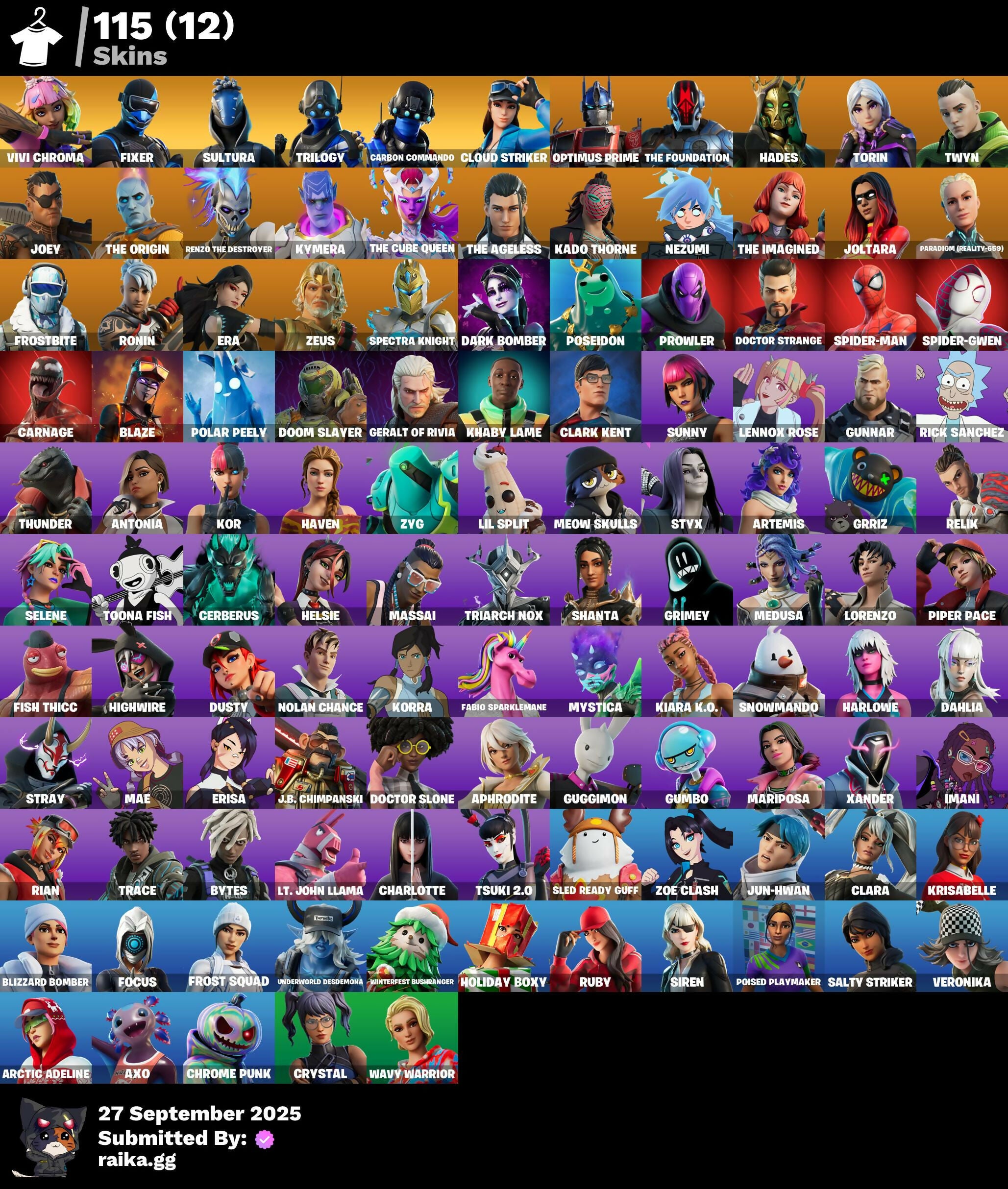 [PC/PSN/XBOX] 115 skins | Vivi Chroma | Fixer | Sultura | Trilogy | Carbon Commando | Cloud Striker | Optimus Prime | The Foundation | Hades | Torin | Twyn | 750 VB / FN