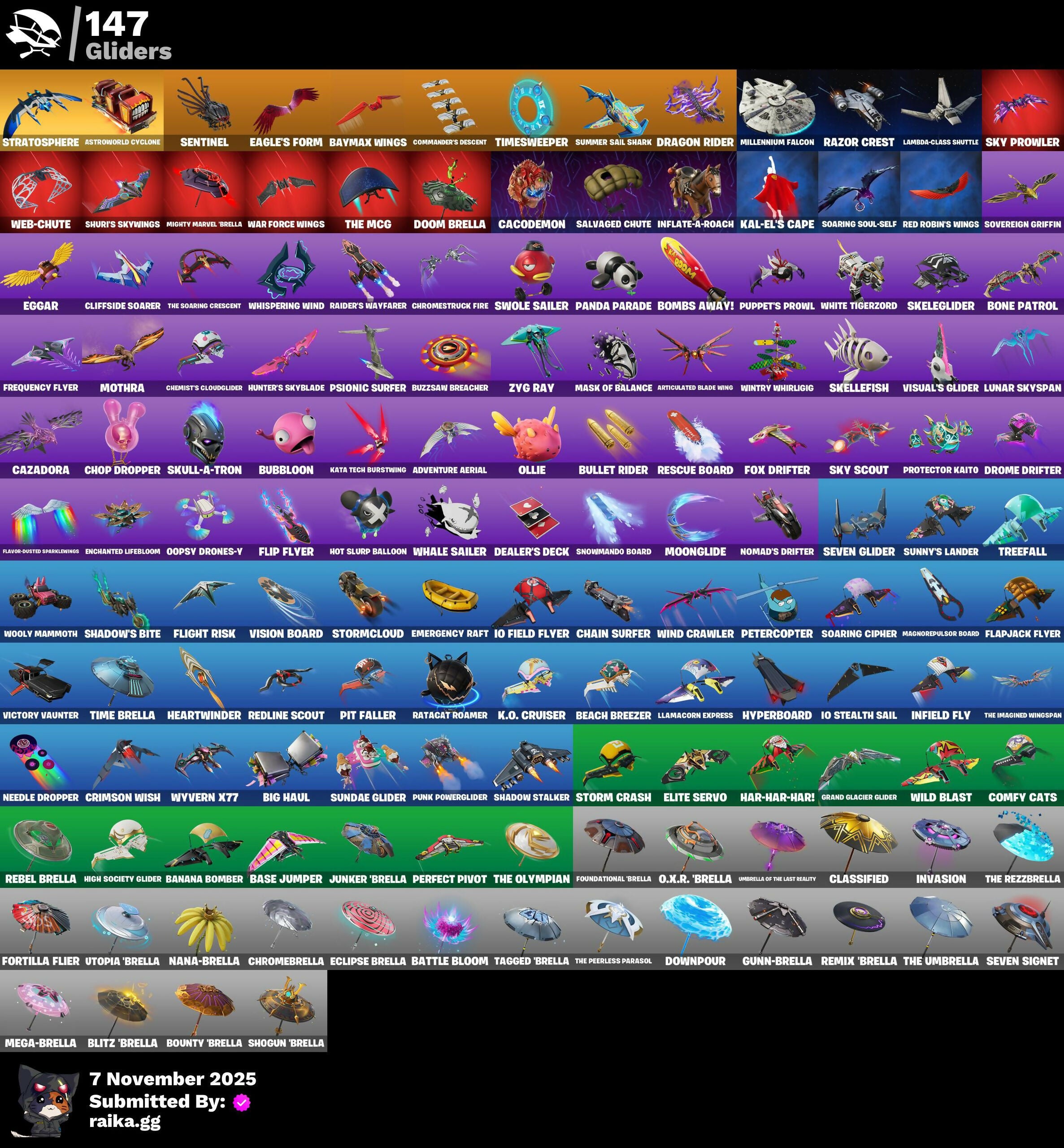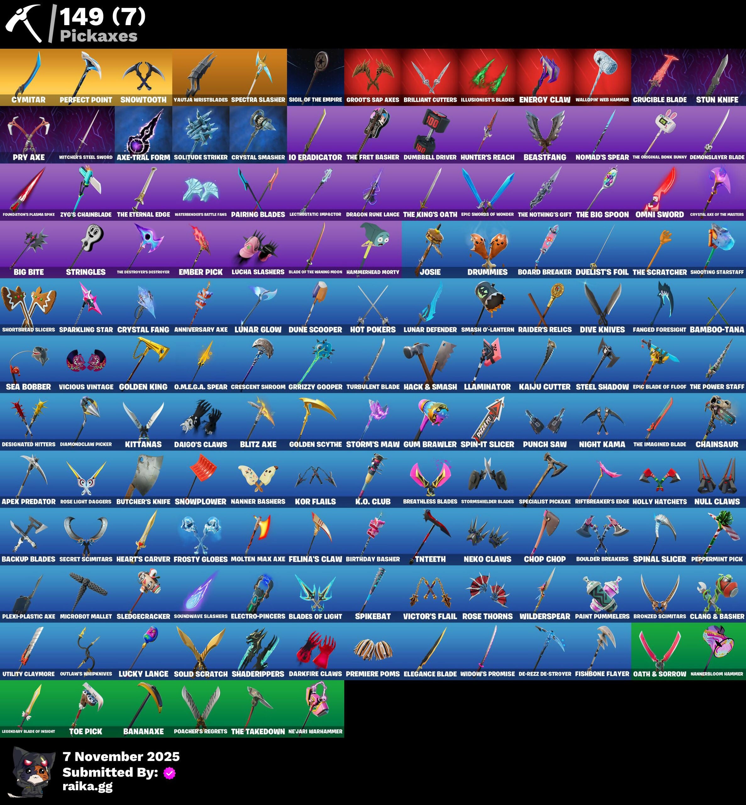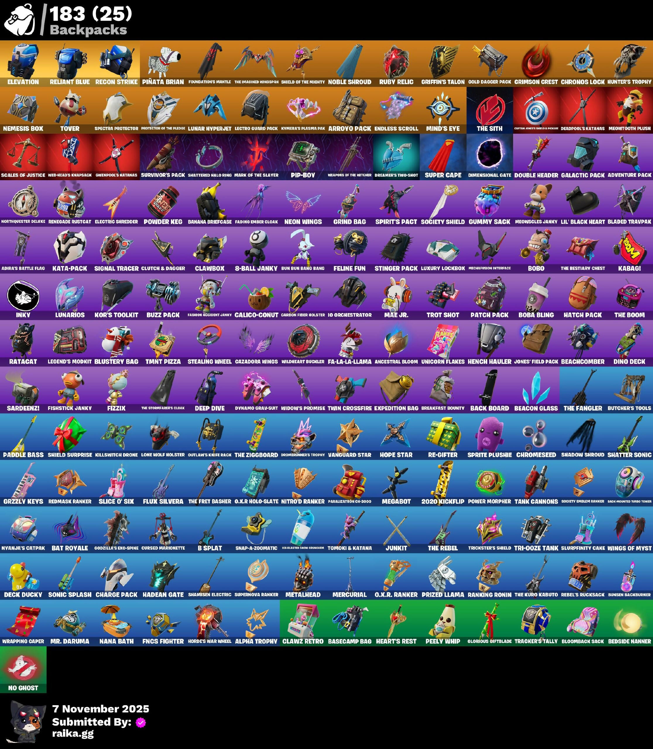 10 Orchestrator, 2.0's Revenge, 2020 Kickflip, 2022, 8-Ball, 8-Ball Janky, A Warrior Prepares, A.L.T.E.R., Abduction, Acolyte's Curse, Adira, Adira's Armor, Adira's Battle Flag, Adventure Aerial, Adventure Pack, Aerial, Aerial Classic, Aerial Swagger, Afterparty, Agent Jones, Agent Jones (Jump 31), Agent Nana, Agent Peely, Ahsoka Tano, All-Nighter, Alpha Trophy, Ancestral Bloom, Anniversary Axe, Antonia, Antonia In Action, Apex Predator, Aphrodite, Appeeling Drive, Arcade Cat, Arctic Adeline, Arroyo Pack, Art The Hack, Articulated Blade Wing, Astro Antidote, Astro Armor, Astro Jack, Astroworld Cyclone, Auntie Dot, Aurelian, Avatar's Flourish, Axe-Tral Form, Azarath Metrion Zinthos!, B Splat, Back Board, Back-Mounted Turbo Tower, Backup Blades, Balance Board, Bamboo-Tana, Banana Bomber, Banana Briefcase, Bananaxe, Banner, Banner Icon, Base Jumper, Baseball, Basecamp Bag, Bat Royale, Batman, Battle Bloom, Battle Mode, Battle Ready Era, Bawk Off, Baymax Wings, Beach Breezer, Beachcomber, Beacon Glass, Beamers, Bean Bag, Beastfang, Bedside Nanner, Beef Blade, Beep Beep, Belt It!, Beskar, Big Bite, Big Guns, Big Haul, Bike To Go, Birthday Basher, Birthday Dash, Bitter Sweets, Black Hole, Blade of the Waning Moon, Bladed Travpak, Blades of Light, Blasted, Blitz 'Brella, Blitz Axe, Blizzard Bomber, Blocko, Bloomback Sack, Blowin' Up, Blustery Bag, Board Breaker, Boba Bling, Boba Snack, Bobo, Bombastic Winterfest, Bombs Away!, Bone Patrol, Boogie Down, Boomin', Boots N' Cats, Both Eyes Open, Boulder Breakers, Bounty 'Brella, Breakfast Bounty, Breakin', Breaking Point, Breathless Blades, Brilliant Cutters, Bronzed Scimitars, Brutus, Bubloon, Bullet Rider, Bun Bun Bang Bang, Bun Bun Blast, Bunsen Backburner, Burning Ambition Valeria, Bushie Bright, Butcher's Knife, Butcher's Tools, Buttoned Up, Buzz Pack, Buzzsaw Breacher, Bytes, Bytes' Sigil, Cacodemon, Calico, Calico Holiday, Calico-Conut, Call Me, Called Shot, Captain Illamerica, Captain Jones's Shield & Pickaxe, Carbon Fiber Holster, Cardistry, Cash Grab, Cazadora, Cazadora Wings, Cerberus, Cerberus Bite, Chain Surfer, Chainsaur, Challenger Menace - Flame, Chaos Directive, Charge Pack, Charlotte, Charlotte's Logo, Chemist's Cloudglider, Chibi, Chic, Chillshot, Choice Knit, Chomp Cud!!, Chop Chop, Chop Dropper, Choppy, Chrome Marked, Chrome Punk, Chromebrella, Chromeseed, Chromestruck Fire, Chronos Lock, Clang & Basher, Classic Age, Classified, Clawbox, Clawz Retro, Clean Sweep, Cliffside Soarer, Cloud Striker, Cloudburst, Club President Helsie, Cluck, Cluck (Slurpy), Clucking Mad, Clutch & Dagger, Coin Flip, Combat Elite, Comet, Comfy Cats, Commander's Descent, Contour Camo, Controlled Focus, Coral Crush, Corrosive Stripe, Count It!, Courageous Mikasa, Cowboy Chat, Crack It, Crashed Shield, Crescent Shroom, Crimson Crest, Crimson Wish, Crowning Achievement, Crucible Blade, Crystal Axe of the Masters, Crystal Fang, Crystal Smasher, Cube Marking, Cursed Marionette, Cyclo Curl, Cymitar, D.C. 63, Daigo, Daigo's Claws, Daisies, Darkfire Claws, Darth Shader, Darth Vader, Daughter Of Trigon, De-Rezz De-Stroyer, Deadpool, Deadpool's Katanas, Dealer's Deck, Deck Ducky, Deep Dive, Demons Beware, Demonslayer Blade, Denim Destiny, Designated Hitters, Destroyer Signature, Determined Kendo, Determined Korra, Determined Renegade, Diamond Throne, Diamondclaw Picker, Dice Roll, Dimensional Gate, Dino Deck, Diva's Grin, Dive Knives, Doctor Slone, Doom Brella, Doom Slayer, Double Header, Downpour, Dragon Rider, Dragon Rune Lance, Dragon Rune Lances, Dragon Spirit, Dreamer's Two-Shot, Drome Drifter, Drone Runner's Trophy, Drones-Y View, Droopy, Dropout, Drummies, Duelist's Foil, Dumbbell Driver, Dumbell Driver, Dune Scooper, Dusk Knight, Dusty, Dynamite, Dynamo Grav-Suit, E.G.O., Eagle's Form, Easter Egg, Eclipse Brella, Eggar, El Chapulin Colorado, Electric Shredder, Electro Swing, Electro-Pincers, Elegance Blade, Elevation, Elite Servo, Ember Pick, Emergency Raft, Emma's Influence, Enchanted Lifebloom, Endless Scroll, Energized Godzilla, Energy Claw, Epic Blade of Floof, Epic Swords of Wonder, Era, Evasive Maneuvers, Everything's Fine, Evie, Evolved Heat Ray, Exile's Emblem, Expedition Bag, Expressionism, Eye Of Agamotto, FNCS Fighter, Fa-La-La-Llama, Fabio Sparklemane, Fading Ember Cloak, Falling Leaf, Fang Dance, Fanged Foresight, Fashion Accident Janky, Felina, Felina's Claw, Feline Fun, Fish Hook, Fish Thicc, Fishbone, Fishbone Flayer, Fishstick Janky, Fist Bump, Fizzix, Flaky Feast, Flapjack Flyer, Flashback Breakdown, Flavor-Dusted Sparklewings, Flight Risk, Flip Flyer, Flippin' Away, Flux Silvera, Focused, Foil Flex, Fortilla Flier, Foundation's Mantle, Foundation's Plasma Spike, Foundational, Foundational 'Brella, Fox Drifter, Frequency Flyer, Frosty Globes, Fryangles, Fully Charged Drift, Galactic Pack, Gear Specialist Maya, Geared Up, Geralt, Geralt of Rivia, Get Out Of Your Mind, Gila Classic, Gilded Heart, Glorious Giftblade, Glyph Master, Godzilla Awaits, Godzilla Evolved, Godzilla's Exo-Spine, Gold Brutus, Gold Dagger Pack, Gold Midas, Gold Touch, Golden King, Golden Scythe, Golden Shine, Golden Wolf, Good Guy, Good Sportsmanship, Grand Glacier Glider, Grav-Fusion, Griffin's Talon, Grind Bag, Gringle Gift, Grizzly Gunz, Groots Sap Axes, Groovy!, Grriz, Grrizzy Gooper, Grzzly Keys, Guggi Was Here, Guggimon, Gugmon, Gum Brawler, Gumbo, Gummy Sack, Gunn-Brella, Gunnar, Gunnar's Special, Gwenpool's Katanas, Gwettermann Jacket, Hack & Smash, Hadean Gate, Hades Insignia, Hammerhead, Hammerhead Morty, Hand Of Trace, Hand-Forged, Har-Har-Har!, Harlowe, Hat - Dark, Hatch Pack, Haute Hustle, Haven, Heart Collector, Heart's Carver, Heart's Rest, Heartwinder, Heat Vision Hunter, Heavy Metal Omega, Helmet On, Helsie, Hench, Hench Hauler, Here Comes Trouble, Hero Baymax, Heroic Baymax, Hidden Haven, High Society Glider, High Stakes Club, Holiday Boxy, Holly Hatchets, Hope, Hope Star, Hope's Look, Horde's War Wheel, Hot Pokers, Hot Slurp Balloon, Hunter Purple, 