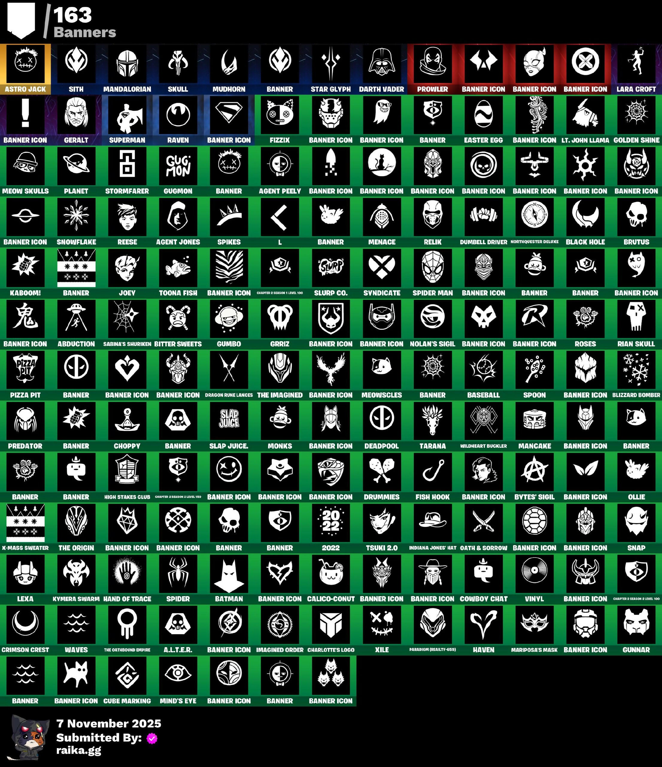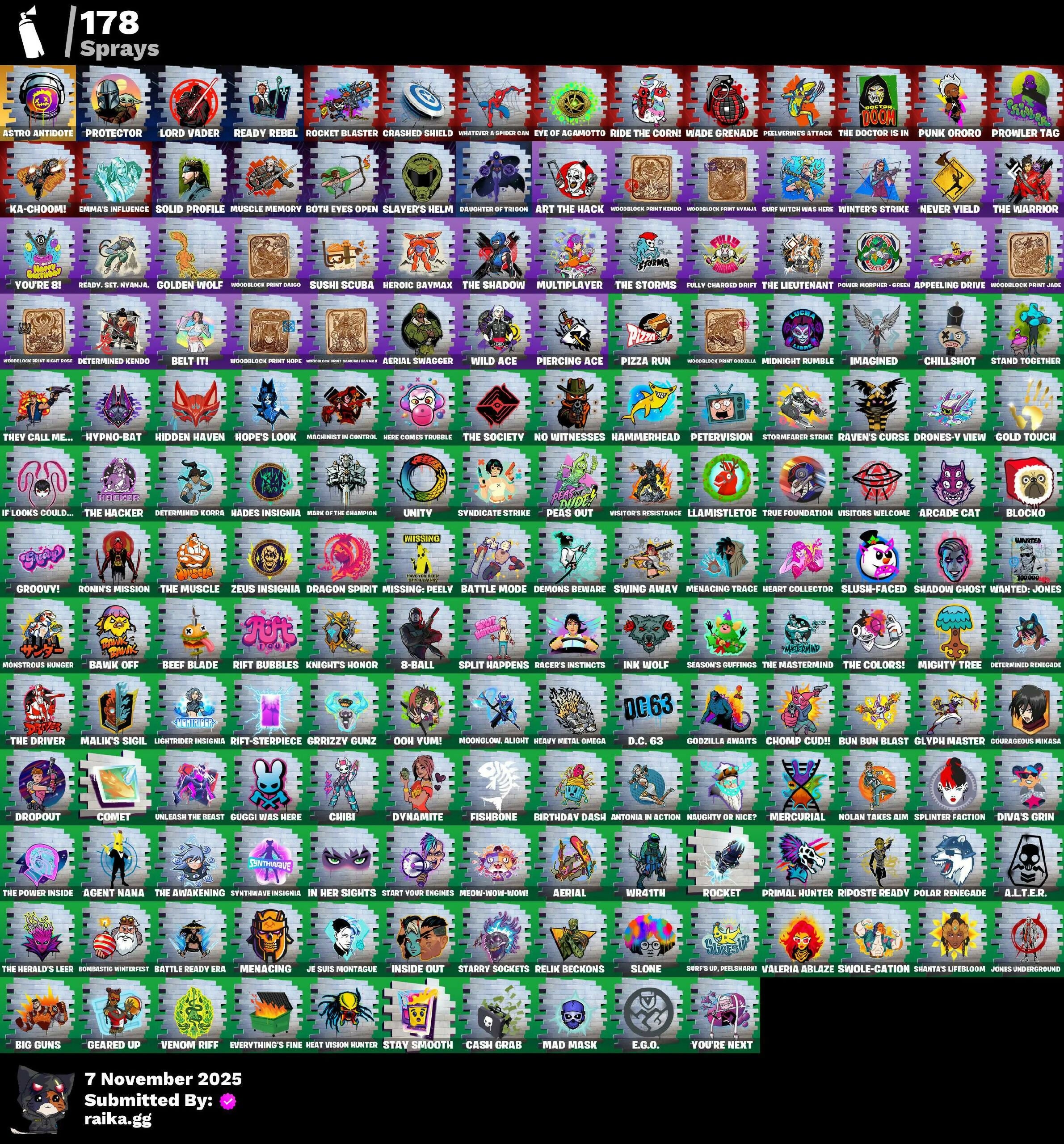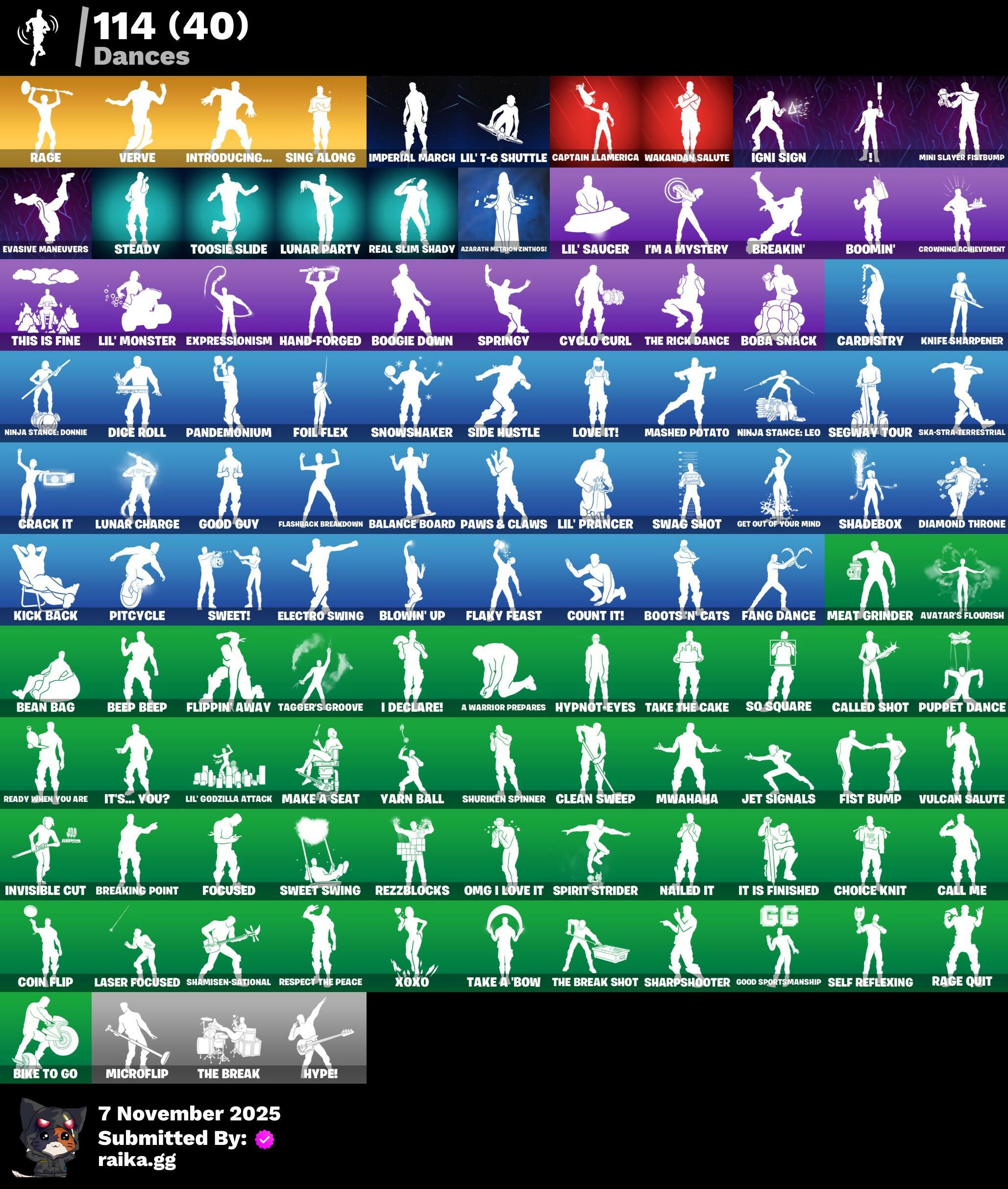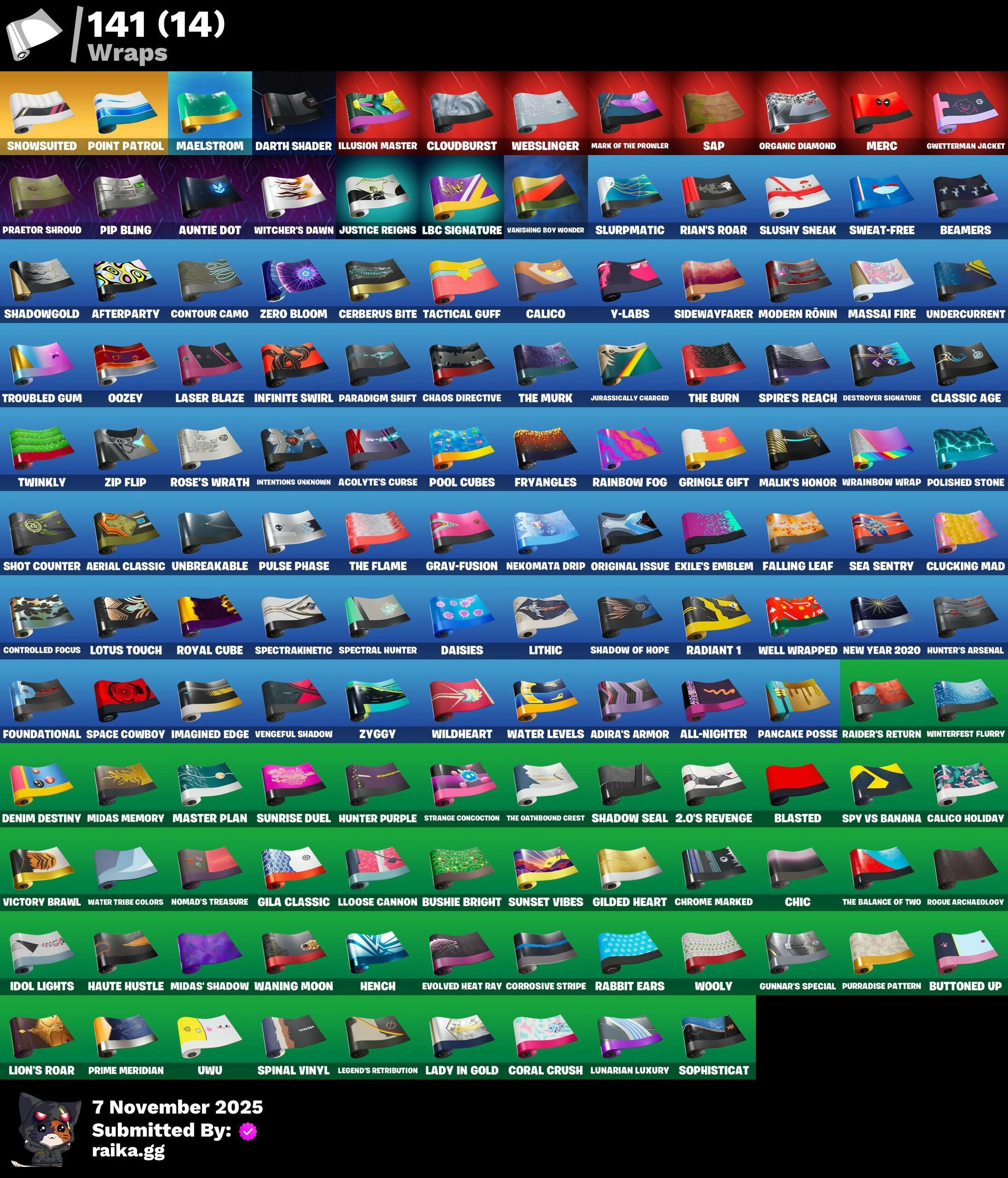 10 Orchestrator, 2.0's Revenge, 2020 Kickflip, 2022, 8-Ball, 8-Ball Janky, A Warrior Prepares, A.L.T.E.R., Abduction, Acolyte's Curse, Adira, Adira's Armor, Adira's Battle Flag, Adventure Aerial, Adventure Pack, Aerial, Aerial Classic, Aerial Swagger, Afterparty, Agent Jones, Agent Jones (Jump 31), Agent Nana, Agent Peely, Ahsoka Tano, All-Nighter, Alpha Trophy, Ancestral Bloom, Anniversary Axe, Antonia, Antonia In Action, Apex Predator, Aphrodite, Appeeling Drive, Arcade Cat, Arctic Adeline, Arroyo Pack, Art The Hack, Articulated Blade Wing, Astro Antidote, Astro Armor, Astro Jack, Astroworld Cyclone, Auntie Dot, Aurelian, Avatar's Flourish, Axe-Tral Form, Azarath Metrion Zinthos!, B Splat, Back Board, Back-Mounted Turbo Tower, Backup Blades, Balance Board, Bamboo-Tana, Banana Bomber, Banana Briefcase, Bananaxe, Banner, Banner Icon, Base Jumper, Baseball, Basecamp Bag, Bat Royale, Batman, Battle Bloom, Battle Mode, Battle Ready Era, Bawk Off, Baymax Wings, Beach Breezer, Beachcomber, Beacon Glass, Beamers, Bean Bag, Beastfang, Bedside Nanner, Beef Blade, Beep Beep, Belt It!, Beskar, Big Bite, Big Guns, Big Haul, Bike To Go, Birthday Basher, Birthday Dash, Bitter Sweets, Black Hole, Blade of the Waning Moon, Bladed Travpak, Blades of Light, Blasted, Blitz 'Brella, Blitz Axe, Blizzard Bomber, Blocko, Bloomback Sack, Blowin' Up, Blustery Bag, Board Breaker, Boba Bling, Boba Snack, Bobo, Bombastic Winterfest, Bombs Away!, Bone Patrol, Boogie Down, Boomin', Boots N' Cats, Both Eyes Open, Boulder Breakers, Bounty 'Brella, Breakfast Bounty, Breakin', Breaking Point, Breathless Blades, Brilliant Cutters, Bronzed Scimitars, Brutus, Bubloon, Bullet Rider, Bun Bun Bang Bang, Bun Bun Blast, Bunsen Backburner, Burning Ambition Valeria, Bushie Bright, Butcher's Knife, Butcher's Tools, Buttoned Up, Buzz Pack, Buzzsaw Breacher, Bytes, Bytes' Sigil, Cacodemon, Calico, Calico Holiday, Calico-Conut, Call Me, Called Shot, Captain Illamerica, Captain Jones's Shield & Pickaxe, Carbon Fiber Holster, Cardistry, Cash Grab, Cazadora, Cazadora Wings, Cerberus, Cerberus Bite, Chain Surfer, Chainsaur, Challenger Menace - Flame, Chaos Directive, Charge Pack, Charlotte, Charlotte's Logo, Chemist's Cloudglider, Chibi, Chic, Chillshot, Choice Knit, Chomp Cud!!, Chop Chop, Chop Dropper, Choppy, Chrome Marked, Chrome Punk, Chromebrella, Chromeseed, Chromestruck Fire, Chronos Lock, Clang & Basher, Classic Age, Classified, Clawbox, Clawz Retro, Clean Sweep, Cliffside Soarer, Cloud Striker, Cloudburst, Club President Helsie, Cluck, Cluck (Slurpy), Clucking Mad, Clutch & Dagger, Coin Flip, Combat Elite, Comet, Comfy Cats, Commander's Descent, Contour Camo, Controlled Focus, Coral Crush, Corrosive Stripe, Count It!, Courageous Mikasa, Cowboy Chat, Crack It, Crashed Shield, Crescent Shroom, Crimson Crest, Crimson Wish, Crowning Achievement, Crucible Blade, Crystal Axe of the Masters, Crystal Fang, Crystal Smasher, Cube Marking, Cursed Marionette, Cyclo Curl, Cymitar, D.C. 63, Daigo, Daigo's Claws, Daisies, Darkfire Claws, Darth Shader, Darth Vader, Daughter Of Trigon, De-Rezz De-Stroyer, Deadpool, Deadpool's Katanas, Dealer's Deck, Deck Ducky, Deep Dive, Demons Beware, Demonslayer Blade, Denim Destiny, Designated Hitters, Destroyer Signature, Determined Kendo, Determined Korra, Determined Renegade, Diamond Throne, Diamondclaw Picker, Dice Roll, Dimensional Gate, Dino Deck, Diva's Grin, Dive Knives, Doctor Slone, Doom Brella, Doom Slayer, Double Header, Downpour, Dragon Rider, Dragon Rune Lance, Dragon Rune Lances, Dragon Spirit, Dreamer's Two-Shot, Drome Drifter, Drone Runner's Trophy, Drones-Y View, Droopy, Dropout, Drummies, Duelist's Foil, Dumbbell Driver, Dumbell Driver, Dune Scooper, Dusk Knight, Dusty, Dynamite, Dynamo Grav-Suit, E.G.O., Eagle's Form, Easter Egg, Eclipse Brella, Eggar, El Chapulin Colorado, Electric Shredder, Electro Swing, Electro-Pincers, Elegance Blade, Elevation, Elite Servo, Ember Pick, Emergency Raft, Emma's Influence, Enchanted Lifebloom, Endless Scroll, Energized Godzilla, Energy Claw, Epic Blade of Floof, Epic Swords of Wonder, Era, Evasive Maneuvers, Everything's Fine, Evie, Evolved Heat Ray, Exile's Emblem, Expedition Bag, Expressionism, Eye Of Agamotto, FNCS Fighter, Fa-La-La-Llama, Fabio Sparklemane, Fading Ember Cloak, Falling Leaf, Fang Dance, Fanged Foresight, Fashion Accident Janky, Felina, Felina's Claw, Feline Fun, Fish Hook, Fish Thicc, Fishbone, Fishbone Flayer, Fishstick Janky, Fist Bump, Fizzix, Flaky Feast, Flapjack Flyer, Flashback Breakdown, Flavor-Dusted Sparklewings, Flight Risk, Flip Flyer, Flippin' Away, Flux Silvera, Focused, Foil Flex, Fortilla Flier, Foundation's Mantle, Foundation's Plasma Spike, Foundational, Foundational 'Brella, Fox Drifter, Frequency Flyer, Frosty Globes, Fryangles, Fully Charged Drift, Galactic Pack, Gear Specialist Maya, Geared Up, Geralt, Geralt of Rivia, Get Out Of Your Mind, Gila Classic, Gilded Heart, Glorious Giftblade, Glyph Master, Godzilla Awaits, Godzilla Evolved, Godzilla's Exo-Spine, Gold Brutus, Gold Dagger Pack, Gold Midas, Gold Touch, Golden King, Golden Scythe, Golden Shine, Golden Wolf, Good Guy, Good Sportsmanship, Grand Glacier Glider, Grav-Fusion, Griffin's Talon, Grind Bag, Gringle Gift, Grizzly Gunz, Groots Sap Axes, Groovy!, Grriz, Grrizzy Gooper, Grzzly Keys, Guggi Was Here, Guggimon, Gugmon, Gum Brawler, Gumbo, Gummy Sack, Gunn-Brella, Gunnar, Gunnar's Special, Gwenpool's Katanas, Gwettermann Jacket, Hack & Smash, Hadean Gate, Hades Insignia, Hammerhead, Hammerhead Morty, Hand Of Trace, Hand-Forged, Har-Har-Har!, Harlowe, Hat - Dark, Hatch Pack, Haute Hustle, Haven, Heart Collector, Heart's Carver, Heart's Rest, Heartwinder, Heat Vision Hunter, Heavy Metal Omega, Helmet On, Helsie, Hench, Hench Hauler, Here Comes Trouble, Hero Baymax, Heroic Baymax, Hidden Haven, High Society Glider, High Stakes Club, Holiday Boxy, Holly Hatchets, Hope, Hope Star, Hope's Look, Horde's War Wheel, Hot Pokers, Hot Slurp Balloon, Hunter Purple, 