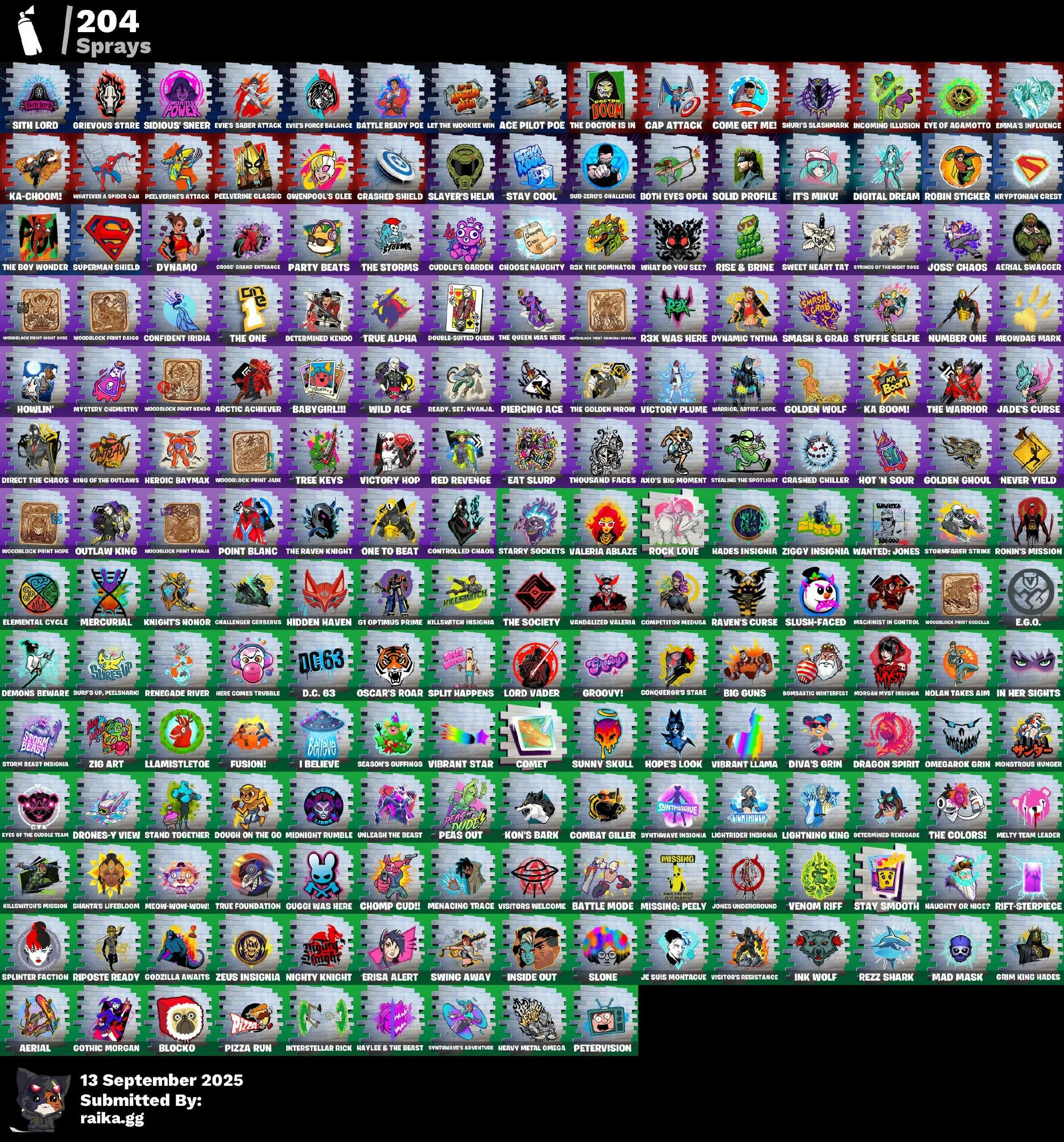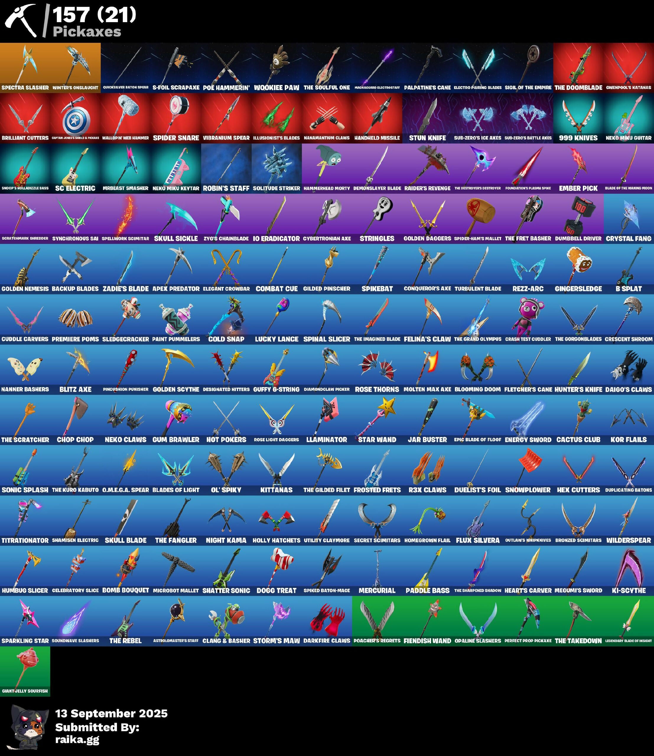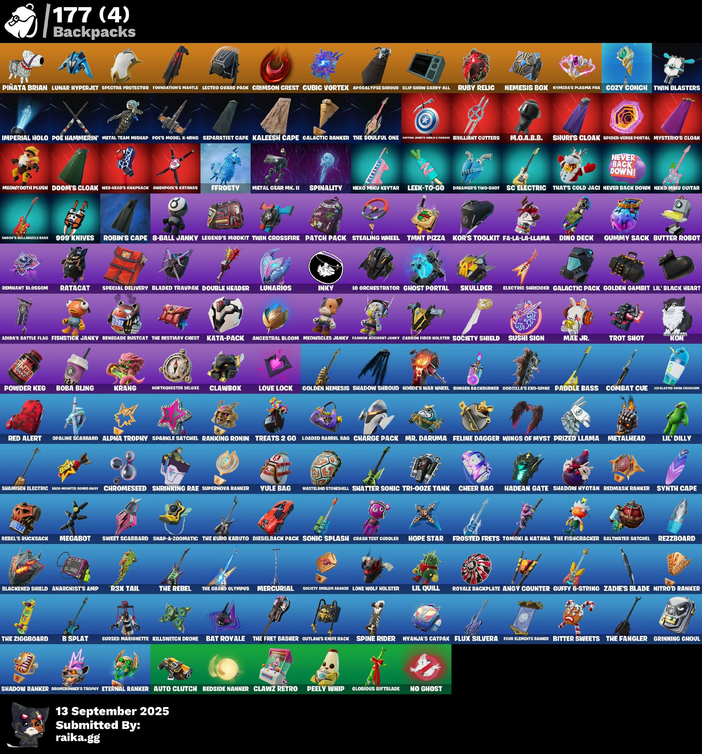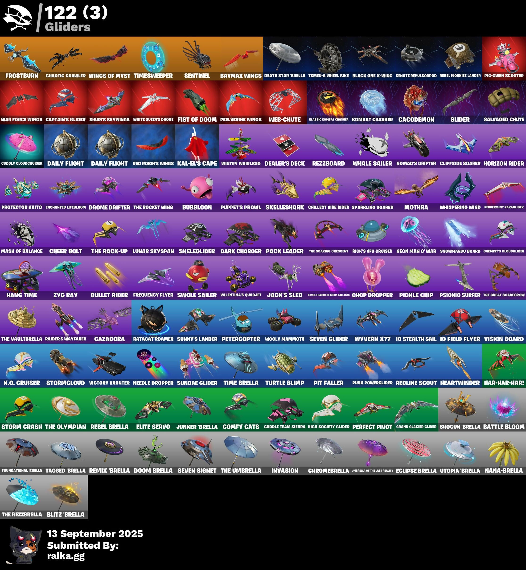 (Snikt!), 1-Ball, 10 Orchestrator, 2022, 8-Ball Janky, 999, 999 Knives, Abduction, Ace Pilot Poe, Adira's Armor, Adira's Battle Flag, Aerial, Aerial Classic, Aerial Swagger, Agent Jones, Alpha Trophy, Anarchist's Amp, Ancestral Bloom, Angy Counter, Apex Predator, Apocalypse Shroud, Apprentice Evie, Arcane Research, Arctic Achiever, Arctic Adeline, Astromaster's Staff, Aura, Auto Clutch, Axo's Big Moment, B Splat, Babygirl!!, Back-Mounted Bonus Away, Backup Blades, Baron's Hoard, Bat Royale, Battle Blessing, Battle Bloom, Battle Mode, Battle Ready Poe, Baymax Wings, Beamers, Bear Hug, Bedside Nanner, Bi-Han, Big Dill, Big Fan, Big Guns, Bird Call, Birdarang Flourish, Bitter Sweets, Black Leader, Black One X-Wing, Black Panther (Shuri), Blackened Shield, Blade Of The Waning Moon, Bladed Travpak, Blades Of Light, Blitz 'Brella, Blitz Axe, Blocko, Blooming Doom, Boba Bling, Bomb Bouquet, Bombastic Winterfest, Bone Breaker, Bones, Both Eyes Open, Boxer, Brilliant Cutters, Brite Hatsune Miku, Bronzed Scimitars, Bubbloon, Bullet Rider, Bunsen Backburner, Burning Ambition Valeria, Bushie Bright, Butter Buddy, Butter Robot, Buttoned Up, Bytes' Sigil, Cacodemon, Cactus Club, Call Me, Camo War Machine, Cap Attack, Captain America's Shield & Promise, Captain Jones, Captain Jones (Pen & Ink), Captain Jones's Shield & Pokaae, Captain Llamerica, Captain's Glider, Carbon Fiber Holster, Carbon Scarlet, Card Drop, Carmine Rosso, Cassidy Quinn, Cauldron Chill, Cazadora, Celebratory Slice, Cerberus Bite, Chalked Up 1-Ball, Challenger Cerberus, Chaos Directive, Chaos Director, Chaotic Crawler, Charge Pack, Charlotte, Charlotte's Logo, Cheer Bag, Cheer Bolt, Chemist's Cloudglider, Chillest Vibe Rider, Choice Knit, Chomp Cudd!!, Choose Naughty, Chop Chop, Chop Dropper, Choppy, Chrome Marked, Chromebrella, Chromeseed, Chronos Lock, Clang & Basher, Clawbox, Clawz Retro, Clean Sweep, Cliffside Soarer, Clip Show Carry-All, Cold Snap, Combat Cue, Combat Giller, Come Get Me!, Comet, Comfy Cats, Competitor Medusa, Confident Iridia, Conqueror's Axe, Conqueror's Charge, Conqueror's Claim, Conqueror's Stare, Contour Camo, Controlled Chaos, Controlled Focus, Corrosive Stripe, Count It!, Cozy Conch, Crash Test Cuddler, Crashed Chiller, Crashed Shield, Crescent Shroom, Crimson Crest, Cross' Grand Entrance, Crowning Achievement, Crystal Fang, Cubic Vortex, Cuddle Carvers, Cuddle Team Sierra, Cuddle Team Specialist, Cuddle's Garden, Cuddly Cloudcruiser, Cursed Marionette, Cybertronian Axe, Cyclo Curl, D.C. 63, Dagger Dance, Daigo, Daigo's Claws, Daily Flight, Daisies, Dancefloor Diva, Dark Charger, Dark Gwenpool, Dark Side, Darkfire Claws, Dawn Duelist Nisha, Deal'em Cassidy Quinn, Dealer's Deck, Death Star 'Brella, Deep Future, Demon Hunter Hope, Demons Beware, Demonslayer Blade, Designated Hitters, Determined Kendo, Determined Renegade, Diamond Throne, Diamondclaw Picker, Dieselback Pack, Digital Dream, Dill! With It, Dillicious, Dillinger The Gherk, Dino Deck, Direct The Chaos, Diva Fever, Diva's Dancefloor, Diva's Grin, Do The 'Split, Doctor Slone, Dogg Treat, Doom, Doom Brella, Doom's Cloak, Double Header, Double-Barreled Boom Ballasts, Double-Suited Queen, Dough On The Go, Doze Dab, Dragon Rune Lances, Dragon Spirit, Dreamer's Two-Shot, Drome Drifter, Dromemunner's Trophy, Drones-Y View, Duelist's Card Trick, Duelist's Foil, Dumbbell Driver, Dupli-Kate, Duplicating Batons, Duplikates, Dusk Knight, Dyna-Boom!, Dynamic Tntina, Dynamo, Dynamo Tntina, Dynamo Tntoon-A, E.G.O., Eat Slurp, Eclipse Brella, Electric Shredder, Electro Pairing Blades, Elegant Crowbar, Elemental Cycle, Elite Servo, Ember Pick, Emma Frost, Emma's Influence, Emperor Palpatine, Emperor's Might, Enchanted Lifebloom, Energized Godzilla, Energy Sword, Epic Blade Of Floof, Erisa Alert, Eternal Ranker, Evie's Force Balance, Evie's Saber Attack, Evolved Heat Ray, Eye Of Agamotto, Eyes Of The Cuddle Team, Fa-La-La-La-Fishstick, Fa-La-La-Llama, Fancy Peter Griffin, Fashion Accident Janky, Feel The Force, Felina, Felina's Claw, Feline Dagger, Ffrosty, Fiendish Wand, Final Harbinger, Fireworks Salvo, Fishstick, Fishstick Janky, Fist Bump, Fist Of Doom, Fizzix, Flashback Breakdown, Fletcher Kane, Fletcher's Cane, Flux Silvera, Foil Flex, Force Lightning, Foundation's Mantle, Foundation's Plasma Spike, Foundational, Foundational 'Brella, Four Elements Banner, Frequency Flyer, Front Page Pose, Frostburn, Frosted Frets, Frozen Treat Cart, Fryangles, Full Moon Fletcher Kane, Fusion!, G1 Optimus Prime, GG Cuddlez, Galactic Pack, Galactic Ranker, General Grievous, Get Schwifty, Ghost Portal, Giant Jelly Sourfish, Gila Classic, Gilded Pinscher, Gingerbread Raider, Gingersledge, Glorious Giftblade, Glory to Latveria, Godzilla Awaits, Godzilla Evolved, Godzilla's Exo-Spine, Golden Conqueror, Golden Daggers, Golden Gambit, Golden Ghoul, Golden Grin, Golden Nemesis, Golden Scythe, Golden Wolf, Good Guy, Gothic Morgan, Grand Glacier Glider, Grievous Stare, Grim King Hades, Gringle Gift, Grinning Ghoul, Groovy!, Grriz, Guardian Jade, Gucci Was Here, Guffy 6-String, Guffy G-String, Guggimon, Gugmon, Gum Brawler, Gumbo, Gumbo (Sour), Gummy Sack, Gunnar's Special, Gunslinger Outlaw Midas, Gwen-Step, Gwenpool, Gwenpool's Glee, Gwenpool's Katanas, Gwetterman Jacket, Hadean Gate, Hades Insignia, Hammerhead Morty, Hand of Trace, Hand-Forged, Handheld Missile, Hang Time, Har-Har-Har!, Harbinger Armor OmegarOK, Harlowe, Harlowe (Helmet), Haruka Of The Masks, Haute Hustle, Have A Seat, Haven, Haylee & The Beast, Haylee Skye, Head (Droopy), Heart Chopper, Heart's Carver, Heart's Desire, Heartwinder, Heavy Metal Omega, Hellfire Dance, Here Comes Trubble, Hero Baymax, Heroic Baymax, Hex Cutters, Hidden Haven, High Society Glider, Holiday Boxy, Holly Hatchets, Homegrown Flail, Hope, Hope Star, Hope's Look, Horde's War Wheel, Horizon Rider, Hot 'N Sour, Hot Pokers, Howlin', Humbug Slicer, Hunter Purple, Hunter's Knife, Hype!, Hypnot-Eyes, I Believe, I'm A Mystery, IO Eradicator, IO Field 