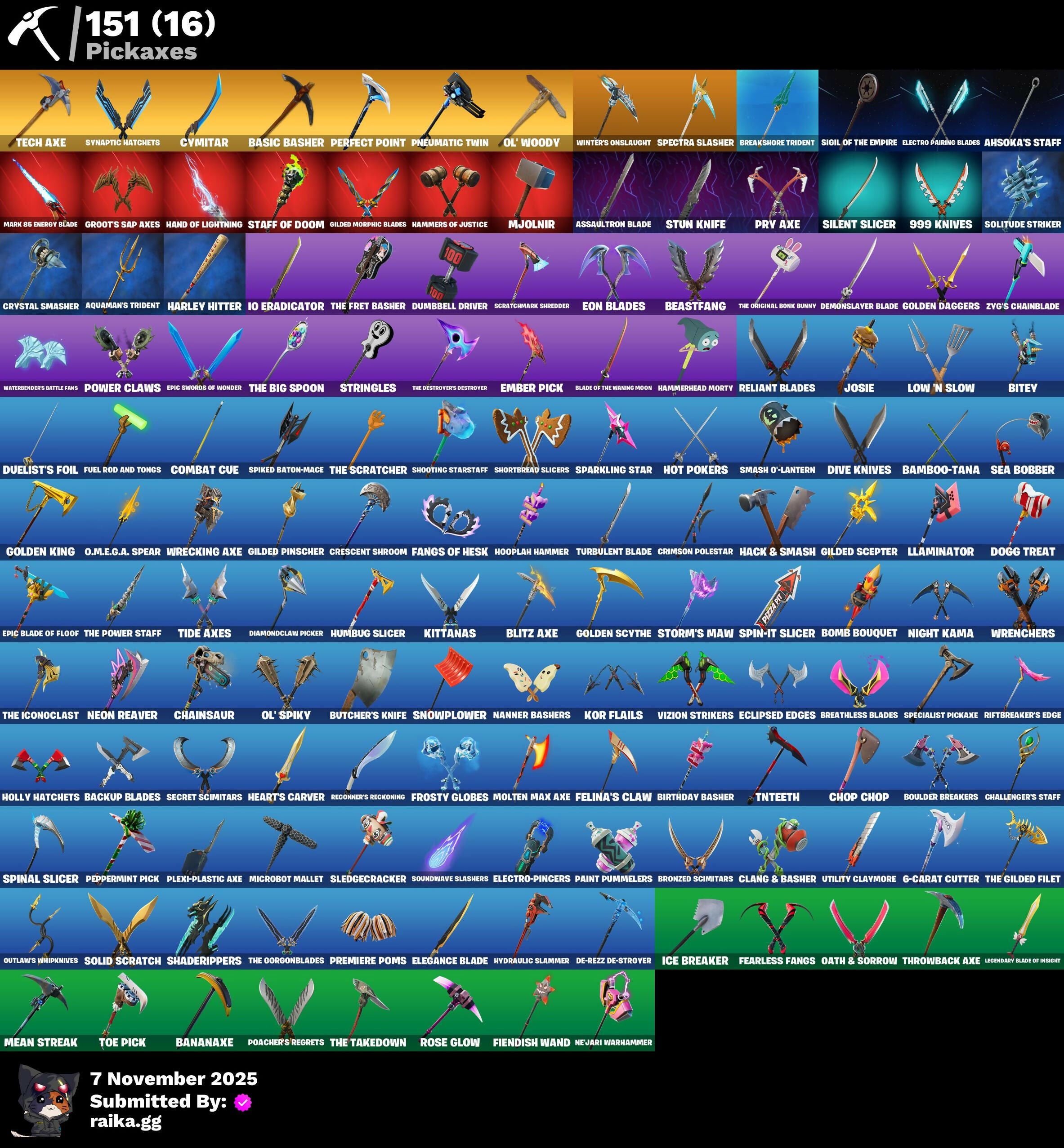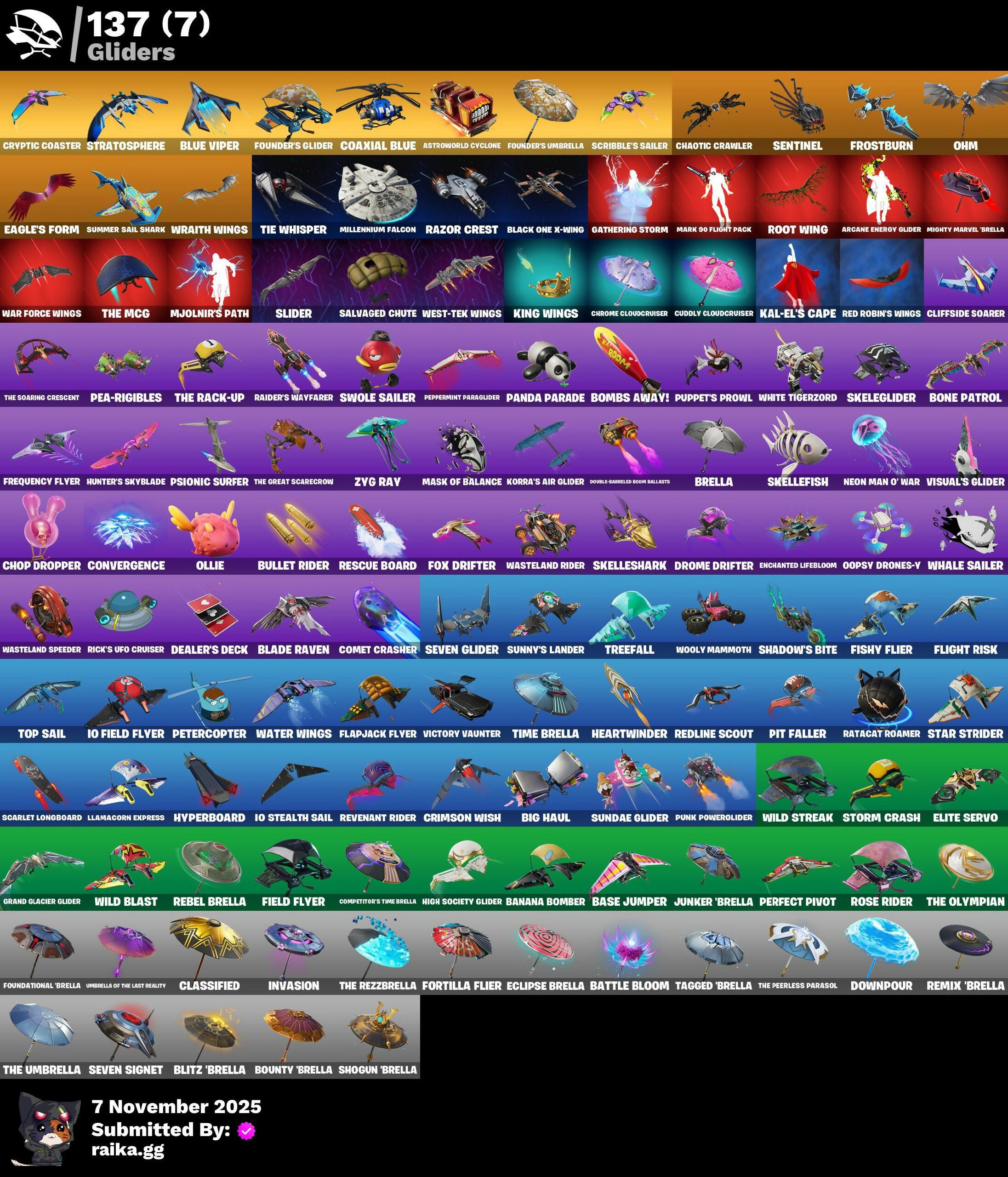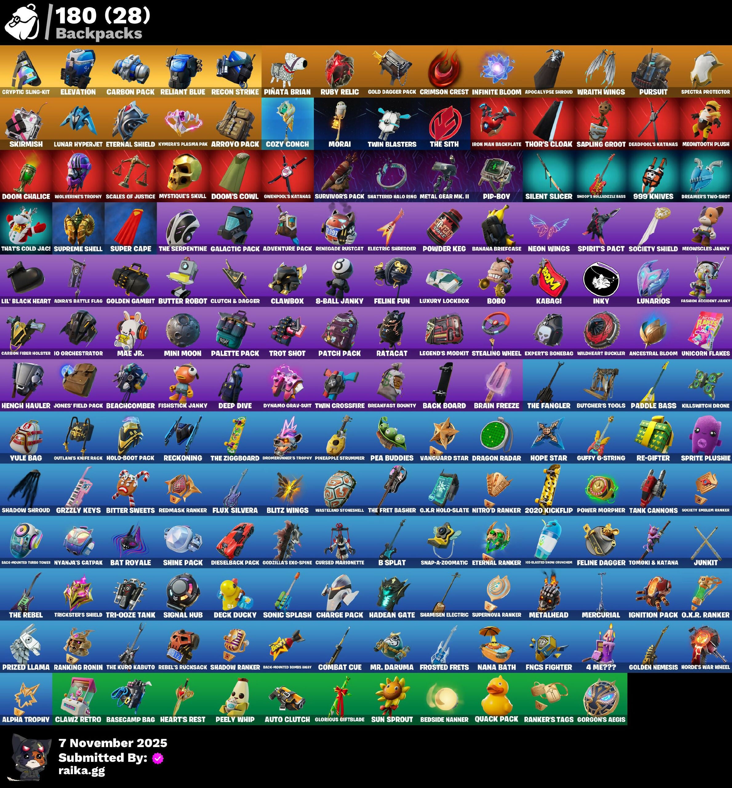 1-Ball, 2020 Kickflip, 2022, 4 Me???, 6-Carat Cutter, 8-Ball, 8-Ball Janky, 999 Knives, A.L.T.E.R., Abduction, Adira's Battle Flag, Adira’s Armor, Adventure Pack, Aerial, Aerial Classic, Aerial Swagger, Agent Jones, Agent Nana, Agent Peely, Ahsoka Tano, Ahsoka's Staff, Air Shredder, Alpha Trophy, Ancestral Bloom, Antonia, Antonia In Action, Aphrodite, Apocalypse Shroud, Aquaman, Aquaman's Trident, Arcane Energy Glider, Arcane Steel, Armored Victory, Arroyo Pack, Art The Hack, Arthur Curry, Assaultron Blade, Astro Jack, Astroworld Cyclone, Auntie Dot, Aura, Auto Clutch, Avengers, B Splat, B.R.U.T.E. Competitor, Babygirl!!, Back Board, Back-Mounted Bombs Away, Back-Mounted Turbo Tower, Backup Blades, Bamboo-Tana, Banana Bomber, Banana Briefcase, Bananaxe, Banner, Banner Icon, Base Jumper, Basecamp Bag, Basic Basher, Bat Royale, Batman, Battle Bloom, Battle Mode, Be The Mastermind, Beachcomber, Beacon Trance, Beamers, Bear Hug, Beastfang, Beatzbunny, Bedside Nanner, Beep Beep, Belt It!, Berserker Barrage, Big Haul, Bike To Go, Birthday Basher, Birthday Dash, Bitey, Bitter Sweets, Black Leader, Black One X-Wing, Blade Raven, Blade of the Waning Moon, Blasted, Blitz 'Brella, Blitz Axe, Blitz Wings, Blocko, Bloomin' Bouquet, Blue Viper, Bobo, Bolt, Bomb Bouquet, Bombastic Winterfest, Bombs Away!, Bone Patrol, Boogie Down, Boomin', Both Eyes Open, Boulder Breakers, Bounty 'Brella, Brain Freeze, Breakfast Bounty, Breakshore Trident, Breathless Blades, Brella, Brite Raider, Bronzed Scimitars, Brutus, Buffer Fish, Bullet Rider, Bunnymoon, Burning Ambition Valeria, Bushie Bright, Butcher's Knife, Butcher's Tools, Butter Robot, By The Horns, Calico, Call Me, Captain America's Shield, Carbon Commando, Carbon Fiber Holster, Carbon Pack, Carbon Scarlet, Card Drop, Cardistry, Cash Grab, Cauldron Chill, Cerberus, Cerberus Bite, Cerberus Medallion, Chainsaur, Chalked Up 1-Ball, Challenger Cerberus, Challenger's Staff, Champion Kyra, Chaos Directive, Chaos Director, Chaos Explorer, Chaotic Crawler, Charge Pack, Charlotte, Charlotte's Logo, Chibi, Chic, Choice Knit, Choose Naughty, Chop Chop, Chop Dropper, Choppy, Chromatic, Chrome Cloudcruiser, Chrome Marked, Clang & Basher, Classic Wolverine, Classified, Clawbox, Clawz Retro, Clean Sweep, Cliffside Soarer, Cloud Striker, Cloudburst, Clutch & Dagger, Coaxial Blue, Cobalt Overdrive, Codsworth's Cleanup, Coin Flip, Collector Kado Thorne, Combat Cue, Combat Giller, Comet, Comet Crasher, Competitor Medusa, Competitor's Time Brella, Conch Call, Console Cup, Constructor, Contour Camo, Controlled Chaos, Convergence, Coral Crush, Corrosive Stripe, Corrosive Tag, Cowboy Chat, Cozy Conch, Crabby King, Crack It, Crashed Chiller, Crazy Castle, Crescent Shroom, Crimson Crest, Crimson Polestar, Crimson Wish, Crowning Achievement, Cryptic Coaster, Cryptic Sling-Kit, Crystal Smasher, Cuddly Cloudcruiser, Cursed Marionette, Cymlar, Daft Punk Profile, Daisies, Dawn Duelist Nisha, De-Rezz De-Stroyer, Deadpool, Deadpool's Katanas, Dealer's Deck, Deck Ducky, Deep Dab, Deep Dive, Demons Beware, Demonslayer Blade, Denim Destiny, Determined Korra, Determined Renegade, Diamond Diva, Diamond Throne, Diamondclaw Picker, Dice Roll, Dieselback Pack, Direct The Chaos, Diva’s Grin, Dive Knives, Do The I'Split, Doctor Doom, Doctor Slone, Dogg Treat, Dolphin, Doom Chalice, Doom's Cowl, Double-Barreled Boom Ballasts, Downpour, Doze Dab, Dragon Radar, Dragon Rune Lances, Dragon Spirit, Dreamer's Two-Shot, Drome Drifter, Dromerunner's Trophy, Drones-V View, Droopy, Dropout, Duelist's Foil, Dumbbell Driver, Dumbell Driver, Durrr Burger, Dusk Knight, Dyna-Boom!, Dynamic Tintina, Dynamite, Dynamo, Dynamo Grav-Suit, Dynamo Tntina, Dynamo Tntoon-A, E.G.O., Eagle's Form, Eclipse Brella, Eclipsed Edges, Electric Shredder, Electro Pairing Blades, Electro-Pincers, Elegance Blade, Elemental Cycle, Elevation, Elite Servo, Ember Pick, Enchanted Lifebloom, Eon Blades, Epic Blade of Floof, Epic Swords of Wonder, Eternal Emblem, Eternal Knight, Eternal Ranker, Eternal Shield, Evasive Maneuvers, Everything’s Fine, Expert's Bonebag, FNCS Fighter, Fade, Fade Out, Falling Leaf, Fancy Peter Griffin, Fangs of Hesk, Fashion Accident Janky, Fearless Fangs, Felina, Felina's Claw, Feline Dagger, Feline Fun, Feral Finisher, Ferocious, Field Flyer, Fiendish Wand, Final Eclipse, Final Harbinger, Fire Show, Fish Hook, Fish Thicc, Fishbone, Fishstick Janky, Fishy Flier, Fist, Fist Bump, Fixer, Flaky Feast, Flapjack Flyer, Flashback Breakdown, Flight Risk, Flippin' Away, Flux Silvera, Foil Flex, Fortilla Flier, Foundational 'Brella, Founder's Glider, Founder's Umbrella, Fox Drifter, Frequency Flyer, Frostburn, Frosted, Frosted Frets, Frosty Globes, Fryangles, Fuel Rod and Tongs, Fully Charged Drift, Fusion!, GG Snakes, Galactic Pack, Gathering Storm, Gear Specialist Maya, Get Griddy, Get Schwifty, Gilded Heart, Gilded Morphic Blades, Gilded Pinscher, Gilded Scepter, Gingerbread Raider, Glorious Giftblade, Godzilla's Exo-Spine, Gold Brutus, Gold Dagger Pack, Gold Midas, Gold Touch, Golden Daggers, Golden Gambit, Golden Grin, Golden King, Golden Nemesis, Golden Scythe, Golden Shine, Good Guy, Good Sportsmanship, Gorgon's Aegis, Grand Glacier Glider, Grav-Fusion, Greed, Grim King Hades, Grizzly Keys, Groot, Groot Glow, Groot's Sap Axes, Groovy!, Ground Pound, Gucci Was Here, Guffy 6-String, Guggimon, Gugmon, Gunmetal Idol, Gwenpool's Katanas, Gwetterman Jacket, Hack & Smash, Hadean Gate, Hades Insignia, Hammerhead, Hammerhead Morty, Hammers of Justice, Hand of Lightning, Hand of Trace, Hand-Forged, Harbinger Armor Omegark, Harbinger Of Victory, Harley Hitter, Haute Hustle, Have A Seat, Haven, Heart Collector, Heart's Carver, Heart's Rest, Heartburst, Heartwinder, Heat Vision Hunter, Heavy Metal Omega, Hello Friend, Hench, Hench Hauler, Heron Stance Hero, High Society Glider, Holiday Boxy, Holly Hatchets, Holo-Boot Pack, Hooplah Hammer, Hope, Hope Star, Hope’s Look, Horde's War Wheel, Hot Pokers, Humbug Slicer, Hunter