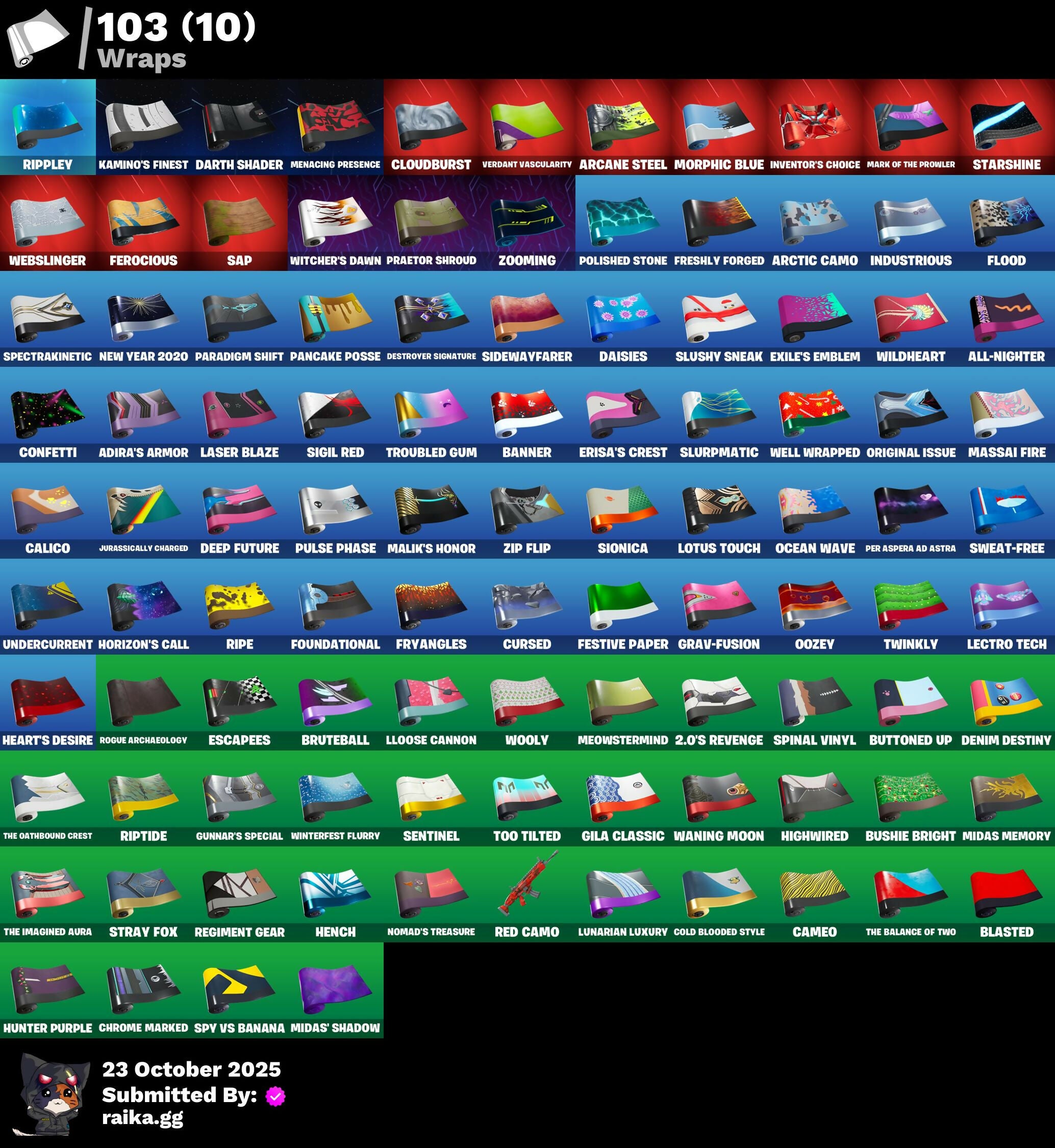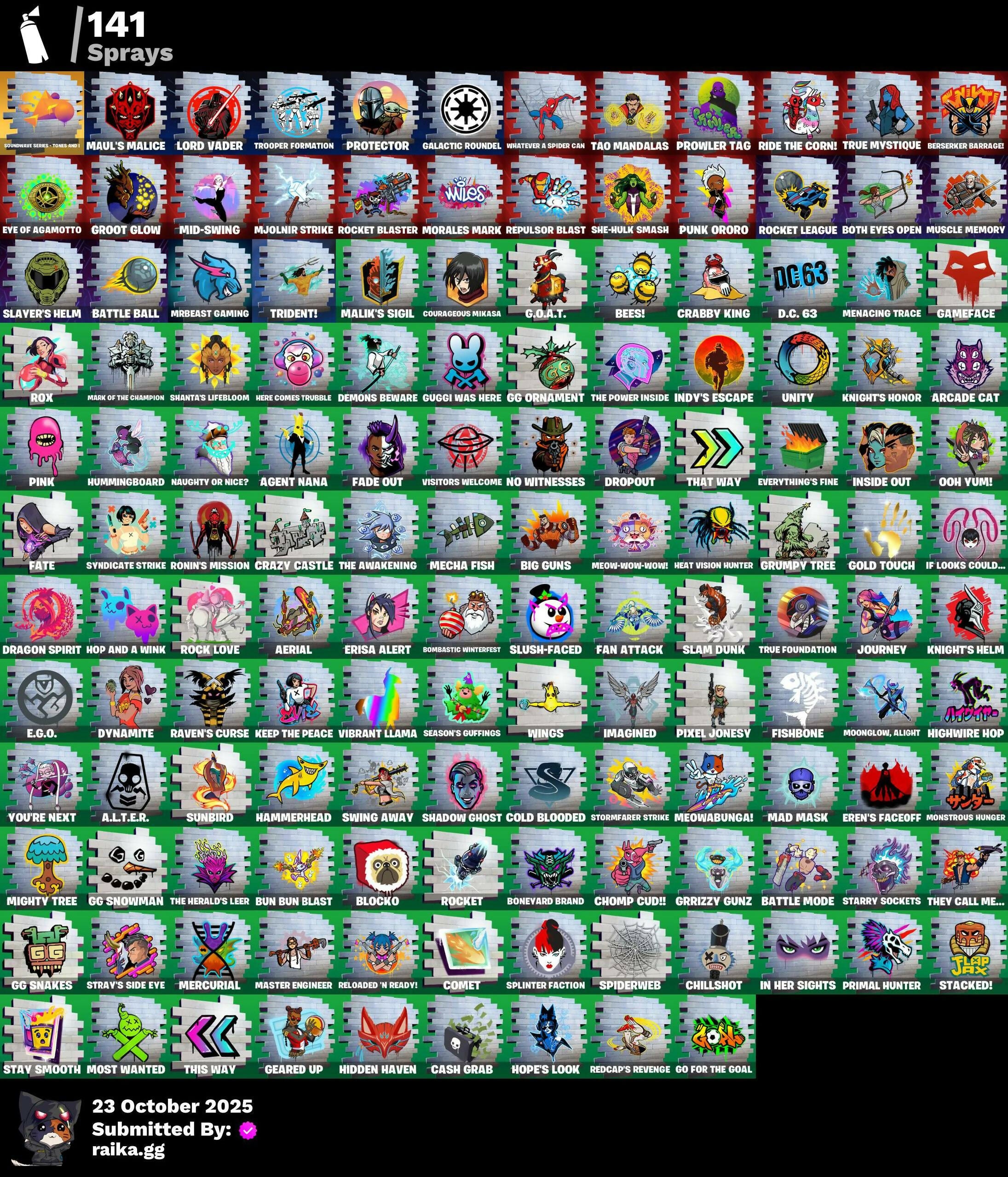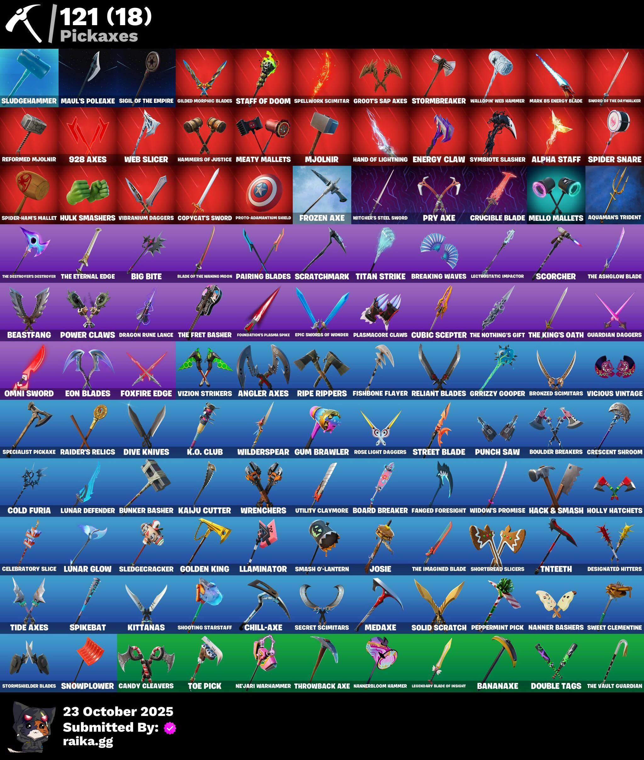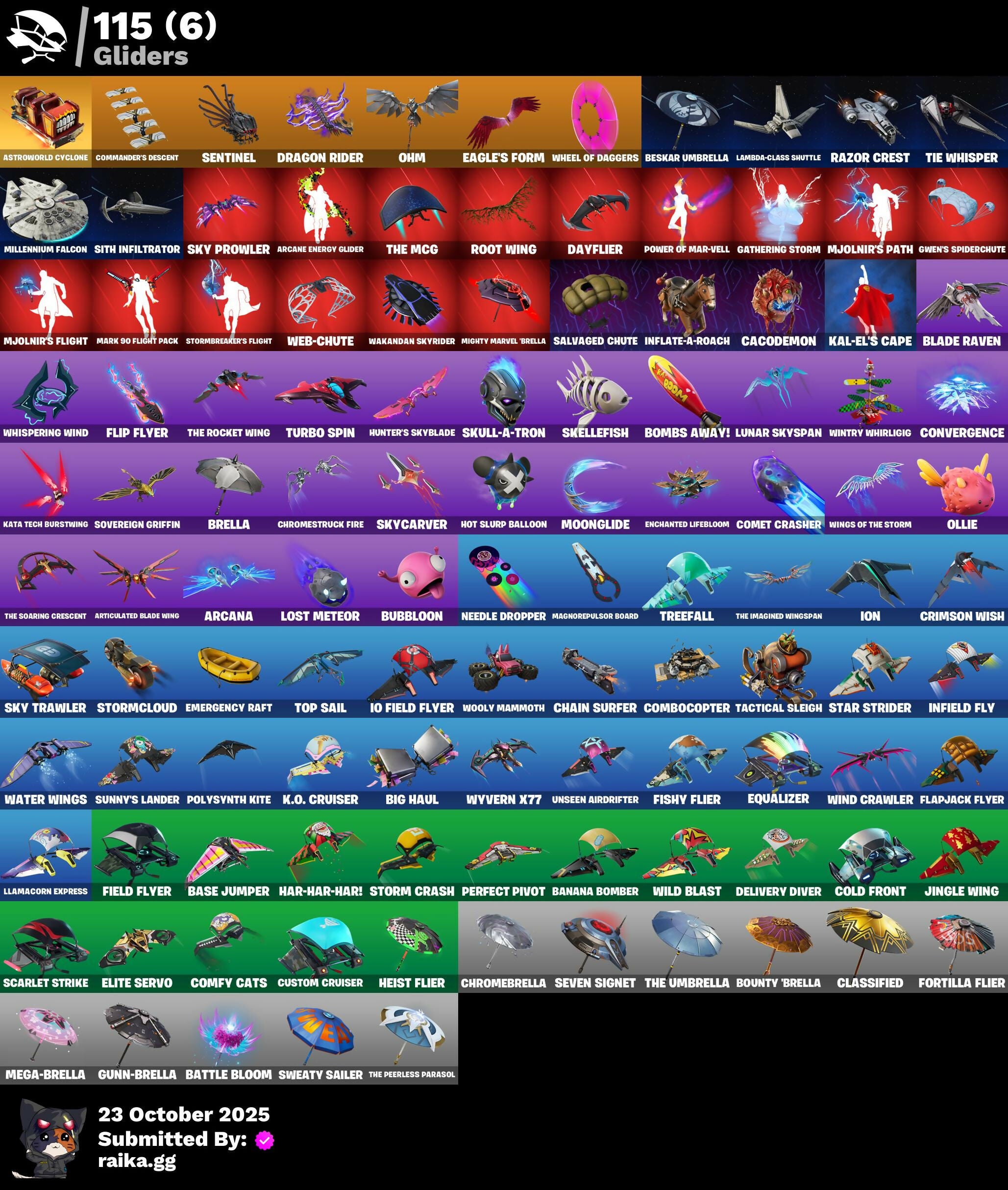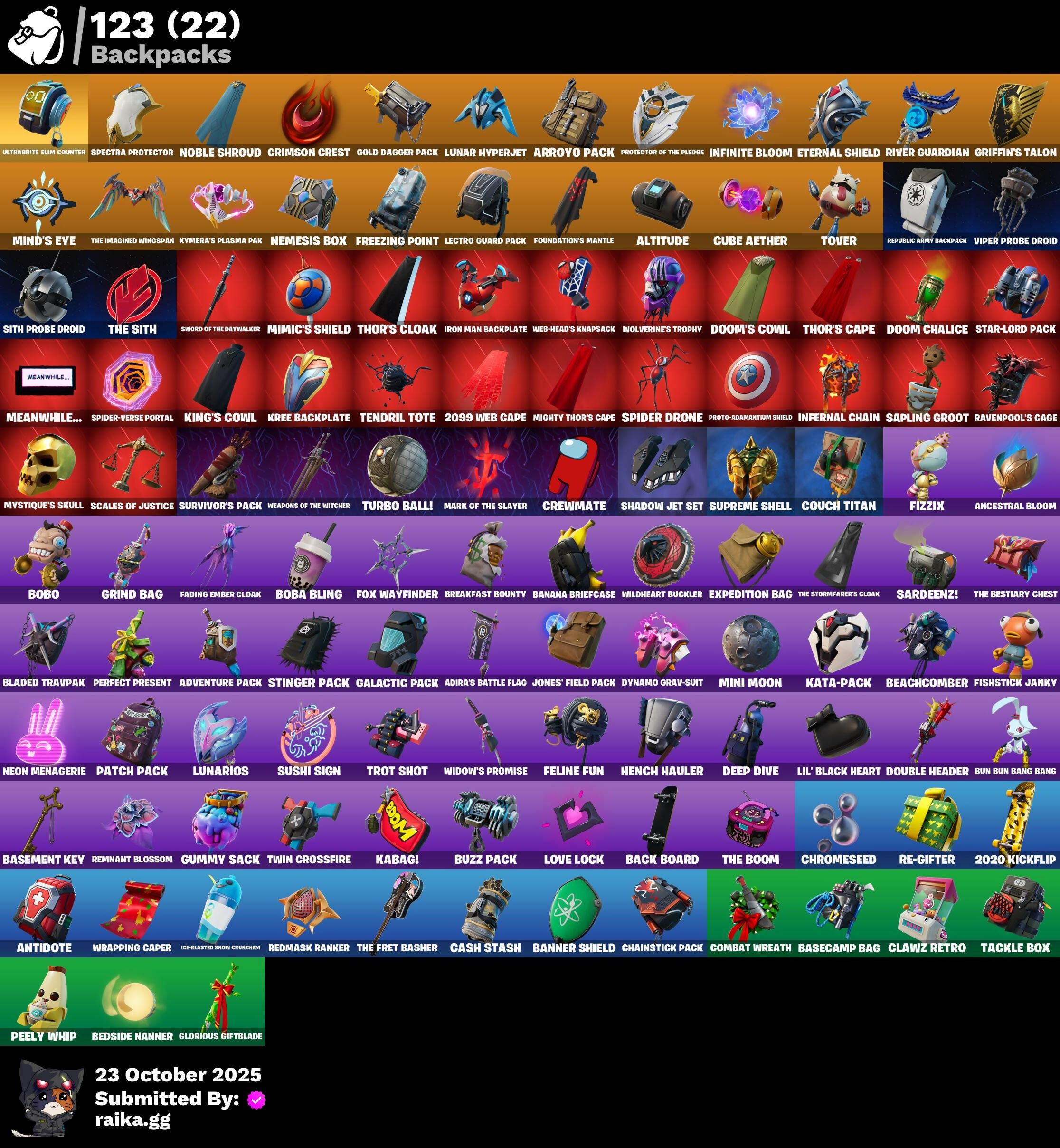 2.0’s Revenge, 2020 Kickflip, 2099 Web Cape, 212TH Battalion Trooper, 501st Trooper, 928 Axes, A.L.T.E.R., Abduction, Adira, Adira's Armor, Adira's Battle Flag, Adventure Pack, Aerial, Agent Jones, Agent Nana, Agent Peely, Ahsoka's Clone Trooper, Air Shredder, All-Nighter, Alpha Staff, Altitude, Ancestral Bloom, Angler Axes, Antidote, Aquaman, Aquaman's Trident, Arachrobatics, Arcade Cat, Arcana, Arcane Energy Glider, Arcane Steel, Arctic Adeline, Arctic Camo, Arroyo Pack, Arthur Curry, Articulated Blade Wing, Ascension Nezumi, Astro Armor, Astro Jack, Astroworld Cyclone, Aurelian, Back Board, Bacon, Balance Board, Banana Bomber, Banana Briefcase, Bananaxe, Banner, Banner Icon, Banner Shield, Base Jumper, Baseball, Basecamp Bag, Basement Key, Batman, Battle Ball, Battle Bloom, Battle Call, Battle Mode, Beach Chair, Beachcomber, Beast Boy, Beastfang, Bedside Nanner, Beep Beep, Bees!, Berserker Barrage, Beskar Umbrella, Big Bite, Big Guns, Big Haul, Black Hole, Black Panther, Blade, Blade Raven, Blade of the Waning Moon, Bladed TravPak, Blasted, Blocko, Blowin' Up, Board Breaker, Boba Bling, Boba Snack, Bobo, Bombastic Winterfest, Bombs Away!, Bone, Boneyard Brand, Boogie Down, Boomin', Both Eyes Open, Boulder Breakers, Bounty 'Brella, Branded Brawler, Breakfast Bounty, Breaking Point, Breaking Waves, Breezy, Brella, Bronzed Scimitars, Bruteball, Brutus, Bubblegum Highwire, Bubbloon, Bullpen Brawler Dusty, Bun Bun Bang Bang, Bun Bun Blast, Bunker Basher, Bunker Jonesy, Bushie Bright, Buttoned Up, Buzz Pack, Bytes, Bytes' Sigil, Cabbie, Cacodemon, Calico, Call Me, Called Shot, Cameo, Candy Cleavers, Captain America, Captain America's Shield, Captain Marvel, Cash Grab, Cash Stash, Cat Flip, Celebratory Slice, Chain Surfer, Chainstick Pack, Charlotte's Logo, Chef's Special, Chill-Axe, Chillshot, Choice Knit, Chomp Cud!!, Chrome Marked, Chrome Punk, Chromebrella, Chromeseed, Chromestruck Fire, Classic Wolverine, Classified, Clawz Retro, Clean Sweep, Cloudburst, Club President Helsie, Cluck Strut, Coin Flip, Cold Blooded, Cold Blooded Ace, Cold Blooded Style, Cold Front, Cold Furia, Combat Elite, Combat Wreath, Combocopter, Comet, Comet Crasher, Comfy Cats, Commander's Descent, Confetti, Conjure Weapon, Convergence, Copycat's Sword, Coruscant Guard, Couch Titan, Courageous Mikasa, Cowboy Chat, Crabby King, Crazy Castle, Crescent Shroom, Crewmate, Crimson Crest, Crimson Wish, Crowning Achievement, Crucible Blade, Cube Aether, Cubic Scepter, Cursed, Custom Cruiser, Cyclo Curl, D.C. 63, Dagger Dance, Daisies, Darth Shader, Darth Vader, Dayflier, Daywalker's Kata, Deadpool, Deep Dive, Deep Future, Delivery Diver, Demons Beware, Denim Destiny, Designated Hitters, Destroyer Signature, Diamond Shapes, Distraction Dance, Dive Knives, Doctor Doom, Dolphin, Doom Chalice, Doom Slayer, Doom's Cowl, Double Header, Double Tags, Double Up, Dragon Rider, Dragon Rune Lance, Dragon Rune Lances, Dragon Spirit, Droop, Dropout, Dusty, Dynamite, Dynamo Grav-Suit, E.G.O., Eagle's Form, Easter Egg, Electro Swing, Elite Servo, Emergency Raft, Empress Fan Dance, Enchanted Lifebloom, Energy Claw, Eon Blades, Epic Swords of Wonder, Equalizer, Eren Jaeger, Eren's Faceoff, Erisa, Erisa Alert, Erisa's Crest, Escapees, Eternal Emblem, Eternal Knight, Eternal Shield, Evasive Maneuvers, Everything's Fine, Evie, Exile's Emblem, Expedition Bag, Expressionism, Eye Of Agamotto, Face Palm, Fade, Fade Out, Fading Ember Cloak, Fan Attack, Fanged Foresight, Fate, Feline Fun, Ferocious, Festive Paper, Field Flyer, Fish Hook, Fishbone, Fishbone Flayer, Fishstick Janky, Fishy Flier, Fist, Fizzix, Flapjack Flyer, Flip Flyer, Flippin' Away, Flood, Focused, Fortilla Flier, Foundation's Mantle, Foundation's Plasma Spike, Foundational, Fox Wayfinder, Foxfire Edge, Freezing Point, Freshly Forged, Frostbite, Frozen Axe, Fryangles, Full Tilt, G.O.A.T., GG Ornament, GG Snakes, GG Snowman, Galactic Pack, Galactic Roundel, Gameface, Gathering Storm, Gear Specialist Maya, Geared Up, Gentleman's Dab, Geralt, Geralt Of Rivia, Ghost Rider, Gila Classic, Gilded Morphic Blades, Glorious Giftblade, Go For The Goal, God Emperor Doom, Gold Blooded Ace, Gold Dagger Pack, Gold Touch, Golden King, Golden Shine, Golf Clap, Grav-Fusion, Griffin's Talon, Grind Bag, Grit, Grizzly Gooper, Groot, Groot Glow, Groots Sap Axes, Ground Pound, Grriz, Grrizzy Gunz, Grumpy Tree, Guardian Daggers, Guggi Was Here, Gum Brawler, Gumbo, Gummy Sack, Gunn-Brella, Gunnar, Gunnar’s Special, Gwen's Spiderchute, Hack & Smash, Hammerhead, Hammers of Justice, Hand of Lightning, Happy Kit, Har-Har-Har!, Harlowe, Haven, Headpiece, Heart Sign, Heart's Desire, Heat Vision Hunter, Heist Flier, Helmet, Helsie, Hench, Hench Hauler, Here Comes Trubble, Hidden Haven, High Five, High Stakes Club, Highwire, Highwire Hop, Highwired, Holiday Boxy, Holly Hatchets, Hop And A Wink, Hope's Look, Horizon’s Call, Hot Slurp Balloon, Hulk Smashers, Hummingboard, Hunter, Hunter Purple, Hunter's Skyblade, Hypnot Eyes, I Am Fearless, I Declare!, Ice-Blasted Snow Cruncher, If Looks Could..., Igni Sign, Imagined, Imani, Imperial March, In Her Sights, Indiana Jones, Indiana Jones' Hat, Industrious, Indy's Escape, Infernal Chain, Infield Fly, Infinite Bloom, Inflate-A-Roach, Inside Out, Inventor's Choice, Io Field Flyer, Ion, Iron Man, Iron Man Backplate, It Is Finished, It's... You?, Jennifer Walters, Jingle Wing, Joey, Jones' Field Pack, Josie, Journey, Journey Vs Hazard, Jubilation, Jules, Jules' Mask, Jurassically Charged, K.O. Club, K.O. Cruiser, Kabag!, Kaboom!, Kaiju Cutter, Kal-El's Cape, Kalamadness, Kamino's Finest, Kata Tech Burstwing, Kata-Pack, Keep The Peace, Kenshi Yonezu, Keyed Up, Kiara K.O., King's Cowl, Kit, Kittanas, Knight's Helm, Knight's Honor, Kree Backplate, Krisabelle, Kymera, Kymera Swarm, Kymera's Plasma Pak, Lambda-Class Shuttle, Lara Croft, Laser Blaze, Laser Focused, Lecrostatic Impactor, Lectro Guard Pack, Lectro Tech, Legendary Blade of Insight, Lennox Rose, Lil' Black Heart,