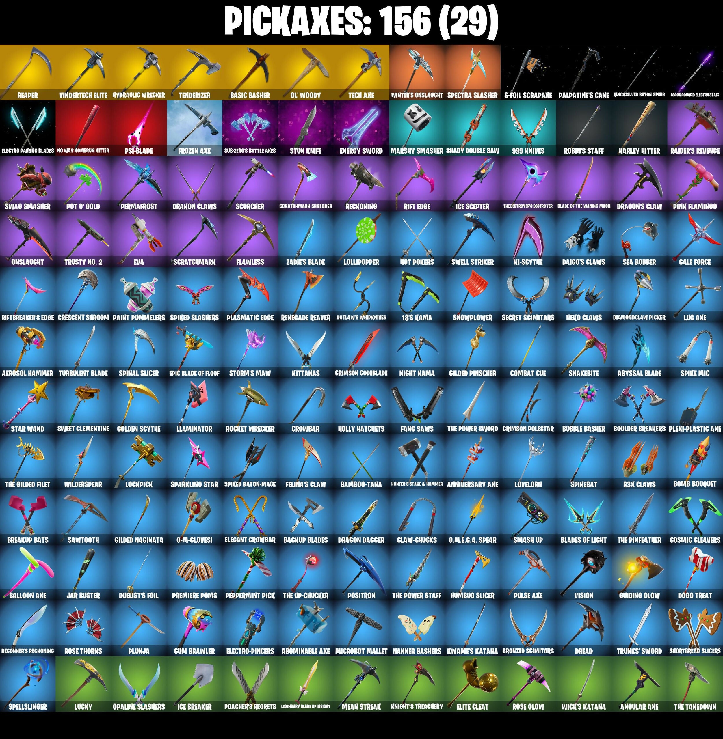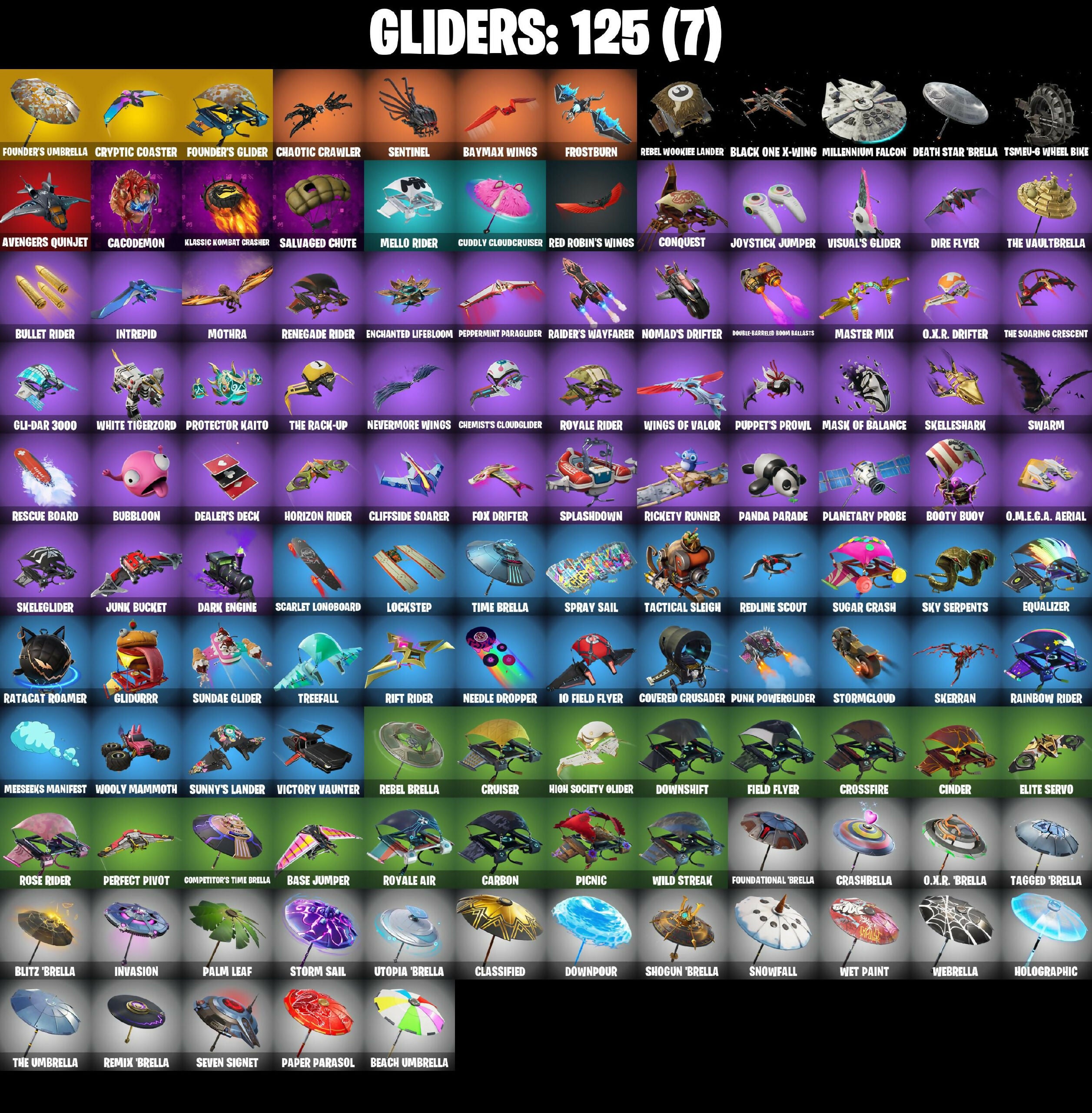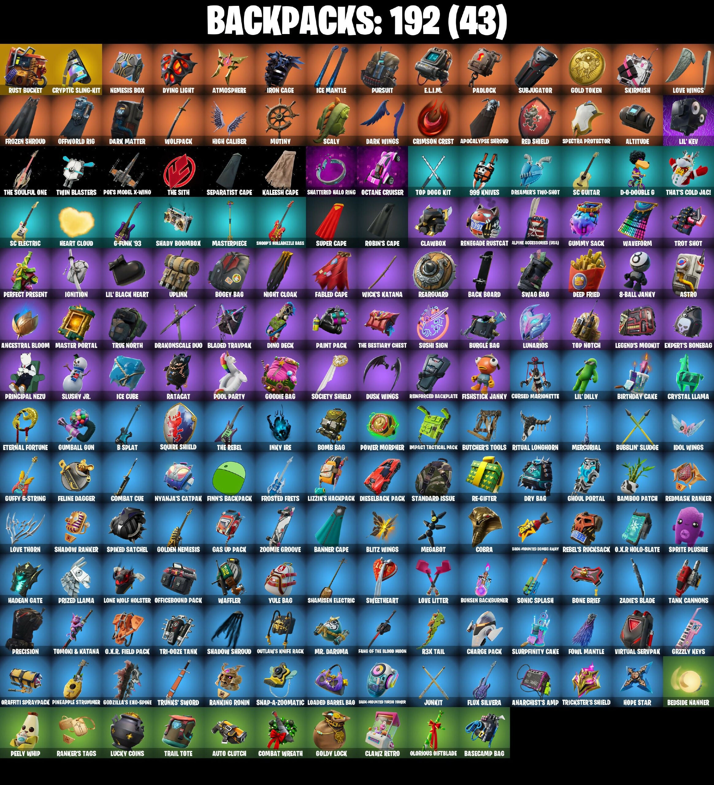 18's Kama, 8-Ball Janky, 999 Knives, A.I.M., Abominable Axe, Absenz, Abyssal Blade, Aerial Assault Bomber, Aerosol Hammer, Agent Patch, Air Horn, All Might, Alpine Accessories (USA), Alpine Ace (USA), Altitude, Anarchist's Amp, Ancestral Bloom, Andy Fangerson, Angular Axe, Anniversary Axe, Apocalypse Shroud, Apprentice Evie, Astro, Atmosphere, Auto Clutch, Avengers Quinjet, Ayla Winn, B Splat, Back Board, Back-Mounted Turbo Tower, Backup Blades, Balloon Axe, Bamboo Patch, Bamboo-Tana, Banner Cape, Baron's Hoard, Base Jumper, Basecamp Bag, Basic Basher, Battle Bus Balloon, Battle Call, Battle Gamer Mae, Battlehawk, Baymax Wings, Be Seeing You, Beach Umbrella, Bear Hug, Bedside Nanner, Beef Boss, Behold!, Best Mates, Bike To Go, Billy Bounce, Birthday Cake, Black One X-Wing, Black Werewolf, Blackheart, Blade Of The Waning Moon, Bladed Trapvax, Blades Of Light, Blitz 'Brella, Blitz Wings, Blizzabelle, Blue Squire, Bogey Bag, Bomb Bag, Bomb Bouquet, Bone Breaker, Bone Brief, Bonsen Backburner, Boogie Down, Booty Buoy, Boulder Breakers, Bow Go, Breakdown, Breakup Bats, Bring It Around, Brite Bomber, Bronzed Scimitars, Bubble Basher, Bubblin' Sludge, Bubbloon, Bullet Rider, Bullseye, Burgle Bag, Butcher's Tools, Cacodemon, Calamity, Calculated, Call Me, Captain Phasma, Carbide, Carbon, Cartwheelin', Cat Flip, Catalyst, Chalked Up 1-Ball, Chaos Director, Chaotic Crawler, Charge Pack, Chemist's Cloudglider, Choice Knit, Cinder, Classified, Claw-Chucks, Clawbox, Clawz Retro, Clean Sweep, Cliffside Soarer, Cobalt, Cobra, Combat Cue, Combat Wreath, Competitor's Time Brella, Conga, Conquest, Cosmic Cleavers, Covered Crusader, Crashbella, Crescent Shroom, Crimson Codeblade, Crimson Crest, Crimson Polestar, Crossfire, Crowbar, Crowning Achievement, Cruiser, Cryptic Coaster, Cryptic Sling-Kit, Crystal Llama, Cuddly Cloudcruiser, Cursed Marionette, D-O-Double G, DJ Yonder, Dab, Dabstand, Daigo, Daigo's Claws, Dark Doggo, Dark Engine, Dark Matter, Dark Voyager, Dark Wings, Dealer's Deck, Death Star 'Brella, Deep Fried, Demon Hunter Hope, Diamondclaw Picker, Die with a Smile Bruno, Diecast, Dieselback Pack, Dino Deck, Dino Megazord, Dire, Dire Flyer, Do The 'Split, Dogg Treat, Double-Barreled Boom Ballists, Downpour, Downshift, Doze Dab, Dragon Dagger, Dragon Daggers' Song, Dragon Stance, Dragon Steel Hybrid, Dragon's Claw, Drakon Claws, Drakonscale Duo, Dread, Dreamer's Two-Shot, Drift, Dry Bag, Duelist's Foil, Dusk, Dusk Wings, Dying Light, Dynamo Tntina, Dynamo Tntton-A, E.L.I.M., Electro Pairing Blades, Electro-Pincers, Elegant Crowbar, Elite Agent, Elite Cleat, Elite Servo, Ember, Enchanted Lifebloom, Energy Sword, Enforcer, Epic Blade Of Floof, Equalizer, Eternal Fortune, Eva, Expert's Bonebag, Fable, Fabled Cape, Face Palm, Fang Of The Blood Moon, Fang Saws, Feel The Force, Felina, Felina's Claw, Feline Dagger, Field Flyer, Fierce, Finn the Human, Finn's Backpack, Fishstick Janky, Fist Bump, Flamenco, Flashback Breakdown, Flawless, Flux Silvera, Foil Flex, For O.X.R.!, Force Lightning, Forget Me Not, Foundational 'Brella, Founder's Glider, Founder's Umbrella, Fowl Mantle, Fox Drifter, Free Flow, Freestylin', Frostburn, Frosted Frets, Frozen Axe, Frozen Shroud, G-Funk '93, Gale Force, Gas Up Pack, General Grievous, General's War Table, Gentleman's Dab, Get Funky, Get Griddy, Get Lucky, Ghoul Portal, Giddy-Up, Gilded Naginata, Gilded Pinscher, Gli-Dar 3000, Glidurrr, Glorious Giftblade, Godzilla Evolved, Godzilla's Exo-Spine, Gold, Gold Token, Golden Nemesis, Golden Scythe, Goldy Lock, Golf Clap, Good Sportsmanship, Goodie Bag, Graffiti Spraypack, Green Ranger, Grizzly Keys, Groove Jam, Guffy 6-String, Guiding Glow, Gum Brawler, Gumball Gun, Gummy Sack, Hadean Gate, Hand Signals, Hardwired Armor Armadillo, Harley Hitter, Haven, Heart Cloud, Heart Sign, Heartbreaker, Heartseeker Aphrodite, Helichopper, Hello Friend, Helmet On, Hero Baymax, High Caliber, High Society Glider, Holiday Boxy, Holly Hatchets, Holographic, Hoodie, Hoop Master, Hope, Hope Star, Horizon Rider, Hot Marat, Hot Pokers, Humbug Slicer, Hunter's Stake & Hammer, Huntress, Hybrid, Hydraulic Wrecker, Hype, I'm A Mystery, IO Field Flyer, Ice Breaker, Ice Cube, Ice Mantle, Ice Scepter, Idol Wings, Ignition, Impact Tactical Pack, Imperial Stormtrooper, Inky Ire, Intrepid, Invasion, Invisible Cut, Iron Cage, It's Go Time!, J-Ball, Jade, Jar Buster, Jaywalking, Jet Signals, Jolly Jammer, Joystick Jumper, Jubilation, Juliet, Junk Bucket, Junkit, Kallesh Cape, Keep It Mello, Kendo, Ki-Scythe, Kintsugi Daigo, Kittanas, Klassic Kombat Crasher, Knight's Helm, Knight's Treachery, Krisabelle, Kwame, Kwame's Katana, Kyran Aryk, LBC 93 Dogg, Lady of Cranes, Laguna, Legend's Modkit, Legendary Blade Of Insight, Lil Split, Lil' Black Heart, Lil' Dilly, Lil' Ghost, Lil' Godzilla Attack, Lil' Kev, Lil' Longboat, Lil' Monster, Lil' Resistance Bomber, Lil' Speeder Bike, Lil' Tank, Lil' Treadspeeder, Lil' Zord Battle Mode, Limber Up, Lina Scorch, Lizzik, Lizzik's Hackpack, Llaminator, Loaded Barrel Bag, Lockpick, Lockstep, Lollipopper, Lone Wolf Holster, Love It!, Love Litter, Love Ranger, Love Thorn, Love Wings, Lovelorn, Lt. Evergreen, Lt. Ripp Slade, Lucky, Lucky Coins, Lucky Nyanja, Lug Axe, Lunar Charge, Lunarios, Luxe, Lynx, Magma-Mond Electrostaff, Major Mancake, Marika, Marsh Walk, Marshy Smasher, Mask, Mask of Balance, Master Key, Master Mix, Master Portal, Masterpiece, Mean Streak, Meat Grinder, Mecha R3X, Meeseeks' Manifest, Megabot, Mello Rider, Meowdas, Mercurial, Mic Drop, Microbot Mallet, Microflip, Midnight Skye, Millennium Falcon, Mini DooFight, Mission Specialist, Moonwalker, Mothra, Mr. Daruma, Mutiny, My Idol!, My World, Nana Nana, Nanner Bashers, Needle Dropper, Neko Claws, Nemesis Box, Nevermore Wings, Night Cloak, Night Kama, Nightshade, Nisha, No Way Homerun Hitter, Nog Ops, Nomad's Drifter, Nyanja, Nyanja's Catpak, O-M-Gloves!, O.M.E.G.A Diagnostic, O.M.E.G.A. Aerial, O.M.E.G.A. Spear, O.X.R Holo-Slate, O.X.R. 'Brella, O.X.R. Drifte