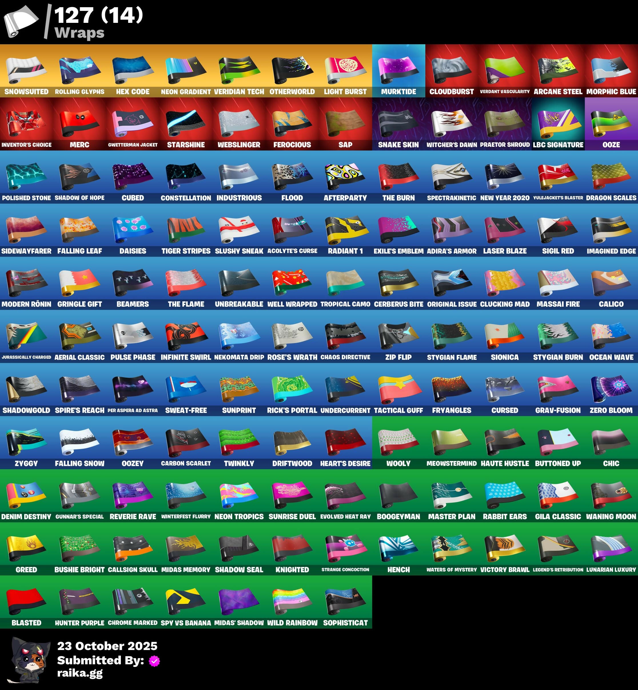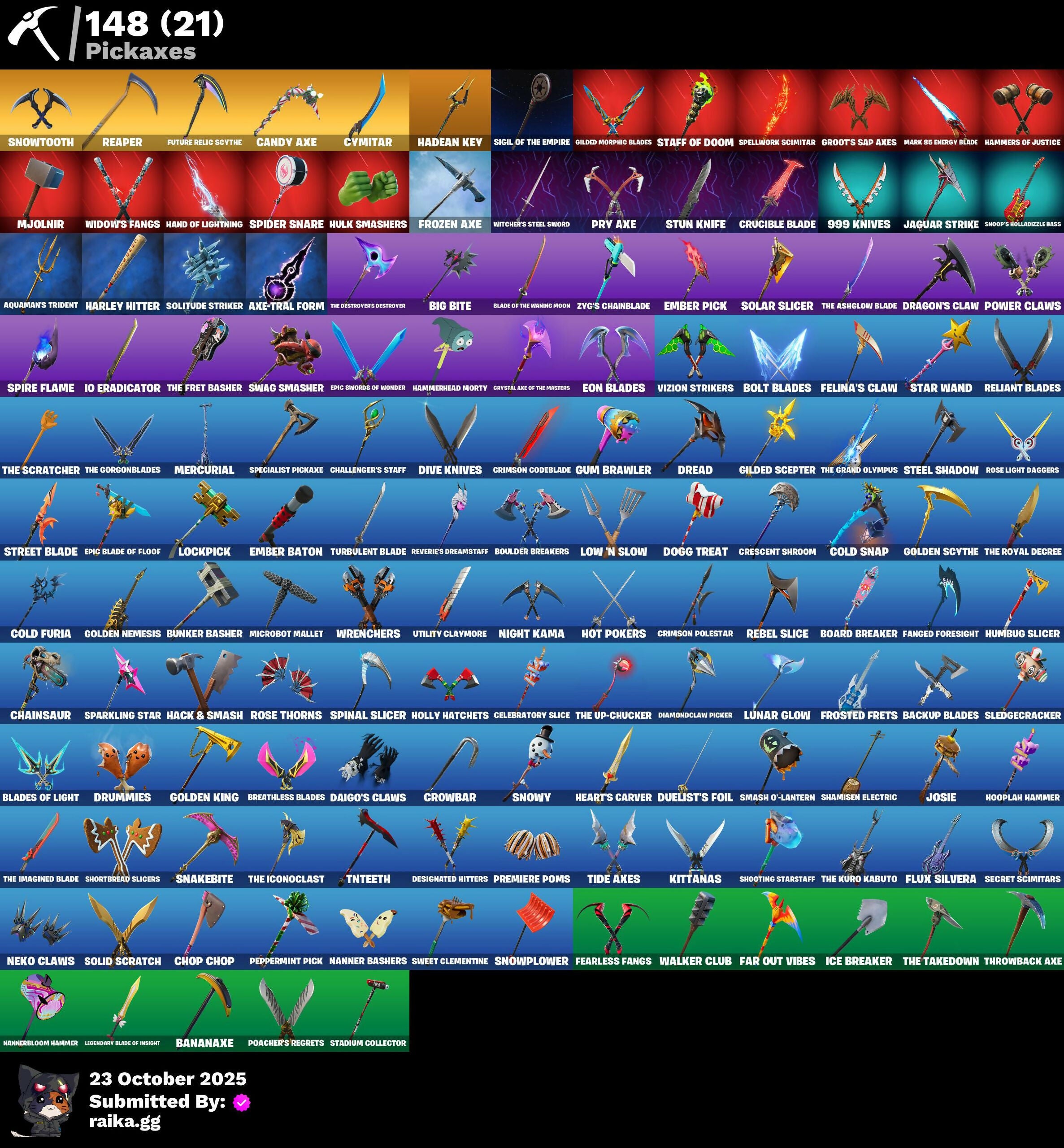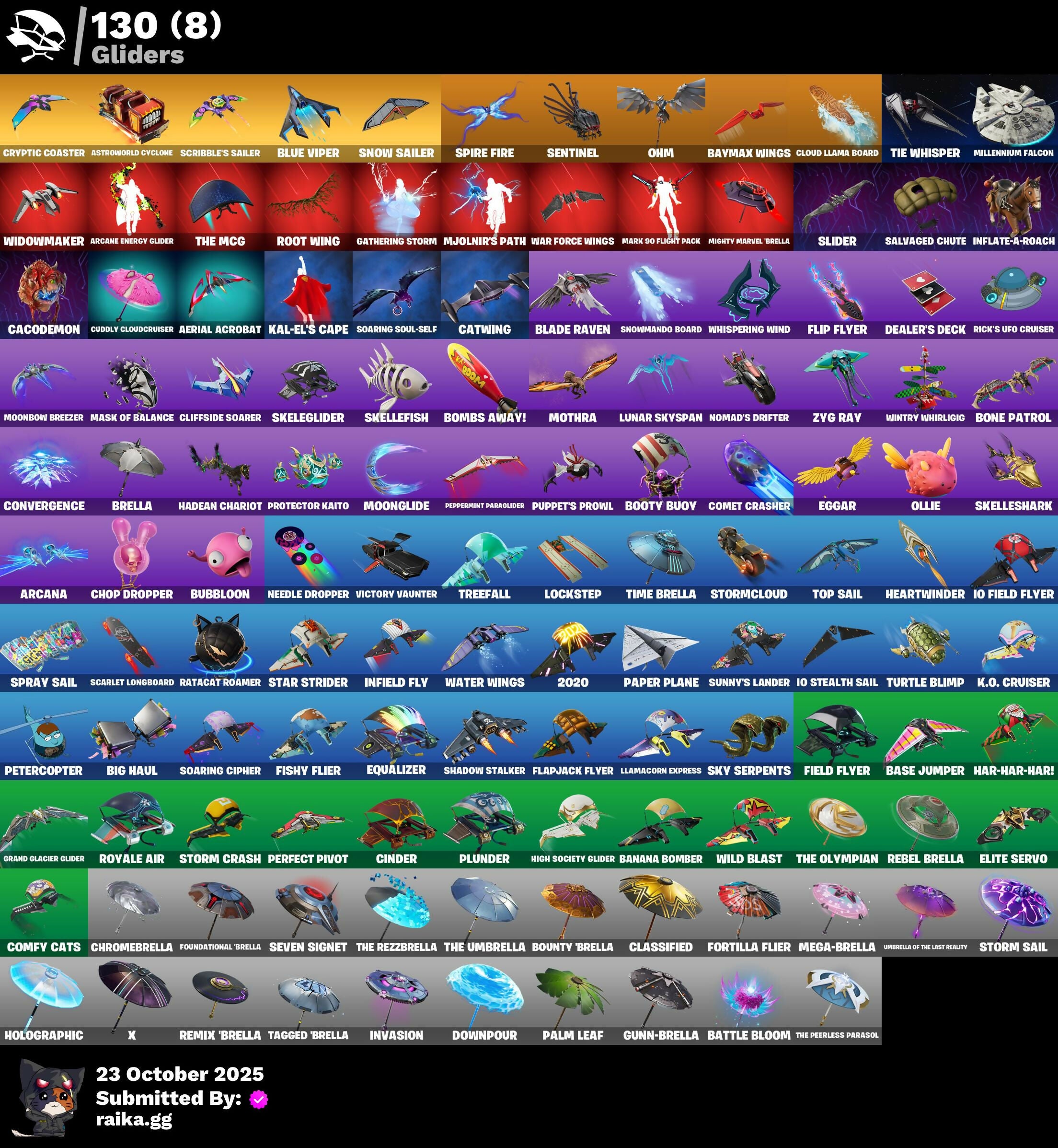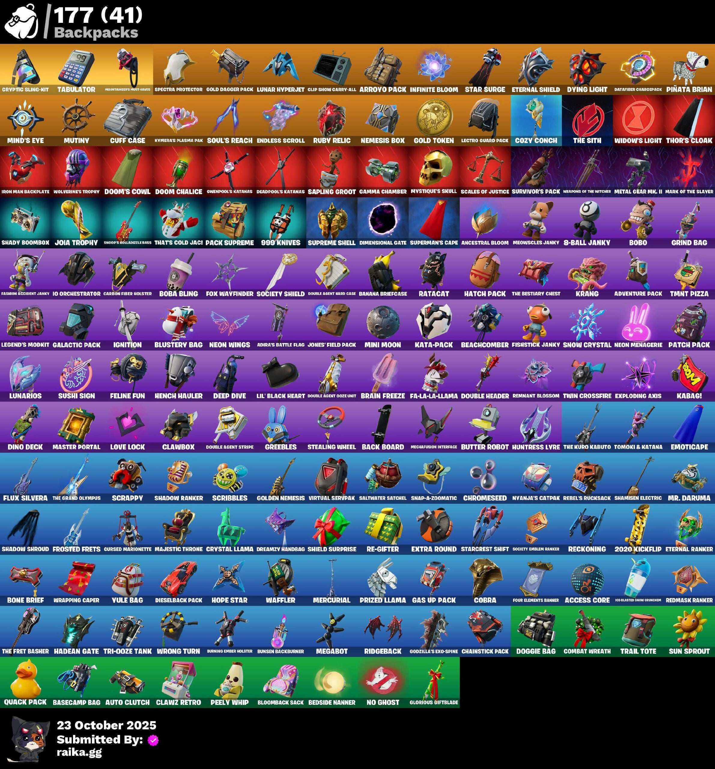 10 Field Flyer, 10 Stealth Sail, 2020, 2020 Kickflip, 2022, 8-Ball, 8-Ball Janky, 999 Knives, A.L.T.E.R., Abduction, Access Core, Acolyte's Curse, Adira's Armor, Adira's Battle Flag, Adventure Pack, Aerial, Aerial Acrobat, Aerial Classic, Aerial Swagger, Afterparty, Agent Jones, Agent Jones (Jump 31), Agent Nana, Agent Peely, Air Horn, Air Shredder, Ancestral Bloom, Aquaman, Aquaman's Trident, Arcana, Arcane Energy Glider, Arcane Steel, Arctic Adeline, Arroyo Pack, Arthur Curry, Astro Antidote, Astro Armor, Astro Jack, Astroworld Cyclone, Auto Clutch, Avengers Logo, Axe-tral Form, Azarath Metrion Zinthos!, B.R.U.T.E. Competitor, Back Board, Backup Blades, Balance Board, Banana Bomber, Banana Briefcase, Bananaxe, Base Jumper, Baseball, Basecamp Bag, Basketball Hoop, Bat, Batarang, Batman, Battle Blessing, Battle Bloom, Battle Call, Battle Mode, Bawk Off, Baymax Wings, Beachcomber, Beamers, Bean Bag, Beat Breaker, Bedside Nanner, Beef Blade, Beep Beep, Berserker Barrage, Big Bite, Big Guns, Big Haul, Bitter Sweets, Black Hole, Black Widow (Snow Suit), Blackheart, Blade Of The Waning Moon, Blade Raven, Blades Of Light, Blasted, Blizzard Bomber, Blocko, Bloomback Sack, Blue Viper, Blustery Bag, Board Breaker, Boba Bling, Bobo, Bolt Blades, Bombastic Winterfest, Bombs Away!, Bone Brief, Bone Patrol, Boogeyman, Boots 'N' Cats, Booty Buoy, Both Eyes Open, Boulder Breakers, Bounty 'Brella, Brain Freeze, Brainiac, Break Point Ultra, Breaking Point, Breathless Blades, Brella, Brite Bomber, Brutus, Bubbloon, Bulletproof, Bunker Basher, Bunsen Backburner, Burning Ambition Valeria, Burning Ember Holster, Bush Peek, Bushie Bright, Butter Robot, Butterfly, Buttoned Up, Bytes' Sigil, C'Mere, CG Snakes, CG Snowman, Cacodemon, Calico, Call Me, Callsign Skull, Candy Axe, Caper, Captain America's Shield, Carbon Fiber Holster, Carbon Scarlet, Card Drop, Cardistry, Cash Grab, Catwing, Celebratory Slice, Cerberus Bite, Cerberus Medallion, Chainsaur, Chainstick Pack, Challenger Cerberus, Challenger's Staff, Chaos Directive, Chaos Double Agent, Charlotte's Logo, Chic, Chillshot, Chimpansi Wants You, Choice Knit, Chomp Cud!!, Choose Naughty, Chop Chop, Chop Dropper, Choppy, Chrome Marked, Chrome Punk, Chromebrella, Chromeseed, Cinder, Clark Kent, Classic Wolverine, Classified, Clawbox, Clawz Retro, Clean Sweep, Cliffsde Soarer, Cloud Llama Board, Cloudburst, Cluck, Cluck (Slurpy), Clucking Mad, Cobra, Coconuts, Coin Flip, Cold Furia, Cold Snap, Color Crush, Combat Giller, Combat Wreath, Comet, Comet Crasher, Comfy Cats, Competitor Medusa, Conga, Constellation, Convergence, Cosmic Sun, Courageous Mikasa, Cowboy Chat, Cozy Conch, Crabby King, Crashed Chiller, Crescent Shroom, Crimson Codeblade, Crimson Polestar, Crowbar, Crowning Achievement, Crucible Blade, Cryptic Coaster, Cryptic Sigil, Cryptic Sling-Kit, Crystal Axe Of The Masters, Crystal Llama, Cube Marking, Cubed, Cuddly Cloudcruiser, Cuff Case, Curling Iron, Cursed, Cursed Marionette, Cyclo Curl, Cyimtar, D.C. 63, Dagger Dance, Daigo, Daigo's Claws, Daisies, Dance Mat, Dark, Dark Doggo, Datafiber Chargepack, Daughter Of Trigon, Dawn Duelist Nisha, Deadpool, Deadpool's Katanas, Dealer's Deck, Deep Dab, Deep Dive, Deep End, Deku, Demon Hunter Hope, Demons Beware, Denim Destiny, Designated Hitters, Determined Kendo, Diamond Throne, Diamondclaw Picker, Dieselback Pack, Dimensional Gate, Dino Deck, Dire Goat, Diva's Grin, Dive Knives, Dizzie, Doctor Doom, Doctor Slone, Dogg Treat, Doggie Bag, Dolphin, Doom Chalice, Doom Slayer, Doom's Cowl, Double Agent Hard Case, Double Agent Hush, Double Agent Ooze Unit, Double Agent Stripe, Double Agent Wildcard, Double Header, Downpour, Dragon Rune Lances, Dragon Scales, Dragon Spirit, Dragon Stance, Dragon's Claw, Dread, Dreamzy Handbag, Drift Face, Driftwood, Droopy, Dropout, Drummies, Duelist's Foil, Dummy, Durrr Face, Dusty, Dying Light, Dynamic Tintina, Dynamite, E.G.O., Easter Egg, Eggar, Electro-Fied!, Elemental Cycle, Elite Servo, Ember, Ember Baton, Ember Pick, Emoticape, Endless Scroll, Eon Blades, Epic Blade Of Floof, Epic Swords Of Wonder, Equalizer, Erisa Alert, Eternal Emblem, Eternal Knight, Eternal Ranker, Eternal Shield, Evasive Maneuvers, Everything's Fine, Evolved Heat Ray, Exile's Emblem, Exploding Axis, Explorer Emilie, Extra Round, Eye Of Agamotto, Fa-La-La-Llama, Face Palm, Fade, Fade Out, Fallen Love Ranger, Falling Leaf, Falling Snow, Fan Attack, Fancy Peter Griffin, Fanged Foresight, Far Out Vibes, Fashion Accident Janky, Fearless Fangs, Felina, Felina's Claw, Feline Fun, Ferocious, Field Flyer, Fish Hook, Fishbone, Fishstick, Fishstick Janky, Fishy Flier, Fist, Fist Bump, Fixer, Fizzix, Flapjack Flyer, Flip Flyer, Flippin' Away, Flood, Flux Silvera, Focused, Foil Flex, Follow The Butterfly, Fortilla Flier, Foundational 'Brella, Four Elements Banner, Fox, Fox Wayfinder, Frosted Frets, Frozen Axe, Fryangles, Full Tilt, Future Goat, Future Relic Scythe, G.O.A.T., GG Ornament, Galactic Pack, Gameface, Gamma Chamber, Gas Up Pack, Gathering Storm, Gear Specialist Maya, Geralt, Geralt of Rivia, Get Griddy, Gila Classic, Gilded Morphic Blades, Gilded Scepter, Glorious Giftblade, Glyph Master, Godzilla Awaits, Godzilla Evolved, Godzilla's Exo-Spine, Gold Brutus, Gold Dagger Pack, Gold Meowscles, Gold Midas, Gold Token, Gold Touch, Golden King, Golden Nemesis, Golden Scythe, Golden Shine, Golf Clap, Good Game, Well Played, Good Guy, Grand Glacier Glider, Grav-Fusion, Greebles, Greed, Grim Grin, Grim King Hades, Grind Bag, Gringle Gift, Groot, Groot Glow, Groots Sap Axes, Groovy!, Ground Pound, Grriz, Guggi Was Here, Guggimon, Gugmon, Gum Brawler, Gumbo, Gunn-Brella, Gunnar's Special, Gwenpool's Katanas, Gwetterman Jacket, Hack & Smash, Hadean Chariot, Hadean Gate, Hadean Kev, Hades Insignia, Hammerhead, Hammerhead Morty, Hammers Of Justice, Hamster Overdrive, Hand Of Lightning, Hang Loose Celebration, Happy Kit, Har-Har-Har!, Hare-Raising, Harley Hitter, Hatch Pack, Haute Hustle, Haven, Haze, Heart Sign, Hea