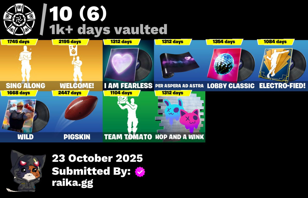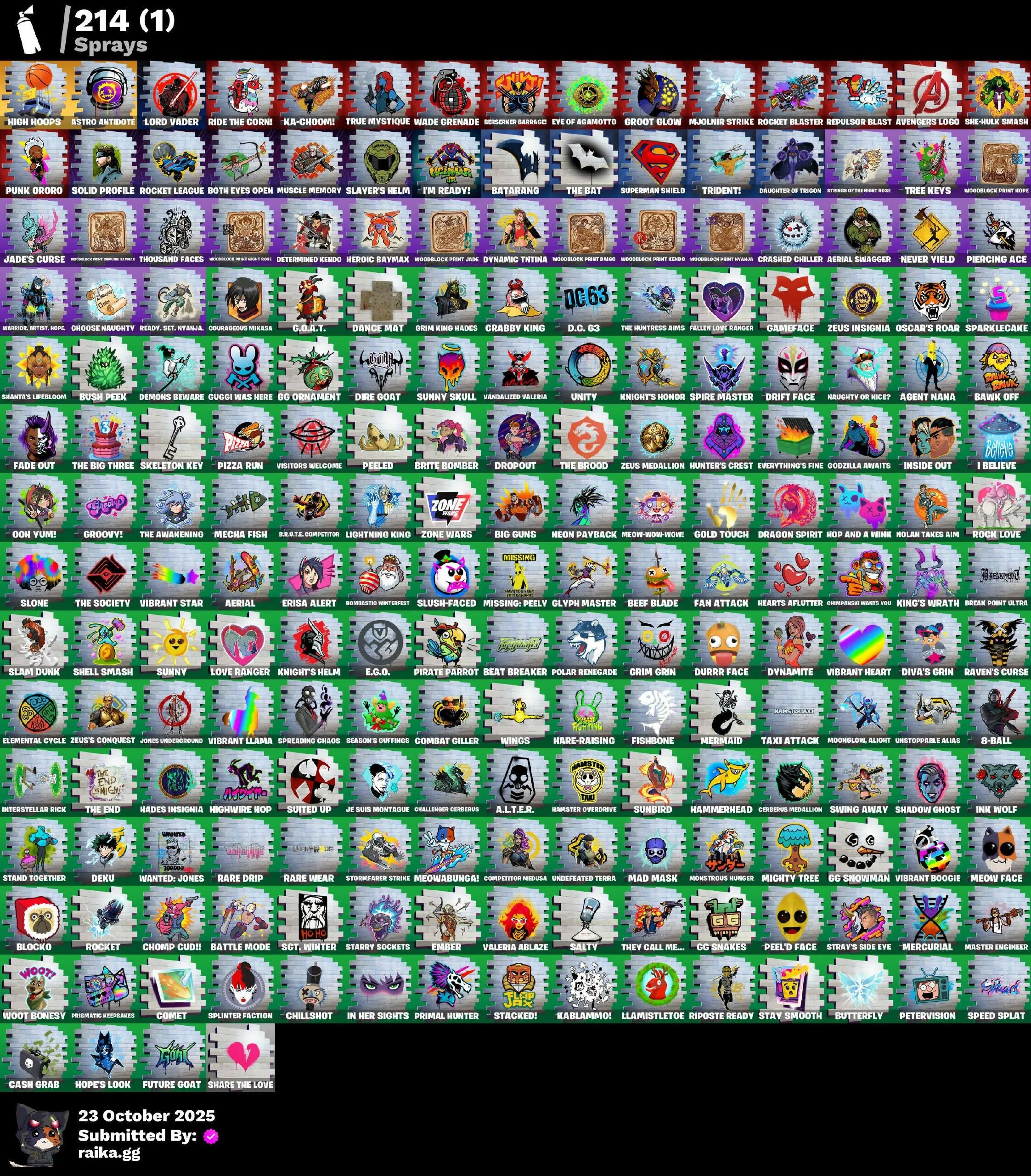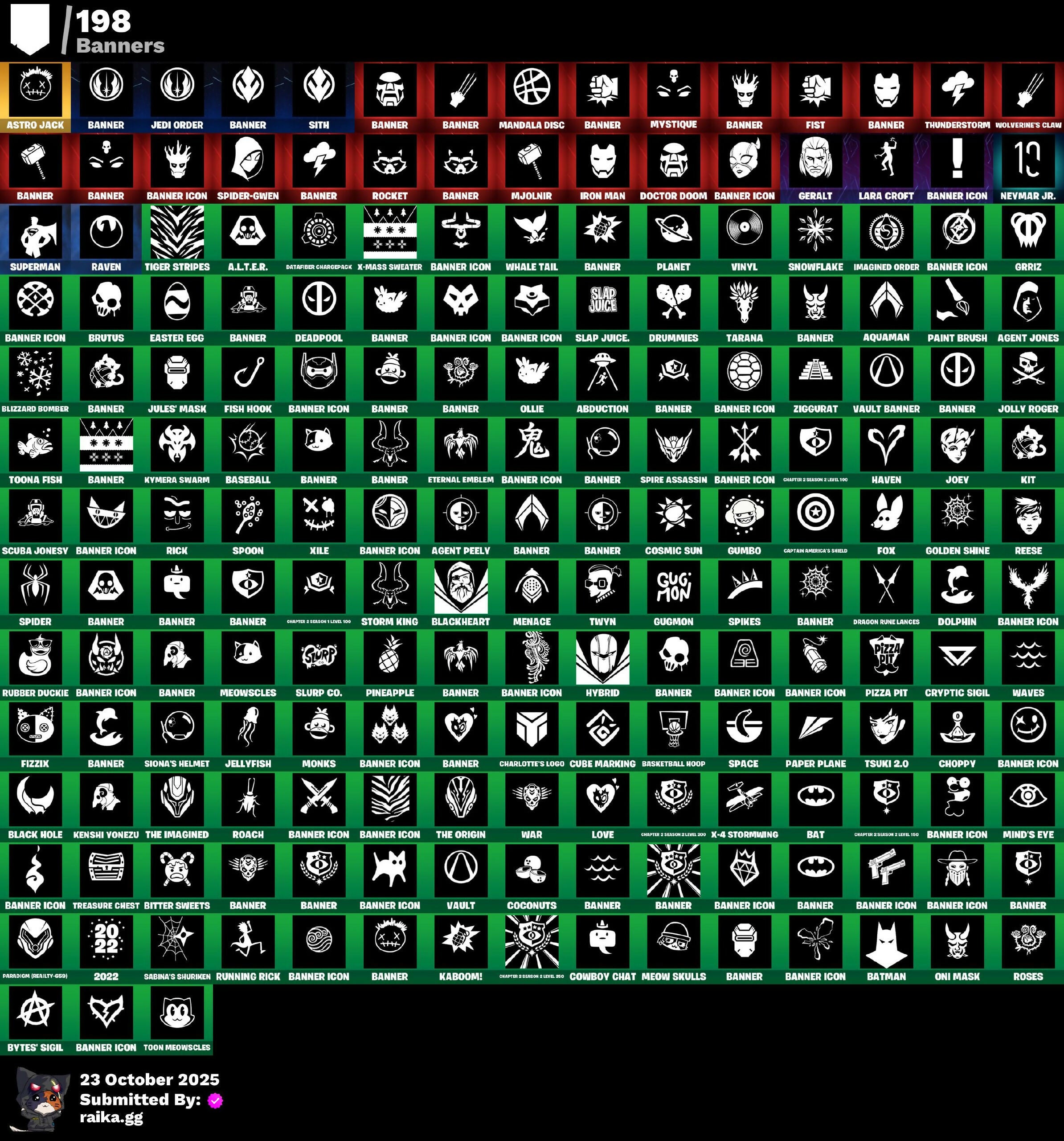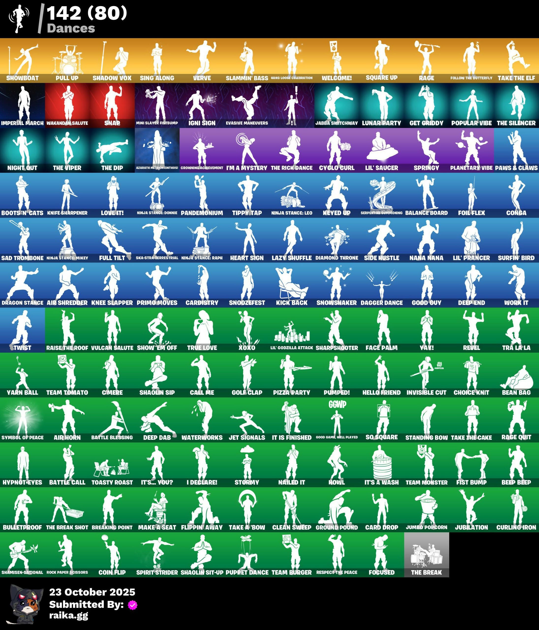 10 Field Flyer, 10 Stealth Sail, 2020, 2020 Kickflip, 2022, 8-Ball, 8-Ball Janky, 999 Knives, A.L.T.E.R., Abduction, Access Core, Acolyte's Curse, Adira's Armor, Adira's Battle Flag, Adventure Pack, Aerial, Aerial Acrobat, Aerial Classic, Aerial Swagger, Afterparty, Agent Jones, Agent Jones (Jump 31), Agent Nana, Agent Peely, Air Horn, Air Shredder, Ancestral Bloom, Aquaman, Aquaman's Trident, Arcana, Arcane Energy Glider, Arcane Steel, Arctic Adeline, Arroyo Pack, Arthur Curry, Astro Antidote, Astro Armor, Astro Jack, Astroworld Cyclone, Auto Clutch, Avengers Logo, Axe-tral Form, Azarath Metrion Zinthos!, B.R.U.T.E. Competitor, Back Board, Backup Blades, Balance Board, Banana Bomber, Banana Briefcase, Bananaxe, Base Jumper, Baseball, Basecamp Bag, Basketball Hoop, Bat, Batarang, Batman, Battle Blessing, Battle Bloom, Battle Call, Battle Mode, Bawk Off, Baymax Wings, Beachcomber, Beamers, Bean Bag, Beat Breaker, Bedside Nanner, Beef Blade, Beep Beep, Berserker Barrage, Big Bite, Big Guns, Big Haul, Bitter Sweets, Black Hole, Black Widow (Snow Suit), Blackheart, Blade Of The Waning Moon, Blade Raven, Blades Of Light, Blasted, Blizzard Bomber, Blocko, Bloomback Sack, Blue Viper, Blustery Bag, Board Breaker, Boba Bling, Bobo, Bolt Blades, Bombastic Winterfest, Bombs Away!, Bone Brief, Bone Patrol, Boogeyman, Boots 'N' Cats, Booty Buoy, Both Eyes Open, Boulder Breakers, Bounty 'Brella, Brain Freeze, Brainiac, Break Point Ultra, Breaking Point, Breathless Blades, Brella, Brite Bomber, Brutus, Bubbloon, Bulletproof, Bunker Basher, Bunsen Backburner, Burning Ambition Valeria, Burning Ember Holster, Bush Peek, Bushie Bright, Butter Robot, Butterfly, Buttoned Up, Bytes' Sigil, C'Mere, CG Snakes, CG Snowman, Cacodemon, Calico, Call Me, Callsign Skull, Candy Axe, Caper, Captain America's Shield, Carbon Fiber Holster, Carbon Scarlet, Card Drop, Cardistry, Cash Grab, Catwing, Celebratory Slice, Cerberus Bite, Cerberus Medallion, Chainsaur, Chainstick Pack, Challenger Cerberus, Challenger's Staff, Chaos Directive, Chaos Double Agent, Charlotte's Logo, Chic, Chillshot, Chimpansi Wants You, Choice Knit, Chomp Cud!!, Choose Naughty, Chop Chop, Chop Dropper, Choppy, Chrome Marked, Chrome Punk, Chromebrella, Chromeseed, Cinder, Clark Kent, Classic Wolverine, Classified, Clawbox, Clawz Retro, Clean Sweep, Cliffsde Soarer, Cloud Llama Board, Cloudburst, Cluck, Cluck (Slurpy), Clucking Mad, Cobra, Coconuts, Coin Flip, Cold Furia, Cold Snap, Color Crush, Combat Giller, Combat Wreath, Comet, Comet Crasher, Comfy Cats, Competitor Medusa, Conga, Constellation, Convergence, Cosmic Sun, Courageous Mikasa, Cowboy Chat, Cozy Conch, Crabby King, Crashed Chiller, Crescent Shroom, Crimson Codeblade, Crimson Polestar, Crowbar, Crowning Achievement, Crucible Blade, Cryptic Coaster, Cryptic Sigil, Cryptic Sling-Kit, Crystal Axe Of The Masters, Crystal Llama, Cube Marking, Cubed, Cuddly Cloudcruiser, Cuff Case, Curling Iron, Cursed, Cursed Marionette, Cyclo Curl, Cyimtar, D.C. 63, Dagger Dance, Daigo, Daigo's Claws, Daisies, Dance Mat, Dark, Dark Doggo, Datafiber Chargepack, Daughter Of Trigon, Dawn Duelist Nisha, Deadpool, Deadpool's Katanas, Dealer's Deck, Deep Dab, Deep Dive, Deep End, Deku, Demon Hunter Hope, Demons Beware, Denim Destiny, Designated Hitters, Determined Kendo, Diamond Throne, Diamondclaw Picker, Dieselback Pack, Dimensional Gate, Dino Deck, Dire Goat, Diva's Grin, Dive Knives, Dizzie, Doctor Doom, Doctor Slone, Dogg Treat, Doggie Bag, Dolphin, Doom Chalice, Doom Slayer, Doom's Cowl, Double Agent Hard Case, Double Agent Hush, Double Agent Ooze Unit, Double Agent Stripe, Double Agent Wildcard, Double Header, Downpour, Dragon Rune Lances, Dragon Scales, Dragon Spirit, Dragon Stance, Dragon's Claw, Dread, Dreamzy Handbag, Drift Face, Driftwood, Droopy, Dropout, Drummies, Duelist's Foil, Dummy, Durrr Face, Dusty, Dying Light, Dynamic Tintina, Dynamite, E.G.O., Easter Egg, Eggar, Electro-Fied!, Elemental Cycle, Elite Servo, Ember, Ember Baton, Ember Pick, Emoticape, Endless Scroll, Eon Blades, Epic Blade Of Floof, Epic Swords Of Wonder, Equalizer, Erisa Alert, Eternal Emblem, Eternal Knight, Eternal Ranker, Eternal Shield, Evasive Maneuvers, Everything's Fine, Evolved Heat Ray, Exile's Emblem, Exploding Axis, Explorer Emilie, Extra Round, Eye Of Agamotto, Fa-La-La-Llama, Face Palm, Fade, Fade Out, Fallen Love Ranger, Falling Leaf, Falling Snow, Fan Attack, Fancy Peter Griffin, Fanged Foresight, Far Out Vibes, Fashion Accident Janky, Fearless Fangs, Felina, Felina's Claw, Feline Fun, Ferocious, Field Flyer, Fish Hook, Fishbone, Fishstick, Fishstick Janky, Fishy Flier, Fist, Fist Bump, Fixer, Fizzix, Flapjack Flyer, Flip Flyer, Flippin' Away, Flood, Flux Silvera, Focused, Foil Flex, Follow The Butterfly, Fortilla Flier, Foundational 'Brella, Four Elements Banner, Fox, Fox Wayfinder, Frosted Frets, Frozen Axe, Fryangles, Full Tilt, Future Goat, Future Relic Scythe, G.O.A.T., GG Ornament, Galactic Pack, Gameface, Gamma Chamber, Gas Up Pack, Gathering Storm, Gear Specialist Maya, Geralt, Geralt of Rivia, Get Griddy, Gila Classic, Gilded Morphic Blades, Gilded Scepter, Glorious Giftblade, Glyph Master, Godzilla Awaits, Godzilla Evolved, Godzilla's Exo-Spine, Gold Brutus, Gold Dagger Pack, Gold Meowscles, Gold Midas, Gold Token, Gold Touch, Golden King, Golden Nemesis, Golden Scythe, Golden Shine, Golf Clap, Good Game, Well Played, Good Guy, Grand Glacier Glider, Grav-Fusion, Greebles, Greed, Grim Grin, Grim King Hades, Grind Bag, Gringle Gift, Groot, Groot Glow, Groots Sap Axes, Groovy!, Ground Pound, Grriz, Guggi Was Here, Guggimon, Gugmon, Gum Brawler, Gumbo, Gunn-Brella, Gunnar's Special, Gwenpool's Katanas, Gwetterman Jacket, Hack & Smash, Hadean Chariot, Hadean Gate, Hadean Kev, Hades Insignia, Hammerhead, Hammerhead Morty, Hammers Of Justice, Hamster Overdrive, Hand Of Lightning, Hang Loose Celebration, Happy Kit, Har-Har-Har!, Hare-Raising, Harley Hitter, Hatch Pack, Haute Hustle, Haven, Haze, Heart Sign, Hea