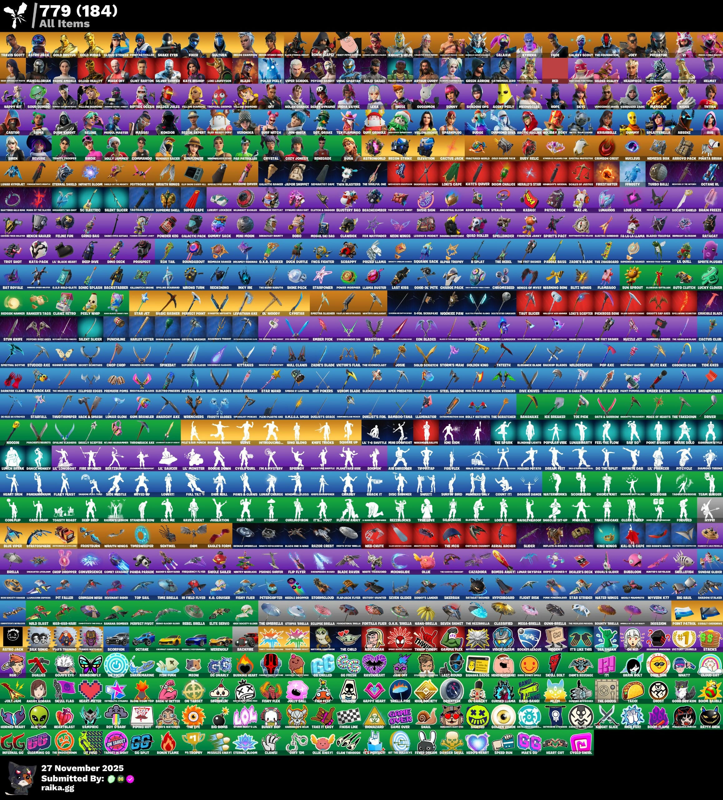 Abbasen Origin, Absenz, Abyssal Blade, Adventure Pack, Aerial Archer, Agent Peely, Air Superhero, Ally Sum, Alpha Trophy, Always Fantabulous, Always Fantasticous, Anarchy Axe, Ancestral Bloom, Angry Kobara, Apex Predator, Apocalypse Savage, Arctic Adeline, Arctic Ronin, Arrow Pack, Arthur Curry, Asgardian, Astro Jack, Astro-Jack, Astroworld, Astroworld Cyclone, Augments Trident, Aura, Auto Clutch, Avira, B Splat, Backfire, Backstabber, Backup Blades, Balancer, Bamboo-Tana, Banan Breeze, Banana Badge, Bananaxe, Bang-Bang!, Basic Basher, Bass Digger & Sound, Bat Royale, Battle Pass Skins, Beachcomber, Beastfang, Bedside Manner, Bhangra Boogie, Bhangra Rogue, Big Haul, Biohazard, Birdie, Birthday Bash, Black Butterfly, Black Eternal Knight, Black One X86, Black Panther Shirt, Black Tetramist Monk, Blade Raven, Blade Shield Plantater, Bladed Thrasher, Blast League, Blaze, Blinding Lights, Blitz Axe, Blitz Bunny, Blood Cat, Blow Your Top Beach Bum, Blue Viper, Blustery Bag, Bombs Away!, Boob, Boogie Down, Boom Bom, Boom Flame, Bounty Skellal, Brain Bolt, Brain Freeze, Breakfast Bunny, Brella, Brella Enjoyt, Brined Scimitars, Bubblom, Bud Bomb, Budda, Budge, Bugbash x Satsuna, Bunny Boy, Burner, Burning Ambition Valeria, Burning Heat, Butter Halo King, Buzz Wings, Cactus Club, Cactus Jack, Call Me, Captain Deadpool Flame, Card Drop, Caster, Castor, Catwoman Zero, Cazadora, Challenger Menace - Flame, Charge Pack, Choke-Knit, Chop Chop, Chop Dropper, Chopped Chopper, Chromeseed, Cintaru Chariot, Civilian, Clam Through, Classified, Claw Hook, Clawz Retro, Clean Sweep, Clint Barton, Cloud Striker, Clover Knight, Clutch & Dagger, Coat Cutter, Cobalt God, Cobalt Overdrive, Cobalt Overrider, Collector Deadpool, Collector Kado Thorne, Comet Crash, Commando, Cone Flap, Convergence, Cosmic Hawk Axe, Count Till, Cozy Jonesy, Crack It, Creepy Cat, Crescent Unicorn, Crimson Crest, Crimson Wish, Crooked Clan, Crucible Blade, Crusher, Crystal, Crystal Smasher, Curling Iron, Cursed Llama, Cycloid Strike, Cyclotron, Cymitar, Dagger Dance, Dance Off, Dandy Monkey, Danger Skull, Dark Bomber, Darkened Drown, Darkwing Claws, Dealer's Deck, Death Star Stella, Deep Dive, Deep Reef, Derby Dynamo, Destroyer's Tho-Scary, Diamond Diva, Diamonds Throne, Ding Knives, Dino Deck, Disc Spinner, Doom Chalice, Doomsday, Dope Roll, Doze Crab, Dream Bot 3000, Dreamzy Reloaded, Driver, Drum Gun, Dualies, Duck Duffle, Duelist's Foil, Duelist's Grace, Dumbbell Driver, Dummy, Dune Rowar Head Shaman, Dupin Knight, Dusk Knight, Dynamo Grab-Girt, Eagle's Form, Eclipse Brella, Eclipsed Edges, Electric Snowbird, Electro-Points, Elegance Blade, Elemental Blossom, Elevation, Elite Servo, Ember Baton, Ember Pick, Enchantee Dollar, Eon Blades, Eternal Shield Infinite Bloom, Explosion, Extermination Saw, FNCS Fighter, Fa-La-La-Llama, Fade, Fancy Pants (C.A.T.), Fancy Peter Griffin, Feel The Flow, Feline Fun, Fever Dream, Fex Ball, Fing Time, Finish Line, Fire Siren, Firestarter, Fish Fest, Fish Funk, Fishstick Jerry, Fishy Flier, Fixer, Flaky Feast, Flambago, Flapjack Flyer, Flight Risk, Flip Flyer, Flippin Away, Focus Red, Fortilla Flier, Foundation's Well, Foundations Matter, Fox Wayfinder, Foxbow Quiver, Foxer, Fractured World, Frequency Flux, Frostburn, Frosty, Frosty Globes, Full Tilt, G.O.R.E. Banker, Galactic Brawler, Galactic Pack, Galaxia, Galaxy Scout, Game Over, Gamma Flux, Garcia HH Rico, Garson from Boat, Gear Specialist Maya, Ghost, Ghostbane Recolorbomb, Ghostblast Pickaxe, Ghoul's Zip Axis, Gilded Reality, Gleaming GG, Glorious Griffalon, God Gnarly, Gojo's Eye, Gold Brutus, Gold Dagger Lucien, Gold Dagger Rick, Gold Midas, Golden King, Golden Vision, Good Ol' Pete, Good-Game, Google Llamanoose, Gorham Style, Grabby, Green Arrow, Grind Bag, Gucci Moon, Guff Gringle, Guggimon, Gum Brawler, Gummy Sack, Gunk-Brella, Hack & Smash, Hanaway's Arsenal, Hand Spring, Happy Heart, Happy Hitman, Happy Kit, Happy Mitt, Har-Har-Hari, Harbinger Armor Omegarok, Hard Gear Mask, Harley Hitter, Have A Seat, Havoc's And Apex Spectacle, He Will Pass, Headpiece, Headslide, Heart Out, Heart Signs, Heart-Meter, Heartblast, Helena Cuccole Mastery, Helmet, Herald's Star, Hero's Heart, Heron Stance Hero, Hidden, High Society, Holiday Doxy, Holiday Foxy, Holly Hatchlets, Holly Jammer, Holly Jammers, Hope, Horadius Obliscan, Horned Heart, Hot Pokers, Hunter's Skywalk, Hyperboard, I'm A Mystery, III Trophy, IQ Field Flyer, Ice Breaker, Icebreaker, Idrisa Vayne, Igni Sign, Infernal GG, Infinite Dab, Init Late S.O.Buck, Inky Irie, Interest Bombazine, Introducing..., Invasion, Irdia Vayne, Iris, Iron Fist, Isolated, It's Like This, It's... You?, Japor Snippet, Jawn Off, Joey, Jolly Ball, Jolt Jam, Josie, Jskublut Maya, Jubilation, Jun-Hwan, Jun-Wu, K.O Cruiser, Kabagi, Kal-El's Cape, Kassai, Kata-PaCK, Kate Bishop, Kate's Quiver, Keyed Up, Killswitch Drone, King Jojo, King Wings, Kite Soocer Rusher, Kittannas, Knife Claws, Knife Tricks, Knight's Helm, Knight's Readery, Kondor, Krisabelle, Kymera, Laminator, Last Kiss, Last Round, Legend's Modkit, Leviathan Axe, Lexa, Life Slipper, Lil Longboat, Lil Monster, Lil Prancer, Lil Pro, Lil Quill, Lil' Black Heart, Lil-T-64 Shuttle, Llama Buster, Llamadrox Cyprian, Loki Laufeyson, Loki's Cape, Loki's Scepter, Look It Up, Love Lock, Lowkey, Lucky Clover, Lunar Charge, Lunar Glow, Lunar Hyperjet, Lunar Skysparn, Lunarios, Lunarrarity, Lunch Eater, Luxury Lockbox, Mae Jr., Mage of Hearts, Mandalorian, Mangake, Mask, Mask Off, Masked Scuba Jonesy, Masked Scuba Monkey, Massai, Massimo Potato, Matrella Blades, Meadow, Mega-Brella, Members Only, Meowscles, Mephi, Merkar's Setup, Metal Team Leader, Midnight Brawler, Mighty Reaper's Boba, Mind Dogfight, Mindwalker Echo, Mini Moon, Missiles Amani Eternal, Modul Master, Mogul Master, Mogul Ski Bag, Molten Hawk Axe, Moonglide, Nana-Brella, Nanner Bashers, Nash Rev, Needle Dropper, Nemesis Box, Neo Stance Monk, Neon Wings, Ningia, Nisha, Noggin, Nolan Chance, Not Society Queen, 