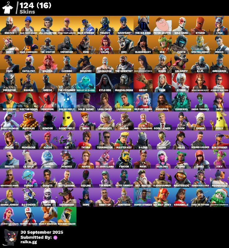 [PC/PSN/XBOX] 124 skins | OG STW | Kratos | Blue Team Leader | Jill Valentine | Blue Striker | Trilogy | The Ice King | Peter Griffin | Wild Card | Hybrid | 2270 VB