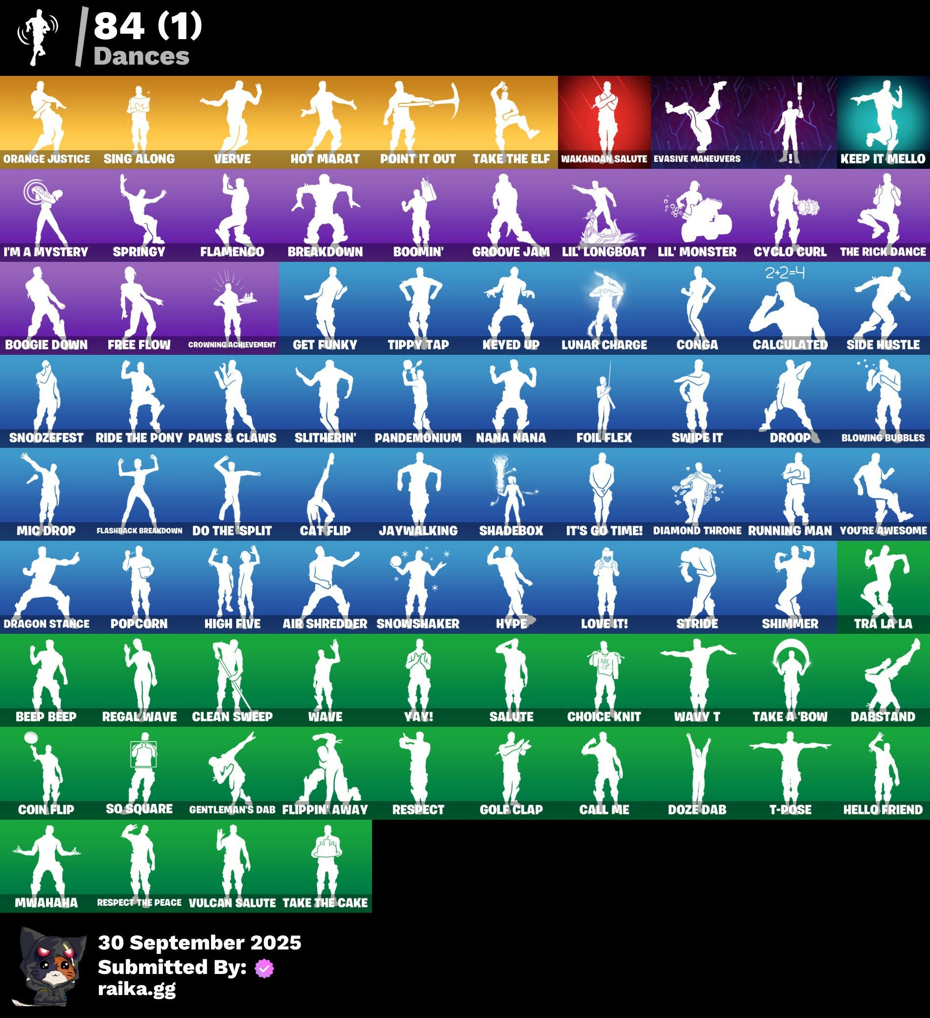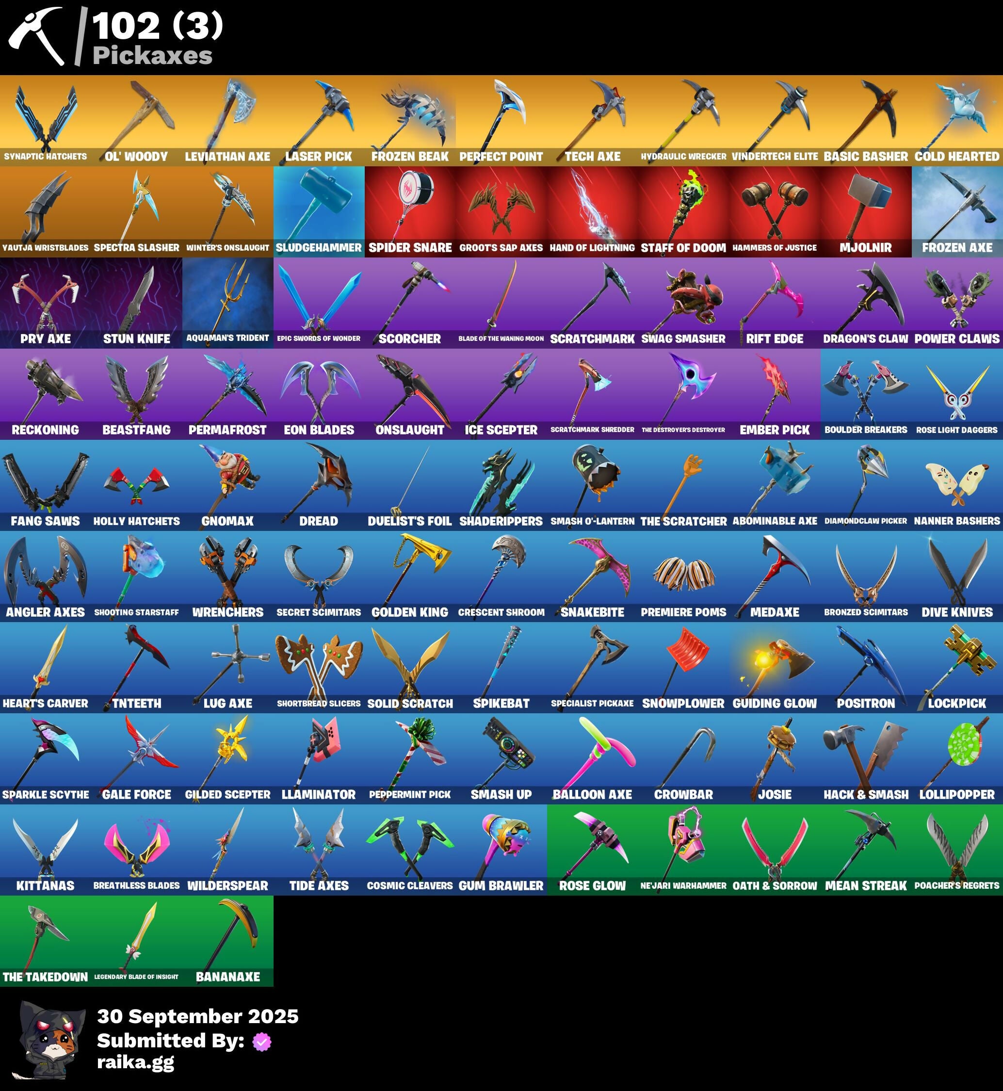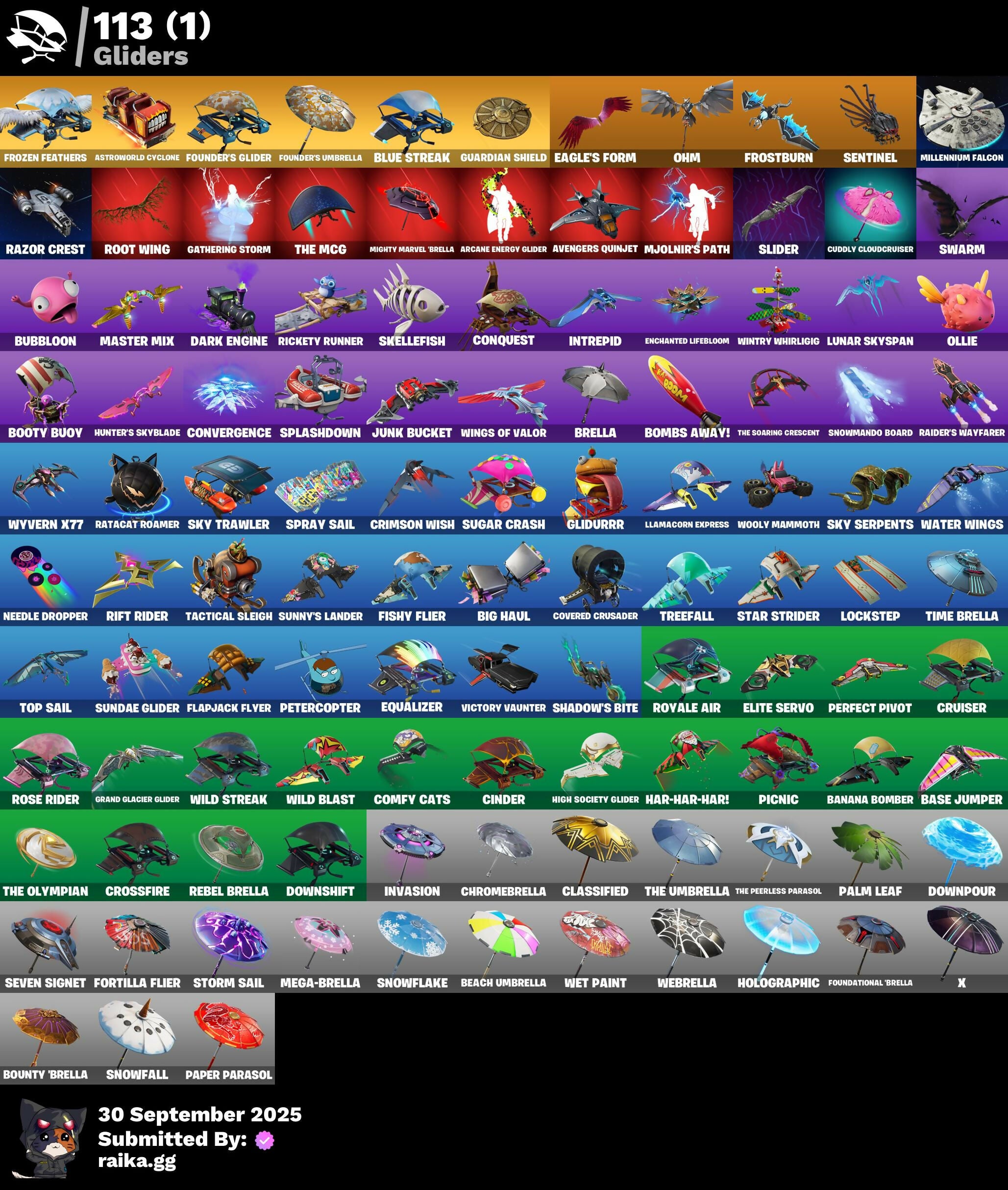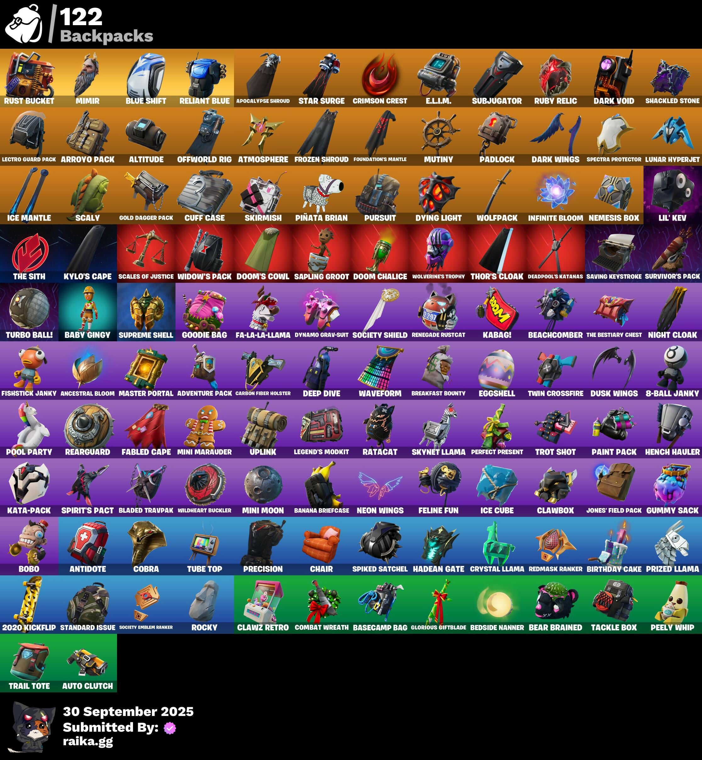 2020 Kickflip, 8-Ball Janky, A.I.M., Abominable Axe, Adventure Pack, Agent Jones, Agent Peely, Air Shredder, Altitude, Ancestral Bloom, Angler Axes, Antidote, Aphrodite, Apocalypse Shroud, Aquaman, Aquaman's Trident, Arcane Energy Glider, Arroyo Pack, Astroworld Cyclone, Atmosphere, Auto Clutch, Avengers Quinjet, Baby Gingy, Balloon Axe, Banana Bomber, Banana Briefcase, Bananaxe, Base Jumper, Basecamp Bag, Basic Basher, Battlehawk, Beach Umbrella, Beachcomber, Bear Brained, Beastfang, Bedside Nanner, Beep Beep, Big Haul, Birthday Cake, Black Widow Outfit, Blackheart, Blade of the Waning Moon, Bladed Travpak, Blowing Bubbles, Blue Shift, Blue Streak, Blue Striker, Blue Team Leader, Bobo, Bombs Away!, Boogie Down, Boomin', Booty Buoy, Boulder Breakers, Bounty 'Brella, Breakdown, Breakfast Bounty, Breathless Blades, Breeze, Brella, Bronzed Scimitars, Brutus, Bubbloon, Bunny Brawler, Calamity, Calculated, Call Me, Carbide, Carbon Fiber Holster, Cat Flip, Catalyst, Cerberus, Chair, Choice Knit, Chromebrella, Cinder, Classified, Clawbox, Clawz Retro, Clean Sweep, Cobra, Coin Flip, Cold Hearted, Combat Wreath, Comfy Cats, Conga, Conquest, Convergence, Cosmic Cleavers, Covered Crusader, Crescent Shroom, Crimson Crest, Crimson Wish, Crossfire, Crowbar, Cruiser, Crystal Llama, Cuddly Cloudcruiser, Cuff Case, Cyclo Curl, DJ Yonder, Dabstand, Dark Engine, Dark Vanguard, Dark Void, Dark Wings, Deadfire, Deadpool, Deadpool's Katanas, Deep Dive, Diamond Throne, Diamondclaw Picker, Dire, Dive Knives, Do The Split, Doctor Doom, Doom Chalice, Doom's Cowl, Downpour, Downshift, Doze Dab, Dragon Stance, Dragon's Claw, Dread, Drift, Droop, Duelist's Foil, Dusk, Dusk Wings, Dying Light, Dynamo Grav-Suit, E.L.I.M., Eagle's Form, Eggshell, Elite Servo, Ember, Ember Pick, Enchanted Lifebloom, Enforcer, Eon Blades, Epic Swords of Wonder, Equalizer, Evasive Maneuvers, Fa-La-La-Llama, Fable, Fabled Cape, Fade, Fang Saws, Feline Fun, Fishstick Janky, Fishy Flier, Flamenco, Flapjack Flyer, Flashback Breakdown, Flippin' Away, Foil Flex, Fortilla Flier, Foundation's Mantle, Foundational 'Brella, Founder's Glider, Founder's Umbrella, Free Flow, Frostburn, Frozen Axe, Frozen Beak, Frozen Feathers, Frozen Shroud, Gale Force, Gathering Storm, Gentleman's Dab, Get Funky, Ghoul Trooper, Giddy-Up, Gilded Scepter, Glidurrr, Glorious Giftblade, Gnomax, Gold Dagger Pack, Golden King, Golf Clap, Goodie Bag, Grand Glacier Glider, Groot, Groot's Sap Axes, Groove Jam, Guardian Shield, Guiding Glow, Gum Brawler, Gumbo, Gummy Sack, Hack & Smash, Hadean Gate, Hammers of Justice, Hand of Lightning, Har-Har-Har!, Harley Quinn, Harlowe, Haven, Heart's Carver, Hello Friend, Hench Hauler, High Five, High Society Glider, Holiday Boxy, Holly Hatchets, Holographic, Hope, Hot Marat, Hunter's Skyblade, Huntress, Hybrid, Hydraulic Wrecker, Hype, I'm A Mystery, Ice Cube, Ice Mantle, Ice Scepter, Infinite Bloom, Intrepid, Invasion, It's Go Time!, Jaywalking, Jennifer Walters, Jill Valentine, Jones' Field Pack, Josie, Journey vs Hazard, Jules, Junk Bucket, Kabag!, Kata-Pack, Keep It Mello, Keyed Up, Kit, Kittanas, Kondor, Kratos, Krisabelle, Kylo Ren, Kylo's Cape, Lara Croft, Laser Pick, Lectro Guard Pack, Legend's Modkit, Legendary Blade of Insight, Leviathan Axe, Lil Split, Lil' Kev, Lil' Longboat, Lil' Monster, Lizardgolem, Llamacorn Express, Llaminator, Lockpick, Lockstep, Lollipopper, Love It!, Lt. John Llama, Lug Axe, Lunar Charge, Lunar Hyperjet, Lunar Skyspan, Lynx, Mandalorian, Mangake, Master Key, Master Mix, Master Portal, Mave, Mean Streak, Medaxe, Mega-Brella, Meowscles, Merry Marauder, Mic Drop, Midas, Mighty Marvel 'Brella, Millennium Falcon, Mimir, Mini Marauder, Mini Moon, Mjolnir, Mjolnir's Path, Montague, Mutiny, Mwahaha, Nana Nana, Nanner Bashers, Ne'Jari Warhammer, Needle Dropper, Nemesis Box, Neon Wings, Night Cloak, Nightshade, Nisha, Oath & Sorrow, Ocean, Offworld Rig, Ohm, Ol' Woody, Olaf Disgust Maya, Ollie, Omega, Omegaron, Onesie, Onslaught, Orange Justice, Oscar, Padlock, Paint Pack, Palm Leaf, Pandemonium, Paper Parasol, Paws & Claws, Peely, Peely Whip, Peppermint Pick, Perfect Pivot, Perfect Point, Perfect Present, Permafrost, Peter Griffin, Petercopter, Picnic, Pinata Brian, Poacher's Regrets, Point It Out, Polar Peely, Pool Party, Popcorn, Positron, Powder, Power Claws, Precision, Predator, Premiere Poms, Prized Llama, Pry Axe, Pursuit, Ragnarok, Raider's Wayfarer, Ratacat, Ratacat Roamer, Ravage, Razor Crest, Rearguard, Rebel Brella, Reckoning, Redline, Redmask Ranker, Regal Wave, Reliant Blue, Remedy vs Toxin, Renegade Lynx, Renegade Rustcat, Respect, Respect The Peace, Rex, Rickety Runner, Ride The Pony, Rift Edge, Rift Rider, Ripley vs Sludge, Rocky, Ronin, Rook, Root Wing, Rose Glow, Rose Light Daggers, Rose Rider, Rose Team Leader, Royale Air, Ruby Relic, Ruin, Running Man, Runway Racer, Rust Bucket, Salute, Sapling Groot, Saving Keystroke, Scales Of Justice, Scaly, Scorcher, Scratchmark, Scratchmark Shredder, Scuba Jonesy, Secret Scimitars, Sentinel, Seven Signet, Sgt. Winter, Shackled Stone, Shadebox, Shaderippers, Shadow's Bite, Shanta, Shimmer, Shooting Starstaff, Shortbread Slicers, Side Hustle, Sidewinder, Sing Along, Siona, Skellefish, Skirmish, Sky Serpents, Sky Trawler, Skye, Skynet Llama, Sledgehammer, Slider, Slitherin', Sludgehammer, Smash O'-Lantern, Smash Up, Snakebite, Snoozefest, Snowfall, Snowflake, Snowmando Board, Snowplower, Snowshaker, So Square, Society Emblem Ranker, Society Shield, Solid Scratch, Solid Snake, Sparkle Scythe, Specialist Pickaxe, Spectra Knight, Spectra Protector, Spectra Slasher, Spider Snare, Spikebat, Spiked Satchel, Spirit's Pact, Splashdown, Spray Sail, Springy, Squad Leader, Staff of Doom, Standard Issue, Star Strider, Star Surge, Storm, Storm Sail, Stride, Stun Knife, Subjugator, Sugar Crash, Sun Strider, Sundae Glider, Sunny's Lander, Super Striker, Supreme Shell, Survivor's Pack, Swag Smasher, Swarm, Swipe It, Synaptic Hatchets, T-Pose, Tackle Box, Tactical Sleigh,