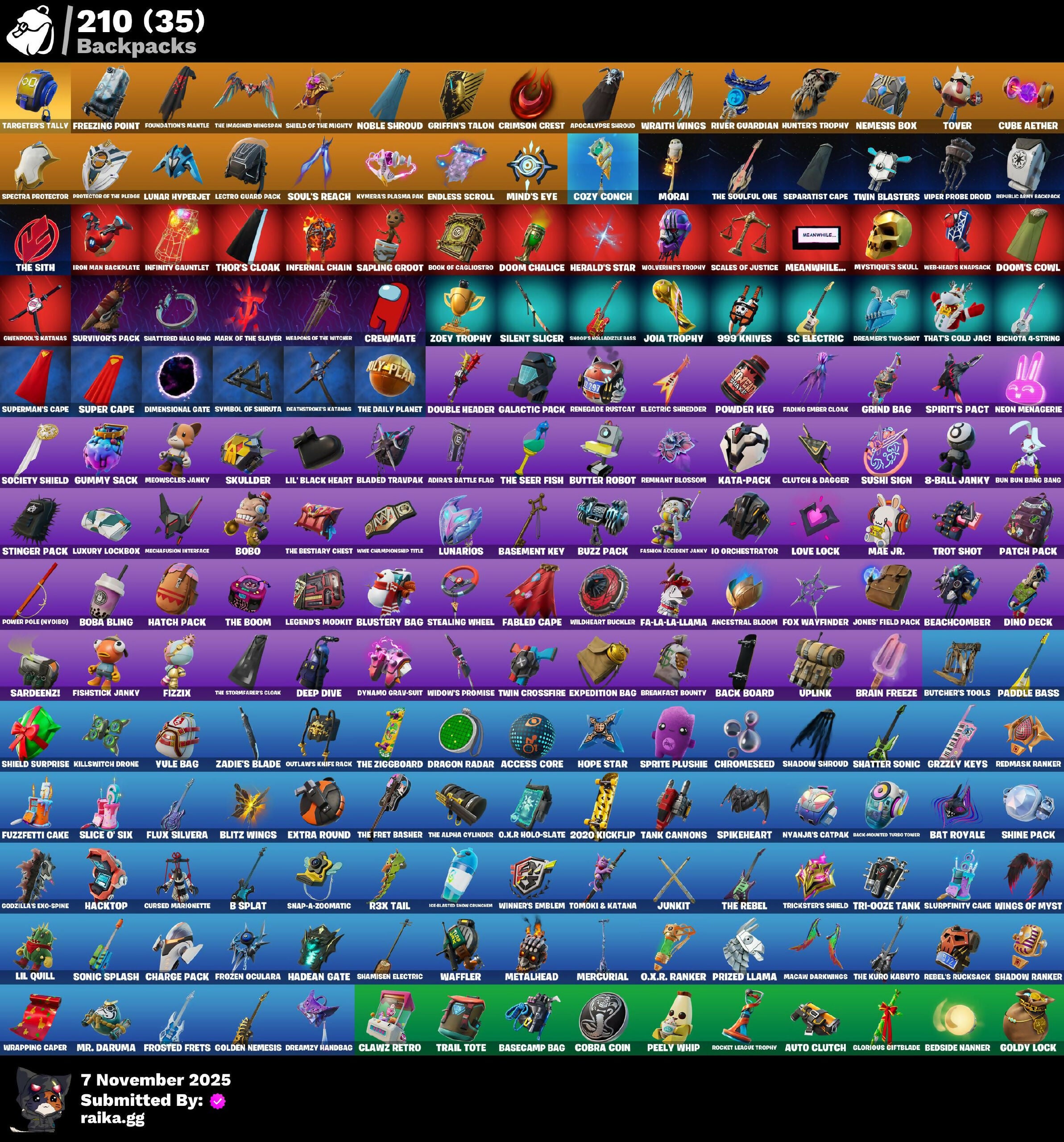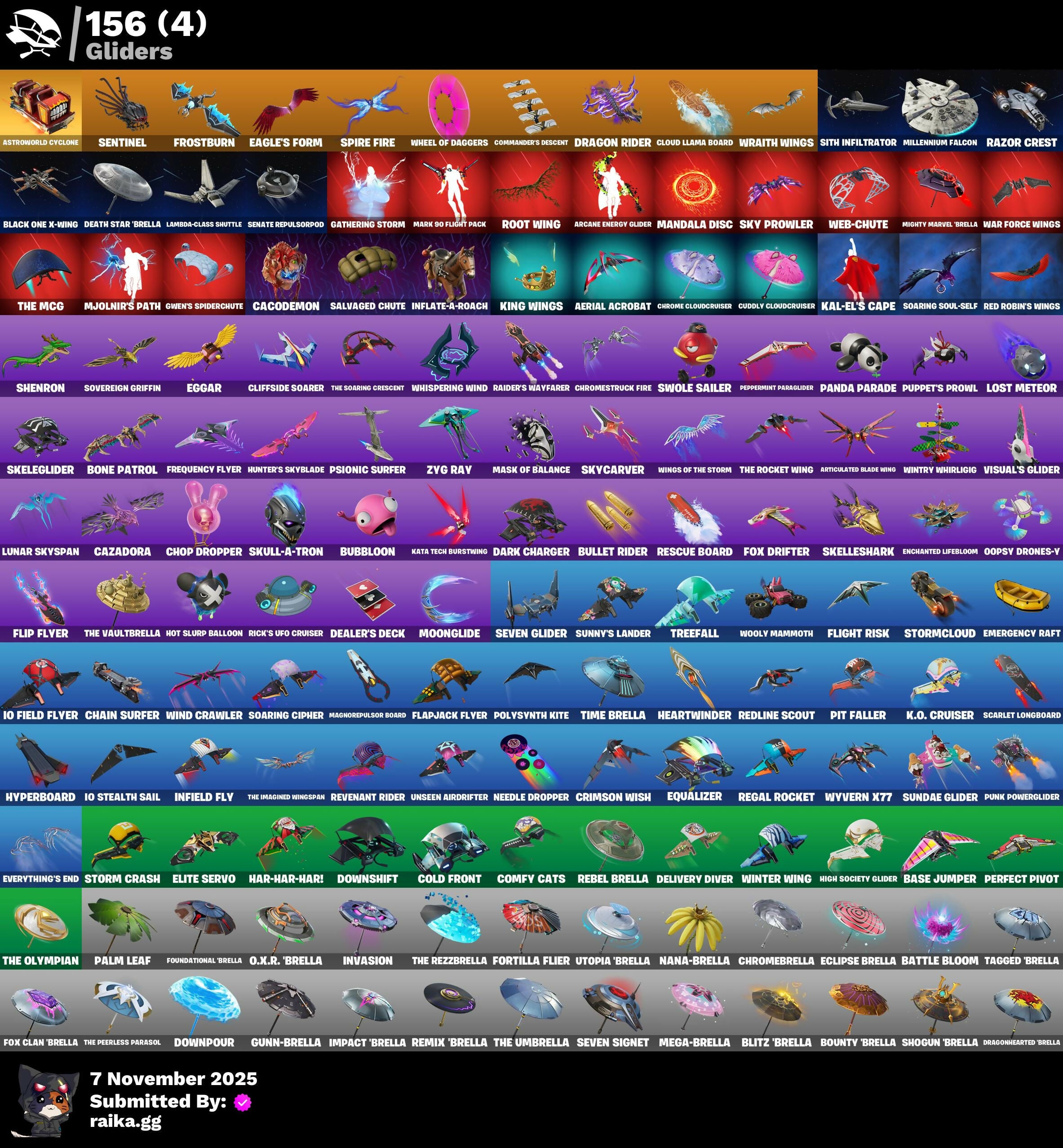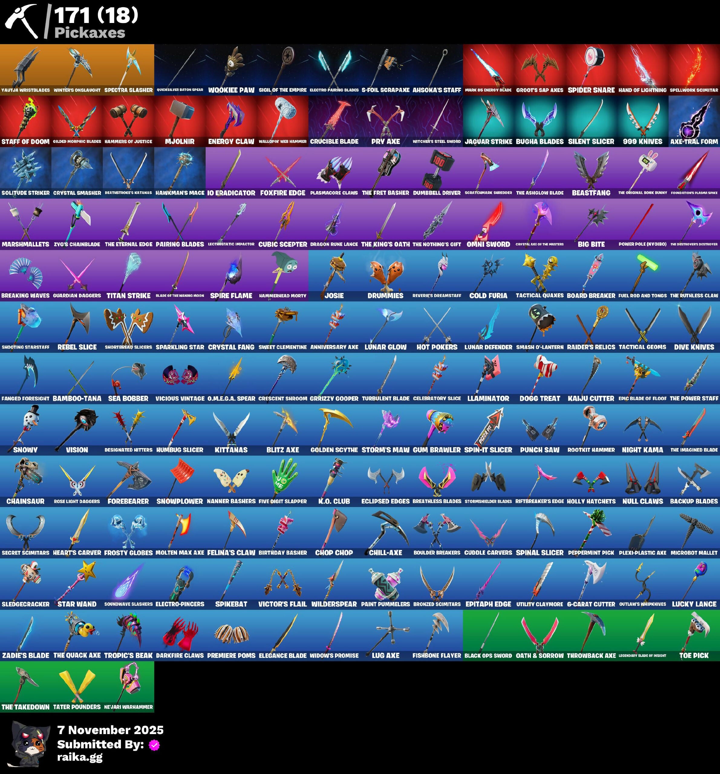 2.0's Revenge, 2020 Kickflip, 6-Carat Cutter, 8-Ball, 8-Ball Janky, 999 Knives, A Warrior Prepares, A.L.T.E.R., Abduction, Access Core, Acolyte's Curse, Adira, Adira's Armor, Adira's Battle Flag, Aerial, Aerial Acrobat, Aerial Classic, Aerial Swagger, Agent Jones, Agent Jones (Jump 31), Ahsoka Tano, Ahsoka's Staff, Air Horn, All-Nighter, Ancestral Bloom, Anniversary Axe, Antonia, Antonia In Action, Apocalypse Shroud, Appeeling Drive, Arachrobatics, Arcade Cat, Arcane Energy Glider, Arcane Steel, Arctic Adeline, Art The Hack, Articulated Blade Wing, Ascension Nezumi, Astro Armor, Astroworld Cyclone, Auntie Dot, Aurelian, Auto Clutch, Avengers Logo, Axe-Tral Form, Azarath Metron Zinthos!, B Splat, Back Board, Back Mounted Turbo Toner, Backup Blades, Balance Board, Bamboo-Tana, Banner, Banner Icon, Base Jumper, Baseball, Basecamp Bag, Basement Key, Basketball Hoop, Bat Royale, Batman, Battle Bloom, Battle Call, Battle Mode, Bawk Off, Beachcomber, Beamers, Bean Bag, Bear Hug, Beast Boy & Raven, Beastfang, Beatz Bunny, Bedside Nanner, Beef Blade, Beerus, Behold!, Belt It!, Berserker Barrage, Beskar, Bichota 4-String, Big Bite, Big Guns, Bike To Go, Birthday Basher, Birthday Dash, Black Adam, Black Hole, Black Leader, Black One X-Wing, Black Ops Sword, Blade of the Waning Moon, Bladed Travpak, Blitz 'Brella, Blitz Axe, Blitz Wings, Blocko, Blowin' Up, Blustery Bag, Board Breaker, Boba Bling, Boba Snack, Bobo, Bombastic Winterfest, Bone Patrol, Boogie Down, Book of Cagliostro, Boomin', Boosting Ki, Boots N' Cats, Both Eyes Open, Boulder Breakers, Bounty 'Brella, Brain Freeze, Breakfast Bounty, Breaking Point, Breaking Waves, Breathless Blades, Bring It Around, Bronzed Scimitars, Bubblegum Highwire, Bubbloon, Buffer Fish, Bugha, Bugha Blades, Bullet Rider, Bun Bun Bang Bang, Bun Bun Blast, Burning Ember, Bushie Bright, Butcher's Tools, Butter Robot, Buttoned Up, Buzz Pack, Bytes, Bytes' Sigil, Cacodemon, Call Me, Called Shot, Cap K.O., Captain America's Shield, Carbon Scarlet, Cardistry, Cash Grab, Cazadora, Celebratory Slice, Cerberus Bite, Chain Surfer, Chainsaur, Challenger Menace - Flame, Chaos Directive, Charge Pack, Charging Up, Charlotte's Logo, Chef's Special, Chibi, Chill-Axe, Chillshot, Choice Knit, Chomp Cud!!, Choose Naughty, Chop Chop, Chop Dropper, Choppy, Chrome Cloudcruiser, Chrome Marked, Chrome Punk, Chromebrella, Chromeseed, Chromestruck Fire, Clark Kent, Classic Wolverine, Clawz Retro, Clean Sweep, Cliffside Soarer, Clone Trooper, Cloud Llama Board, Cloudburst, Cluck, Cluck (Slurpy), Clucking Mad, Clutch & Dagger, Cobra Coin, Cold Front, Cold Furia, Collector Kado Thorne, Combat Elite, Comet, Comfy Cats, Commander's Descent, Confetti, Conjure Weapon, Contour Camo, Coral Crush, Corrosive Stripe, Cosmic Sun, Courageous Mikasa, Cozy Commander, Cozy Conch, Crack It, Crashed Chiller, Crazy Castle, Crescent Shroom, Crewmate, Crimson Crest, Crimson Wish, Crowning Achievement, Crucible Blade, Crystal Axe of the Masters, Crystal Fang, Crystal Smasher, Cube Aether, Cube Marking, Cubic Scepter, Cuddle Carvers, Cuddly Cloudcruiser, Cursed Marionette, Cyberdyne Salute, Cyclo Curl, D.C. 63, Dagger Dance, Daisies, Dance Monkey, Dark Charger, Dark Side Rising, Darkfire Claws, Darth Shader, Darth Vader, Daughter Of Trigon, Dealer's Deck, Death Star 'Brella, Deathstroke Zero, Deathstroke's Katanas, Deep Dab, Deep Dive, Deep Future, Delivery Diver, Demons Beware, Designated Hitters, Destroyer Signature, Determined Renegade, Diamond Diva, Dice Roll, Dimensional Gate, Dino Deck, Dirtbike Challenge, Distraction Dance, Diva's Grin, Dive Knives, Dizzie, Do The Split, Doctor Doom, Doctor Slone, Doctor Slone (Prismatic), Doctor Strange, Dogg Treat, Doom Chalice, Doom Slayer, Doom's Cowl, Double Header, Downpour, Downshift, Doze Dab, Dragon Radar, Dragon Rider, Dragon Rune Lance, Dragon Rune Lances, Dragon Spirit, Dragonhearted 'Brella, Dreamer's Two-Shot, Dreamzy Handbag, Drones-Y View, Droopy, Dropout, Drummies, Dumbbell Driver, Dumbell Driver, Dummy Supreme, Dusk Knight, Dusty, Dynamo Grav-Suit, E.G.O., Eagle's Form, Eclipse Brella, Eclipsed Edges, Eggar, Electric Shredder, Electro Pairing Blades, Electro-Pincers, Electrostatic Impactor, Elegance Blade, Elite Servo, Emergency Raft, Enchanted Lifebloom, Endless Scroll, Energy Claw, Ensnared, Epic Blade of Floof, Epitaph Edge, Equalizer, Eren Jaeger, Eren's Faceoff, Erisa, Erisa Alert, Erisa's Crest, Evasive Maneuvers, Everything's End, Evie, Exile's Emblem, Expedition Bag, Expressionism, Extra Round, Eye Of Agamotto, Fa-La-La-Llama, Fabled Cape, Fading Ember Cloak, Fan Attack, Fanged Foresight, Fashion Accident Janky, Felina, Felina's Claw, Ferocious, Final Eclipse, Final Harbinger, Fish Hook, Fish Thicc, Fishbone Flayer, Fishstick Janky, Fist, Fist Bump, Five Digit Slapper, Fizzix, Flaky Feast, Flapjack Flyer, Flashback Breakdown, Flex On 'Em, Flight Risk, Flip Flyer, Flippin' Away, Floating Island, Flood, Flux Silvera, Foil Flex, Forebearer, Fort Knighted, Fortilla Flier, Foundation's Mantle, Foundation's Plasma Spike, Foundational, Foundational 'Brella, Fox Clan 'Brella, Fox Drifter, Fox Wayfinder, Foxfire Edge, Freezing Point, Frequency Flyer, Frost Squad, Frostbite, Frostburn, Frosted Frets, Frosty Globes, Frozen Oculora, Frozen Over, Fryangles, Fuel Rod and Tongs, Fully Charged Drift, Fusion!, Fuzzfetti Cake, G.O.A.T., GG Ornament, GG Snakes, GG Snowman, Galactic Pack, Galactic Roundel, Gathering Storm, Geared Up, Gentleman's Dab, Geralt, Geralt Of Rivia, Get Loose, Ghost Rider, Gila Classic, Gilded Morphic Blades, Gilded Reality, Glorious Giftblade, Glyph Master, Go For The Goal, God Emperor Doom, Godzilla's Exo-Spine, Goku's Kanji, Golden Goal, Golden Nemesis, Golden Raz, Golden Scythe, Golden Spire Assassin, Goldy Lock, Golf Clap, Good Game, Well Played, Good Guy, Good Sportsmanship, Grav-Fusion, Griffin's Talon, Grind Bag, Gringle Gift, Grizzly Gooper, Grizzzy Gunz, Groot, Groot Glow, Groot's Sap Axes, Groovy!, Ground Pound, Grriz, Grzzly K