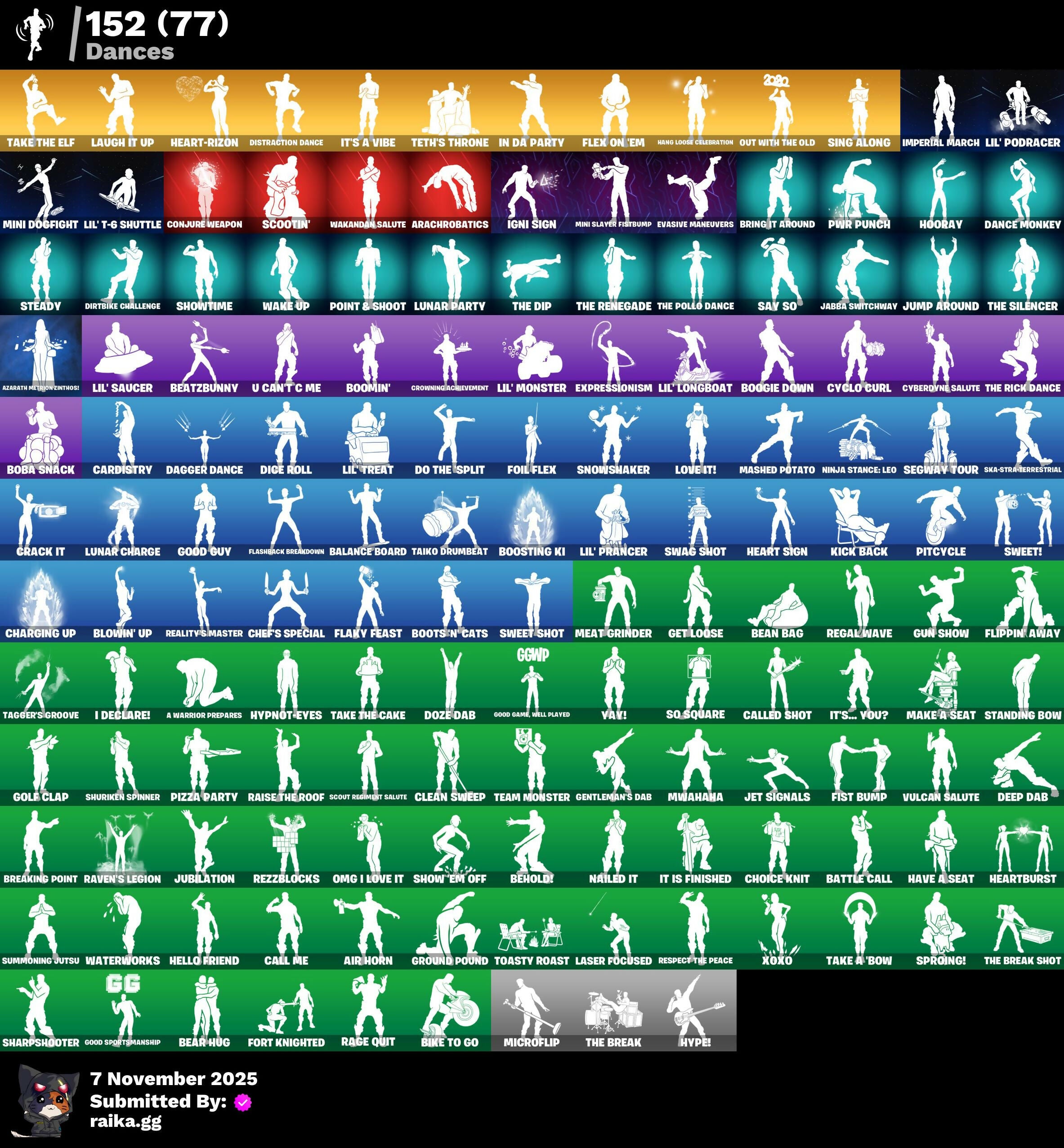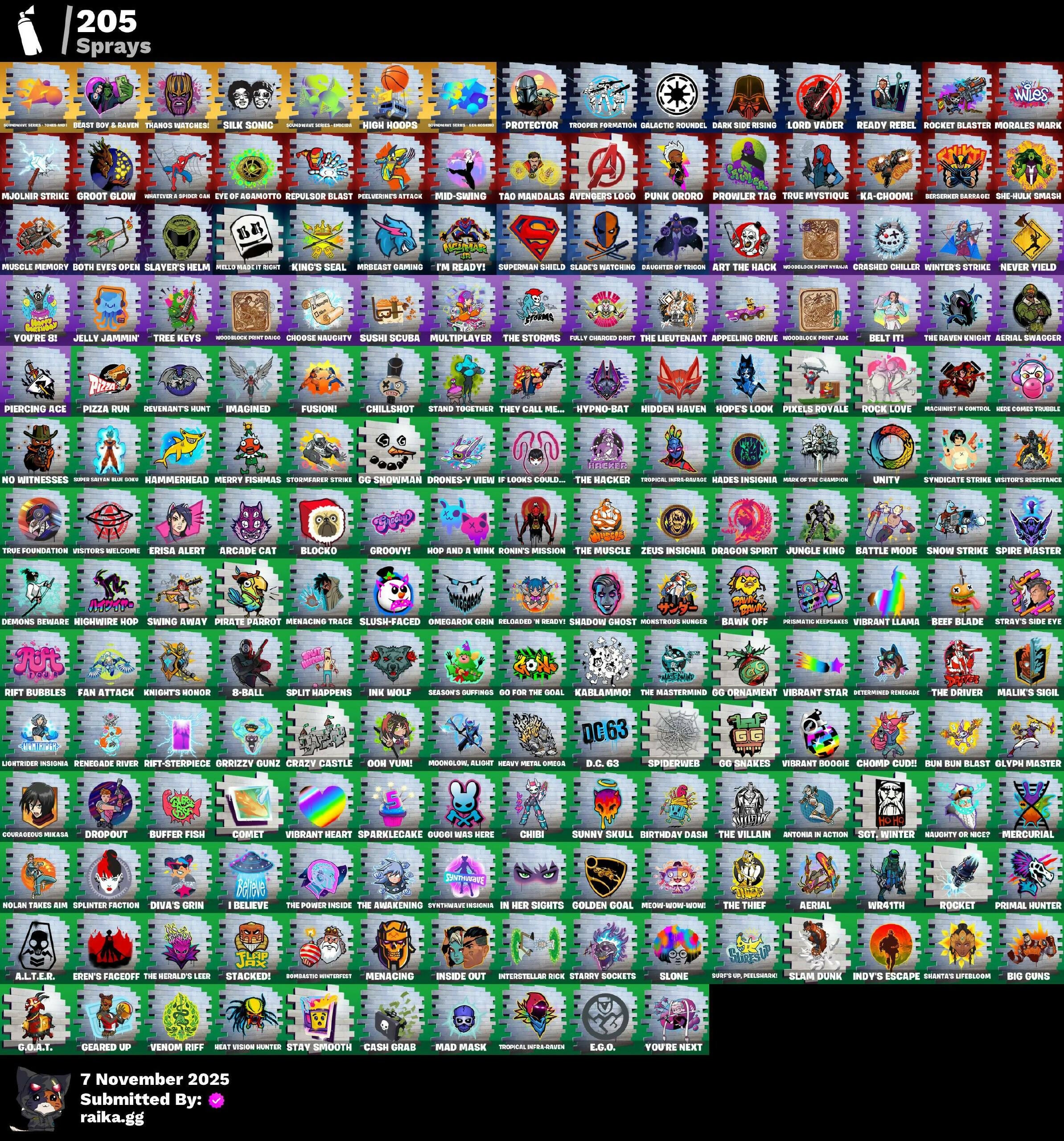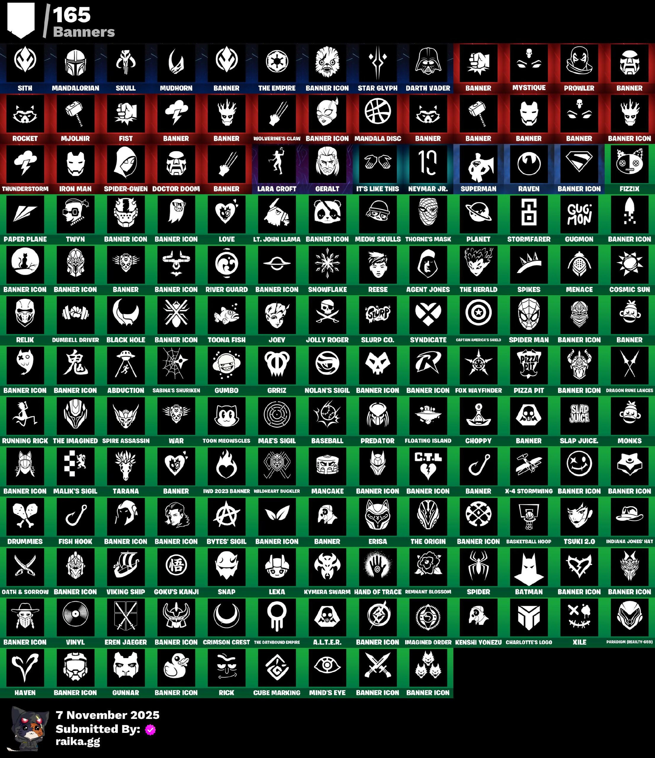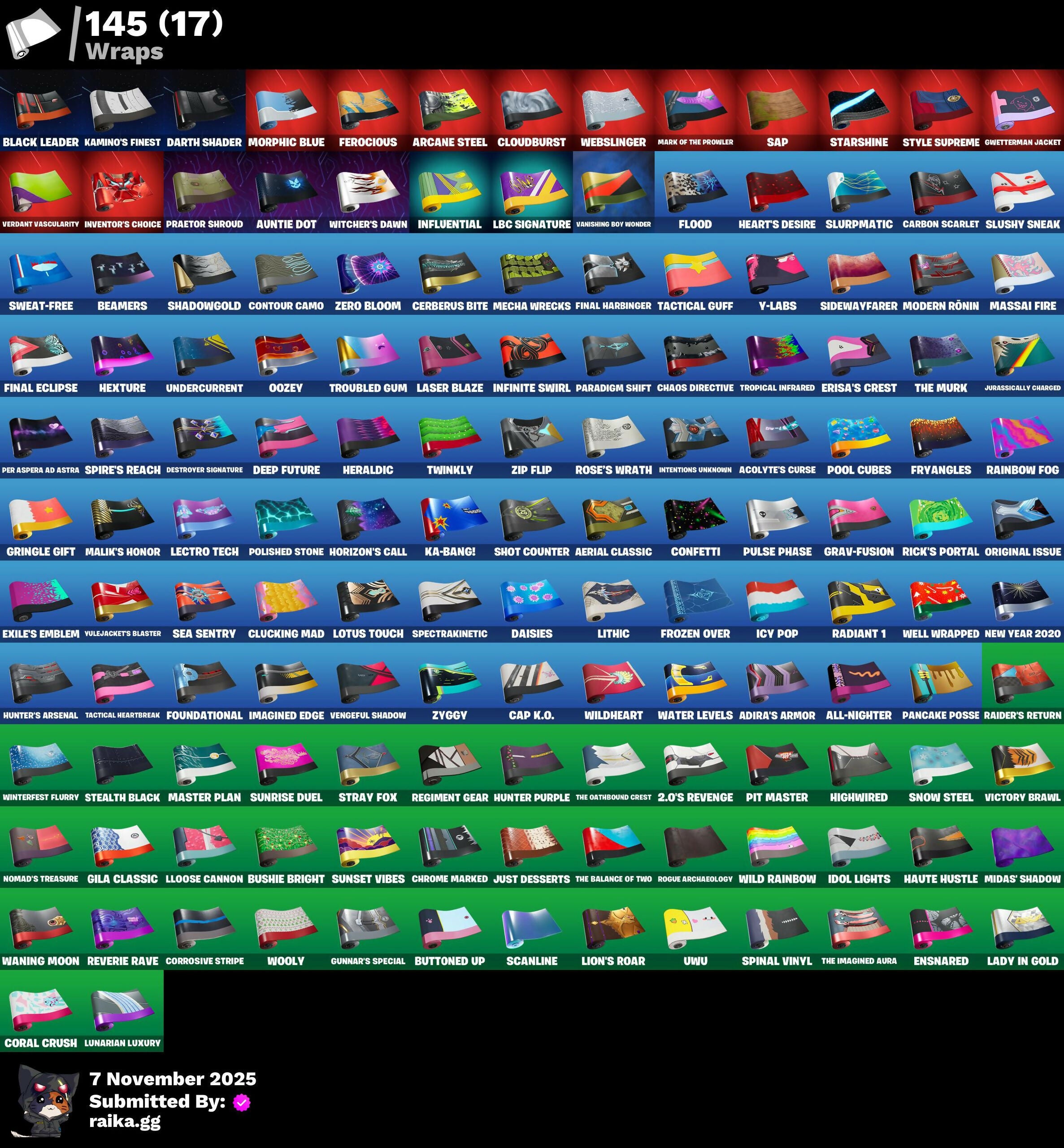 2.0's Revenge, 2020 Kickflip, 6-Carat Cutter, 8-Ball, 8-Ball Janky, 999 Knives, A Warrior Prepares, A.L.T.E.R., Abduction, Access Core, Acolyte's Curse, Adira, Adira's Armor, Adira's Battle Flag, Aerial, Aerial Acrobat, Aerial Classic, Aerial Swagger, Agent Jones, Agent Jones (Jump 31), Ahsoka Tano, Ahsoka's Staff, Air Horn, All-Nighter, Ancestral Bloom, Anniversary Axe, Antonia, Antonia In Action, Apocalypse Shroud, Appeeling Drive, Arachrobatics, Arcade Cat, Arcane Energy Glider, Arcane Steel, Arctic Adeline, Art The Hack, Articulated Blade Wing, Ascension Nezumi, Astro Armor, Astroworld Cyclone, Auntie Dot, Aurelian, Auto Clutch, Avengers Logo, Axe-Tral Form, Azarath Metron Zinthos!, B Splat, Back Board, Back Mounted Turbo Toner, Backup Blades, Balance Board, Bamboo-Tana, Banner, Banner Icon, Base Jumper, Baseball, Basecamp Bag, Basement Key, Basketball Hoop, Bat Royale, Batman, Battle Bloom, Battle Call, Battle Mode, Bawk Off, Beachcomber, Beamers, Bean Bag, Bear Hug, Beast Boy & Raven, Beastfang, Beatz Bunny, Bedside Nanner, Beef Blade, Beerus, Behold!, Belt It!, Berserker Barrage, Beskar, Bichota 4-String, Big Bite, Big Guns, Bike To Go, Birthday Basher, Birthday Dash, Black Adam, Black Hole, Black Leader, Black One X-Wing, Black Ops Sword, Blade of the Waning Moon, Bladed Travpak, Blitz 'Brella, Blitz Axe, Blitz Wings, Blocko, Blowin' Up, Blustery Bag, Board Breaker, Boba Bling, Boba Snack, Bobo, Bombastic Winterfest, Bone Patrol, Boogie Down, Book of Cagliostro, Boomin', Boosting Ki, Boots N' Cats, Both Eyes Open, Boulder Breakers, Bounty 'Brella, Brain Freeze, Breakfast Bounty, Breaking Point, Breaking Waves, Breathless Blades, Bring It Around, Bronzed Scimitars, Bubblegum Highwire, Bubbloon, Buffer Fish, Bugha, Bugha Blades, Bullet Rider, Bun Bun Bang Bang, Bun Bun Blast, Burning Ember, Bushie Bright, Butcher's Tools, Butter Robot, Buttoned Up, Buzz Pack, Bytes, Bytes' Sigil, Cacodemon, Call Me, Called Shot, Cap K.O., Captain America's Shield, Carbon Scarlet, Cardistry, Cash Grab, Cazadora, Celebratory Slice, Cerberus Bite, Chain Surfer, Chainsaur, Challenger Menace - Flame, Chaos Directive, Charge Pack, Charging Up, Charlotte's Logo, Chef's Special, Chibi, Chill-Axe, Chillshot, Choice Knit, Chomp Cud!!, Choose Naughty, Chop Chop, Chop Dropper, Choppy, Chrome Cloudcruiser, Chrome Marked, Chrome Punk, Chromebrella, Chromeseed, Chromestruck Fire, Clark Kent, Classic Wolverine, Clawz Retro, Clean Sweep, Cliffside Soarer, Clone Trooper, Cloud Llama Board, Cloudburst, Cluck, Cluck (Slurpy), Clucking Mad, Clutch & Dagger, Cobra Coin, Cold Front, Cold Furia, Collector Kado Thorne, Combat Elite, Comet, Comfy Cats, Commander's Descent, Confetti, Conjure Weapon, Contour Camo, Coral Crush, Corrosive Stripe, Cosmic Sun, Courageous Mikasa, Cozy Commander, Cozy Conch, Crack It, Crashed Chiller, Crazy Castle, Crescent Shroom, Crewmate, Crimson Crest, Crimson Wish, Crowning Achievement, Crucible Blade, Crystal Axe of the Masters, Crystal Fang, Crystal Smasher, Cube Aether, Cube Marking, Cubic Scepter, Cuddle Carvers, Cuddly Cloudcruiser, Cursed Marionette, Cyberdyne Salute, Cyclo Curl, D.C. 63, Dagger Dance, Daisies, Dance Monkey, Dark Charger, Dark Side Rising, Darkfire Claws, Darth Shader, Darth Vader, Daughter Of Trigon, Dealer's Deck, Death Star 'Brella, Deathstroke Zero, Deathstroke's Katanas, Deep Dab, Deep Dive, Deep Future, Delivery Diver, Demons Beware, Designated Hitters, Destroyer Signature, Determined Renegade, Diamond Diva, Dice Roll, Dimensional Gate, Dino Deck, Dirtbike Challenge, Distraction Dance, Diva's Grin, Dive Knives, Dizzie, Do The Split, Doctor Doom, Doctor Slone, Doctor Slone (Prismatic), Doctor Strange, Dogg Treat, Doom Chalice, Doom Slayer, Doom's Cowl, Double Header, Downpour, Downshift, Doze Dab, Dragon Radar, Dragon Rider, Dragon Rune Lance, Dragon Rune Lances, Dragon Spirit, Dragonhearted 'Brella, Dreamer's Two-Shot, Dreamzy Handbag, Drones-Y View, Droopy, Dropout, Drummies, Dumbbell Driver, Dumbell Driver, Dummy Supreme, Dusk Knight, Dusty, Dynamo Grav-Suit, E.G.O., Eagle's Form, Eclipse Brella, Eclipsed Edges, Eggar, Electric Shredder, Electro Pairing Blades, Electro-Pincers, Electrostatic Impactor, Elegance Blade, Elite Servo, Emergency Raft, Enchanted Lifebloom, Endless Scroll, Energy Claw, Ensnared, Epic Blade of Floof, Epitaph Edge, Equalizer, Eren Jaeger, Eren's Faceoff, Erisa, Erisa Alert, Erisa's Crest, Evasive Maneuvers, Everything's End, Evie, Exile's Emblem, Expedition Bag, Expressionism, Extra Round, Eye Of Agamotto, Fa-La-La-Llama, Fabled Cape, Fading Ember Cloak, Fan Attack, Fanged Foresight, Fashion Accident Janky, Felina, Felina's Claw, Ferocious, Final Eclipse, Final Harbinger, Fish Hook, Fish Thicc, Fishbone Flayer, Fishstick Janky, Fist, Fist Bump, Five Digit Slapper, Fizzix, Flaky Feast, Flapjack Flyer, Flashback Breakdown, Flex On 'Em, Flight Risk, Flip Flyer, Flippin' Away, Floating Island, Flood, Flux Silvera, Foil Flex, Forebearer, Fort Knighted, Fortilla Flier, Foundation's Mantle, Foundation's Plasma Spike, Foundational, Foundational 'Brella, Fox Clan 'Brella, Fox Drifter, Fox Wayfinder, Foxfire Edge, Freezing Point, Frequency Flyer, Frost Squad, Frostbite, Frostburn, Frosted Frets, Frosty Globes, Frozen Oculora, Frozen Over, Fryangles, Fuel Rod and Tongs, Fully Charged Drift, Fusion!, Fuzzfetti Cake, G.O.A.T., GG Ornament, GG Snakes, GG Snowman, Galactic Pack, Galactic Roundel, Gathering Storm, Geared Up, Gentleman's Dab, Geralt, Geralt Of Rivia, Get Loose, Ghost Rider, Gila Classic, Gilded Morphic Blades, Gilded Reality, Glorious Giftblade, Glyph Master, Go For The Goal, God Emperor Doom, Godzilla's Exo-Spine, Goku's Kanji, Golden Goal, Golden Nemesis, Golden Raz, Golden Scythe, Golden Spire Assassin, Goldy Lock, Golf Clap, Good Game, Well Played, Good Guy, Good Sportsmanship, Grav-Fusion, Griffin's Talon, Grind Bag, Gringle Gift, Grizzly Gooper, Grizzzy Gunz, Groot, Groot Glow, Groot's Sap Axes, Groovy!, Ground Pound, Grriz, Grzzly K