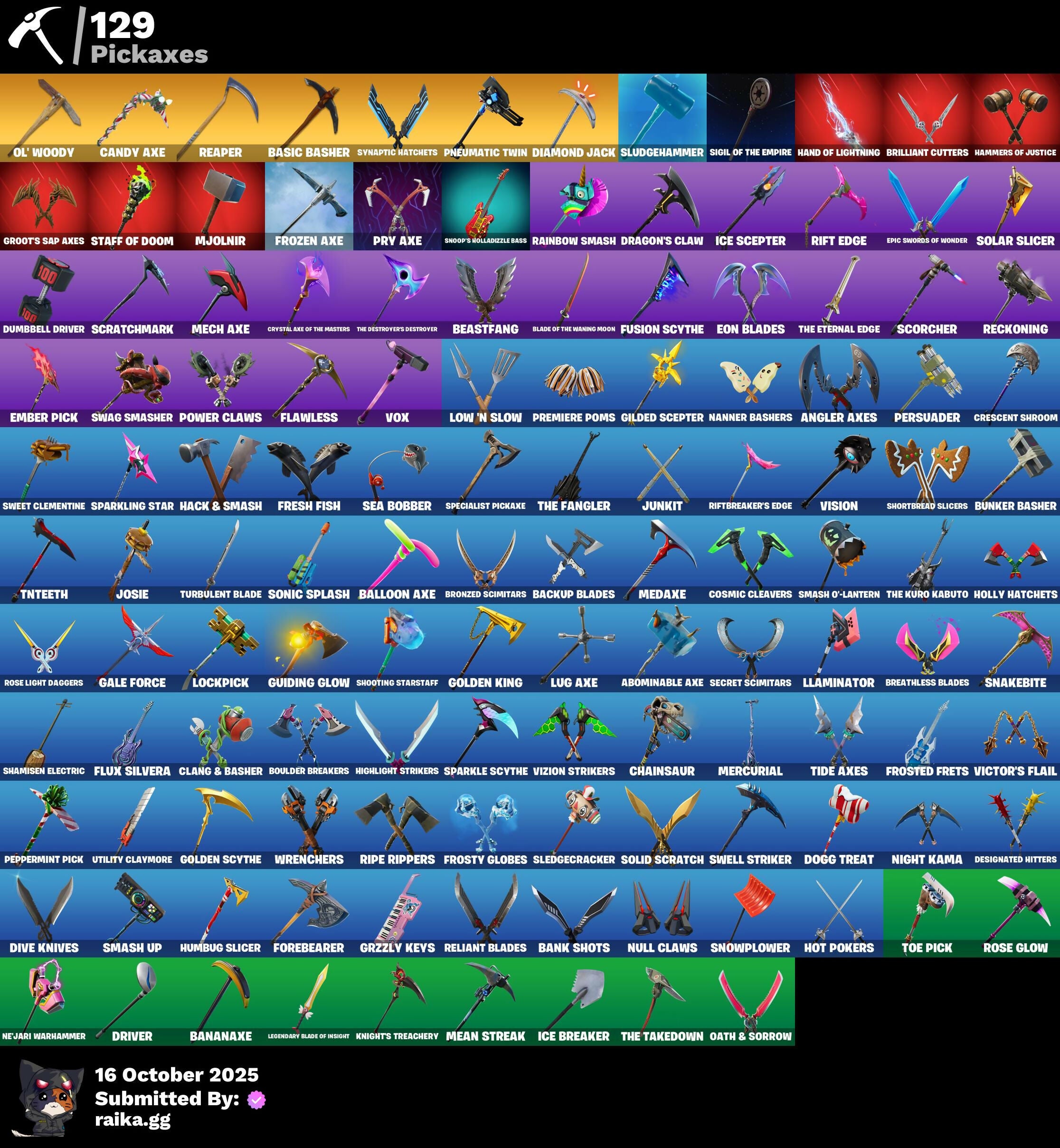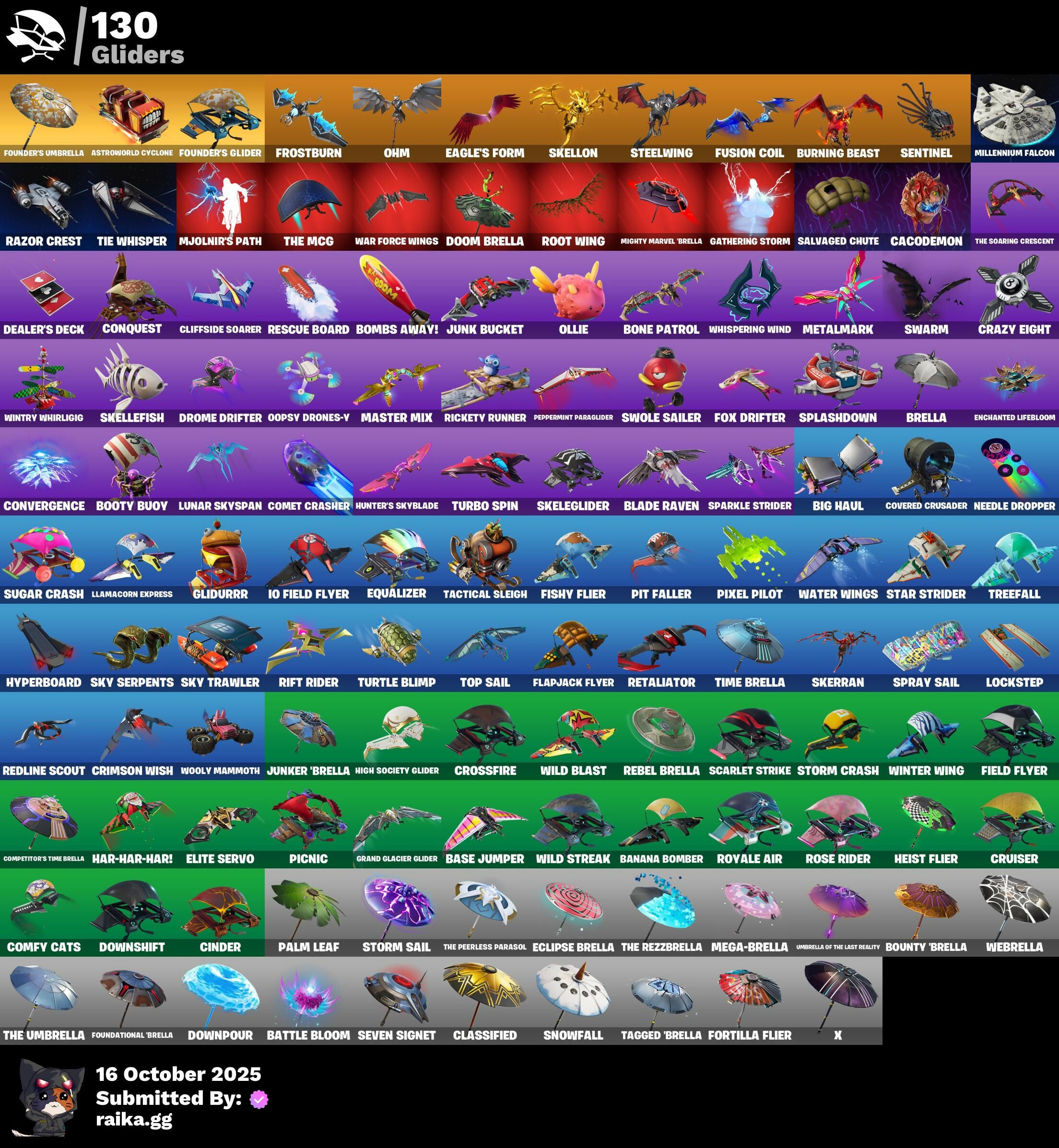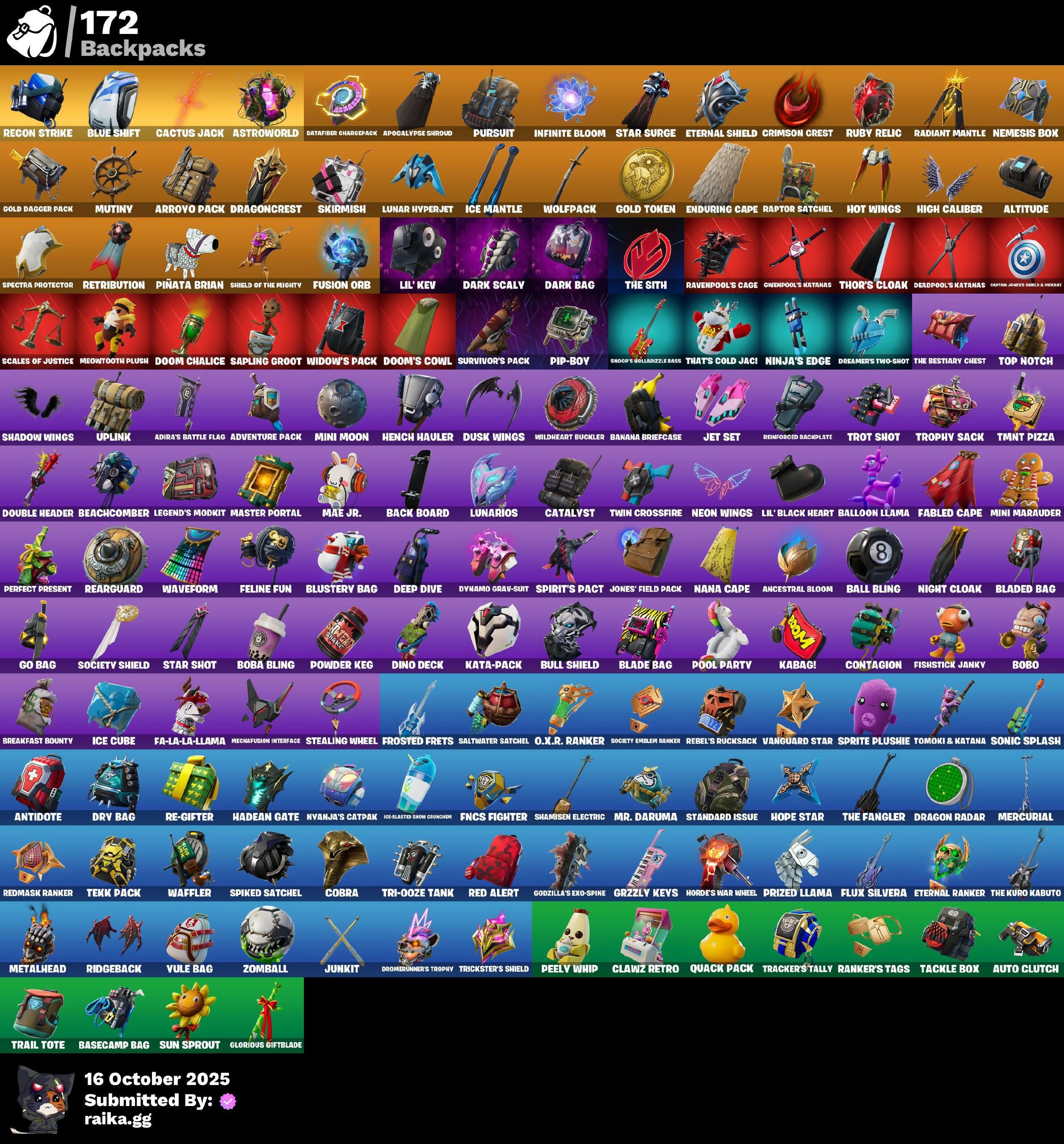 8-Ball, 8-Ball Vs Scratch, A Warrior Prepares, A.L.T.E.R., Abominable Axe, Adira's Armor, Adira's Battle Flag, Adventure Pack, Aerial, Aerial Classic, Aerial Swagger, Afterparty, Agent Jones, Agent Nana, Agent Peely, Air Horn, Air Shredder, Altitude, Ancestral Bloom, Angler Axes, Antidote, Apocalypse Shroud, Arcane Steel, Arctic Adeline, Arctic Camo, Ark, Arroyo Pack, Assault Trooper, Astro Antidote, Astro Jack, Astroworld, Astroworld Cyclone, Aura, Auto Clutch, B.R.U.T.E. Competitor, BPM Breakdown, Back Board, Backup Blades, Bacon, Bag of Coal, Baited, Ball Bling, Balloon Axe, Balloon Llama, Banana Bomber, Banana Briefcase, Bananas, Bananaxe, Bank Shots, Banner, Banner Icon, Base Jumper, Basecamp Bag, Basic Basher, Bat, Batman, Battle Bloom, Battle Bus Balloon, Battle Call, Battle Mode, Battlehawk, Beach Chair, Beachcomber, Beastfang, Beatbox, Beep Beep, Bees!, Behold!, Berserker Barrage, Bhangra Boogie, Big Haul, Bike To Go, Billy Bounce, Bim Bam Boom, Black Knight, Black Werewolf, Black Widow Outfit, Blackheart, Blade Bag, Blade Raven, Blade of the Waning Moon, Bladed Bag, Blasted, Blocko, Blowing Bubbles, Blue Shift, Blue Striker, Blustery Bag, Bob Cut, Boba Bling, Bobbin', Bobo, Boing!, Bolt, Bombastic Winterfest, Bombs Away!, Bone, Bone Patrol, Boogeyman, Boogie, Boomin', Booty Buoy, Bot, Both Eyes Open, Boulder Breakers, Bounty 'Brella, Breakfast Bounty, Breaking Point, Breakneck, Breathless Blades, Brella, Brilliant Cutters, Brite Bomber, Bronzed Scimitars, Brutus, Build Up, Bull Shield, Bunker Basher, Bunker Jonesy, Burning Beast, Burning Dragon, Bush Peek, Bushie Bright, Butterfly, By the Horns, Byte's Sigil, C3S3 Contender I, CG Potion, Cacodemon, Cactus Jack, Cactus Maze, Calamity, Calculated, Calico, Call Me, Callsign Wolf, Cameo, Cameo Vs Chic, Campfire, Candy Axe, Captain America's Shield, Captain Jones's Seals & Pickaxe, Captain Lamerica, Carbide, Carbon & Gold, Carbon Fiber, Cardistry, Cash Grab, Cat Flip, Catalyst, Cerberus Bite, Chainsaur, Challenger Menace - Flame, Chaos Directive, Charlotte's Logo, Chibi, Chic, Chimpanski Wants You, Choice Knit, Chomp Cudd!, Choose Naughty, Chrome Marked, Cinder, Circuit Breaker, Clang & Basher, Classified, Clawz Retro, Clean Groove, Clean Sweep, Cliffside Soarer, Cloaked Shadow, Cloudburst, Cluck Strut, Cobalt, Cobalt Overdrive, Cobra, Coconuts, Coin Flip, Combat Giller, Comet, Comet Crasher, Comfy Cats, Competitor's Time Brella, Confetti, Conga, Conquest, Constructor, Contagion, Controlled Focus, Controller Crew, Convergence, Corrosive Stripe, Corrupted, Cosmic Cleavers, Courageous Mikasa, Covered Crusader, Cowboy Chat, Crabby, Crabby King, Crashed Chiller, Crashed Shield, Crazy Castle, Crazy Eight, Crescent Shroom, Crimson Crest, Crimson Wish, Criss Cross, Crossfire, Crowned, Cruiser, Crystal Axe of the Masters, Crystal Llama, Cube, Cuddle Team Hula, Curling Iron, Cursed, D.C. 63, DJ Yonder, Dabstand, Daisies, Dance Mat, Dance Therapy, Dark, Dark Bag, Dark Bomber, Dark Rex, Dark Scaly, Datafiber Chargepack, Deadpool, Deadpool's Katanas, Dealer's Deck, Deep Dive, Demi, Demons Beware, Denim Destiny, Designated Hitters, Diamond Jack, Diamond Shapes, Dice, Dino Deck, Dinosaur, Dire, Diva's Grin, Dive Knives, Doctor Doom, Dogg Treat, Doggo, Dolphin, Doom Brella, Doom Chalice, Doom's Cowl, Double Header, Double Pump, Downpour, Downshift, Doze Dab, Dragon Radar, Dragon Rune Lances, Dragon Scales, Dragon Spirit, Dragon Stance, Dragon's Claw, Dragoncrest, Dreamer's Two-Shot, Drift, Driftwood, Driver, Drome Drifter, Dromrunner's Trophy, Drones-V View, Droop, Drop The Bass, Dropout, Drv Bag, Dumbbell Driver, Durrr, Durrr Burger, Dusk, Dusk Wings, Dusty Devastation, Dynamite, Dynamo, Dynamo Grav-Suit, E.G.O., Eagle's Form, Eclipse Brella, Electro Shuffle, Electro Swing, Elite Servo, Ember, Ember Pick, Emma's Influence, Emote Camo, Enchanted Lifebloom, Enduring Cape, Eon Blades, Epic Swords of Wonder, Eq, Equalizer, Escapees, Eternal Emblem, Eternal Knight, Eternal Ranker, Eternal Shield, Eternal Voyager, Evasive Maneuvers, Everything's Fine, Explosion, Extraterrestrial, Eye of Agamotto, FNCS Fighter, Fa-La-La-Llama, Fable, Fabled Cape, Face Palm, Fade, Fade Out, Fake Door, Fallen Love Ranger, Falling Leaf, Fate, Featherweight, Feline Fun, Festive Paper, Field Flyer, Fierce, Fire Spinner, Fire Vice, Fish Hook, Fishbone, Fishstick, Fishstick Janky, Fishy Flier, Fist, Fixer, Flamenco, Flapjack Flyer, Flawless, Flippin' Away, Flippin' Incredible, Floating Island, Flowy Hat, Flula, Flux Silvera, Fly, Foil Flex, Forebearer, Fortilla Flier, Foundational 'Brella, Founder's Glider, Founder's Umbrella, Fox, Fox Clan Mask, Fox Drifter, Free Flow, Fresh Fish, Frog Drawings, Frostburn, Frosted, Frosted Frets, Frostwing, Frosty Globes, Frozen Axe, Fryangles, Fully Charged Drift, Fusion, Fusion Coil, Fusion Orb, Fusion Scythe, Fusion!, GG Ornament, GG Smiley, GG Snakes, GG Snowman, Gale Force, Game Over, Gangnam Style, Gathering Storm, Gear Specialist Maya, Gemstone, Gentleman's Dab, Get Funky, Get Griddy, Giddy-Up, Gilded Scepter, Glidurrr, Glitter, Glorious Giftblade, Go Bag, Go Mufasa, Goated, Godzilla's Exo-Spine, Gold, Gold Dagger Pack, Gold Token, Gold Touch, Golden Agent, Golden King, Golden Scythe, Golden Shine, Golf Ball, Golf Clap, Good Vibes, Goosebumps, Grand Glacier Glider, Grav-Fusion, Greed, Gremlins, Grid, Gringle Gift, Groot, Groot Glow, Groots Sap Axes, Groovy!, Grriz, Grumpy Tree, Grzzly Keys, Guiding Glow, Gwenpool's Katanas, Gwettermann Jacket, Hack & Smash, Hadean Gate, Ham, Hammerhead, Hammers of Justice, Hand Horns, Hand of Lightning, Har-Har-Har!, Harbinger of Victory, Haute Hustle, Haven, Hazard Agent, Haze, Head Banger, Heart's Desire, Heartburst, Heat Vision Hunter, Heist Flier, Hello Friend, Hench, Hench Hauler, Hero Emblem, High Caliber, High Five, High Society Glider, Highlight Strikers, Holiday Boxy, Holly Hatchets, Hoodie, Hoop Master, Hope Star, Hope's Look, Hoppity, Horde's War Wheel, Hot Marat, Hot Pokers, Hot Stuff, Hot 