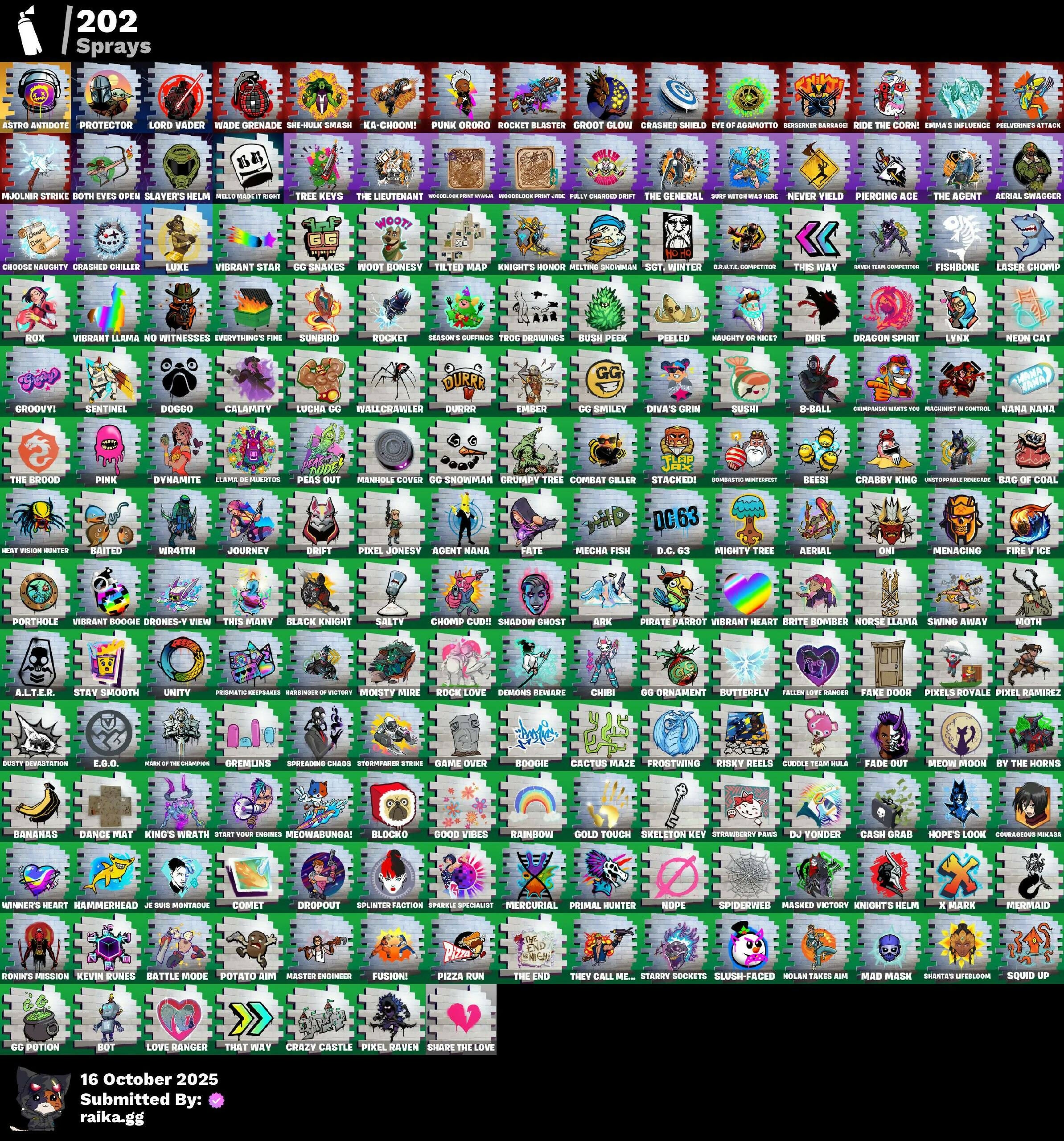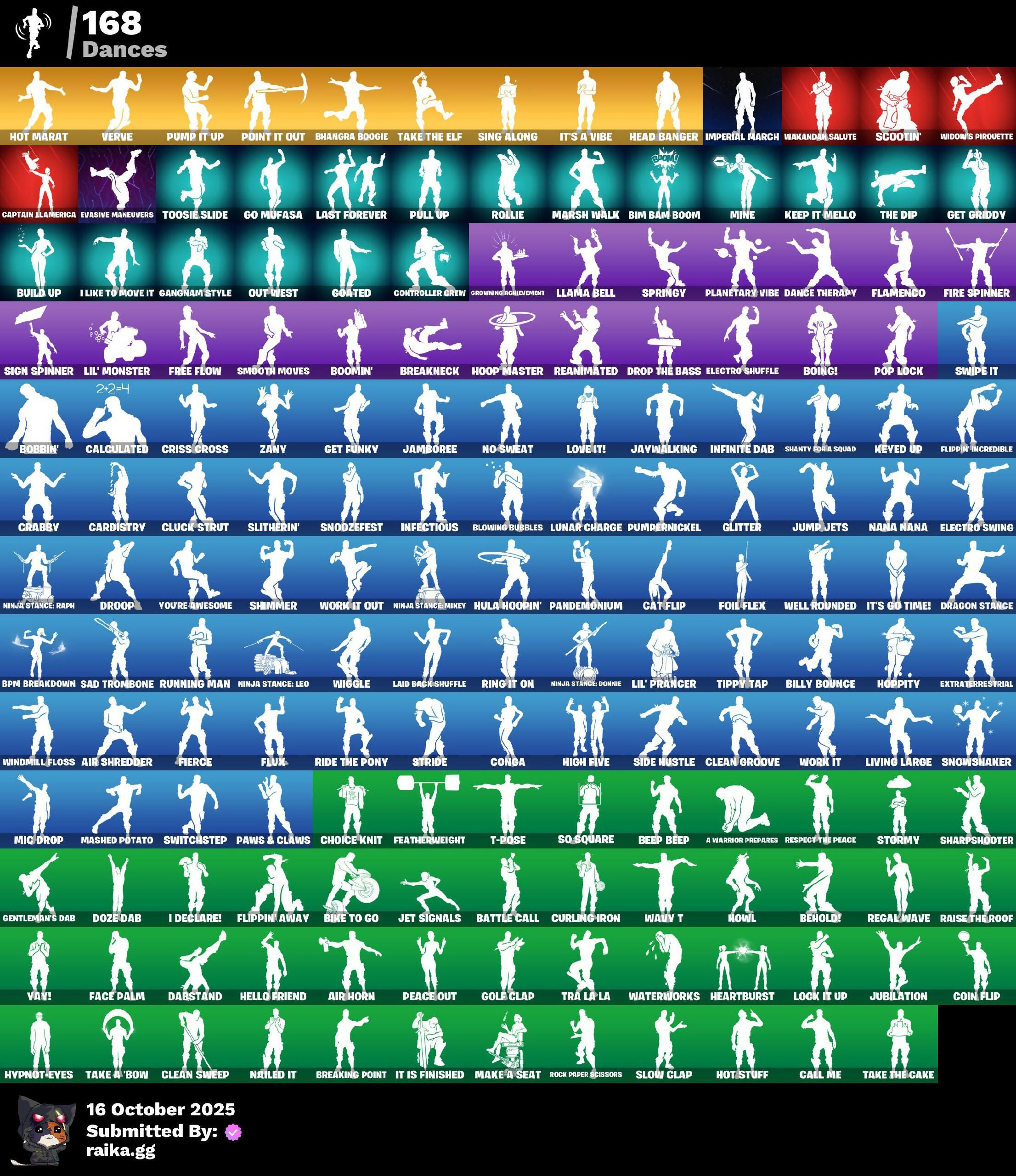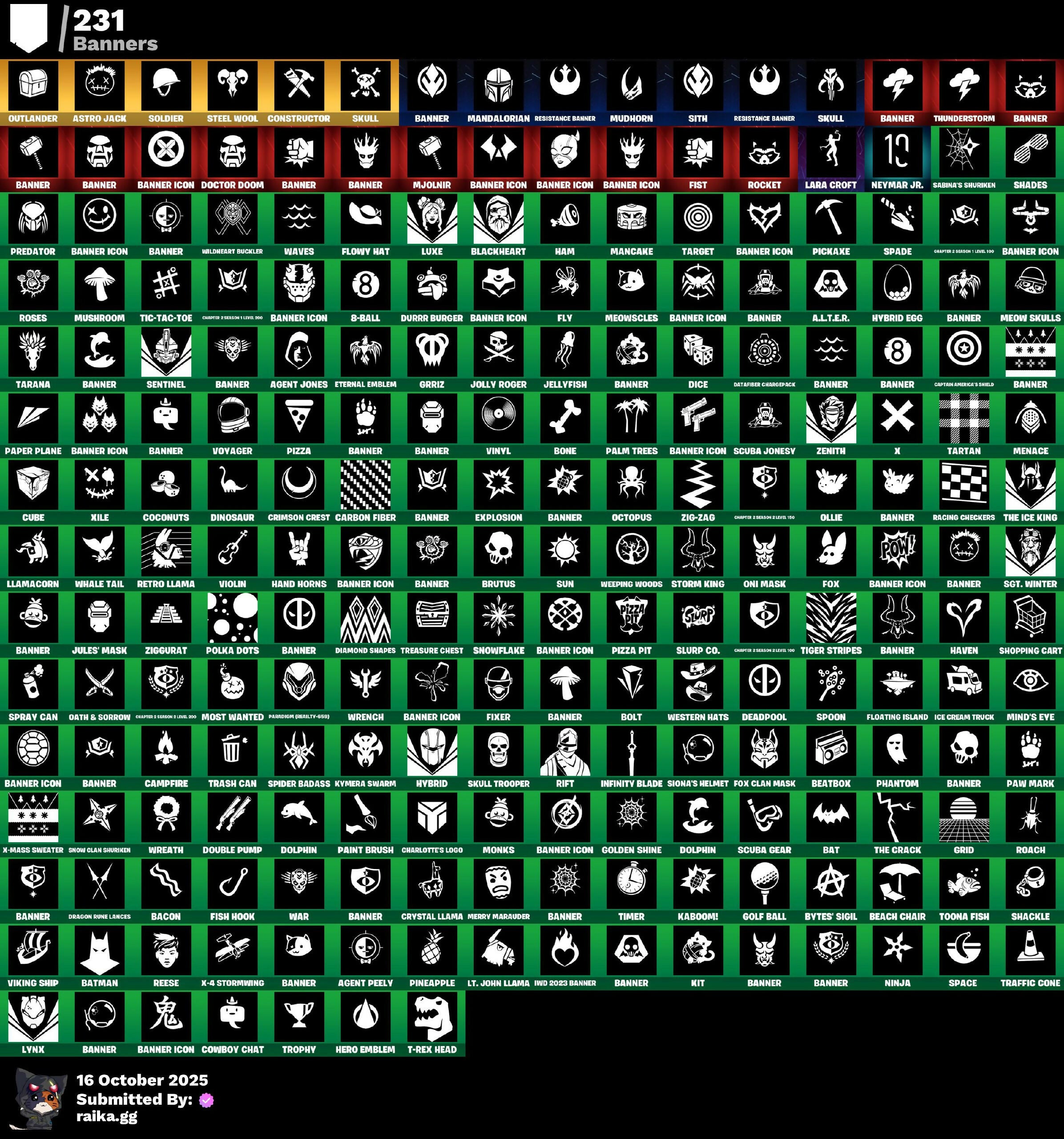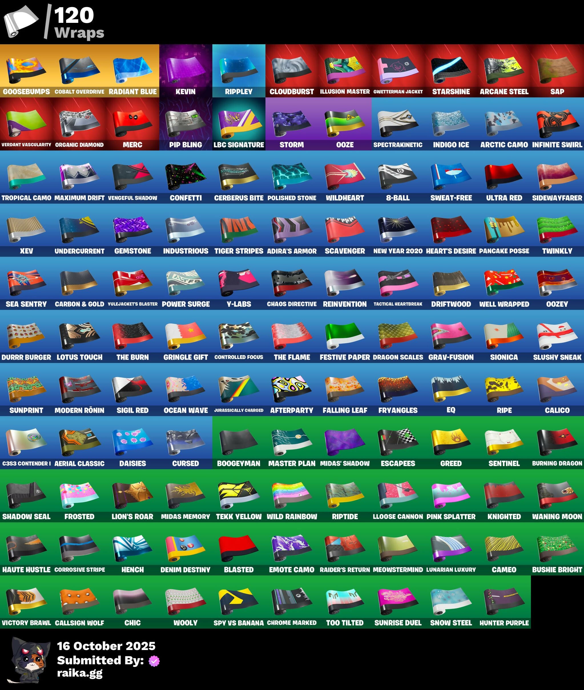 8-Ball, 8-Ball Vs Scratch, A Warrior Prepares, A.L.T.E.R., Abominable Axe, Adira's Armor, Adira's Battle Flag, Adventure Pack, Aerial, Aerial Classic, Aerial Swagger, Afterparty, Agent Jones, Agent Nana, Agent Peely, Air Horn, Air Shredder, Altitude, Ancestral Bloom, Angler Axes, Antidote, Apocalypse Shroud, Arcane Steel, Arctic Adeline, Arctic Camo, Ark, Arroyo Pack, Assault Trooper, Astro Antidote, Astro Jack, Astroworld, Astroworld Cyclone, Aura, Auto Clutch, B.R.U.T.E. Competitor, BPM Breakdown, Back Board, Backup Blades, Bacon, Bag of Coal, Baited, Ball Bling, Balloon Axe, Balloon Llama, Banana Bomber, Banana Briefcase, Bananas, Bananaxe, Bank Shots, Banner, Banner Icon, Base Jumper, Basecamp Bag, Basic Basher, Bat, Batman, Battle Bloom, Battle Bus Balloon, Battle Call, Battle Mode, Battlehawk, Beach Chair, Beachcomber, Beastfang, Beatbox, Beep Beep, Bees!, Behold!, Berserker Barrage, Bhangra Boogie, Big Haul, Bike To Go, Billy Bounce, Bim Bam Boom, Black Knight, Black Werewolf, Black Widow Outfit, Blackheart, Blade Bag, Blade Raven, Blade of the Waning Moon, Bladed Bag, Blasted, Blocko, Blowing Bubbles, Blue Shift, Blue Striker, Blustery Bag, Bob Cut, Boba Bling, Bobbin', Bobo, Boing!, Bolt, Bombastic Winterfest, Bombs Away!, Bone, Bone Patrol, Boogeyman, Boogie, Boomin', Booty Buoy, Bot, Both Eyes Open, Boulder Breakers, Bounty 'Brella, Breakfast Bounty, Breaking Point, Breakneck, Breathless Blades, Brella, Brilliant Cutters, Brite Bomber, Bronzed Scimitars, Brutus, Build Up, Bull Shield, Bunker Basher, Bunker Jonesy, Burning Beast, Burning Dragon, Bush Peek, Bushie Bright, Butterfly, By the Horns, Byte's Sigil, C3S3 Contender I, CG Potion, Cacodemon, Cactus Jack, Cactus Maze, Calamity, Calculated, Calico, Call Me, Callsign Wolf, Cameo, Cameo Vs Chic, Campfire, Candy Axe, Captain America's Shield, Captain Jones's Seals & Pickaxe, Captain Lamerica, Carbide, Carbon & Gold, Carbon Fiber, Cardistry, Cash Grab, Cat Flip, Catalyst, Cerberus Bite, Chainsaur, Challenger Menace - Flame, Chaos Directive, Charlotte's Logo, Chibi, Chic, Chimpanski Wants You, Choice Knit, Chomp Cudd!, Choose Naughty, Chrome Marked, Cinder, Circuit Breaker, Clang & Basher, Classified, Clawz Retro, Clean Groove, Clean Sweep, Cliffside Soarer, Cloaked Shadow, Cloudburst, Cluck Strut, Cobalt, Cobalt Overdrive, Cobra, Coconuts, Coin Flip, Combat Giller, Comet, Comet Crasher, Comfy Cats, Competitor's Time Brella, Confetti, Conga, Conquest, Constructor, Contagion, Controlled Focus, Controller Crew, Convergence, Corrosive Stripe, Corrupted, Cosmic Cleavers, Courageous Mikasa, Covered Crusader, Cowboy Chat, Crabby, Crabby King, Crashed Chiller, Crashed Shield, Crazy Castle, Crazy Eight, Crescent Shroom, Crimson Crest, Crimson Wish, Criss Cross, Crossfire, Crowned, Cruiser, Crystal Axe of the Masters, Crystal Llama, Cube, Cuddle Team Hula, Curling Iron, Cursed, D.C. 63, DJ Yonder, Dabstand, Daisies, Dance Mat, Dance Therapy, Dark, Dark Bag, Dark Bomber, Dark Rex, Dark Scaly, Datafiber Chargepack, Deadpool, Deadpool's Katanas, Dealer's Deck, Deep Dive, Demi, Demons Beware, Denim Destiny, Designated Hitters, Diamond Jack, Diamond Shapes, Dice, Dino Deck, Dinosaur, Dire, Diva's Grin, Dive Knives, Doctor Doom, Dogg Treat, Doggo, Dolphin, Doom Brella, Doom Chalice, Doom's Cowl, Double Header, Double Pump, Downpour, Downshift, Doze Dab, Dragon Radar, Dragon Rune Lances, Dragon Scales, Dragon Spirit, Dragon Stance, Dragon's Claw, Dragoncrest, Dreamer's Two-Shot, Drift, Driftwood, Driver, Drome Drifter, Dromrunner's Trophy, Drones-V View, Droop, Drop The Bass, Dropout, Drv Bag, Dumbbell Driver, Durrr, Durrr Burger, Dusk, Dusk Wings, Dusty Devastation, Dynamite, Dynamo, Dynamo Grav-Suit, E.G.O., Eagle's Form, Eclipse Brella, Electro Shuffle, Electro Swing, Elite Servo, Ember, Ember Pick, Emma's Influence, Emote Camo, Enchanted Lifebloom, Enduring Cape, Eon Blades, Epic Swords of Wonder, Eq, Equalizer, Escapees, Eternal Emblem, Eternal Knight, Eternal Ranker, Eternal Shield, Eternal Voyager, Evasive Maneuvers, Everything's Fine, Explosion, Extraterrestrial, Eye of Agamotto, FNCS Fighter, Fa-La-La-Llama, Fable, Fabled Cape, Face Palm, Fade, Fade Out, Fake Door, Fallen Love Ranger, Falling Leaf, Fate, Featherweight, Feline Fun, Festive Paper, Field Flyer, Fierce, Fire Spinner, Fire Vice, Fish Hook, Fishbone, Fishstick, Fishstick Janky, Fishy Flier, Fist, Fixer, Flamenco, Flapjack Flyer, Flawless, Flippin' Away, Flippin' Incredible, Floating Island, Flowy Hat, Flula, Flux Silvera, Fly, Foil Flex, Forebearer, Fortilla Flier, Foundational 'Brella, Founder's Glider, Founder's Umbrella, Fox, Fox Clan Mask, Fox Drifter, Free Flow, Fresh Fish, Frog Drawings, Frostburn, Frosted, Frosted Frets, Frostwing, Frosty Globes, Frozen Axe, Fryangles, Fully Charged Drift, Fusion, Fusion Coil, Fusion Orb, Fusion Scythe, Fusion!, GG Ornament, GG Smiley, GG Snakes, GG Snowman, Gale Force, Game Over, Gangnam Style, Gathering Storm, Gear Specialist Maya, Gemstone, Gentleman's Dab, Get Funky, Get Griddy, Giddy-Up, Gilded Scepter, Glidurrr, Glitter, Glorious Giftblade, Go Bag, Go Mufasa, Goated, Godzilla's Exo-Spine, Gold, Gold Dagger Pack, Gold Token, Gold Touch, Golden Agent, Golden King, Golden Scythe, Golden Shine, Golf Ball, Golf Clap, Good Vibes, Goosebumps, Grand Glacier Glider, Grav-Fusion, Greed, Gremlins, Grid, Gringle Gift, Groot, Groot Glow, Groots Sap Axes, Groovy!, Grriz, Grumpy Tree, Grzzly Keys, Guiding Glow, Gwenpool's Katanas, Gwettermann Jacket, Hack & Smash, Hadean Gate, Ham, Hammerhead, Hammers of Justice, Hand Horns, Hand of Lightning, Har-Har-Har!, Harbinger of Victory, Haute Hustle, Haven, Hazard Agent, Haze, Head Banger, Heart's Desire, Heartburst, Heat Vision Hunter, Heist Flier, Hello Friend, Hench, Hench Hauler, Hero Emblem, High Caliber, High Five, High Society Glider, Highlight Strikers, Holiday Boxy, Holly Hatchets, Hoodie, Hoop Master, Hope Star, Hope's Look, Hoppity, Horde's War Wheel, Hot Marat, Hot Pokers, Hot Stuff, Hot 