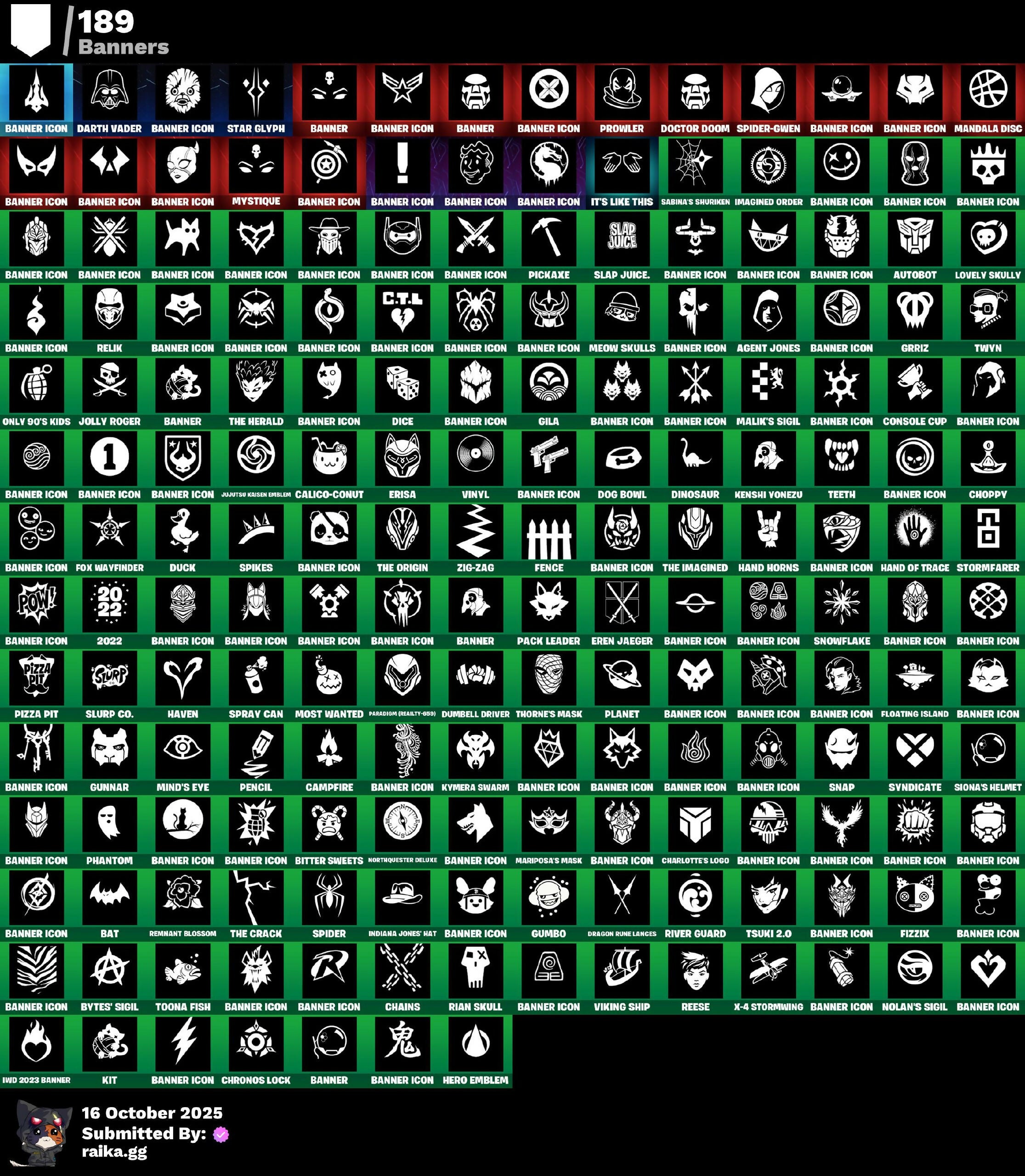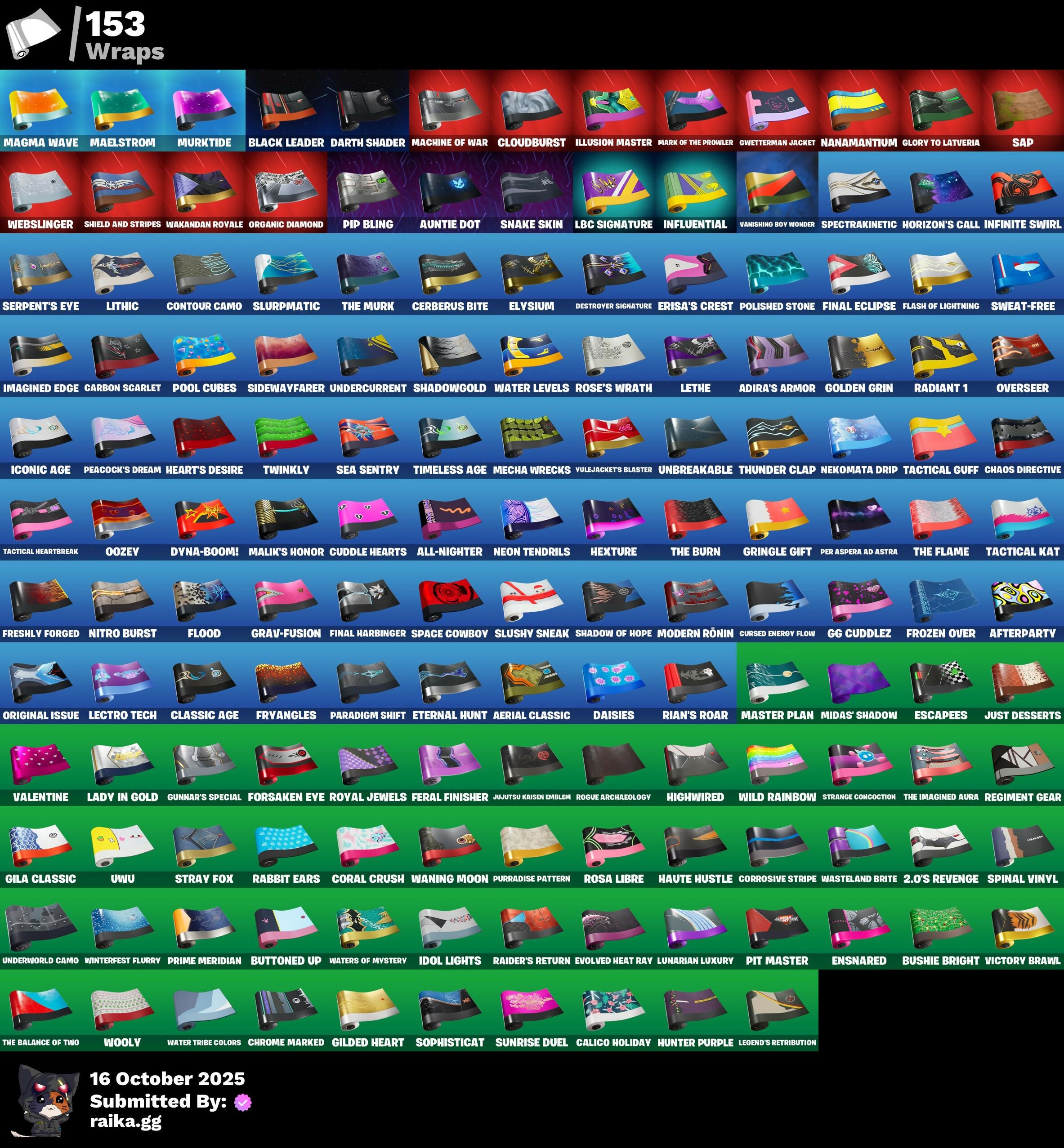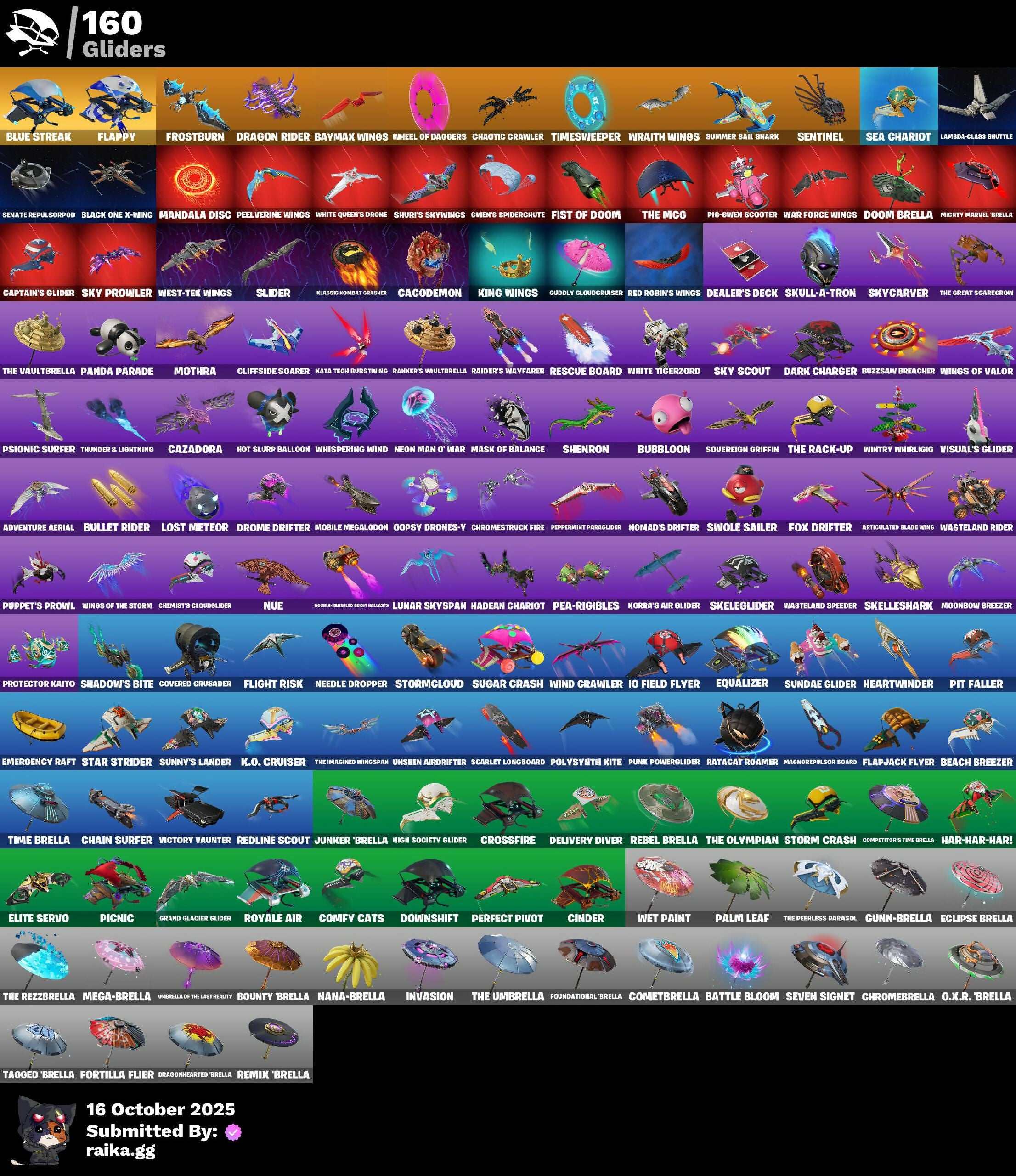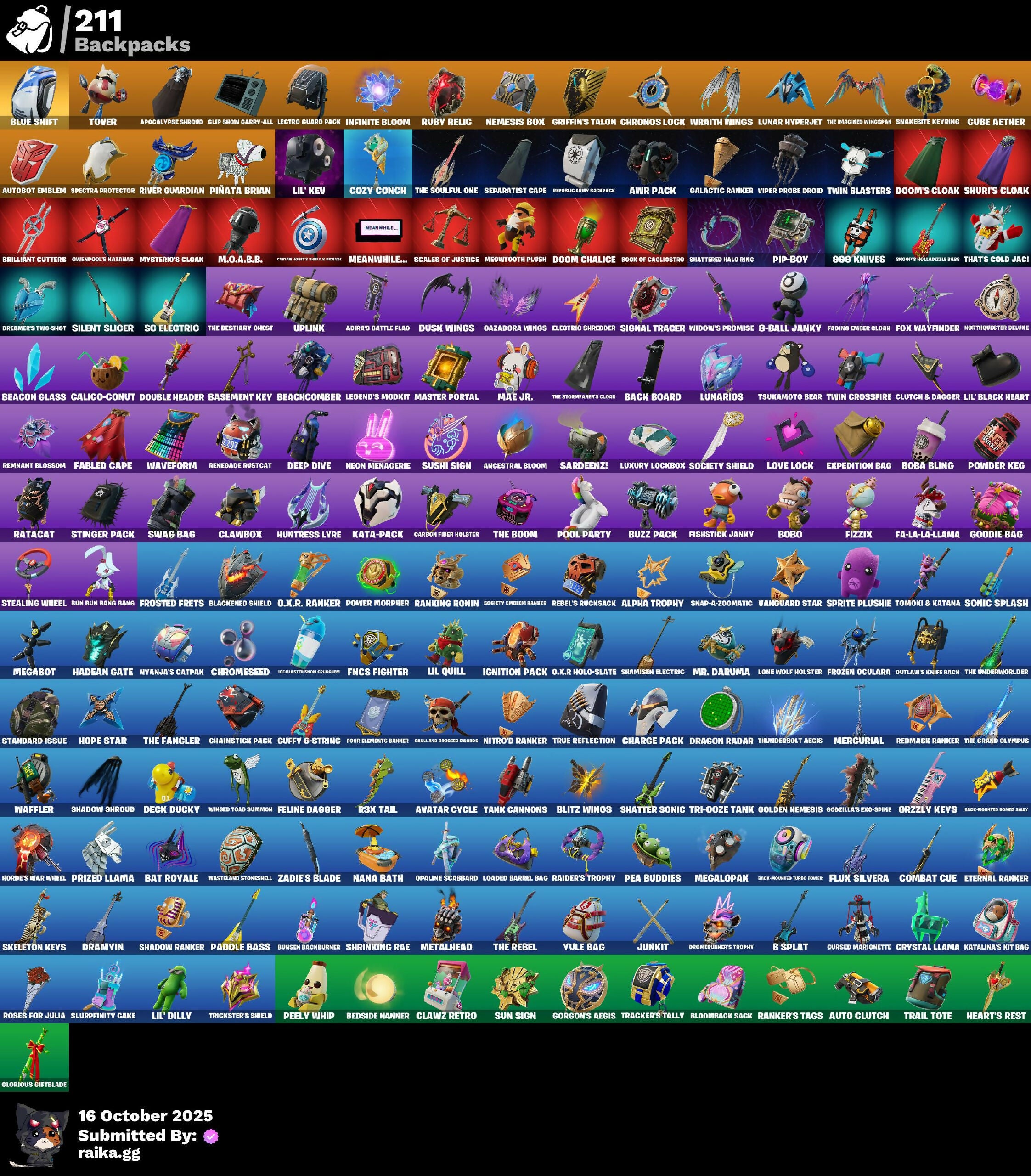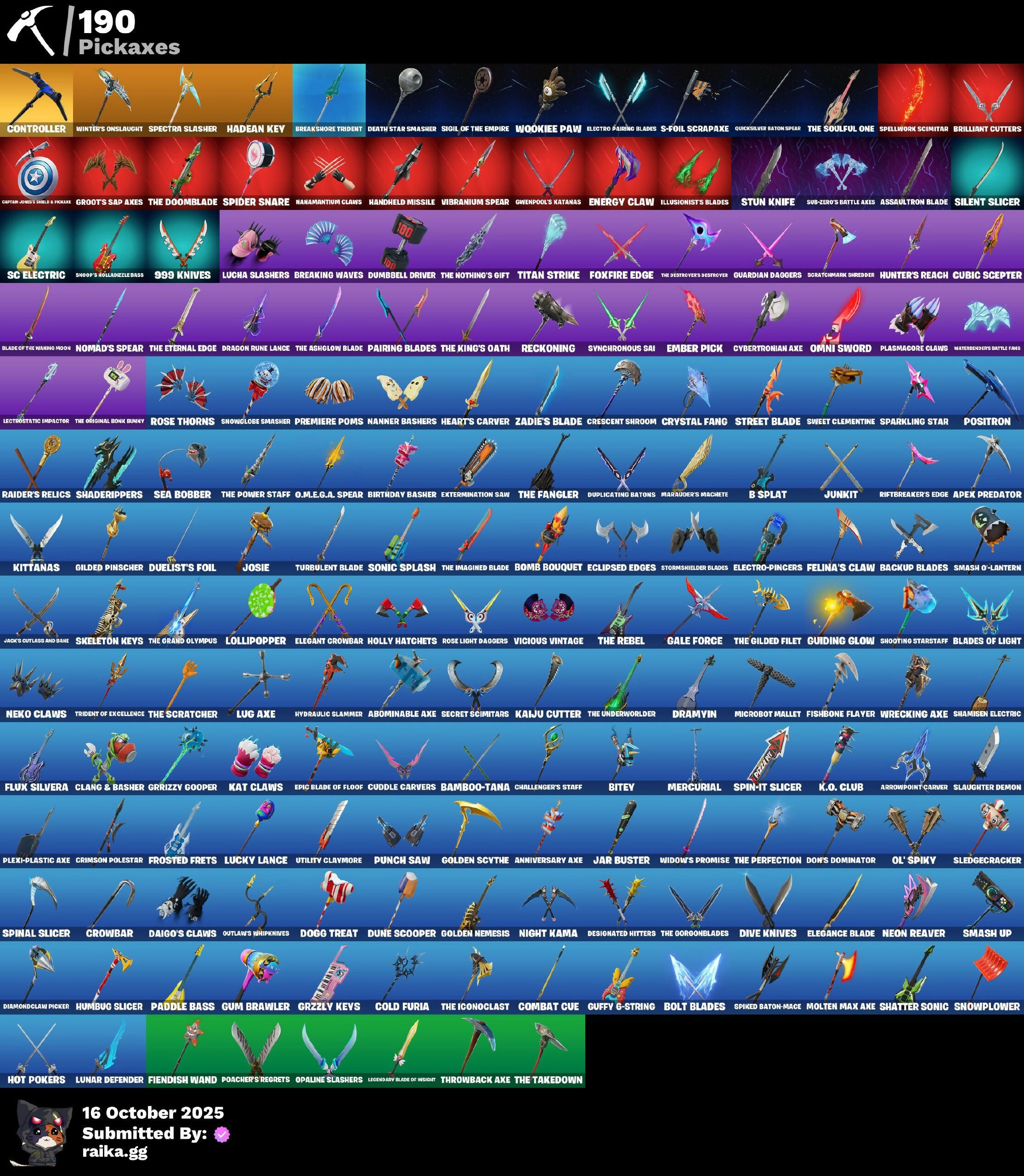 (Snikt!), 1-Ball, 2.0’s Revenge, 2022, 8-Ball Janky, 999 Knives, Abominable Axe, Abstract, Ad Victoriam!, Adira, Adira's Battle Flag, Adira’s Armor, Adventure Aerial, Aerial, Aerial Classic, Aerial Swagger, Afterparty, Agent Jones, Ahsoka Tano, Air Horn, All-Nighter, Alpha Trophy, Ancestral Bloom, Anniversary Axe, Antonia, Antonia in Action, Apex Predator, Aphrodite, Aphrodite Insignia, Apocalypse Shroud, Arachrobatics, Arcade Cat, Arctic Achiever, Arctic Adeline, Armored Victory, Arrow, Arrowpoint Carver, Artemis, Artemis Insignia, Articulated Blade Wing, Assaultron Blade, Auntie Dot, Aura, Aurelian, Auto Clutch, Autobot, Autobot Emblem, Avatar Cycle, Avatar's Flourish, Awr Pack, Axo's Big Moment, B Splat, B.R.U.T.E. Competitor, Babygirlll, Back Board, Back-Mounted Bombs Away, Back-Mounted Turbo Tower, Backup Blades, Balanced, Bamboo-Tana, Baron Kane, Baron's Hoard, Basement Key, Bat, Bat Royale, Battle Blessing, Battle Bloom, Battle Call, Battle Mode, Battle Ready Era, Battle-Tested, Battlehawk, Baymax Wings, Beach Breezer, Beachcomber, Beacon Glass, Beatzbunny, Bedside Manner, Belt It!, Big Fan, Big Guns, Bike To Go, Birthday Basher, Bitey, Bitter Sweets, Black Knight T-60 Power Armor, Black Leader, Black One X-Wing, Black Panther (Shuri), Black Queen, Blackened Shield, Blade Of The Waning Moon, Blades Of Light, Blazing Fire Cerberus, Blitz Wings, Blocko, Bloomback Sack, Blowin' Up, Blue Shift, Blue Streak, Blue Striker, Blue Team Leader, Boba Bling, Bobo, Bolt Blades, Bomb Bouquet, Bombastic Winterfest, Book of Cagliostro, Boosting Ki, Both Eyes Open, Bounty 'Brella, Breaking Waves, Breakshore Trident, Brilliant Cutters, Brite & Speedy, Brite Moves, Brite Raider, Bubloon, Buffer Fish, Bullet Rider, Bun Bun Bang Bang, Bun Bun Blast, Bunger Backburner, Burning Ambition Valeria, Bushie Bright, Buttoned Up, Buzz Pack, Buzzsaw Breacher, By the Horns, Bytes, Bytes' Sigil, CTI, Cacodemon, Cactus Maze, Calamity, Calico Holiday, Calico-Conut, Call Me, Campfire, Captain Jones, Captain Jones's Shield & Pickaxe, Captain Lamerica, Captain's Glider, Carbide, Carbon Fiber Holster, Carbon Scarlet, Card Drop, Cash Grab, Cauldron Chill, Cazadora, Cazadora Wings, Cerberus, Cerberus Bite, Cerberus Insignia, Cerberus Medallion, Chain Surfer, Chains, Chainstick Pack, Chalk Outline, Chalked Up 1-Ball, Challenger Cerberus, Challenger's Staff, Champion Siren, Chaos Directive, Chaos Director, Chaotic Crawler, Charge Pack, Charlotte's Logo, Chef's Special, Chemist's Cloudglider, Choice Knit, Chomp Cudi!, Choose Naughty, Choppy, Chrome Marked, Chrome Punk, Chromebrella, Chromeseed, Chromestruck Fire, Chronos Lock, Cinder, Circle, Clang & Basher, Classic Age, Classic Peelverine, Clawbox, Clawz Retro, Clean Sweep, Cliffside Soarer, Clip Show Carry-All, Cloudburst, Clutch & Dagger, Codsworth's Cleanup, Cold Furia, Coldでも熱く, Collector Kado Thorne, Combat Cue, Combat Elite, Combat Giller, Comet, Cometbrella, Comfy Cats, Competitor Medusa, Competitor's Time Brella, Conch Call, Confident Iridia, Conjure Weapon, Conjuring Mysterio, Console Cup, Contour Camo, Controlled Chaos, Controller, Coral Crush, Corrosive Stripe, Count It!, Courageous Mikasa, Covered Crusader, Cozy Conch, Crack It, Crashed Chiller, Crashed Shield, Crazy Castle, Crescent Shroom, Crimson Polestar, Cross Your Heart, Crossfire, Crowbar, Crowning Achievement, Crusher, Crystal, Crystal Fang, Crystal Llama, Cube Aether, Cubic Scepter, Cuddle Carvers, Cuddle Hearts, Cuddles' Garden, Cuddly Cloudcruiser, Curbed Marionette, Curling Iron, Cursed Energy, Cursed Energy Flow, Cybertronian Axe, Cyclo Curl, D.C. 63, DJ Yonder, Dagger Dance, Daigo, Daigo's Claws, Daisies, Dance Mat, Dark Charger, Dark Gwenpool, Dark Side Rising, Darth Shader, Darth Vader, Dealer's Deck, Death Star Smasher, Deck Ducky, Deep Dive, Delivery Diver, Demon Hunter Hope, Demons Beware, Designated Hitters, Destroyer Signature, Determined Kendo, Determined Korra, Determined Renegade, Diamond Throne, Diamondclaw Picker, Dice, Dice Roll, Dinosaur, Direct the Chaos, Dirtbike Challenge, Diva's Grin, Dive Knives, Do It!, Do The Split, Doctor Strange, Dog Bowl, Dogg Treat, Don Target, Don of the Wastes, Don's Dominator, Doom, Doom Brella, Doom Chalice, Doom's Cloak, Double Header, Double-Barreled Boom Ballasts, Downshift, Doze Dab, Dragon Radar, Dragon Rider, Dragon Rune Lance, Dragon Rune Lances, Dragon Spirit, Dragonclinger's Trophy, Dragonhearted 'Brella, Dramatic Flares, Dramyin, Dreamers Two-Shot, Drome Drifter, Drones-y View, Dropout, Duck, Duelist's Foil, Dumbbell Driver, Dumbell Driver, Dune Scooper, Dupli-Kate, Duplicating Batons, Duplikates, Dusk Knight, Dusk Wings, Dyna-Boom!, Dynamic Tntina, Dynamo, Dynamo Tntina, Dynamo Tntoon-A, Echo, Eclipse Brella, Eclipsed Edges, Electric Shredder, Electro Pairing Blades, Electro-Pincers, Electrostatic Impactor, Elegance Blade, Elegant Crowbar, Elemental Cycle, Elite Servo, Elysian Artemis, Elysium, Ember Pick, Emergency Raft, Emma Frost, Emma's Influence, Empress Fan Dance, Energized Godzilla, Energy Claw, Ensnared, Epic Blade Of Floof, Equalizer, Era, Eren Jaeger, Eren's Faceoff, Erisa, Erisa Alert, Erisa’s Crest, Escapees, Eternal Hunt, Eternal Ranker, Evie, Evolved Heat Ray, Expedition Bag, Expressionism, Extermination Saw, Eye of Agamotto, FNCS Fighter, Fa-La-La-Llama, Fable, Fabled Cape, Face Palm, Fading Ember Cloak, Fan Attack, Fancy Feet, Fancy Peter Griffin, Fang Dance, Felina, Felina's Claw, Feline Dagger, Fence, Feral Finisher, Fiendish Wand, Final Eclipse, Final Harbinger, Fire Show, Fireworks Salvo, Fish Thicc, Fishbone Flayer, Fishstick Janky, Fist Bump, Fist Of Doom, Fizzix, Flaky Feast, Flap Flap!, Flapjack Flyer, Flappy, Flash Of Lightning, Flashback Breakdown, Flight Risk, Flippin' Away, Floating Island, Flood, Flux Silvera, Foil Flex, Forsaken Eye, Fort Knighted, Fortilla Flier, Foundational 'Brella, Four Elements Banner, Fox Drifter, Fox Wayfinder, Foxfire Edge, Freshly Forged, Frostburn, Frosted Frets, Frozen O