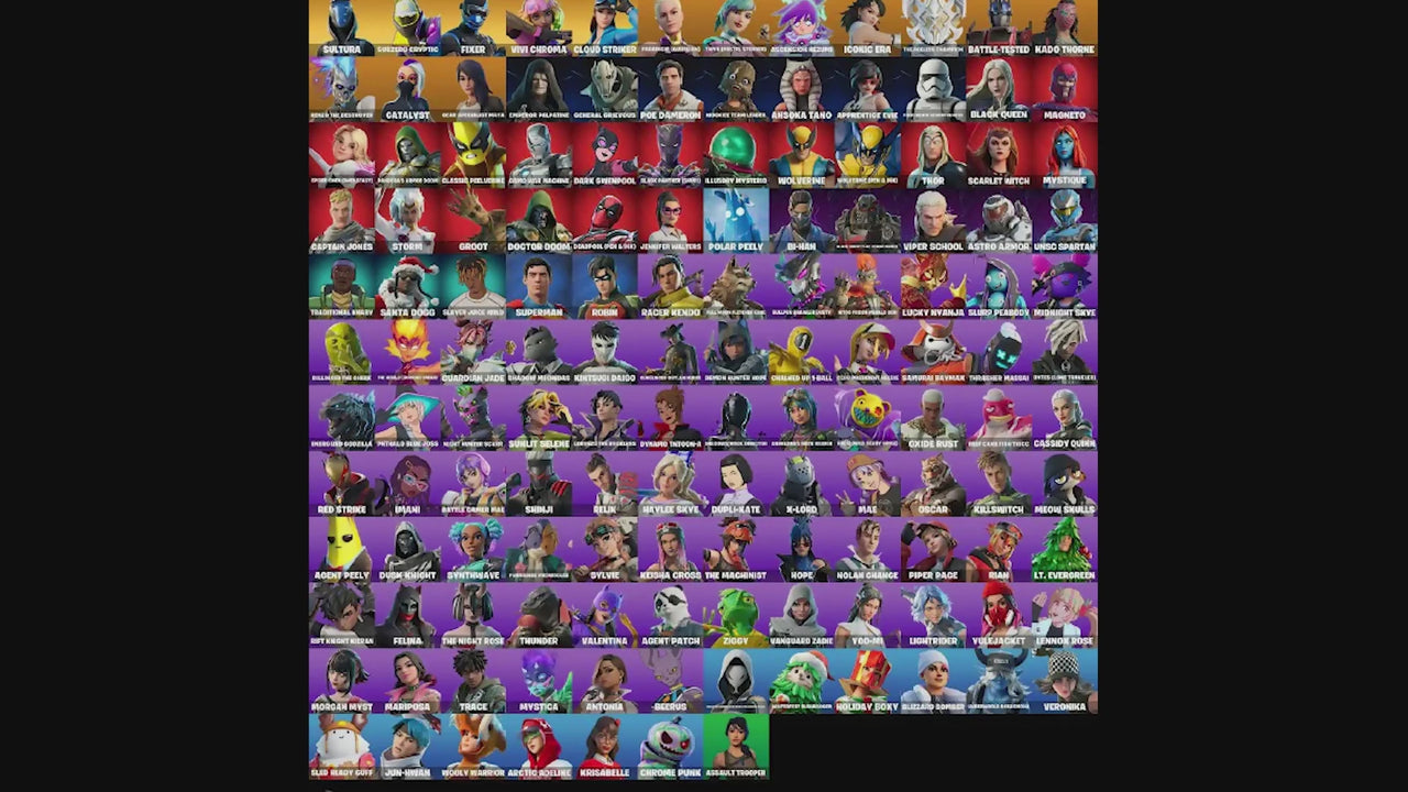 Agent Patch, Agent Peely, Ahsoka Tano, Antonia, Apprentice Eve, Arctic Adeline, Ascencion Nezuko, Ascension Nezumi, Assault Trooper, Astro Armor, Auto Fisto Fullskin, Banner Icon, Battle Career Mae, Battle-Tested, Beef Cake Flamece, Beerus, Belle Anime Effect, Bi-Ham, Bi-Han, Biohazard Scientific, Black Knight, Black Knight T-60 Power Armor, Black Panther (Shuri), Black Queen, Blizzard Bomber, Blue Viper, Bone-Yde Destroyer, Boysen Vintage Bear, Brimstone Rambino, Brutus, Bullpen Brawler Dusty, Bulls Eye Avutore, Bytes (Lone Traveler), Camo War Machine, Captain Jones, Carnage, Cassidy Quinn, Catalyst, Chalked Up 1-Ball, Charmed Up Pearl, Chrome Punk, Classic Peelverine, Classic Pellewiene, Cloud Striker, Club President Helsie, Cluck, Cobalt Overdrive, Crackshot, Cryptic Coaster, Cryptic Sling-Kit, Cuddle Team Leader, Cuzerro Cryptic, Cymitar, Dark Gwenpool, Darklands Brite Raider, Dazzle, Deadpool, Deadpool On A Kukri, Demon Hunter Hope, Demon Slayer Riko, Dillinger The Gherk, Divine Ranger, Doctor Doom, Domo Yoru Machen, Drift, Dupli-Kate, Dusk Knight, Dusk Panther Hollow, Dynamo Tntoon-A, Dynapiro Tintoon-A, Elevation, Emperor Palpatine, Energized Godzilla, Energoid Godzilla, Felina, Fishstick, Fixer, Follow the Butterfly, Full Moon Fletcher Kane, Full Moon Skin, Future Relic Scythe, General Grievous, Gold Blooded Ace (Cold Blooded Ace), Golden Midas, Groot, Grriz (Wild Beary Grriz), Guardian Jade, Gunslinger Outlaw Midas, Hayvee Skye, Hazard, Hex Code, Highland Warrior, Holiday Roxy, Hon Eix Team Leader, Hope, Hybrid, Iconic, Iconic Era, Illusory Devestor, Illusory Mysterio, Imani, Indominer, Introducing..., Iron Man, Jennifer Walters, Jonesy The First, Jun-Hwan, Jupiter Grey (SH & MO), Kado Thorne, Keisha Cross, Killswitch, Kintsugi Daido, Kintsugi Daigo, Krisabelle, Lazar Beam, Lennox Rose, Light Burst, Lightbrider, Lorenzo The Reckless, Lt. Evergreen, Lucky Kwanja, Lucky Nyanja, Lugers, Luxe, Lynx, Mae, Magneto, Mandalorian, Mariposa, Mars, Menace, Meow Skulls, Meowscles, Midnight Skye, Morgan Myst, Morgana's Ember Doom, Mystica, Mystique, Neo's Bullet Time, Neon Gradient, Night Hunter Scarr, Night Hunter Scion, Nitro Fusion Megalo Don, Noblond Moon, Nog Ops, Nolan Change, Omega, Oscar, Oscar Airheart Maya, Otherworld, Out with the Old, Oxide Rust, Pandora's Armor Doom, Paradigm (Aurelian), Peely, Perfect Point, Petrol Pump, Phthalo Blue Joss, Piper Page, Poe Dameron, Point Patrol, Polar Peely, Predator, Pull Up, Punkbone Moonclade, Pythalo Blue Boss, Racer Kendo, Raptor, Raz, Rebirth Raven, Red Strike, Reef Cake Fish Thicc, Relin, Rian, Rift Knight Kieran, Robin, Rolling Glyphs, Rust Lord, Sabre, Samurai Baymax, Santa Dogg, Savanna Fishkiller, Scarlet Witch, Scribble's Sailer, Shadow Atroxas, Shadow Meowdas, Shadow Vox, Shadowstruck Director, Shanta, Shinji, Showboat, Silver Juice Head, Sing Along, Siren Head, Skull Ranger, Skull Trooper, Slammin' Bass, Slud Reddy Guft, Slurp Peabody, Snow Sailer, Somuria, Spider-Gwen (Gwen Stacy), Spider-Gwen Ghost-Spider, Spider-Man, Square Up, Storm, Storm 1, Stormtrooper, Stratosphere, Subzero Cryptic, Sultura, Summit Seeker Olaf, Sunlit Selene, Superman, Sylvie, Synaptic Hatchets, Synthwave, Tanuki, The Ageless Champion, The Fallen Rambino, The Foundation, The Herald (Burning Ember), The Ice King, The Machinist, The Night Rose, The Reaper, Thor, Thrasher Massai, Thunder, Tiny Death Eyedro, Trace, Traditional Baby, Traditional Khaby, Treasure Passon, Twyn (Pastel Stryder), UNSC Spartan, Ultima Knight, Valentina, Vanguard Zadie, Veridian Tech, Veronika, Vi, Viper School, Vivi Chroma, Volejacket, White Lily Therapist, Wolverine, Wooly Warrior, Wukong, X-Lord, Yoo-Mi, Zephyr, Ziggy, Zim, Zombie Shambles