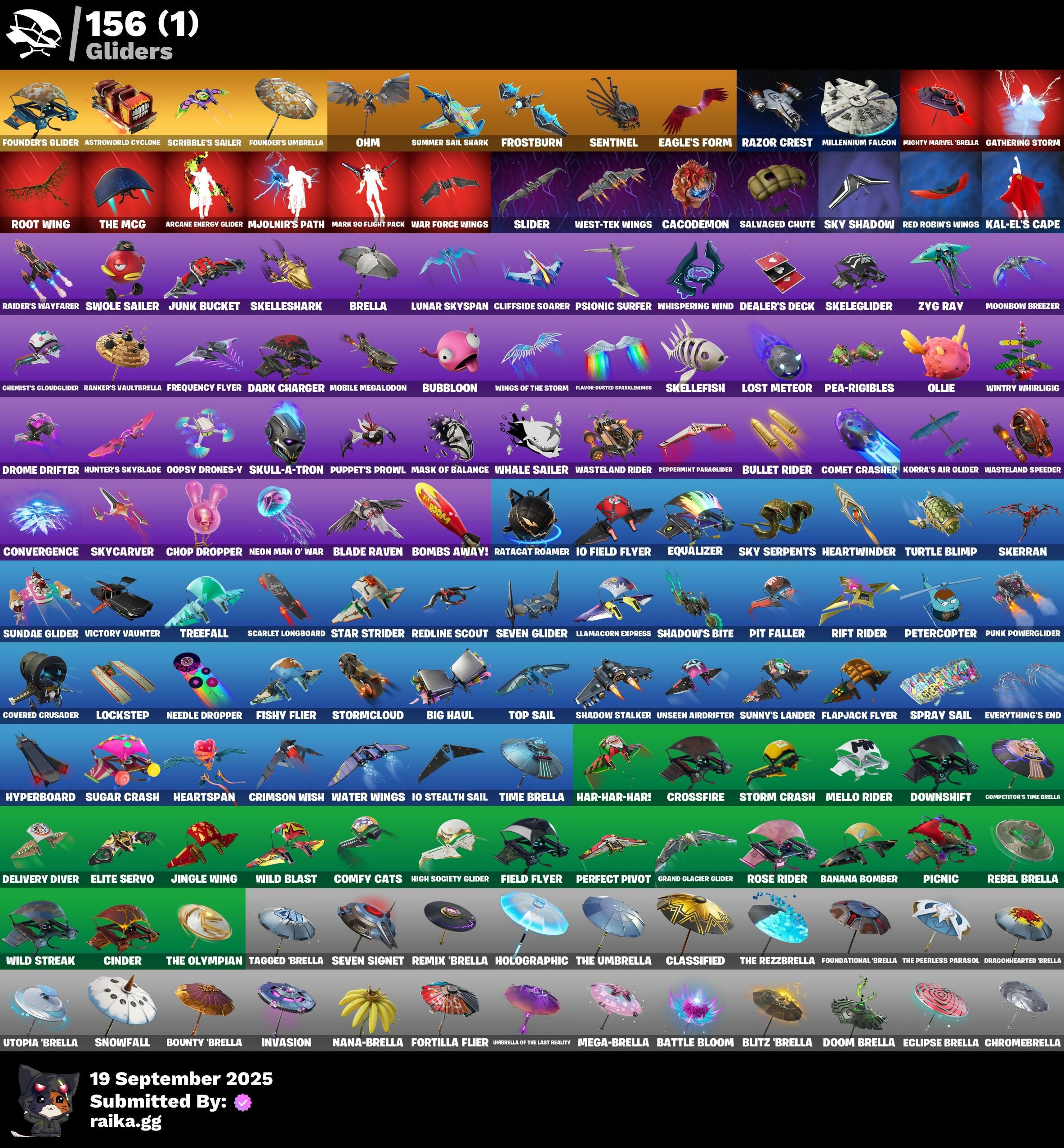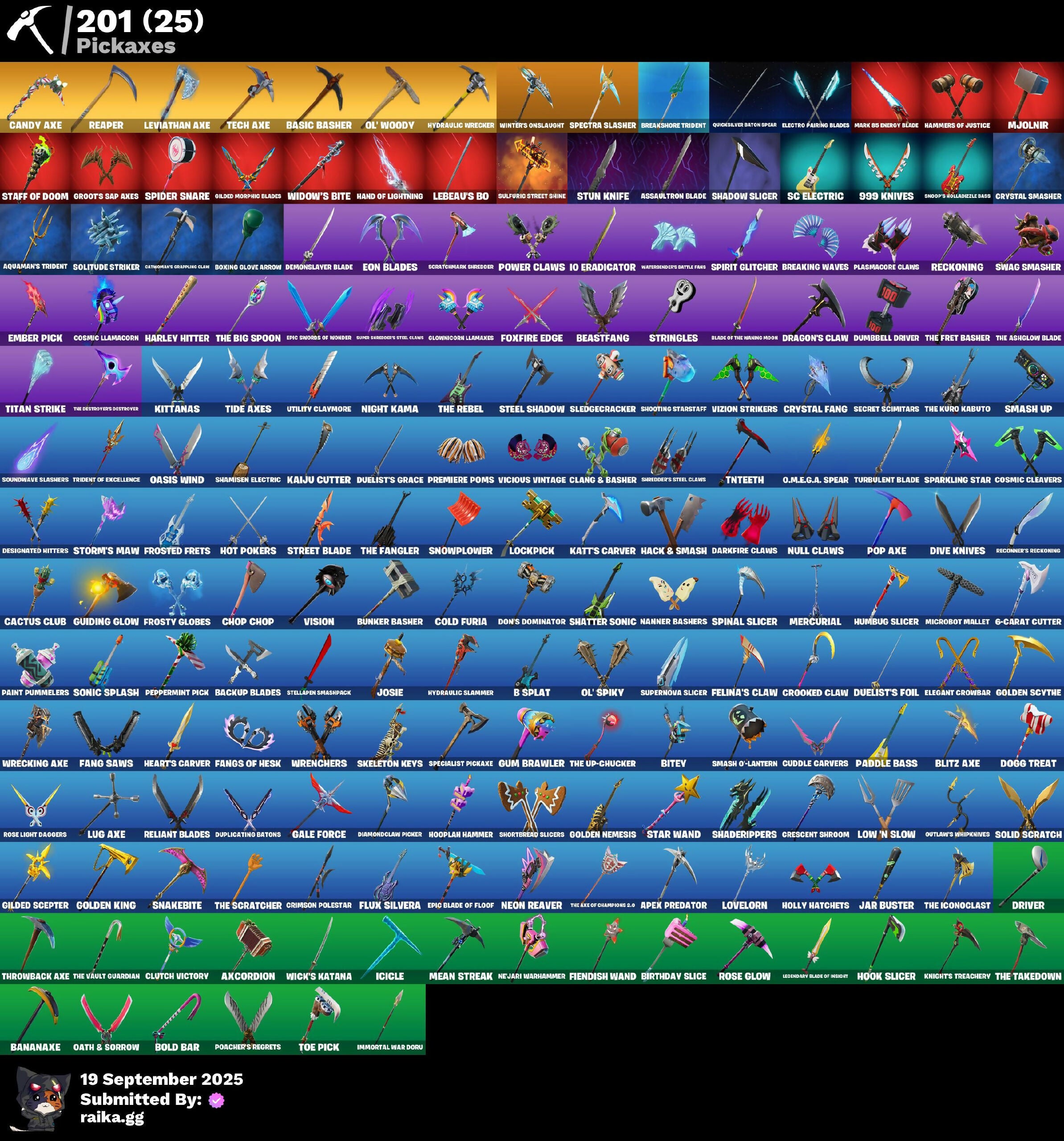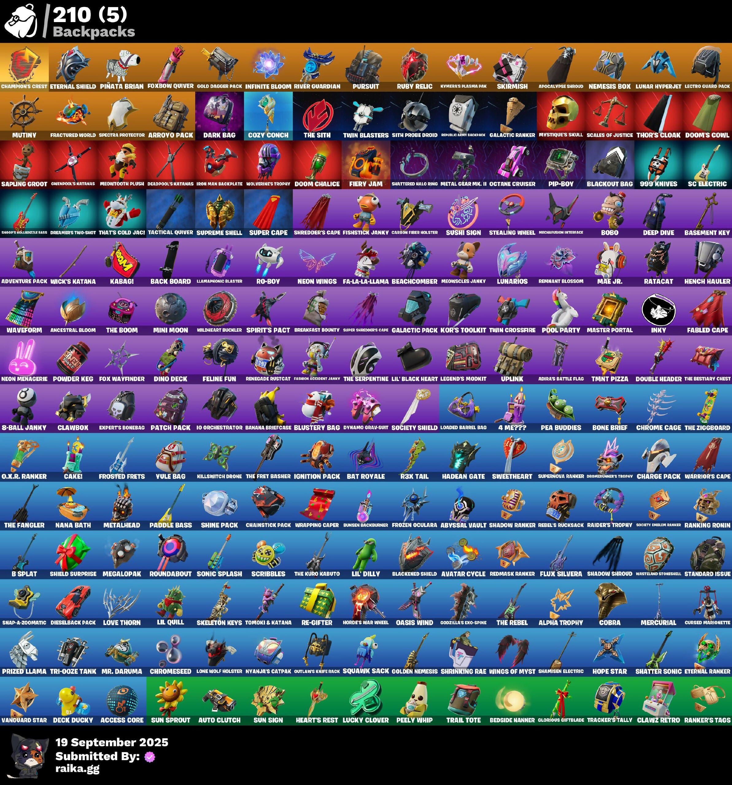 2022, 4 Me???, 6-Carat Cutter, 8-Ball Janky, 999 Knives, Aang, Abduction, Abyssal Vault, Access Core, Adira's Armor, Adira's Battle Flag, Adventure Pack, Aerial, Aerial Classic, Aerial Swagger, Afterparty, Agent Jones, Agent Nana, Agent Peely, Air Shredder, All-Nighter, Alpha Trophy, Ancestral Bloom, Apex Predator, Aphrodite, Apocalypse Shroud, Aquaman, Aquaman's Trident, Arcade Cat, Arcane Energy Glider, Arcane Steel, Arctic Adeline, Ares, Armored Victory, Arroyo Pack, Artemis Insignia, Arthur Curry, Assault Trooper, Assaultron Blade, Astro Antidote, Astro Jack, Astroworld Cyclone, Auntie Dot, Aura, Auto Clutch, Avatar Cycle, Avatar's Flourish, Axcordion, Axo's Big Moment, B Splat, B.R.U.T.E. Competitor, Back Board, Backlash, Backup Blades, Balanced, Banana Bomber, Banana Briefcase, Bananaxe, Baron Kane, Baron's Hoard, Basement Key, Basic Basher, Bat Royale, Battle Bloom, Battle Mode, Battle Prep, Battle Prep: Super, Battlehawk, Be The Mastermind, Beachcomber, Beamers, Bear Hug, Beastfang, Beat Breaker, Bedside Nanner, Beep Beep, Berserker Barrage, Bhangra Boogie, Big Haul, Billy Bounce, Birthday Slice, Bitev, Bitter Sweets, Black Ooze, Blackened Shield, Blackheart, Blackheart (Stage 8), Blackout Bag, Blade Of The Waning Moon, Blade Raven, Blasted, Blazing Fire Cerberus, Blitz 'Brella, Blitz Axe, Blizzabelle, Blocko, Blustery Bag, Bobo, Bold Bar, Bombastic Winterfest, Bombs Away!, Bone Brief, Boogie Down, Boomin', Both Eyes Open, Bounty 'Brella, Boxing Glove Arrow, Break Point Ultra, Breakfast Bounty, Breaking Waves, Breakshore Trident, Brella, Brite & Speedy, Brite Bomber, Brite Moves, Brite Raider, Brutus, Bubblegum Highwire, Bubbloon, Budge, Bullet Rider, Bunker Basher, Bunsen Backburner, Burning Ambition Valeria, Burning Dragon, Bushie Bright, Butterfly, Buttoned Up, Bytes' Sigil, Cacodemon, Cactus Club, Cake!, Cakey, Calamity, Calamity Stage 5, Calico, Call Me, Campfire, Candy Axe, Caper, Caper (Bunny), Carbide, Carbon Fiber Holster, Carbon Scarlet, Card Drop, Cash Grab, Catalyst, Catwoman's Grappling Claw, Cauldron Chill, Cerberus, Cerberus Bite, Chainstick Pack, Chalk Outline, Challenger Cerberus, Champion's Crest, Champions Crest, Chaos Directive, Charge Pack, Charlotte, Charlotte's Logo, Chef's Special, Chemist's Cloudglider, Chibi, Choice Knit, Chomp Cudd!!, Choose Naughty, Chop Chop, Chop Dropper, Choppy, Chrome Cage, Chrome Marked, Chrome Punk, Chromebrella, Chromeseed, Cinder, Clang & Basher, Classified, Clawbox, Clawz Retro, Clean Sweep, Cliffside Soarer, Cloudburst, Cluck, Clutch Victory, Cobra, Coconuts, Codsworth's Cleanup, Coin Flip, Cold Furia, Combat Giller, Comet, Comet Crasher, Comfy Cats, Competitor's Time Brella, Conga, Console Cup, Constructor, Convergence, Corrosive Stripe, Coruscant Guard, Cosmic Cleavers, Cosmic Llamacorn, Courageous Mikasa, Covered Crusader, Cowboy Chat, Cozy Conch, Crabby King, Crashed Chiller, Crazy Castle, Crescent Shroom, Crimson Polestar, Crimson Wish, Crooked Claw, Cross Your Heart, Crossfire, Crowning Achievement, Crystal Fang, Crystal Smasher, Cube, Cuddle Carvers, Cuddles' Garden, Curling Iron, Cursed, Cursed Marionette, D.C. 63, DJ Yonder, Dabstand, Daigo's Stance, Dance Mat, Dark Bag, Dark Bomber, Dark Charger, Dark Doggo, Darkfire Claws, Dawn Duelist Nisha, Deadpool, Deadpool Unmasked, Deadpool's Katanas, Dealer's Deck, Deck Ducky, Deep Dive, Delivery Diver, Demons Beware, Demonslayer Blade, Denim Destiny, Designated Hitters, Destroyer Signature, Determined Korra, Determined Renegade, Diamond Diva, Diamond Throne, Diamondclaw Picker, Dice, Dieselback Pack, Dino Deck, Dire Goat, Direct The Chaos, Diva's Grin, Dive Knives, Do The Split, Doctor Doom, Doctor Doom (God Emperor), Doctor Slone, Dog Bowl, Dogg Treat, Dolphin, Don Target, Don's Dominator, Doom Brella, Doom Chalice, Doom's Cowl, Double Draw, Double Header, Downshift, Doze Dab, Dragon Rune Lances, Dragon Spirit, Dragon Stance, Dragon's Claw, Dragonhearted 'Brella, Dreamer's Two-Shot, Drift Face, Drift Shift, Driftwood, Driver, Drome Drifter, DroneRunner's Trophy, Drones-V View, Dropout, Duck, Duelist's Grace, Duelists Foil, Dumbbell Driver, Duplicating Batons, Durr Burger, Durrr Face, Dusk Knight, Dynamic Fire, Dynamic Tintina, Dynamite, Dynamo Grav-Suit, E.G.O., Eagle's Form, Easter Egg, Eclipse Brella, Electro Pairing Blades, Elegant Crowbar, Elite Servo, Ember Pick, Emote Camo, Empress Fan Dance, Eon Blades, Epic Blade Of Floof, Epic Swords Of Wonder, Equalizer, Eren Jaeger, Eren's Faceoff, Eternal Emblem, Eternal Knight, Eternal Ranker, Eternal Shield, Everything's End, Everything's Fine, Expert's Bonebag, Expressionism, Fa-La-La-Llama, Fabled Cape, Fade, Fade Out, Fallen Love Ranger, Fan Attack, Fancy Peter Griffin, Fang Saws, Fangs Of Hesk, Fashion Accident Janky, Felina, Felina's Claw, Feline Fun, Feral Finisher, Ferocious, Field Flyer, Fiendish Wand, Fiery Flow, Fiery Jam, Final Harbinger, Fire Show, Fire V Ice, Fishbone, Fishstick Janky, Fishy Flier, Fist, Fist Bump, Flapjack Flyer, Flash of Lightning, Flashback Breakdown, Flavor-Dusted Sparklemings, Flippin' Away, Floating Island, Flood, Flux Silvera, Foil Flex, Fortilla Flier, Foundational 'Brella, Founder's Glider, Founder's Umbrella, Fox, Fox Wayfinder, Foxbow Quiver, Foxfire Edge, Fractured World, Frequency Flyer, Frostburn, Frosted, Frosted Frets, Frostwing, Frosty Globes, Frosty Glow, Frozen Oculara, Frozen Over, Fryangles, Future Goat, GG Ornament, GG Potion, GG Smiley, GG Snakes, GG Snowman, Galactic Pack, Galactic Ranker, Galaxia, Gale Force, Gathering Storm, Gear Specialist Maya, Gentleman's Dab, Get Griddy, Gg Cuddlez, Giddy-Up, Gila Classic, Gilded Heart, Gilded Morphic Blades, Gilded Scepter, Glorious Giftblade, Glowicorn Llamaxes, Go For The Goal, Goated, Godzilla's Exo-Spine, Gold Brutus, Gold Dagger Pack, Gold Meowscles, Gold Midas, Gold Touch, Golden King, Golden Nemesis, Golden Scythe, Golden Shine, Golden Wolf, Golf Clap, Good Game, Well Played, Grand Glacier Glider, Grav-Fusion, Greed, Green Ar
