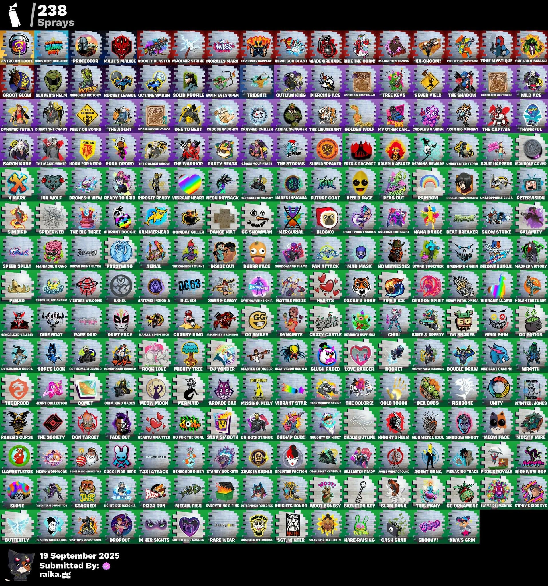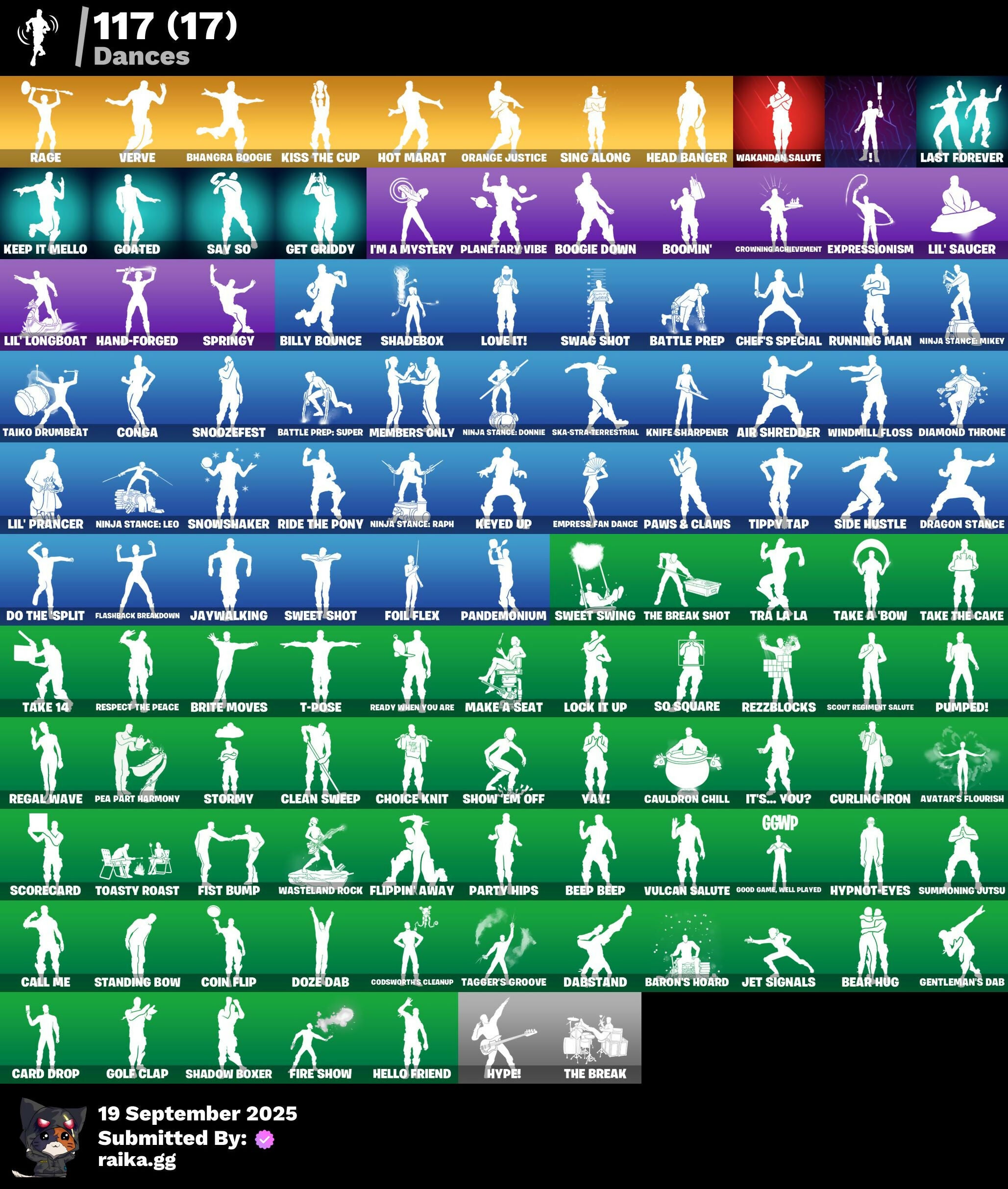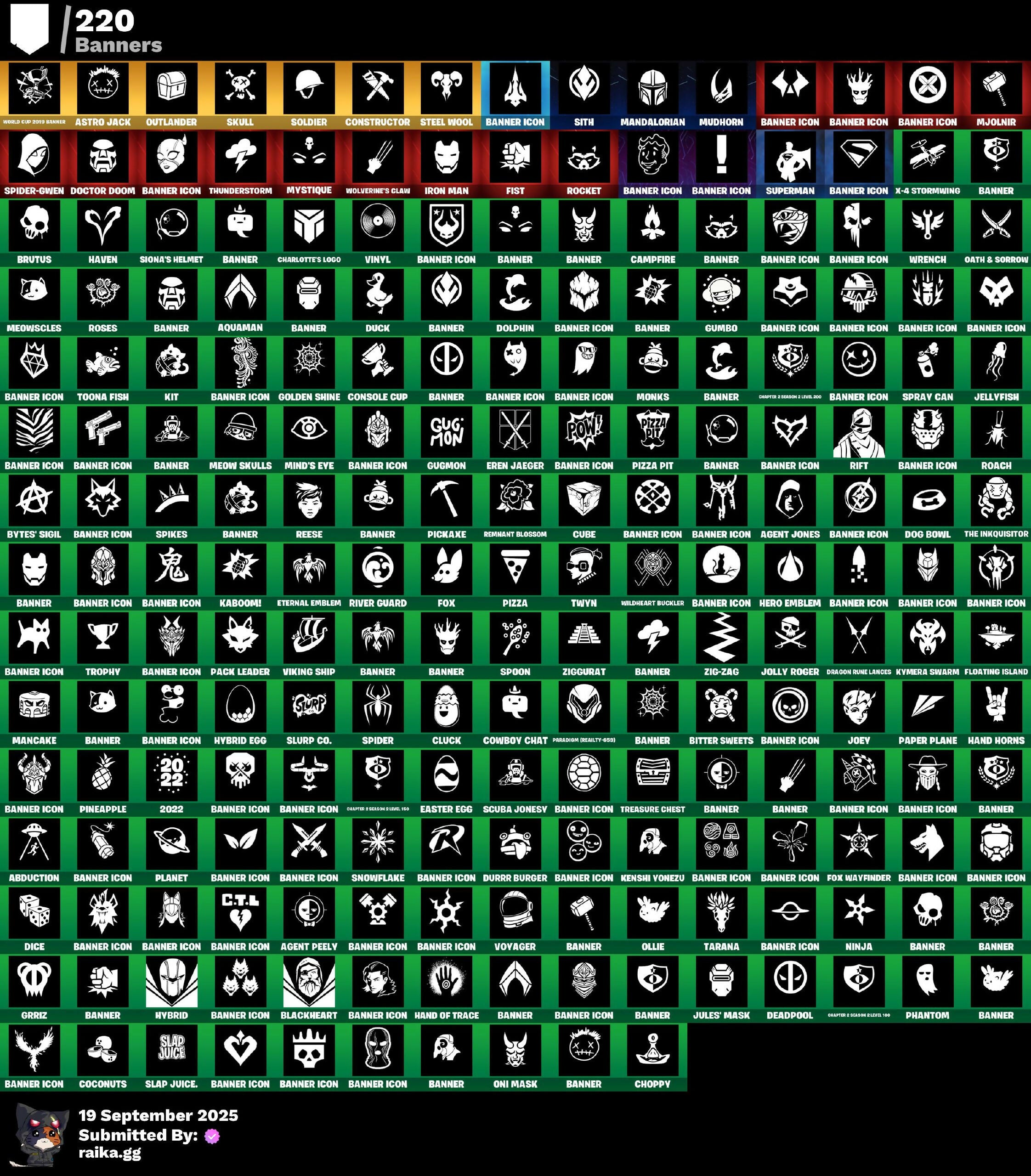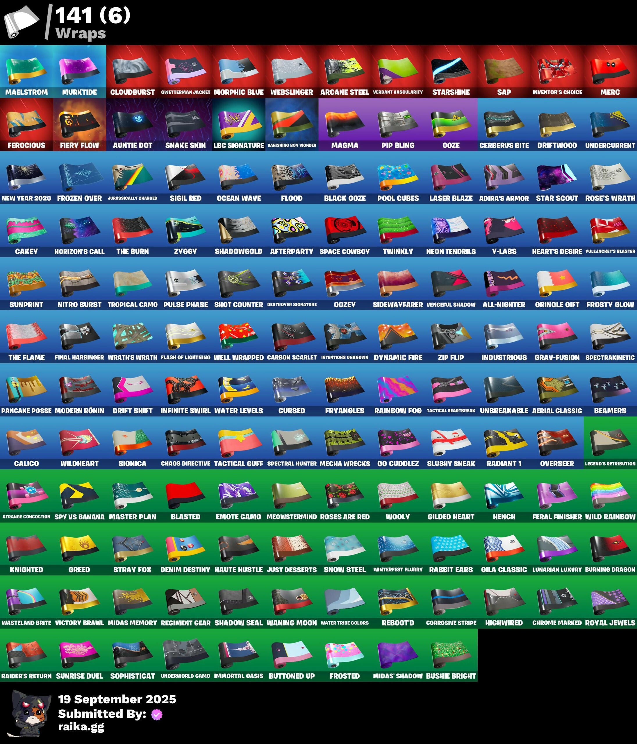 2022, 4 Me???, 6-Carat Cutter, 8-Ball Janky, 999 Knives, Aang, Abduction, Abyssal Vault, Access Core, Adira's Armor, Adira's Battle Flag, Adventure Pack, Aerial, Aerial Classic, Aerial Swagger, Afterparty, Agent Jones, Agent Nana, Agent Peely, Air Shredder, All-Nighter, Alpha Trophy, Ancestral Bloom, Apex Predator, Aphrodite, Apocalypse Shroud, Aquaman, Aquaman's Trident, Arcade Cat, Arcane Energy Glider, Arcane Steel, Arctic Adeline, Ares, Armored Victory, Arroyo Pack, Artemis Insignia, Arthur Curry, Assault Trooper, Assaultron Blade, Astro Antidote, Astro Jack, Astroworld Cyclone, Auntie Dot, Aura, Auto Clutch, Avatar Cycle, Avatar's Flourish, Axcordion, Axo's Big Moment, B Splat, B.R.U.T.E. Competitor, Back Board, Backlash, Backup Blades, Balanced, Banana Bomber, Banana Briefcase, Bananaxe, Baron Kane, Baron's Hoard, Basement Key, Basic Basher, Bat Royale, Battle Bloom, Battle Mode, Battle Prep, Battle Prep: Super, Battlehawk, Be The Mastermind, Beachcomber, Beamers, Bear Hug, Beastfang, Beat Breaker, Bedside Nanner, Beep Beep, Berserker Barrage, Bhangra Boogie, Big Haul, Billy Bounce, Birthday Slice, Bitev, Bitter Sweets, Black Ooze, Blackened Shield, Blackheart, Blackheart (Stage 8), Blackout Bag, Blade Of The Waning Moon, Blade Raven, Blasted, Blazing Fire Cerberus, Blitz 'Brella, Blitz Axe, Blizzabelle, Blocko, Blustery Bag, Bobo, Bold Bar, Bombastic Winterfest, Bombs Away!, Bone Brief, Boogie Down, Boomin', Both Eyes Open, Bounty 'Brella, Boxing Glove Arrow, Break Point Ultra, Breakfast Bounty, Breaking Waves, Breakshore Trident, Brella, Brite & Speedy, Brite Bomber, Brite Moves, Brite Raider, Brutus, Bubblegum Highwire, Bubbloon, Budge, Bullet Rider, Bunker Basher, Bunsen Backburner, Burning Ambition Valeria, Burning Dragon, Bushie Bright, Butterfly, Buttoned Up, Bytes' Sigil, Cacodemon, Cactus Club, Cake!, Cakey, Calamity, Calamity Stage 5, Calico, Call Me, Campfire, Candy Axe, Caper, Caper (Bunny), Carbide, Carbon Fiber Holster, Carbon Scarlet, Card Drop, Cash Grab, Catalyst, Catwoman's Grappling Claw, Cauldron Chill, Cerberus, Cerberus Bite, Chainstick Pack, Chalk Outline, Challenger Cerberus, Champion's Crest, Champions Crest, Chaos Directive, Charge Pack, Charlotte, Charlotte's Logo, Chef's Special, Chemist's Cloudglider, Chibi, Choice Knit, Chomp Cudd!!, Choose Naughty, Chop Chop, Chop Dropper, Choppy, Chrome Cage, Chrome Marked, Chrome Punk, Chromebrella, Chromeseed, Cinder, Clang & Basher, Classified, Clawbox, Clawz Retro, Clean Sweep, Cliffside Soarer, Cloudburst, Cluck, Clutch Victory, Cobra, Coconuts, Codsworth's Cleanup, Coin Flip, Cold Furia, Combat Giller, Comet, Comet Crasher, Comfy Cats, Competitor's Time Brella, Conga, Console Cup, Constructor, Convergence, Corrosive Stripe, Coruscant Guard, Cosmic Cleavers, Cosmic Llamacorn, Courageous Mikasa, Covered Crusader, Cowboy Chat, Cozy Conch, Crabby King, Crashed Chiller, Crazy Castle, Crescent Shroom, Crimson Polestar, Crimson Wish, Crooked Claw, Cross Your Heart, Crossfire, Crowning Achievement, Crystal Fang, Crystal Smasher, Cube, Cuddle Carvers, Cuddles' Garden, Curling Iron, Cursed, Cursed Marionette, D.C. 63, DJ Yonder, Dabstand, Daigo's Stance, Dance Mat, Dark Bag, Dark Bomber, Dark Charger, Dark Doggo, Darkfire Claws, Dawn Duelist Nisha, Deadpool, Deadpool Unmasked, Deadpool's Katanas, Dealer's Deck, Deck Ducky, Deep Dive, Delivery Diver, Demons Beware, Demonslayer Blade, Denim Destiny, Designated Hitters, Destroyer Signature, Determined Korra, Determined Renegade, Diamond Diva, Diamond Throne, Diamondclaw Picker, Dice, Dieselback Pack, Dino Deck, Dire Goat, Direct The Chaos, Diva's Grin, Dive Knives, Do The Split, Doctor Doom, Doctor Doom (God Emperor), Doctor Slone, Dog Bowl, Dogg Treat, Dolphin, Don Target, Don's Dominator, Doom Brella, Doom Chalice, Doom's Cowl, Double Draw, Double Header, Downshift, Doze Dab, Dragon Rune Lances, Dragon Spirit, Dragon Stance, Dragon's Claw, Dragonhearted 'Brella, Dreamer's Two-Shot, Drift Face, Drift Shift, Driftwood, Driver, Drome Drifter, DroneRunner's Trophy, Drones-V View, Dropout, Duck, Duelist's Grace, Duelists Foil, Dumbbell Driver, Duplicating Batons, Durr Burger, Durrr Face, Dusk Knight, Dynamic Fire, Dynamic Tintina, Dynamite, Dynamo Grav-Suit, E.G.O., Eagle's Form, Easter Egg, Eclipse Brella, Electro Pairing Blades, Elegant Crowbar, Elite Servo, Ember Pick, Emote Camo, Empress Fan Dance, Eon Blades, Epic Blade Of Floof, Epic Swords Of Wonder, Equalizer, Eren Jaeger, Eren's Faceoff, Eternal Emblem, Eternal Knight, Eternal Ranker, Eternal Shield, Everything's End, Everything's Fine, Expert's Bonebag, Expressionism, Fa-La-La-Llama, Fabled Cape, Fade, Fade Out, Fallen Love Ranger, Fan Attack, Fancy Peter Griffin, Fang Saws, Fangs Of Hesk, Fashion Accident Janky, Felina, Felina's Claw, Feline Fun, Feral Finisher, Ferocious, Field Flyer, Fiendish Wand, Fiery Flow, Fiery Jam, Final Harbinger, Fire Show, Fire V Ice, Fishbone, Fishstick Janky, Fishy Flier, Fist, Fist Bump, Flapjack Flyer, Flash of Lightning, Flashback Breakdown, Flavor-Dusted Sparklemings, Flippin' Away, Floating Island, Flood, Flux Silvera, Foil Flex, Fortilla Flier, Foundational 'Brella, Founder's Glider, Founder's Umbrella, Fox, Fox Wayfinder, Foxbow Quiver, Foxfire Edge, Fractured World, Frequency Flyer, Frostburn, Frosted, Frosted Frets, Frostwing, Frosty Globes, Frosty Glow, Frozen Oculara, Frozen Over, Fryangles, Future Goat, GG Ornament, GG Potion, GG Smiley, GG Snakes, GG Snowman, Galactic Pack, Galactic Ranker, Galaxia, Gale Force, Gathering Storm, Gear Specialist Maya, Gentleman's Dab, Get Griddy, Gg Cuddlez, Giddy-Up, Gila Classic, Gilded Heart, Gilded Morphic Blades, Gilded Scepter, Glorious Giftblade, Glowicorn Llamaxes, Go For The Goal, Goated, Godzilla's Exo-Spine, Gold Brutus, Gold Dagger Pack, Gold Meowscles, Gold Midas, Gold Touch, Golden King, Golden Nemesis, Golden Scythe, Golden Shine, Golden Wolf, Golf Clap, Good Game, Well Played, Grand Glacier Glider, Grav-Fusion, Greed, Green Ar