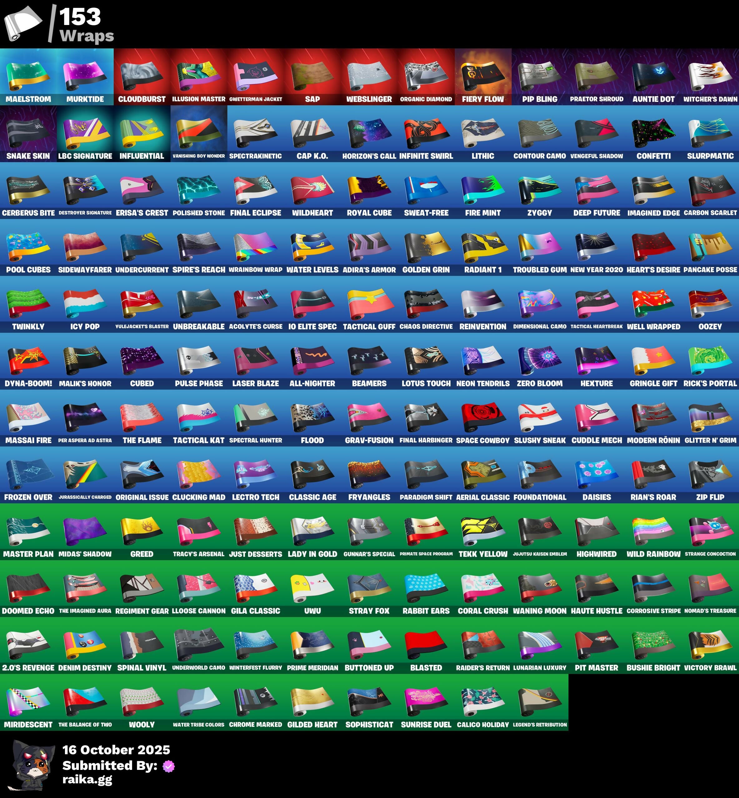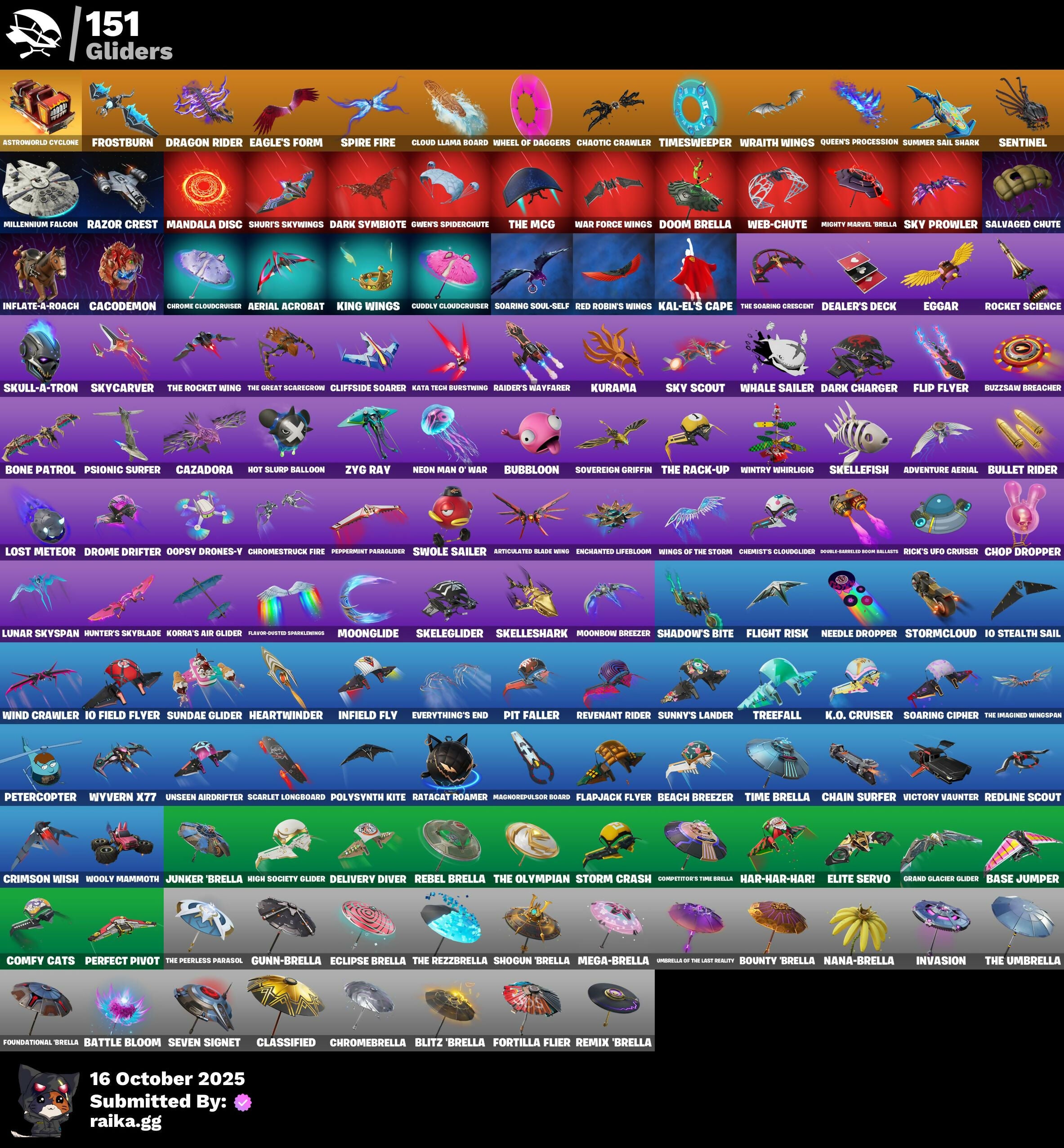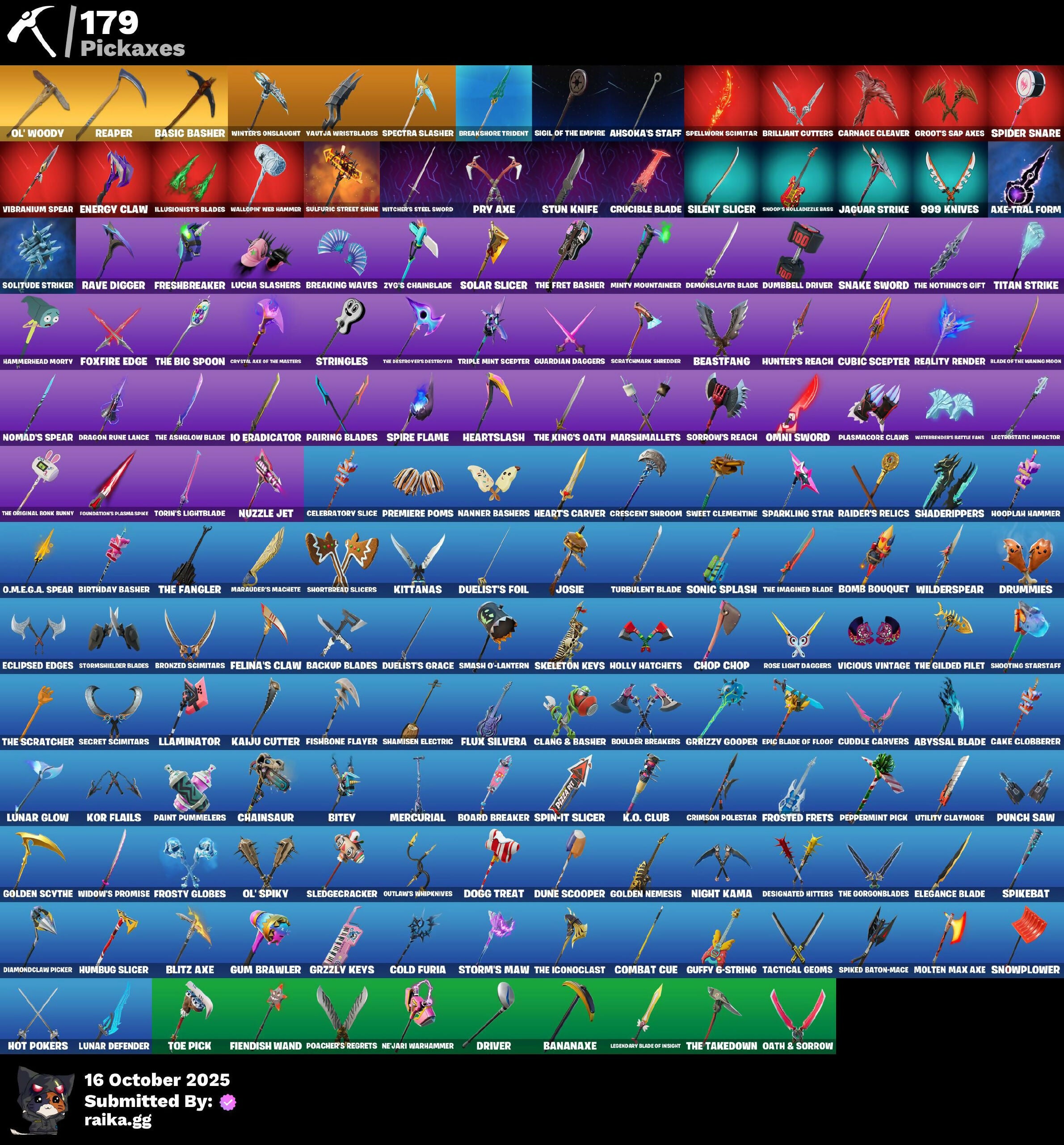 1-Ball, 2.O's Revenge, 2020 Kickflip, 4 Me???, 8-Ball Janky, 999 Knives, A.L.T.E.R., Abduction, Absenz, Abyssal Blade, Acolyte's Curse, Adira, Adira's Armor, Adira's Battle Flag, Adventure Aerial, Aerial, Aerial Acrobat, Aerial Classic, Aerial Swagger, Aftermath, Agent Jones, Agent Jones (Jump 31), Ahsoka Tano, Ahsoka's Staff, All-Nighter, Alpha Trophy, Ancestral Bloom, Antonia, Antonia In Action, Aphrodite, Apocalypse Shroud, Arachnrobatics, Arcade Cat, Arctic Adeline, Arroyo Pack, Articulated Blade Wing, Astro Armor, Astroworld Cyclone, Auntie Dot, Aurelian, Auto Clutch, Avatar's Flourish, Axe-Tral Form, Axo's Big Moment, Azarath Metrion Zinthos!, B.R.U.T.E. Competitor, Babygirl!!!, Back-Mounted Bombs Away, Backup Blades, Balance Board, Bananaxe, Baron's Hoard, Base Jumper, Basecamp Bag, Basement Key, Basic Basher, Basketball Hoop, Bat Royale, Battle Bloom, Battle Mode, Battle Ready Era, Bawk Off, Be The Mastermind, Beach Breezer, Beachcomber, Beacon Glass, Beamers, Bean Bag, Beastfang, Beatzbunny, Bedside Nanner, Beef Blade, Beep Beep, Big Guns, Birthday Basher, Birthday Bud, Birthday Dash, Bitev, Bitter Sweets, Black Hole, Blade Of The Waning Moon, Bladed Travpak, Blasted, Blitz 'Brella, Blitz Axe, Blocko, Blowin' Up, Blustery Bag, Board Breaker, Bobo, Bomb Bouquet, Bombastic Winterfest, Bone Patrol, Boogie Down, Book of Cagliostro, Boomin', Boots 'N' Cats, Both Eyes Open, Boulder Breakers, Bounty 'Brella, Brain Freeze, Breakfast Bounty, Breaking Waves, Breakshore Trident, Breezy, Brilliant Cutters, Brite Bomber, Bronzed Scimitars, Brush Your Shoulders, Bubbloon, Buffer Fish, Bullet Rider, Bun Bun Bang Bang, Bun Bun Blast, Bunsen Backburner, Bushie Bright, Butter Robot, Buttoned Up, Buzz Pack, Buzzsaw Breacher, By The Horns, Bytes, Bytes' Sigil, Cacodemon, Cake Clobberer, Calico Holiday, Calico-Coconut, Call Me, Cap K.O., Captain Jones's Shield & Panneal, Captain Llamerica, Carbon Fiber Holster, Carbon Scarlet, Cardistry, Carnage, Carnage Cleaver, Cash Grab, Cauldron Chill, Cazadora, Cazadora Wings, Celebratory Slice, Cerberus, Cerberus Bite, Chain Surfer, Chainsaur, Chalked Up 1-Ball, Chaos Directive, Chaos Director, Chaotic Crawler, Charge Pack, Charlotte, Charlotte's Logo, Chefs Special, Chemist's Cloudglider, Chimpanski Wants You, Choice Knit, Chomp Cudi!, Chop Chop, Chop Dropper, Choppy, Chrome Cloudcruiser, Chrome Marked, Chrome Punk, Chromebrella, Chromeseed, Chromestruck Fire, Chronos Lock, Clang & Basher, Clark Kent, Classic Age, Classified, Clawbox, Clawz Retro, Clean Sweep, Cliffside Soarer, Clinical Crosser, Cloud Llama Board, Cloudburst, Cluck, Cluck (Slurpy), Clucking Mad, Clutch & Dagger, Cold Furia, Collector Kado Thorne, Combat Cue, Combat Elite, Combat Giller, Comet, Comfy Cats, Competitor's Time Brella, Conch Call, Confetti, Conjure Weapon, Console Cup, Contour Camo, Controlled Chaos, Controller Crew, Coral Crush, Corrosive Stripe, Cosmic Sun, Count It!, Courageous Mikasa, Cowboy Chat, Cozy Conch, Crack It, Crashed Shield, Crescent Shroom, Crimson Crest, Crimson Polestar, Crimson Wish, Crowning Achievement, Crucible Blade, Crystal Axe Of The Masters, Cube Aether, Cube Marking, Cubed, Cubic Scepter, Cubic Vortex, Cuddle Carvers, Cuddle Mech, Cuddly Cloudcruiser, Curling Iron, Cyclo Curl, D.C. 63, Dagger Dance, Daisies, Dark Charger, Dark Side, Dark Symbiote, Darth Vader, Datafiber Chargepack, Daughter Of Trigon, Dealer's Deck, Deck Ducky, Deep Dive, Deep Future, Deimos, Delivery Diver, Demon Wind Shuriken, Demons Beware, Demonslayer Blade, Denim Destiny, Designated Hitters, Destroyer Signature, Determined Korra, Determined Renegade, Diamond Throne, Diamondclaw Picker, Dice Roll, Dimensional Camo, Dimensional Gate, Dino Deck, Direct The Chaos, Dirtbike Challenge, Diva's Grin, Division, Do The Split, Doctor Slone, Doctor Strange, Dogg Treat, Doom Brella, Doom Slayer, Doomed Echo, Double Header, Double-Barreled Boom Ballasts, Doze Dab, Dragon Radar, Dragon Rider, Dragon Rune Lance, Dragon Rune Lances, Dragon Spirit, Dramatic Flares, Dreamer's Two-Shot, Driver, Drome Drifter, Dromrunner's Trophy, Drones-V View, Droopy, Dropout, Drummies, Duelist's Foil, Duelist's Grace, Dumbbell Driver, Dumbell Driver, Dune Scooper, Dusk Knight, Dusty, Dyna-Boom!, Dynamic Tintina, Dynamo, Dynamo Grav-Suit, Dynamo Tntina, Dynamo Tntoon-A, E.G.O., Eagle's Form, Eclipse Brella, Eclipsed Edges, Eggar, Electric Shredder, Elegance Blade, Elemental Cycle, Elite Servo, Emma's Influence, Empress Fan Dance, Enchanted Lifebloom, Endless Scroll, Energy Claw, Epic Blade Of Floof, Era, Eren Jaeger, Eren's Faceoff, Erisa, Erisa Alert, Erisa's Crest, Eternal Ranker, Evasive Maneuvers, Everything's End, Everything's Fine, Evie, Expressionism, Eye Of Agamotto, Fa-La-La-Llama, Fabio Sparklemane, Fading Ember Cloak, Fan Attack, Fashion Accident Janky, Felina, Felina's Claw, Feline Dagger, Fiendish Wand, Fiery Flow, Fiery Jam, Final Eclipse, Final Harbinger, Fire Mint, Fish Hook, Fish Thicc, Fishbone Flayer, Fishstick Janky, Fizzix, Flaky Feast, Flapjack Flyer, Flashback Breakdown, Flatline, Flavor-Dusted Sprinklerlings, Flight Risk, Flip Flyer, Flippin' Away, Flood, Flux Silvera, Foil Flex, Fortilla Flier, Foundation's Mantle, Foundation's Plasma Spike, Foundational, Foundational 'Brella, Fox Wayfinder, Foxfire Edge, Fresh Aura, Freshbreaker, Frostburn, Frosted Frets, Frosty Globes, Frozen Oculura, Frozen Over, Fryangles, Fusion!, GG Snakes, Galactic Pack, Geared Up, Geralt, Geralt Of Rivia, Get Out Of Your Mind, Gila Classic, Gilded Heart, Glitter N' Grim, Glorious Gitblade, Glyph Master, Go Mufasa, Golden Grin, Golden Nemesis, Golden Scythe, Golden Wolf, Gorgon's Aegis, Grand Glacier Glider, Grav-Fusion, Greed, Griffin's Talon, Grim King Hades, Grind Bag, Gringle Gift, Groot's Sap Axes, Groovy!, Grriz, Grrizzy Gooper, Grrizzy Gunz, Grzzly Keys, Guardian Daggers, Guff Gringle, Guffy 6-String, Guffy G-String, Guggi Was Here, Guggimon, Gugmon, Gum Brawler, Gumbo, Gummy Sack, Gunn-Brella, Gunnar, Gunnar's Sp