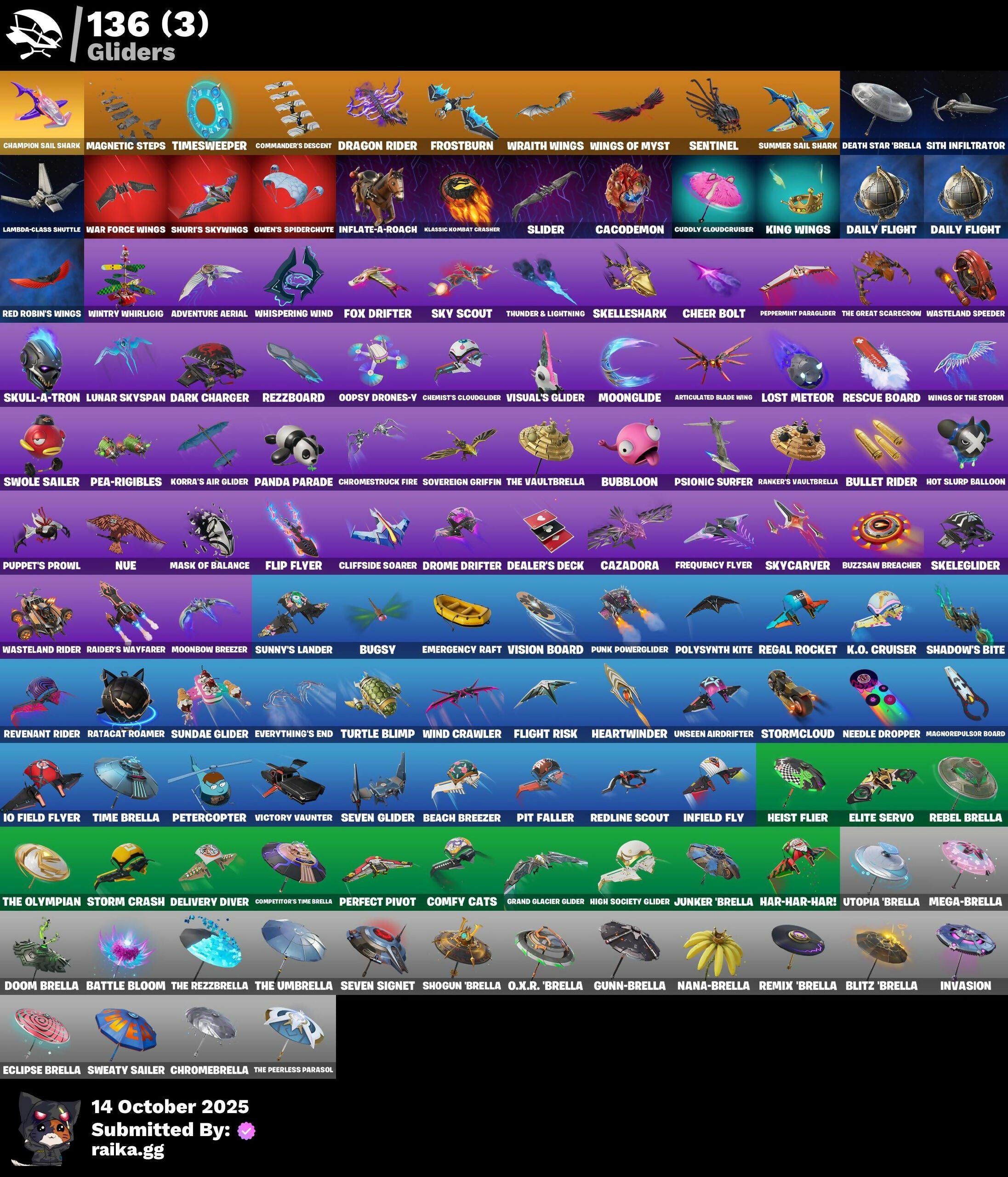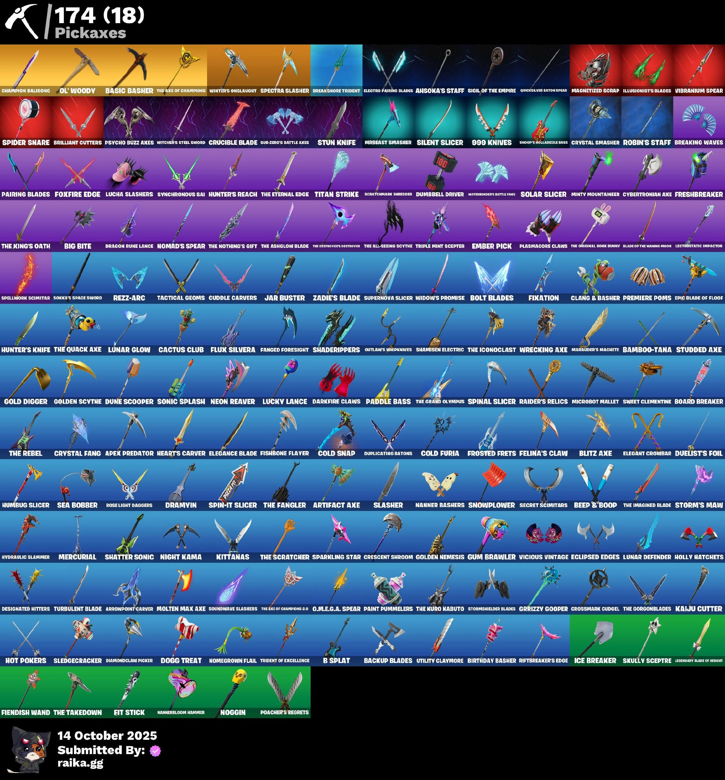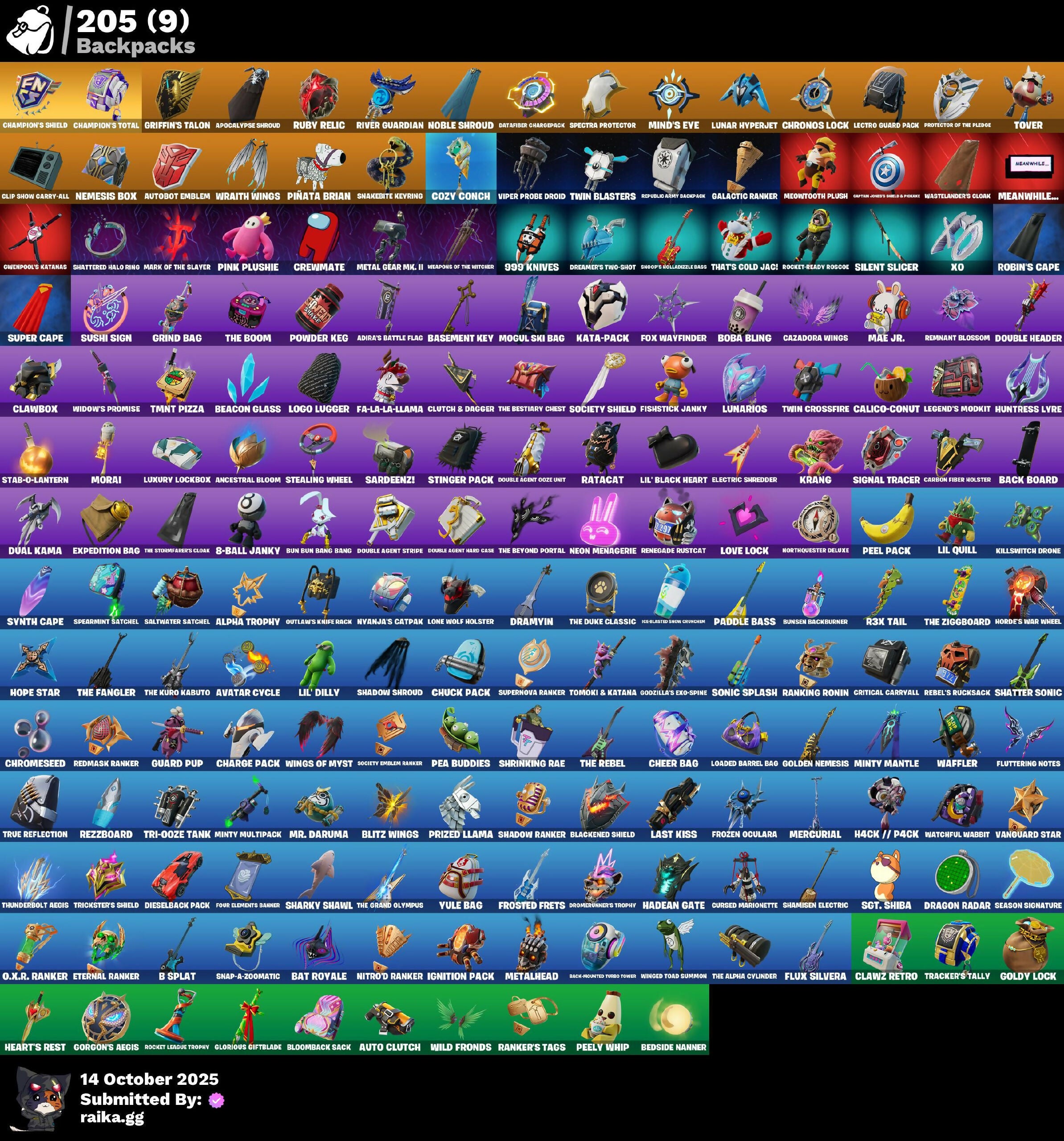 8-Ball Janky, 999 Knives, Adira, Adira (Battle Mask), Adira's Armor, Adira's Battle Flag, Adventure Aerial, Aerial, Aerial Classic, Aerial Swagger, Ahsoka's Staff, All-Nighter, Alpha Trophy, Amplitude, Ancestral Bloom, Antonia, Antonia in Action, Apex Predator, Aphrodite, Apocalypse Shroud, Appeeling Drive, Arachnrobatics, Arcade Cat, Arcane Research, Arctic Adeline, Arrowpoint Carver, Artemis, Articulated Blade Wing, Artifact Axe, Ascension Nezumi, Aspen, Astro Armor, Auntie Dot, Aura, Auto Clutch, Autobot, Autobot Emblem, Avatar Cycle, Avatar's Flourish, Axol's Big Moment, B Splat, B.R.U.T.A. Competitor, Back Board, Back-Mounted Turbo Tower, Backup Blades, Balance Board, Balanced, Bamboo-Tana, Baron Kane, Baron's Hoard, Baseball, Basement Key, Basic Basher, Bat Royale, Battle Bloom, Battle Mode, Battle Ready Era, Battle-Tested, Be The Mastermind, Beach Breezer, Beacon Glass, Bear Hug, Beast Backdrop, Beast Blastin', Beat Breaker, Beatzbunny, Bedside Nanner, Beep & Boop, Behold!, Belt It!, Big Bite, Big Fan, Big Guns, Bike To Go, Birdarang Flourish, Birthday Basher, Birthday Dash, Black Hole, Blackened Shield, Blade Of The Waning Moon, Blazing Fire Cerberus, Blitz 'Brella, Blitz Axe, Blitz Wings, Blocko, Bloomback Sack, Blowin' Up, Board Breaker, Boba Bling, Boba Snack, Bolt Blades, Bombastic Winterfest, Boneyard Brand, Boogie Down, Boosting Ki, Break Point Ultra, Breaking Point, Breaking Waves, Breakshore Trident, Brilliant Cutters, Bruteball, Bubblegum Highwire, Bubbloon, Buffer Fish, Bugsy, Bullet Rider, Bullpen Brawler Dusty, Bun Bun Bang Bang, Bun Bun Blast, Bunsen Backburner, Burning Ambition Valeria, Bushie Bright, Buttoned Up, Buzzsaw Breacher, By The Horns, Bytes, Bytes (Lone Traveler), Bytes' Sigil, C.T.L., C3S3 Contender I, C4S1 Contender I, Cacodemon, Cactus Club, Calico Holiday, Calico-Conut, Called Shot, Cap Attack, Caper, Caper (Bunny), Captain Jones's Shield & Pouncer, Captain Llamerica, Carbon Fiber Holster, Card Drop, Cauldron Chill, Cazadora, Cazadora Wings, Cerberus, Cerberus Bite, Cerberus Medallion, Challenger Cerberus, Champion Balisong, Champion Sail Shark, Champion's Celebration, Champion's Shield, Champion's Total, Chaos Directive, Chaos Double Agent, Charge Pack, Charlotte's Logo, Cheer Bag, Cheer Bolt, Chef's Special, Chemist's Cloudglider, Chigusa, Chimichanga!, Chimpanski Wants You, Choice Knit, Chomp Cudi!, Choose Naughty, Choppy, Chrome Marked, Chrome Punk, Chromebrella, Chromeseed, Chromestruck Fire, Chronos Lock, Chuck Pack, Chugga-Chugga, Clang & Basher, Claptrap, Classic Age, Clawbox, Clawz Retro, Cliffside Soarer, Clinical Crosser, Clip Show Carry-All, Club President Helsie, Clutch & Dagger, Cold Furia, Cold Snap, Collector Kado Thorne, Combat Giller, Come Get Me!, Comfy Cats, Commander's Descent, Competitor Medusa, Competitor's Time Brella, Conch Call, Console Cup, Contour Camo, Controlled Focus, Coral Crush, Corrosive Stripe, Corrosive Tag, Count It!, Courageous Mikasa, Cozy Chomps, Cozy Conch, Crack It, Crashed Chiller, Crashed Shield, Crescent Shroom, Crewmate, Crimson Elite, Critical Carryall, Cross Your Heart, Crossmark Cudgel, Crucible Blade, Crystal, Crystal Fang, Crystal Smasher, Cubed, Cuddle Carvers, Cuddles' Garden, Cuddly Cloudcruiser, Curling Iron, Cursed Marionette, Cybertronian Axe, Cyclo Curl, D.C. 63, Dagger Dance, Daigo's Stance, Daily Flight, Daisies, Dark Charger, Dark Side Rising, Darkfire Claws, Darth Shader, Darth Vader, Datafiber Chargepack, Datafier Chargepack, Dawn Duelist Nisha, Daywalker's Kata, Dealer's Deck, Death Star 'Brella, Deep Dab, Delivery Diver, Demons Beware, Designated Hitters, Destroyer Signature, Determined Korra, Determined Renegade, Diamond Throne, Diamondclaw Picker, Dice Roll, Dieselback Pack, Dire Goat, Direct the Chaos, Dirtbike Challenge, Disguise, Distraction Dance, Diva's Grin, Do The Split, Dogg Treat, Don't Start Now, Doom Brella, Doom Slayer, Double Agent Hard Case, Double Agent Hush, Double Agent Ooze Unit, Double Agent Stripe, Double Agent Wildcard, Double Header, Doze Dab, Dragon Radar, Dragon Rider, Dragon Rune Lance, Dragon Rune Lances, Dragon Spirit, Dramatic Flares, Dramvin, Dramyin, Dreamer's Two-Shot, Drift Face, Drippin' Flavor, Drome Drifter, Dromrunner's Trophy, Drones-Y View, Dual Kama, Duelist's Foil, Dumbbell Driver, Dumbell Driver, Dummy Supreme, Dune Scooper, Dupli-Kate, Duplicating Batons, Duplikates, Durrr Face, Dusk Knight, Dusty, Dynamic Tintina, Easter Egg, Echo, Eclipse Brella, Eclipsed Edges, Electric Shredder, Electro Pairing Blades, Electrostatic Impactor, Elegance Blade, Elegant Crowbar, Elemental Cycle, Elite Servo, Ember Pick, Emergency Raft, Emma's Influence, Empress Fan Dance, Ensnared, Epic Blade Of Floor, Era, Eren Jaeger, Eren's Faceoff, Erisa Alert, Escapees, Eternal Ranker, Everything's End, Evie, Evie (Summer Strider), Exile’s Emblem, Expedition Bag, Expressionism, Eye of Agamotto, Fa-La-La-Llama, Fan Attack, Fancy Peter Griffin, Fang Dance, Fanged Foresight, Felina, Felina's Claw, Feral Finisher, Fiendish Wand, Final Eclipse, Final Harbinger, Fire Mint, Fish Thicc, Fishbone Flayer, Fishstick, Fishstick Janky, Fist Bump, Fit Stick, Fixation, Fizzix, Fizzle, Flaky Feast, Flash of Lightning, Flashback Breakdown, Flight Risk, Flip Flyer, Flood, Fluttering Notes, Flux Silvera, Fncs Renegade, Focus, Foil Flex, Four Elements Banner, Fox Drifter, Fox Wayfinder, Foxfire Edge, Frequency Flyer, Fresh Aura, Freshbreaker, Frostburn, Frosted Frets, Frozen Oculata, Frozen Over, Fully Charged Drift, Fusion!, Future Goat, G1 Optimus Prime, GG Cuddlez, Galactic Ranker, Galactic Roundel, Geralt, Geralt Of Rivia, Get Griddy, Gila, Gila Classic, Gilded Heart, Glorious Giftblade, Godzilla's Exo-Spine, Gold Digger, Golden Goal, Golden Nemesis, Golden Scythe, Golden Wolf, Goldy Lock, Good Guy, Gorgon's Aegis, Gothic Morgan, Grand Glacier Glider, Griffin's Talon, Grim Grin, Grim King Hades, Grind Bag, Gringle Gift, Grizzly Gooper, Groovy!, Grriz, Grrrrzzy Gunz, Grrz, Guard Pup, Gug