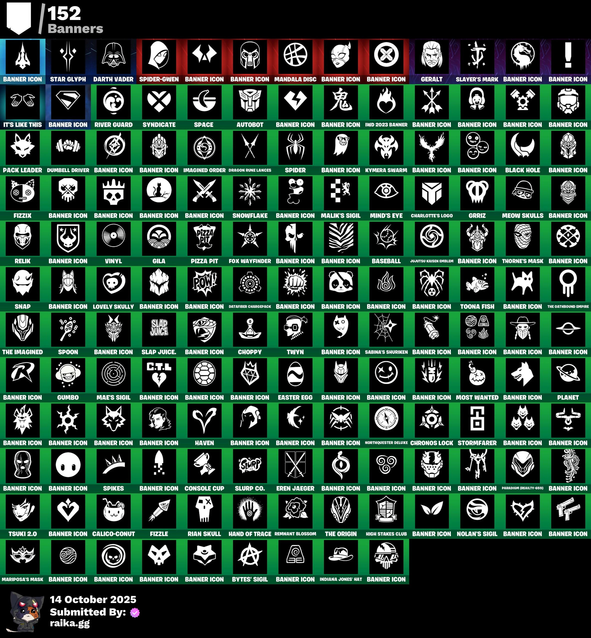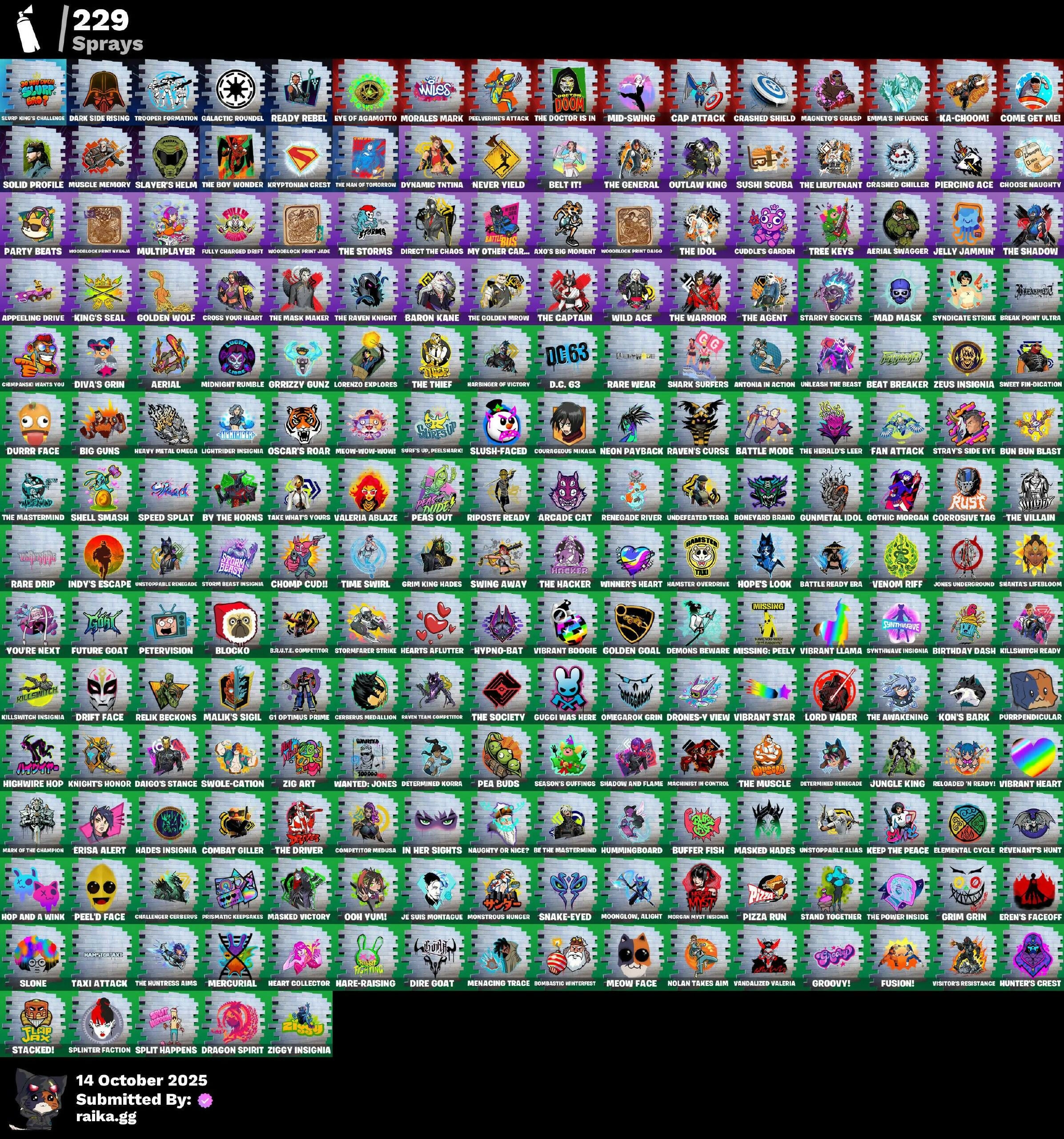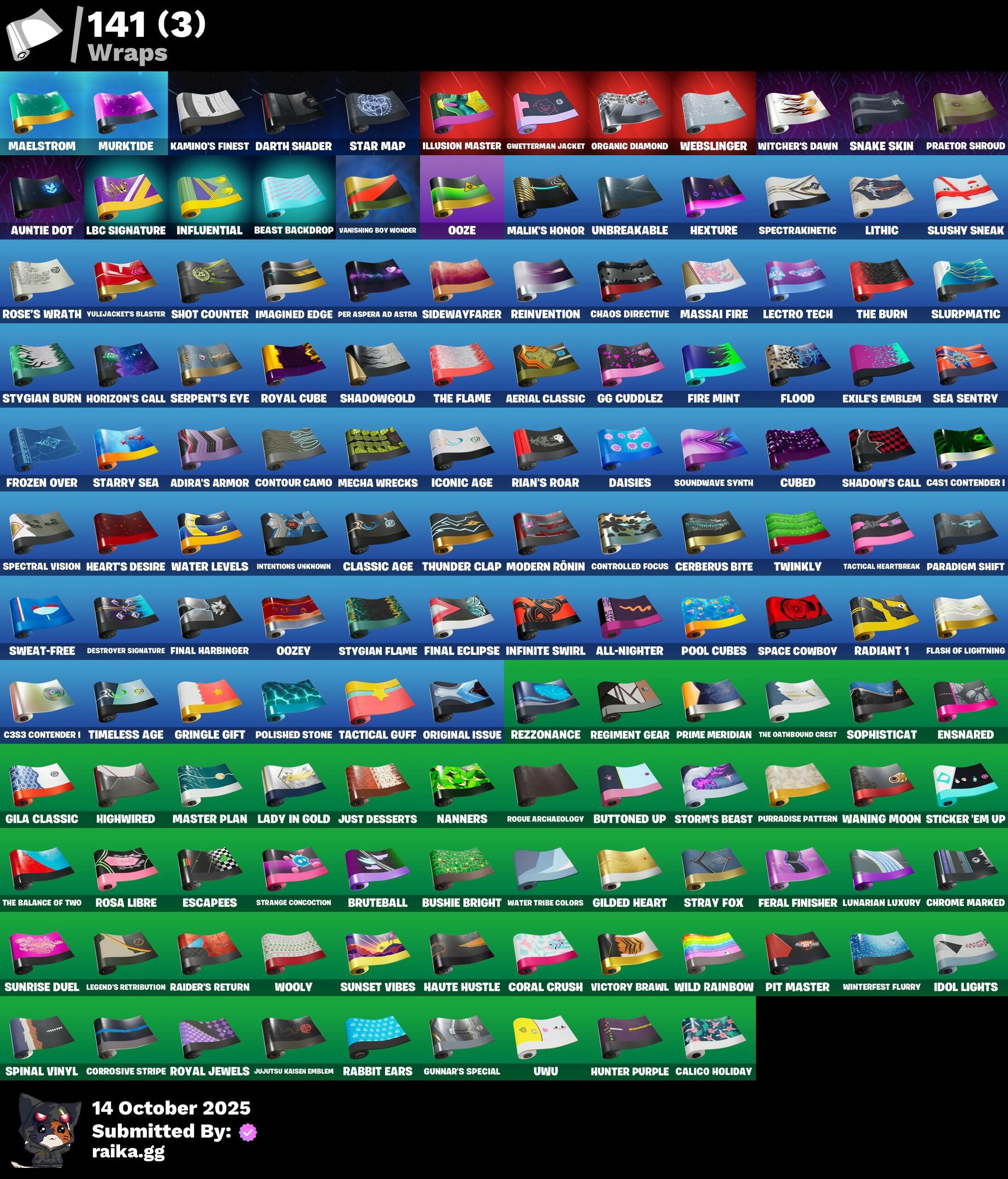 8-Ball Janky, 999 Knives, Adira, Adira (Battle Mask), Adira's Armor, Adira's Battle Flag, Adventure Aerial, Aerial, Aerial Classic, Aerial Swagger, Ahsoka's Staff, All-Nighter, Alpha Trophy, Amplitude, Ancestral Bloom, Antonia, Antonia in Action, Apex Predator, Aphrodite, Apocalypse Shroud, Appeeling Drive, Arachnrobatics, Arcade Cat, Arcane Research, Arctic Adeline, Arrowpoint Carver, Artemis, Articulated Blade Wing, Artifact Axe, Ascension Nezumi, Aspen, Astro Armor, Auntie Dot, Aura, Auto Clutch, Autobot, Autobot Emblem, Avatar Cycle, Avatar's Flourish, Axol's Big Moment, B Splat, B.R.U.T.A. Competitor, Back Board, Back-Mounted Turbo Tower, Backup Blades, Balance Board, Balanced, Bamboo-Tana, Baron Kane, Baron's Hoard, Baseball, Basement Key, Basic Basher, Bat Royale, Battle Bloom, Battle Mode, Battle Ready Era, Battle-Tested, Be The Mastermind, Beach Breezer, Beacon Glass, Bear Hug, Beast Backdrop, Beast Blastin', Beat Breaker, Beatzbunny, Bedside Nanner, Beep & Boop, Behold!, Belt It!, Big Bite, Big Fan, Big Guns, Bike To Go, Birdarang Flourish, Birthday Basher, Birthday Dash, Black Hole, Blackened Shield, Blade Of The Waning Moon, Blazing Fire Cerberus, Blitz 'Brella, Blitz Axe, Blitz Wings, Blocko, Bloomback Sack, Blowin' Up, Board Breaker, Boba Bling, Boba Snack, Bolt Blades, Bombastic Winterfest, Boneyard Brand, Boogie Down, Boosting Ki, Break Point Ultra, Breaking Point, Breaking Waves, Breakshore Trident, Brilliant Cutters, Bruteball, Bubblegum Highwire, Bubbloon, Buffer Fish, Bugsy, Bullet Rider, Bullpen Brawler Dusty, Bun Bun Bang Bang, Bun Bun Blast, Bunsen Backburner, Burning Ambition Valeria, Bushie Bright, Buttoned Up, Buzzsaw Breacher, By The Horns, Bytes, Bytes (Lone Traveler), Bytes' Sigil, C.T.L., C3S3 Contender I, C4S1 Contender I, Cacodemon, Cactus Club, Calico Holiday, Calico-Conut, Called Shot, Cap Attack, Caper, Caper (Bunny), Captain Jones's Shield & Pouncer, Captain Llamerica, Carbon Fiber Holster, Card Drop, Cauldron Chill, Cazadora, Cazadora Wings, Cerberus, Cerberus Bite, Cerberus Medallion, Challenger Cerberus, Champion Balisong, Champion Sail Shark, Champion's Celebration, Champion's Shield, Champion's Total, Chaos Directive, Chaos Double Agent, Charge Pack, Charlotte's Logo, Cheer Bag, Cheer Bolt, Chef's Special, Chemist's Cloudglider, Chigusa, Chimichanga!, Chimpanski Wants You, Choice Knit, Chomp Cudi!, Choose Naughty, Choppy, Chrome Marked, Chrome Punk, Chromebrella, Chromeseed, Chromestruck Fire, Chronos Lock, Chuck Pack, Chugga-Chugga, Clang & Basher, Claptrap, Classic Age, Clawbox, Clawz Retro, Cliffside Soarer, Clinical Crosser, Clip Show Carry-All, Club President Helsie, Clutch & Dagger, Cold Furia, Cold Snap, Collector Kado Thorne, Combat Giller, Come Get Me!, Comfy Cats, Commander's Descent, Competitor Medusa, Competitor's Time Brella, Conch Call, Console Cup, Contour Camo, Controlled Focus, Coral Crush, Corrosive Stripe, Corrosive Tag, Count It!, Courageous Mikasa, Cozy Chomps, Cozy Conch, Crack It, Crashed Chiller, Crashed Shield, Crescent Shroom, Crewmate, Crimson Elite, Critical Carryall, Cross Your Heart, Crossmark Cudgel, Crucible Blade, Crystal, Crystal Fang, Crystal Smasher, Cubed, Cuddle Carvers, Cuddles' Garden, Cuddly Cloudcruiser, Curling Iron, Cursed Marionette, Cybertronian Axe, Cyclo Curl, D.C. 63, Dagger Dance, Daigo's Stance, Daily Flight, Daisies, Dark Charger, Dark Side Rising, Darkfire Claws, Darth Shader, Darth Vader, Datafiber Chargepack, Datafier Chargepack, Dawn Duelist Nisha, Daywalker's Kata, Dealer's Deck, Death Star 'Brella, Deep Dab, Delivery Diver, Demons Beware, Designated Hitters, Destroyer Signature, Determined Korra, Determined Renegade, Diamond Throne, Diamondclaw Picker, Dice Roll, Dieselback Pack, Dire Goat, Direct the Chaos, Dirtbike Challenge, Disguise, Distraction Dance, Diva's Grin, Do The Split, Dogg Treat, Don't Start Now, Doom Brella, Doom Slayer, Double Agent Hard Case, Double Agent Hush, Double Agent Ooze Unit, Double Agent Stripe, Double Agent Wildcard, Double Header, Doze Dab, Dragon Radar, Dragon Rider, Dragon Rune Lance, Dragon Rune Lances, Dragon Spirit, Dramatic Flares, Dramvin, Dramyin, Dreamer's Two-Shot, Drift Face, Drippin' Flavor, Drome Drifter, Dromrunner's Trophy, Drones-Y View, Dual Kama, Duelist's Foil, Dumbbell Driver, Dumbell Driver, Dummy Supreme, Dune Scooper, Dupli-Kate, Duplicating Batons, Duplikates, Durrr Face, Dusk Knight, Dusty, Dynamic Tintina, Easter Egg, Echo, Eclipse Brella, Eclipsed Edges, Electric Shredder, Electro Pairing Blades, Electrostatic Impactor, Elegance Blade, Elegant Crowbar, Elemental Cycle, Elite Servo, Ember Pick, Emergency Raft, Emma's Influence, Empress Fan Dance, Ensnared, Epic Blade Of Floor, Era, Eren Jaeger, Eren's Faceoff, Erisa Alert, Escapees, Eternal Ranker, Everything's End, Evie, Evie (Summer Strider), Exile’s Emblem, Expedition Bag, Expressionism, Eye of Agamotto, Fa-La-La-Llama, Fan Attack, Fancy Peter Griffin, Fang Dance, Fanged Foresight, Felina, Felina's Claw, Feral Finisher, Fiendish Wand, Final Eclipse, Final Harbinger, Fire Mint, Fish Thicc, Fishbone Flayer, Fishstick, Fishstick Janky, Fist Bump, Fit Stick, Fixation, Fizzix, Fizzle, Flaky Feast, Flash of Lightning, Flashback Breakdown, Flight Risk, Flip Flyer, Flood, Fluttering Notes, Flux Silvera, Fncs Renegade, Focus, Foil Flex, Four Elements Banner, Fox Drifter, Fox Wayfinder, Foxfire Edge, Frequency Flyer, Fresh Aura, Freshbreaker, Frostburn, Frosted Frets, Frozen Oculata, Frozen Over, Fully Charged Drift, Fusion!, Future Goat, G1 Optimus Prime, GG Cuddlez, Galactic Ranker, Galactic Roundel, Geralt, Geralt Of Rivia, Get Griddy, Gila, Gila Classic, Gilded Heart, Glorious Giftblade, Godzilla's Exo-Spine, Gold Digger, Golden Goal, Golden Nemesis, Golden Scythe, Golden Wolf, Goldy Lock, Good Guy, Gorgon's Aegis, Gothic Morgan, Grand Glacier Glider, Griffin's Talon, Grim Grin, Grim King Hades, Grind Bag, Gringle Gift, Grizzly Gooper, Groovy!, Grriz, Grrrrzzy Gunz, Grrz, Guard Pup, Gug