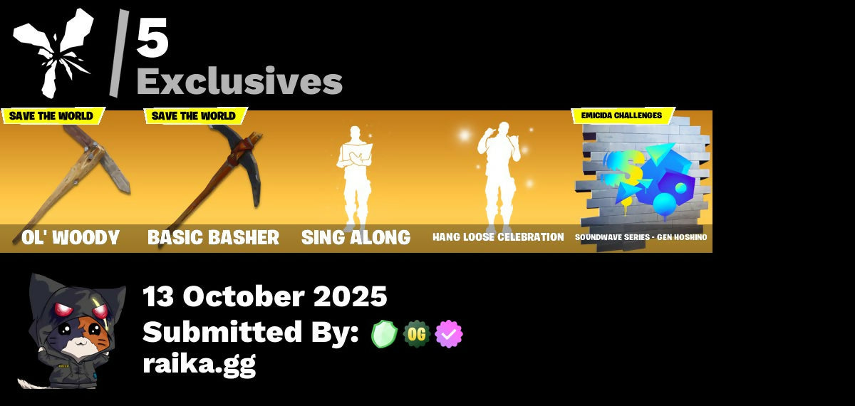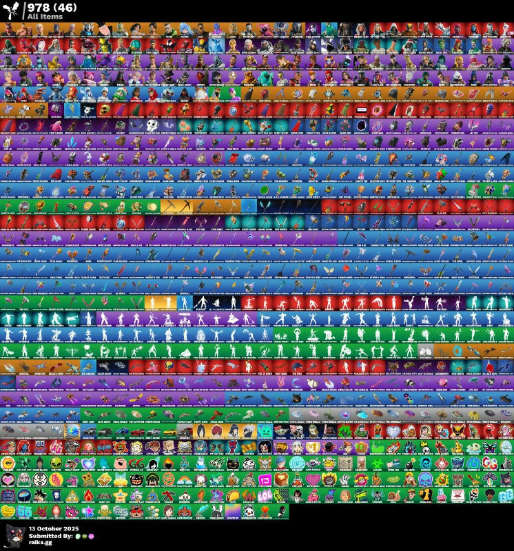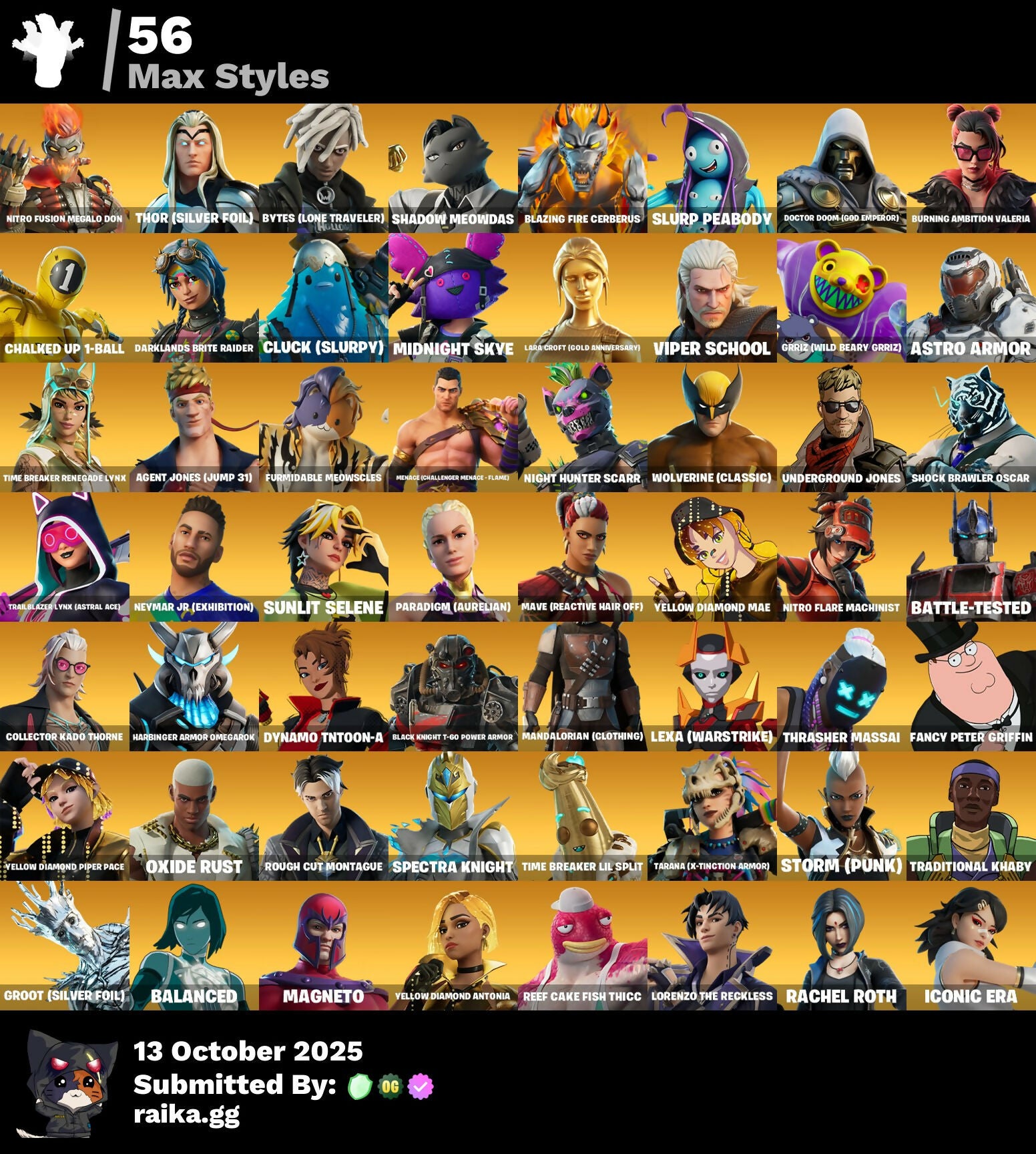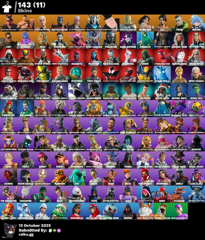 AAHO, AHSOKA TANO, APHRODITE, AQUARI STATE AAHO, ARCTIC ADELINE, ASTRO ARMOR, Agent Jones (Jump 31), BACKLIGHT PD FCH RIGOR, BALANCED, BATTLE-LOONY TIMBERS, BATTLE-TESTED, BEAST BOY, BOOTS DOGS DOG DOGS, BRANDON BRIGHEIMER, Basic Basher, Black Knight T-60 Power Armor, Blazing Fire Cerberus, Burning Ambition Valeria, Bytes (Lone Traveler), CAPTAIN JONES, CHAMPION OF PEACE, CHAOS DIRECTOR, CHROME PUNK, CLACKER KEYSON HOLDLESS, CLUCK (SLURPY), COLLECTING DOG BONES, CROSSING AND CYRIL VLADIM, CUCCIMON, Chalked Up 1-Ball, Collector Kado Thorne, DAH, DARK BOMBER, DEADPOOL (GEE & GIK), DEIMOS, DIAMOND DIVA, DINO-MITE MINE, DOOM, DUSTY, Dark Voyager, Darklands Brite Raider, Doctor Doom (God Emperor), Dynamo Tntoon-A, EMMA FROST, FAMILY PETER GRIFFIN, FELINA, FROST CAVE MONTANARIUS, FROST SQUAD, Fancy Peter Griffin, Furmidable Meowscles, GIDEON (HAVOC ALERT), GWENPOOL, Goku, Gold Midas, Groot (Silver Foil), Grriz (Wild Beary Grriz), HAKSAUR, HOLIDAY BOXY, HOPE, Hang Loose Celebration, Harbinger Armor Omegarok, ICONIC ERA, IRON MAN ZERO, Iggy Azalea, JENNIFER WALTERS, JENNY ROMASHKA, JOEY, John Wick, KONDOR, KRISABELLE, LADY MELEE SKIRMISH, LANA LLANE, LENNOX-ROSE, LEXA (WARSTRIKE), LINDEN (DANGEROUS), LOW-RANK TOURNAMENT PATCH, Lara Croft, Lara Croft (Gold Anniversary), Lorenzo The Reckless, MAGNETO, MANGAKE, MARIPOSA, MECHA TEAM LEADER, MEDUSA, MEOW ORDINARY, MEOW SKULLS, MIDAS REX, MIDNIGHT SKYE, MYSTERIO, MYSTIQUE, Mandalorian (Clothing), Master Chief, Mave (Reactive Hair Off), Menace (Challenger Menace - Flame), Meowscles, NEZUMI, NISHA, NOLAN CHANGE, Naruto, Neymar Jr (Exhibition), Night Hunter Scarr, Nitro Flare Machinist, Nitro Fusion Megalo Don, OROOT (SILVERFORCE), OXIDE RUST, Ol' Woody, PEELVERINE, PERFECT SHADOW, POISON IVY, POLAR PEELY, POSEIDON, PREDATOR, Paradigm (Aurelian), Peter Griffin, RACHEL ROTH, RANDOM MR. AND MR. DISNEY, RAZ, REESE, RELIK, RIAN, RUBY, RUNAWAY RACER, RYMERA, Reef Cake Fish Thicc, Rick Sanchez, Rough Cut Montague, SAGE, SANTA DOGG, SEEKER, SHADOW SKULLY, SHADOWBIRD, SHINJI, SILAS HESK, SILVER JUICE WRLD, SKULL SCOUT, SLED READY GUFF, SLUDGE PEABODY, SNOWMANDO, SOLID SNAKE, SPECTRA KNIGHT, SPIDER-GWEN, SPIDER-MAN ZERO, SPIRE ASSASSIN, STORM (PUNK), SUNNY, Shadow Meowdas, Shock Brawler Oscar, Sing Along, Slurp Peabody, Soundwave Series - Gen Hoshino, Sunlit Selene, THE CAFEERS TRICK, THE JOKER, THE OPERATOR, THE REAPER, THEGREG, THOR (GLIDER V01), THRASHER MASSAI, TONY STARK, TRACE, TRADITIONAL KHARY, TWYN, Tarana (X-Tinction Armor), Thor (Silver Foil), Time Breaker Lil Split, Time Breaker Renegade Lynx, Traditional Khaby, Trailblazer Lynx (Astral Ace), Travis Scott, Underground Jones, VENOM (MARVEL SERIES), VIPER SCHOOL, VIPERSON TRAX, VULJAKET, WAR MACHINE, WOLVERINE (CLASSIC), WOLVERINE (OLD PATCH), Wonder Man, Yellow Diamond Antonia, Yellow Diamond Mae, Yellow Diamond Piper Pace, ZEUS, ZYG