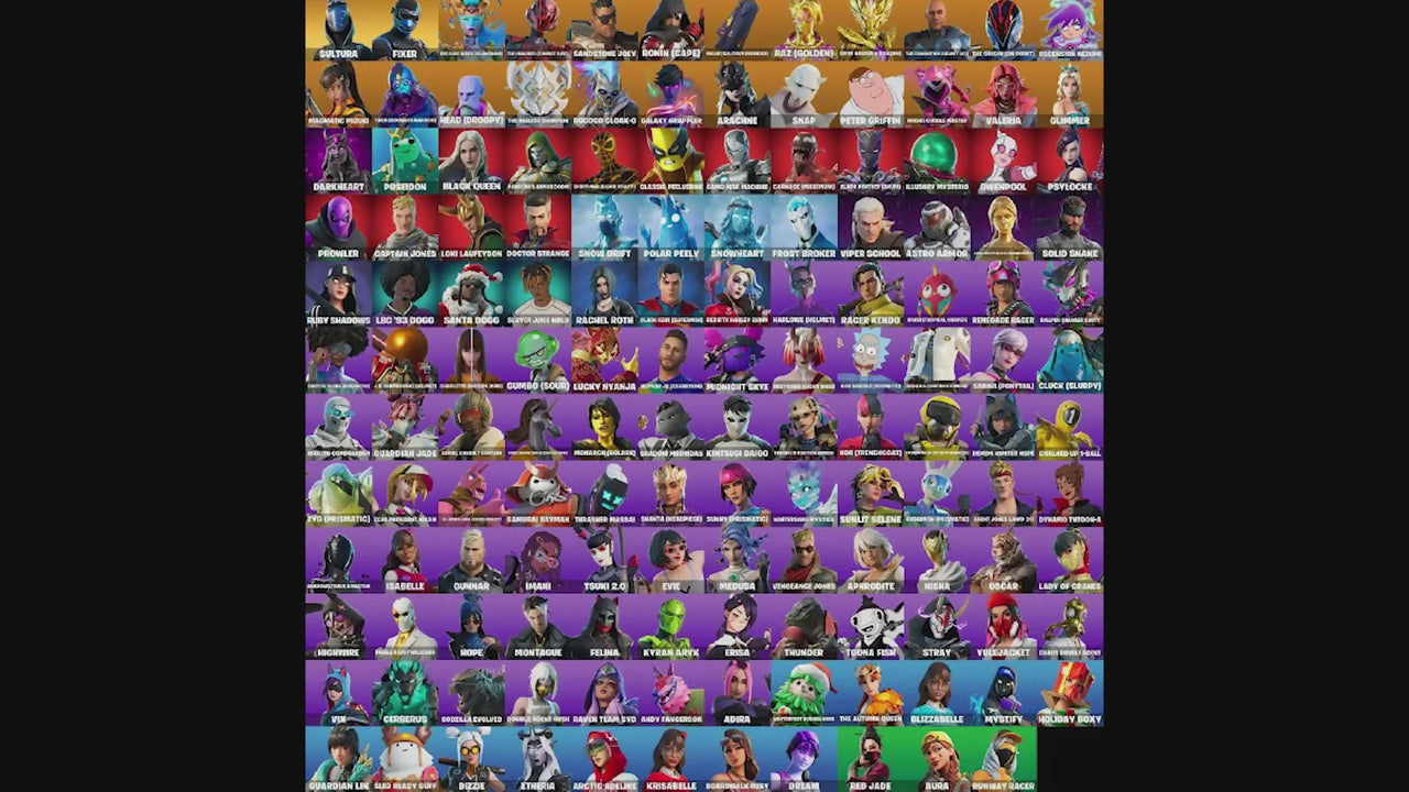Adira, Aerial Assault Captain, Aerial Assault Trooper, Agent, Agent Jones (Jump 31), Agent Jones Lava 2.0, Andy Fang-Person, Aphrodite, Arachne, Arctic Adeline, Armadillo, Ascension Nezumi, Astro Armor, Aura, Azuki, Beguiler, Bhangra Boogie, Black Panther (Shuri), Black Queen, Blizzabelle, Blue Frontier (South), Blue Viper, Boardwalk Busby, Brazilian Renegade, Brutus, Bullpen Brawler Dusty, Cameo vs Chic, Camo War Machine, Captain Jones, Carnage (Maximum), Cerberus, Chalked Up 1-Ball, Chaos Bounty Agent, Charlotte (Golden Rune), Chilled Up 1-Ball, Clan Resident Luis, Clark Kent (Superman), Classic (Maximum), Classic Peelverine, Classic Pullover, Club President Helsie, Cluck (Slurpy), Cobalt Overdrive, Codename ELF, Cymitar, Dahlia, Daredevil, Daring Fire Machine, Darkheart, Death Harley Quinn, Demon Hunter Hope, Demon Hunter Noir, Diamond Diva, Dizzie, Doctor Slone (Prismatic), Doctor Strange, Dominator, Doomed Affair, Double Agent Mako, Double Agent Noir, Dream, Dunnar, Dynamo Tinted-1, Dynamo Tntoon-A, Erisa, Etheria, Evie, FNCS Fit, Fabio Sparklemane (Golden Rune), Felina, Fixer, Frost Broker, Galaxy Grappler, General Supreme, Glimmer, Godzilla Evolved, Guardian Jade, Guardian Lin, Guggimon (Prismatic), Gumbo (Sour), Gundam (Prismatic), Gwenpool, Hang Loose Celebration, Harlowe (Helmet), Harrow’s Arrow Dome, Haven (Tropical Chirper), Head (Droopy), Heart-Rizon, Hex Code, Highwire, Holiday Boxy, Hope, Hot Rider Esteban, Hybrid, I'm Diamond, Illusory Mysterio, Imah, Isabelle, It's Dynamite!, J.B. Chimpanski, J.B. Chimpanski (Helmet), Kiara K.O. (Captain's Bomber), Kintsugi Daigo, Kor (Trenchcoat), Krisabelle, Kyvan Arvk, LBC ‘93 Dogg, Lady of Graves, Lara Croft, Lara Croft (Gold Anniversary), Laugh It Up, Light Burst, Loki Laufeyson, Lt. Evergreen, Lt. John Llama, Lt. John Llama (Gilded Reality), Lucky Hyanja, Lucky Nyanja, Luxe, Magmatic Mizuki, Magmatic Phizzur, Malik (Solitary Defender), Manic, Marvin (Don’t Tell), Mave, Medusa, Menace, Meowscles, Midnight Skye, Minty Z Patrol, Monarch (Golden), Montague, Moon Raider (Golden), Mystery, Neon Redline Justice, Neymar Jr (Exhibition), Nisha, Nor (Trenchcoat), Oscar, Otherworld, Pandora's Armor Doom, Peter Griffin, Pixie Patroller, Polar Peely, Polygon, Poseidon, Prowler, Psylocke, Racer Kendo, Rachel Roth, Raven Team Syd, Raz (Golden), Red Jade, Regession Medium, Renegade Racer, Renegade Raider, Restored Night Rose, Rick Sanchez (Prismatic), Rock Star Renegade, Rococo Cloak-O, Rodogg Cloak, Rolling Glyphs, Ronin (Cape), Round Table Offense, Rox, Ruby Shadows, Runway Racer, Rust Bucket, Ruthless Exile, Sabina, Sabina (Ponytail), Samurai Baymax, Sandstone Joey, Santa (Nerdegeic), Santa Dogg, Savvy Juice Hulk, Scarlet, Scuba Jonesy, Sergeant Winter, Shadow Meowdas, Shadow Mordidas, Shadowstruck Director, Shanta, Shanta (Headpiece), Sidearm, Sideways Ranger, Siona, Skye, Sled Ready Guff, Sludge, Snap, Snow Drift, Snowfoot, Snowheart, Snowstrike, Solid Snake, Sparkle Specialist, Sparkle Supreme, Spider-Man (Gilded Reality), Spire Assassin, Spire Assassin (Golden), Square Up, Squid (Normal), Squidwick, Stormfarer (Storm Brawler), Stray, Sultura, Summit Seeker Evie, Sunlit Selene, Sunny, Sunny (Prismatic), Sylversurfer, Synaptic Hatchets, TNTina, Tarana (X-Tinction Armor), The Ageless Champion, The Autumn Queen, The Cube Queen (Islandbane), The Foundation (Helmet Off), The Great Seer, The Imagined (Combat Elite), The Origin (Low Point), The Origin (On Point), The Origin (Out Point), Thrasher Massai, Thunder, Tiger, Toona Fish, Torin (Sideways Warrior), Toxikspray, Tracker, Tsuni 2.0, Valeria, Vengeance Jones, Veridian Tech, Viper School, Vulejacket, Wearwolf, Winterros Wintertime, Wintersong Mystica, Wolverine (Black Suit), Wraith Commander, X-23, Yuzuki Cold Crush, ZVG (Prismatic), ZYG (Prismatic), Zoey