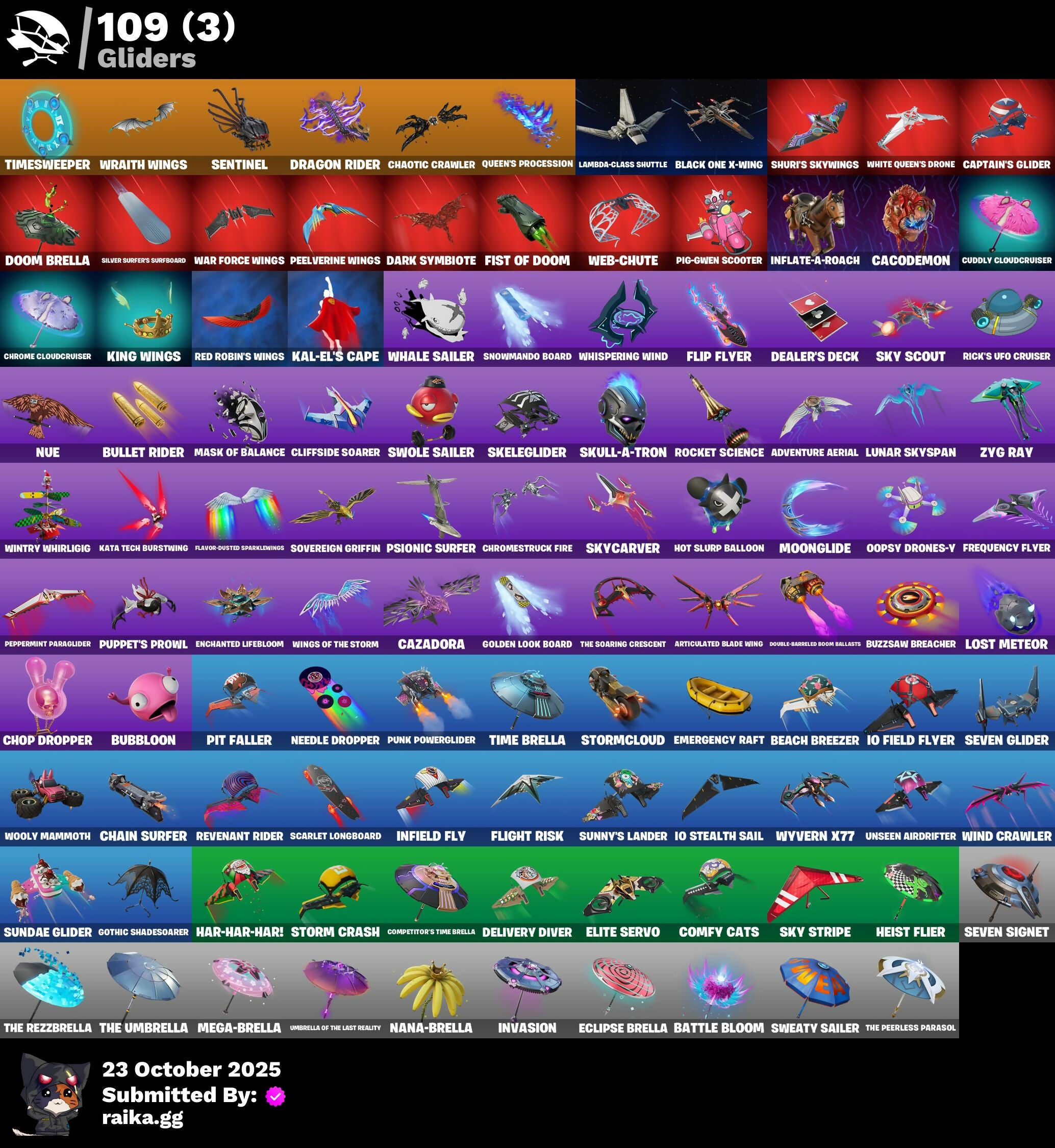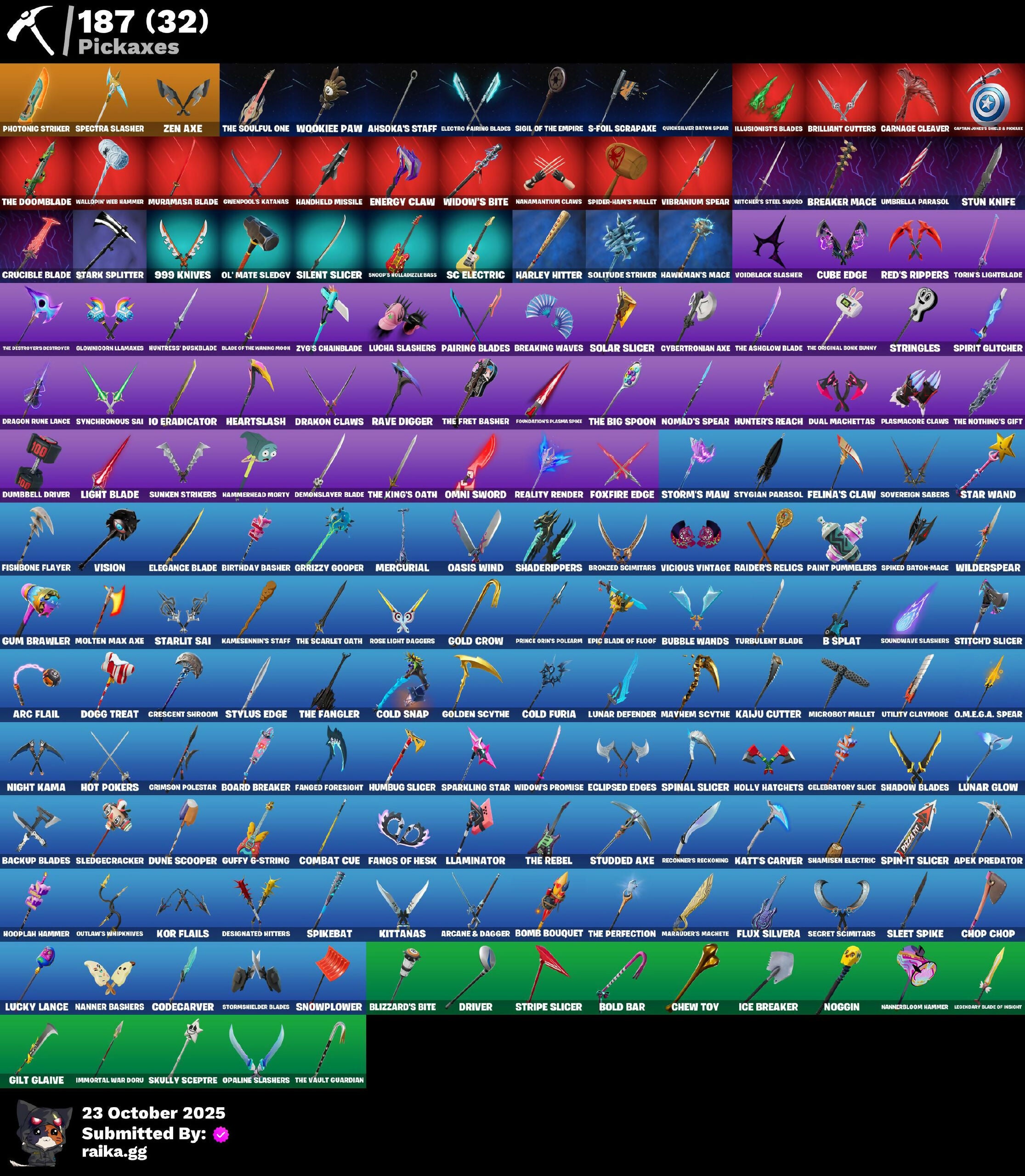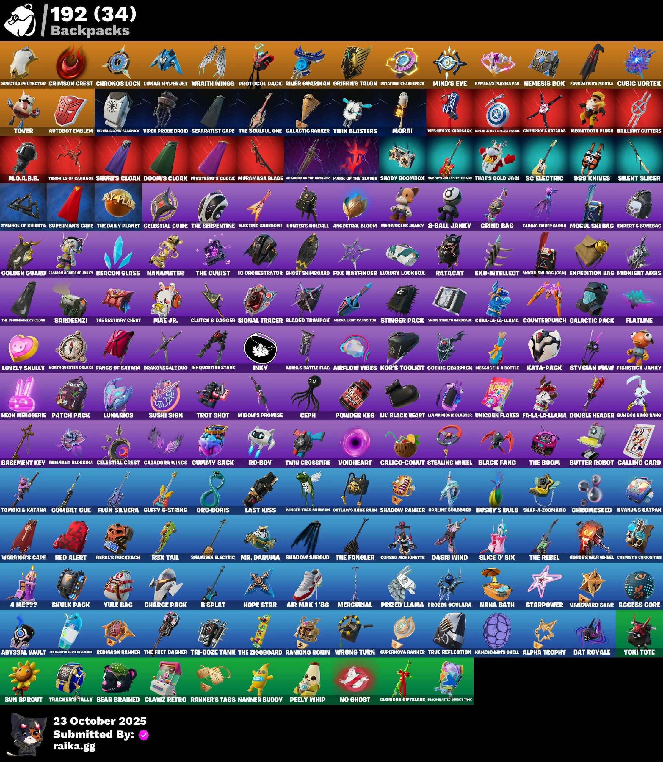 (Snikt!), 1-Ball, 2.O'S Revenge, 2022, 4 Me???, 8-Ball Janky, 999 Knives, Abduction, Abyssal Vault, Access Core, Adira, Adira's Armor, Adira's Battle Flag, Adventure Aerial, Aerial, Aerial Classic, Aerial Swagger, Aftermath, Ahsoka Tano, Ahsoka's Staff, Air Max 1 '86, Airflow Vibes, Akatsuki, All-Nighter, Alpha Trophy, Ancestral Bloom, Animantium Claws, Antonia, Antonia In Action, Apex Predator, Arc Flail, Arcade Cat, Arcane & Dagger, Arctic Achiever, Arctic Adeline, Ares, Articulated Blade Wing, Assassin's Mark, Astrea, Astro Armor, Autobot, Autobot Emblem, B Splat, Backlash, Backup Blades, Balance Board, Banner Icon, Baseball, Basement Key, Bat Royale, Battle Bloom, Battle Mode, Battle Ready Era, Battle-Tested, Be The Mastermind, Beach Breezer, Beach-Blasted Shades Tank, Beacon Glass, Beamers, Bear Brained, Bear Hug, Beat Breaker, Beatzbunny, Big Fan, Birthday Basher, Birthday Dash, Bitter Sweets, Black Adam, Black Fang, Black Hole, Black Leader, Black One X-Wing, Black Panther (Shuri), Black Queen, Blade Of The Waning Moon, Bladed Travpak, Blizzard's Bite, Blocko, Blowin' Up, Blue-Blood, Board Breaker, Bold Bar, Bomb Bouquet, Bombastic Winterfest, Boogie Down, Boot It, Break Point Ultra, Breaker Mace, Breaking Waves, Breezabelle, Brilliant Cutters, Bring It Around, Bronzed Scimitars, Bubble Wands, Bubblegum Highwire, Bubbloon, Buffer Fish, Bullet Rider, Bun Bun Bang Bang, Burn Bright, Bushie Bright, Bushy's Bulb, Butter Robot, Buzzsaw Breacher, By The Horns, Bytes, Bytes' Sigil, Cacodemon, Calico Holiday, Calico-Conut, Calling Card, Caper, Captain James's Shield & Pickaxe, Captain Jones, Captain Jones's Shield & Pickaxe, Captain Llamerica, Captain's Glider, Carbon Scarlet, Carnage, Carnage Cleaver, Cazadora, Cazadora Wings, Celebratory Slice, Celestial Crest, Celestial Guide, Ceph, Cerberus, Chain Surfer, Chalked Up 1-Ball, Chaos Directive, Chaos Director, Chaotic Crawler, Charge Pack, Charlotte, Charlotte's Logo, Chef's Special, Chemist's Curiosities, Chew Toy, Chill-La-La-Llama, Chimpanski Wants You, Choice Knit, Chomp Cudi!, Choose Naughty, Chop Chop, Chop Dropper, Choppy, Chrome Cloudcruiser, Chrome Marked, Chrome Punk, Chromeseed, Chromestruck Fire, Chronos Lock, Ciri, Clark Kent, Classic Age, Clawz Retro, Cliffside Soarer, Clutch & Dagger, Codecarver, Cold Furia, Cold Snap, Collector Kado Thorne, Combat Cue, Comet, Comfy Cats, Competitor's Time Brella, Confident Iridia, Console Cup, Contour Camo, Controlled Chaos, Coral Crush, Cosmic Legacy, Count It!, Counterpunch, Courageous Mikasa, Crack It, Crashed Chiller, Crashed Shield, Crazy Castle, Crescent Shroom, Crimson Crest, Crimson Polestar, Crowning Achievement, Crucible Blade, Crystaline, Cube Assassin, Cube Edge, Cubed, Cubic Vortex, Cuddly Cloudcruiser, Cursed Marionette, Cybertronian Axe, D.C. 63, Dahlia, Daisies, Dark Side Rising, Dark Symbiote, Darth Shader, Darth Vader, Datafiber Chargepack, Dealer's Deck, Deep Future, Delivery Diver, Demons Beware, Demonslayer Blade, Desert Dawn Lyric, Designated Hitters, Destroyer Signature, Dice Roll, Dimensional Camo, Dire Goat, Diva's Grin, Division, Doctor Slone, Doctor Slone (Prismatic), Dogg Treat, Doom, Doom Brella, Doom Slayer, Doom's Cloak, Double Draw, Double Header, Double-Barreled Boom Ballasts, Dragon Rider, Dragon Rune Lance, Dragon Rune Lances, Dragon Spirit, Drakon Claws, Drakon Steel Hybrid, Drakonscale Duo, Dramatic Flares, Drift Face, Driver, Drones-V View, Droopy, Dual Machettas, Dumbbell Driver, Dumbell Driver, Dummy, Dune Scooper, Durrr Face, Dusty, Dyna-Boom!, Dynamo, Dynamo Tntina, Dynamo Tntoon-A, Easter Egg, Echo, Eclipse Brella, Eclipsed Edges, Electric Shredder, Electro Pairing Blades, Elegance Blade, Elite Servo, Emergency Raft, Emma Frost, Emma's Influence, Empress Fan Dance, Enchanted Lifebloom, Energy Claw, Ensnared, Epic Blade Of Floof, Era, Eren Jaeger, Eren's Faceoff, Escapees, Evie, Exo-Intellect, Expedition Bag, Expert's Bonebag, Expressionism, Eye of Agamotto, Fa-La-La-Llama, Fabio Sparklemane, Face Palm, Fading Ember Cloak, Fan Attack, Fang Dance, Fanged Foresight, Fangs Of Hesk, Fangs of Sayara, Fashion Accident Janky, Fashion Doggo, Felina, Felina's Claw, Festival Lace, Final Eclipse, Finstick Janky, Fireworks Salvo, Fish Thicc, Fishbone Flayer, Fist Bump, Fist of Doom, Fizzle, Flaky Feast, Flashback Breakdown, Flatline, Flavor-Dusted Sparklewings, Flight Risk, Flip Flyer, Flipside, Flood, Flux Silvera, Foundation's Mantle, Foundation's Plasma Spike, Foundational, Fox Wayfinder, Foxfire Edge, Frequency Flyer, Frozen Oculara, Frozen Over, Fryangles, Furmidable Meowscles, Fusion!, Fusion! Hah!!, Future Goat, Galactic Pack, Galactic Ranker, Geralt, Geralt Of Rivia, Get Griddy, Get Out of Your Mind, Ggwp, Ghost Skimboard, Ghoul Trooper, Gila, Gila Classic, Gildhart, Gilt Glaive, Glitter N' Grim, Glorious Giftblade, Glory To Latveria, Glownoidorn Llamaxes, Go For The Goal, Gold Crow, Golden Black, Golden Guard, Golden Look Board, Golden Rune Charlotte, Golden Rune Fabio, Golden Scythe, Good Game, Well Played, Good Guy, Gothic Gearpack, Gothic Shadesoarer, Griffin's Talon, Grim Grin, Grind Bag, Gringle Gift, Grizzzy Gooper, Groovy!, Grriz, Grrizzv Gunz, Guffy 6-String, Guggi Was Here, Guggimon, Guggimon (Prismatic), Gugmon, Gum Brawler, Gumbo, Gummy Sack, Gunnar's Special, Gwen-Step, Gwenpool, Gwenpool's Glee, Gwenpool's Katanas, Gwetterman Jacket, Hammerhead Morty, Hamster Overdrive, Hand of Trace, Hand-Forged, Handheld Missile, Har-Har-Har!, Hare-Raising, Harley Hitter, Harlowe, Haven, Hawkman's Mace, Headpiece, Heart's Desire, Heartburst, Hearts Aflutter, Heartslash, Heavy Metal Omega, Heist Flier, Hellfire Dance, Helmet, Here Comes Trubble, Hidden Haven, Highwire, Highwire Hop, Highwired, Holiday Boxy, Holly Hatchets, Honor Duel, Hooplah Hammer, Hope, Hope Star, Hope You're Ready, Horde's War Wheel, Horizon’s Call, Hot Pokers, Hot Slurp Balloon, Humbug Slicer, Hunter's Crest, Hunter's Holdall, Hunter's Reach, Huntress' Duskblade, Hypno-Bat, I Beli
