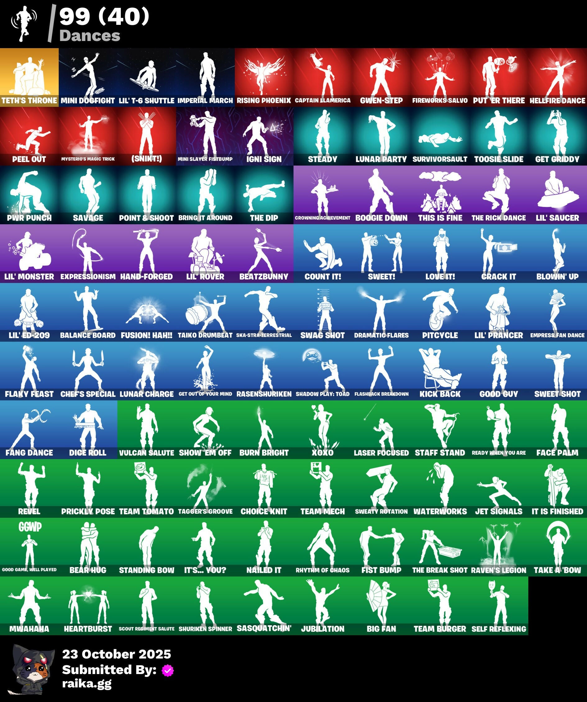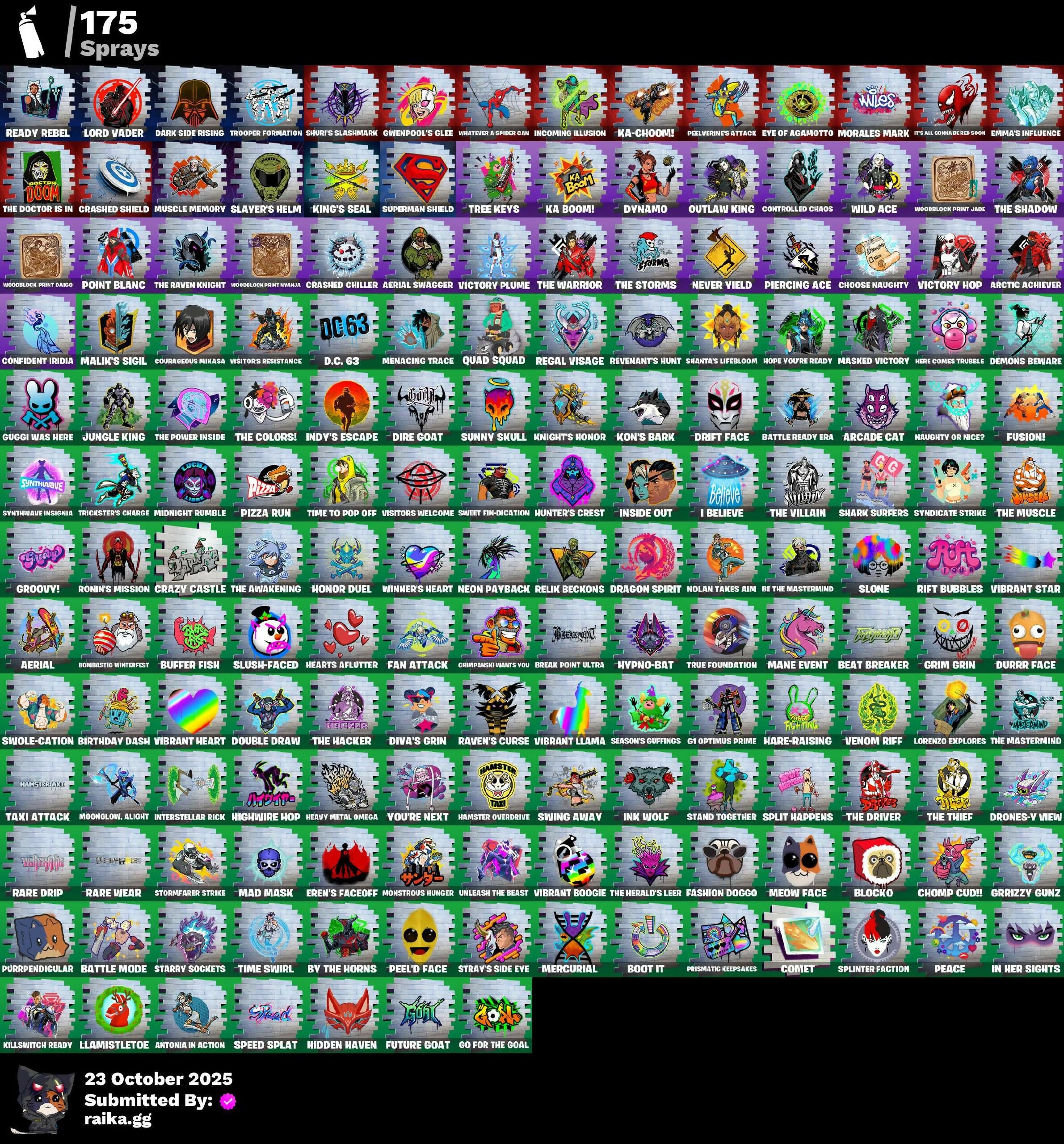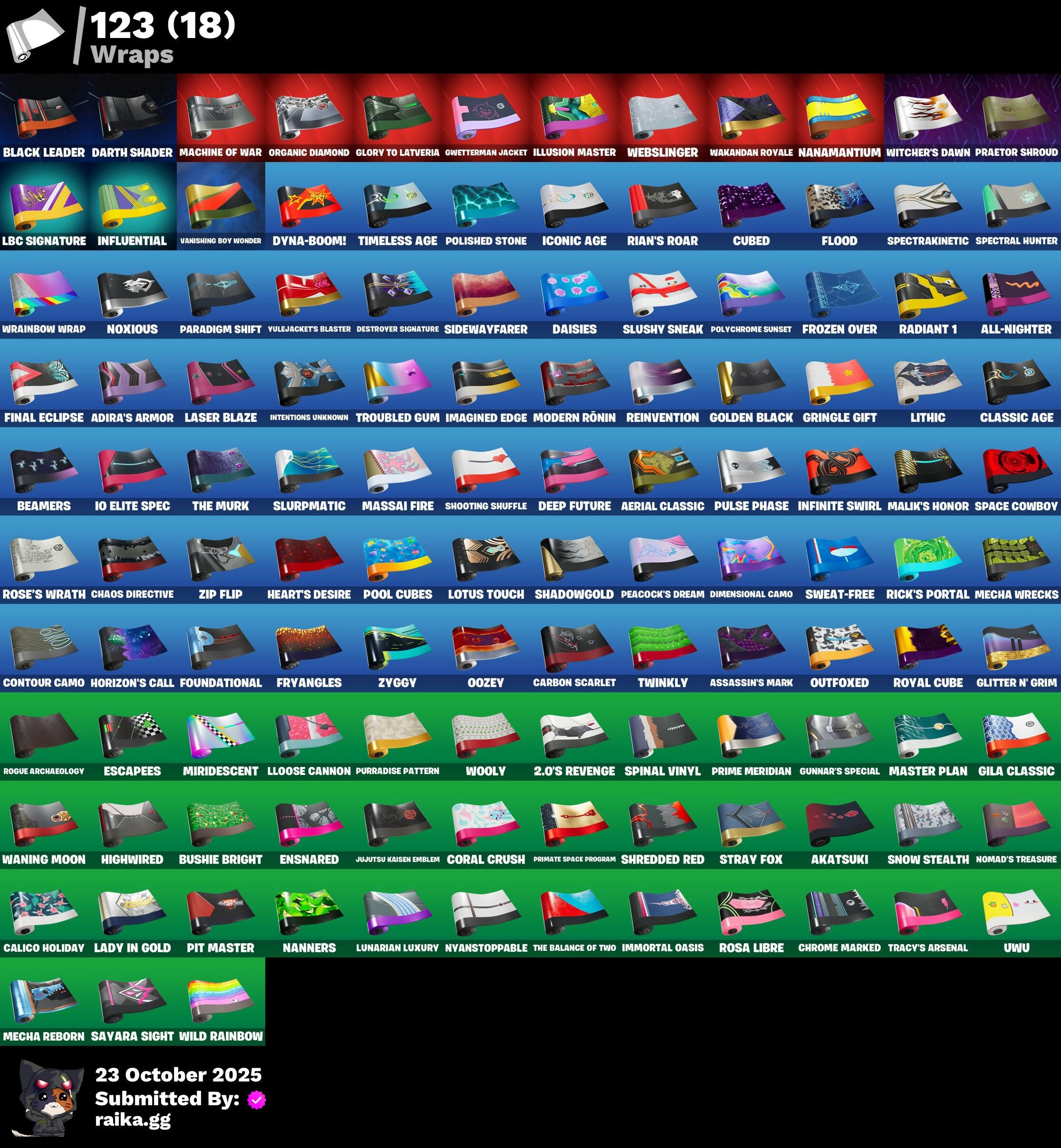 (Snikt!), 1-Ball, 2.O'S Revenge, 2022, 4 Me???, 8-Ball Janky, 999 Knives, Abduction, Abyssal Vault, Access Core, Adira, Adira's Armor, Adira's Battle Flag, Adventure Aerial, Aerial, Aerial Classic, Aerial Swagger, Aftermath, Ahsoka Tano, Ahsoka's Staff, Air Max 1 '86, Airflow Vibes, Akatsuki, All-Nighter, Alpha Trophy, Ancestral Bloom, Animantium Claws, Antonia, Antonia In Action, Apex Predator, Arc Flail, Arcade Cat, Arcane & Dagger, Arctic Achiever, Arctic Adeline, Ares, Articulated Blade Wing, Assassin's Mark, Astrea, Astro Armor, Autobot, Autobot Emblem, B Splat, Backlash, Backup Blades, Balance Board, Banner Icon, Baseball, Basement Key, Bat Royale, Battle Bloom, Battle Mode, Battle Ready Era, Battle-Tested, Be The Mastermind, Beach Breezer, Beach-Blasted Shades Tank, Beacon Glass, Beamers, Bear Brained, Bear Hug, Beat Breaker, Beatzbunny, Big Fan, Birthday Basher, Birthday Dash, Bitter Sweets, Black Adam, Black Fang, Black Hole, Black Leader, Black One X-Wing, Black Panther (Shuri), Black Queen, Blade Of The Waning Moon, Bladed Travpak, Blizzard's Bite, Blocko, Blowin' Up, Blue-Blood, Board Breaker, Bold Bar, Bomb Bouquet, Bombastic Winterfest, Boogie Down, Boot It, Break Point Ultra, Breaker Mace, Breaking Waves, Breezabelle, Brilliant Cutters, Bring It Around, Bronzed Scimitars, Bubble Wands, Bubblegum Highwire, Bubbloon, Buffer Fish, Bullet Rider, Bun Bun Bang Bang, Burn Bright, Bushie Bright, Bushy's Bulb, Butter Robot, Buzzsaw Breacher, By The Horns, Bytes, Bytes' Sigil, Cacodemon, Calico Holiday, Calico-Conut, Calling Card, Caper, Captain James's Shield & Pickaxe, Captain Jones, Captain Jones's Shield & Pickaxe, Captain Llamerica, Captain's Glider, Carbon Scarlet, Carnage, Carnage Cleaver, Cazadora, Cazadora Wings, Celebratory Slice, Celestial Crest, Celestial Guide, Ceph, Cerberus, Chain Surfer, Chalked Up 1-Ball, Chaos Directive, Chaos Director, Chaotic Crawler, Charge Pack, Charlotte, Charlotte's Logo, Chef's Special, Chemist's Curiosities, Chew Toy, Chill-La-La-Llama, Chimpanski Wants You, Choice Knit, Chomp Cudi!, Choose Naughty, Chop Chop, Chop Dropper, Choppy, Chrome Cloudcruiser, Chrome Marked, Chrome Punk, Chromeseed, Chromestruck Fire, Chronos Lock, Ciri, Clark Kent, Classic Age, Clawz Retro, Cliffside Soarer, Clutch & Dagger, Codecarver, Cold Furia, Cold Snap, Collector Kado Thorne, Combat Cue, Comet, Comfy Cats, Competitor's Time Brella, Confident Iridia, Console Cup, Contour Camo, Controlled Chaos, Coral Crush, Cosmic Legacy, Count It!, Counterpunch, Courageous Mikasa, Crack It, Crashed Chiller, Crashed Shield, Crazy Castle, Crescent Shroom, Crimson Crest, Crimson Polestar, Crowning Achievement, Crucible Blade, Crystaline, Cube Assassin, Cube Edge, Cubed, Cubic Vortex, Cuddly Cloudcruiser, Cursed Marionette, Cybertronian Axe, D.C. 63, Dahlia, Daisies, Dark Side Rising, Dark Symbiote, Darth Shader, Darth Vader, Datafiber Chargepack, Dealer's Deck, Deep Future, Delivery Diver, Demons Beware, Demonslayer Blade, Desert Dawn Lyric, Designated Hitters, Destroyer Signature, Dice Roll, Dimensional Camo, Dire Goat, Diva's Grin, Division, Doctor Slone, Doctor Slone (Prismatic), Dogg Treat, Doom, Doom Brella, Doom Slayer, Doom's Cloak, Double Draw, Double Header, Double-Barreled Boom Ballasts, Dragon Rider, Dragon Rune Lance, Dragon Rune Lances, Dragon Spirit, Drakon Claws, Drakon Steel Hybrid, Drakonscale Duo, Dramatic Flares, Drift Face, Driver, Drones-V View, Droopy, Dual Machettas, Dumbbell Driver, Dumbell Driver, Dummy, Dune Scooper, Durrr Face, Dusty, Dyna-Boom!, Dynamo, Dynamo Tntina, Dynamo Tntoon-A, Easter Egg, Echo, Eclipse Brella, Eclipsed Edges, Electric Shredder, Electro Pairing Blades, Elegance Blade, Elite Servo, Emergency Raft, Emma Frost, Emma's Influence, Empress Fan Dance, Enchanted Lifebloom, Energy Claw, Ensnared, Epic Blade Of Floof, Era, Eren Jaeger, Eren's Faceoff, Escapees, Evie, Exo-Intellect, Expedition Bag, Expert's Bonebag, Expressionism, Eye of Agamotto, Fa-La-La-Llama, Fabio Sparklemane, Face Palm, Fading Ember Cloak, Fan Attack, Fang Dance, Fanged Foresight, Fangs Of Hesk, Fangs of Sayara, Fashion Accident Janky, Fashion Doggo, Felina, Felina's Claw, Festival Lace, Final Eclipse, Finstick Janky, Fireworks Salvo, Fish Thicc, Fishbone Flayer, Fist Bump, Fist of Doom, Fizzle, Flaky Feast, Flashback Breakdown, Flatline, Flavor-Dusted Sparklewings, Flight Risk, Flip Flyer, Flipside, Flood, Flux Silvera, Foundation's Mantle, Foundation's Plasma Spike, Foundational, Fox Wayfinder, Foxfire Edge, Frequency Flyer, Frozen Oculara, Frozen Over, Fryangles, Furmidable Meowscles, Fusion!, Fusion! Hah!!, Future Goat, Galactic Pack, Galactic Ranker, Geralt, Geralt Of Rivia, Get Griddy, Get Out of Your Mind, Ggwp, Ghost Skimboard, Ghoul Trooper, Gila, Gila Classic, Gildhart, Gilt Glaive, Glitter N' Grim, Glorious Giftblade, Glory To Latveria, Glownoidorn Llamaxes, Go For The Goal, Gold Crow, Golden Black, Golden Guard, Golden Look Board, Golden Rune Charlotte, Golden Rune Fabio, Golden Scythe, Good Game, Well Played, Good Guy, Gothic Gearpack, Gothic Shadesoarer, Griffin's Talon, Grim Grin, Grind Bag, Gringle Gift, Grizzzy Gooper, Groovy!, Grriz, Grrizzv Gunz, Guffy 6-String, Guggi Was Here, Guggimon, Guggimon (Prismatic), Gugmon, Gum Brawler, Gumbo, Gummy Sack, Gunnar's Special, Gwen-Step, Gwenpool, Gwenpool's Glee, Gwenpool's Katanas, Gwetterman Jacket, Hammerhead Morty, Hamster Overdrive, Hand of Trace, Hand-Forged, Handheld Missile, Har-Har-Har!, Hare-Raising, Harley Hitter, Harlowe, Haven, Hawkman's Mace, Headpiece, Heart's Desire, Heartburst, Hearts Aflutter, Heartslash, Heavy Metal Omega, Heist Flier, Hellfire Dance, Helmet, Here Comes Trubble, Hidden Haven, Highwire, Highwire Hop, Highwired, Holiday Boxy, Holly Hatchets, Honor Duel, Hooplah Hammer, Hope, Hope Star, Hope You're Ready, Horde's War Wheel, Horizon’s Call, Hot Pokers, Hot Slurp Balloon, Humbug Slicer, Hunter's Crest, Hunter's Holdall, Hunter's Reach, Huntress' Duskblade, Hypno-Bat, I Beli