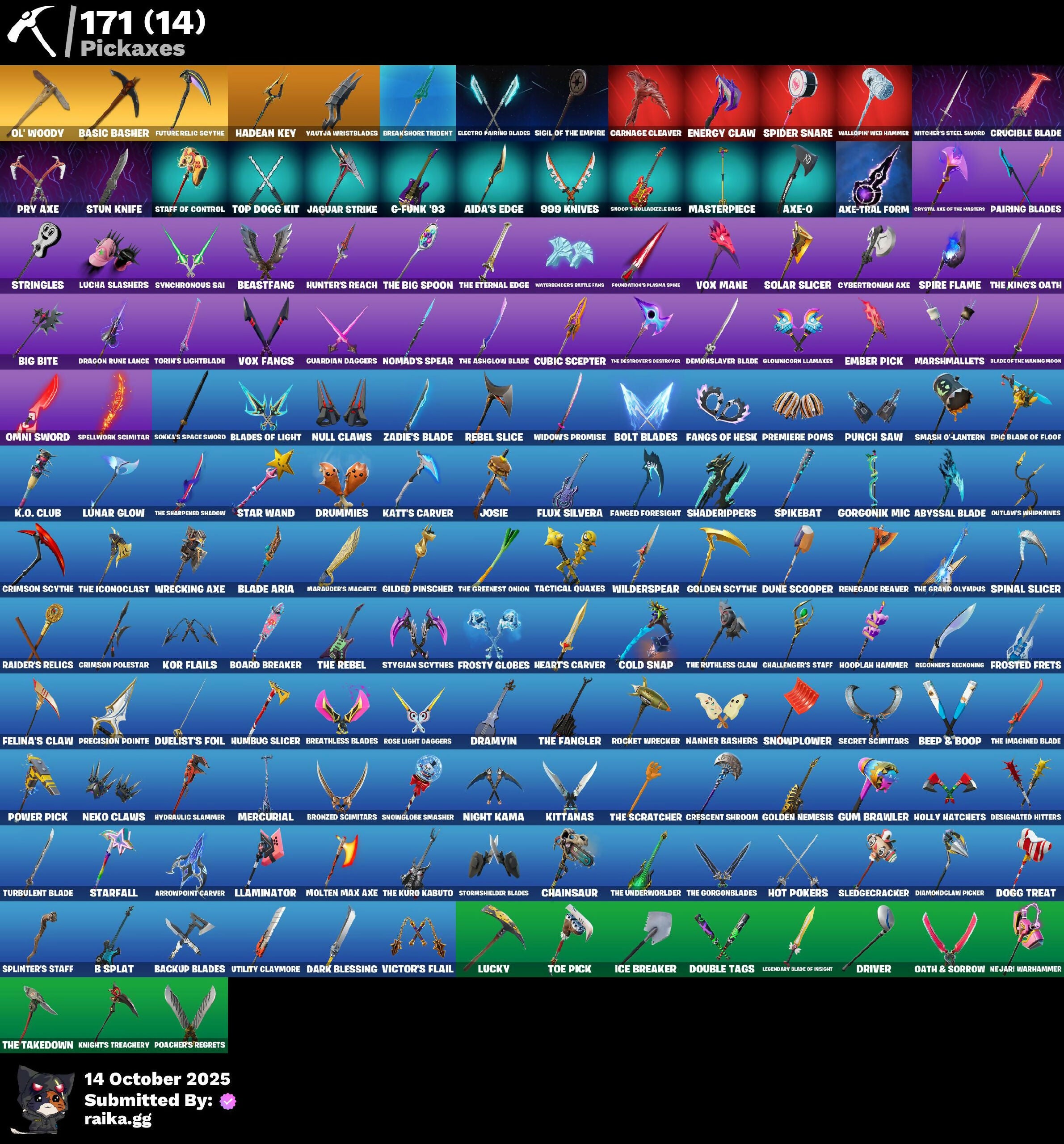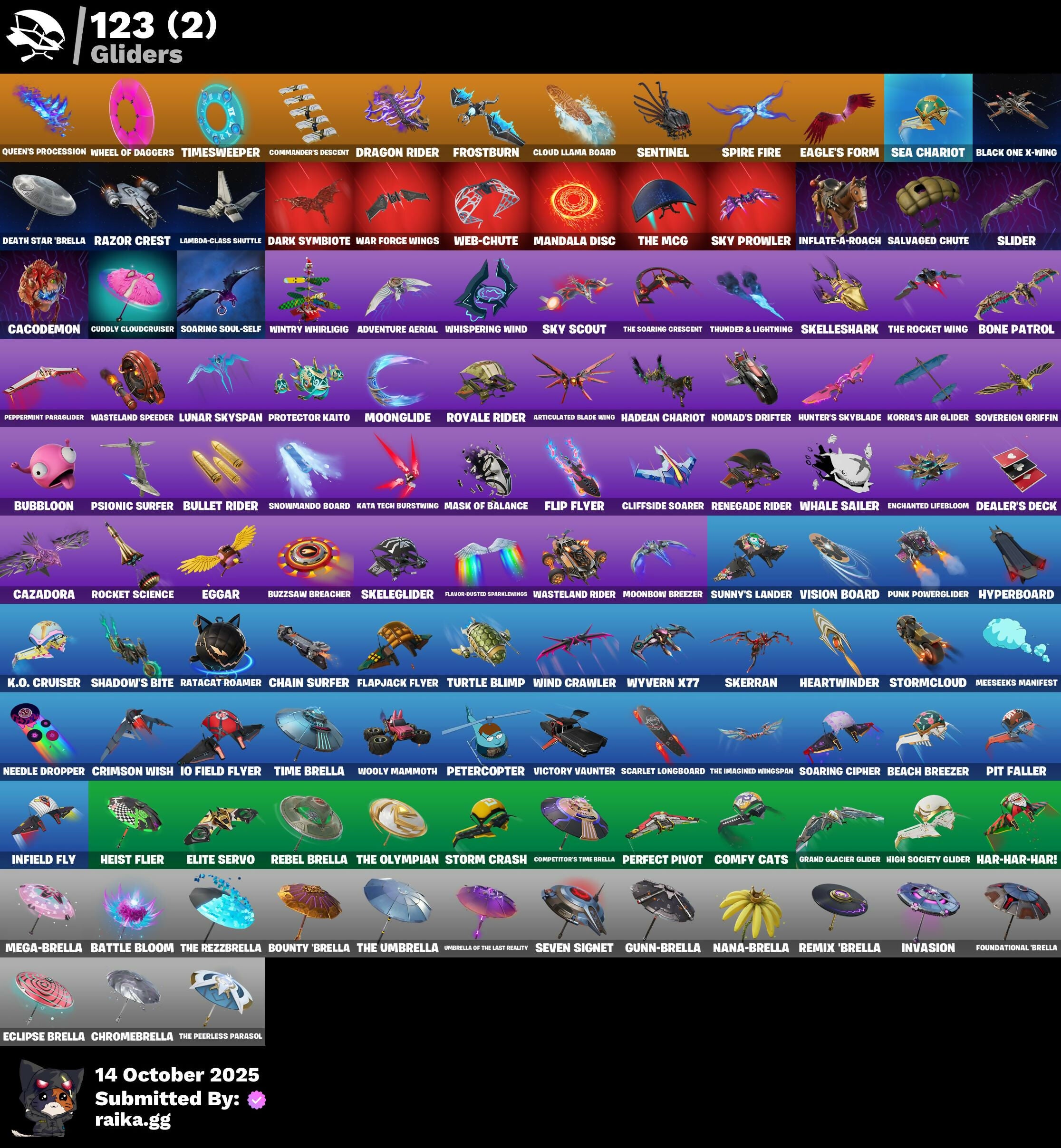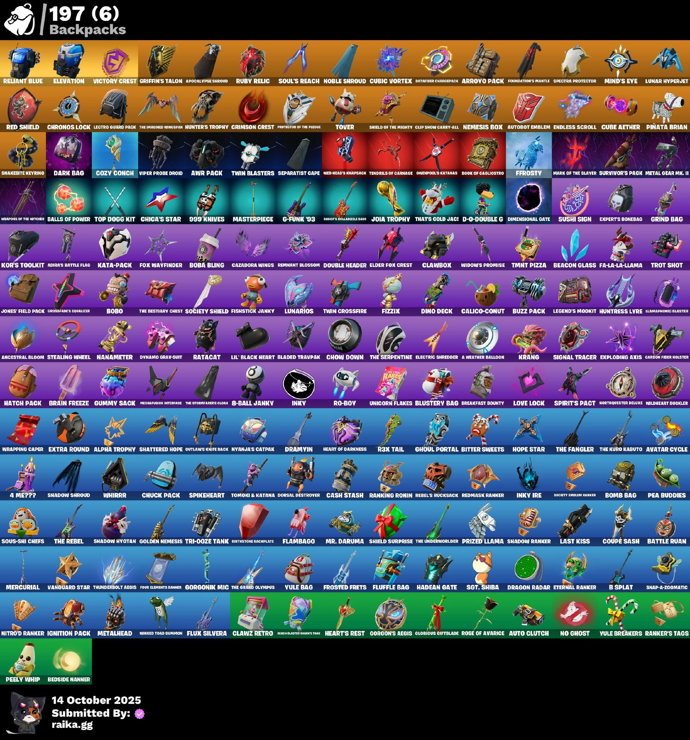 2.0's Revenge, 4 Me???, 8-Ball Janky, 999 Knives, A Warrior Prepares, A Weather Balloon, AFK, Absenz, Abyssal Blade, Acolyte's Curse, Adira, Adira (Battle Mask), Adira's Armor, Adira's Battle Flag, Adventure Aerial, Aerial, Aerial Assault Bomber, Aerial Assault Captain, Aerial Classic, Aerial Swagger, Agent Jones, Agent Jones (Jump 31), Aida's Edge, Alpha Trophy, Ancestral Bloom, Aphrodite, Apocalypse Shroud, Arctic Adeline, Arrowpoint Carver, Arroyo Pack, Artemis, Articulated Blade Wing, Ascension Nezumi, Astro Armor, Auto Clutch, Autobot Emblem, Avatar Cycle, Avatar's Flourish, Awr Pack, Axe-O, Axe-Tral Form, Azarath Metrion Zinthos!, B Splat, B.R.U.T.E Competitor, Backup Blades, Balance Board, Balanced, Balls Of Power, Baseball, Basic Basher, Battle Bloom, Battle Mode, Battle Ready Era, Battle Ruan, Bawk Off, Beach Breezer, Beacon Glass, Bean Bag, Bear Hug, Beastfang, Beat Breaker, Bedside Nanner, Beef Blade, Beep & Boop, Big Bite, Big Fan, Big Guns, Billy Bounce, Birdie, Birthstone Backplate, Bitter Sweets, Black Hole, Black Leader, Black One X-Wing, Blade Aria, Blade of the Waning Moon, Bladed Traypak, Blades of Light, Blasted, Blazing Fire Cerberus, Blocko, Blowin' Up, Blustery Bag, Board Breaker, Boba Bling, Boba Snack, Bobo, Bolt Blades, Bomb Bag, Bombastic Winterfest, Bone Patrol, Bonevard Brand, Boogie Down, Book Of Cagliostro, Boomin', Boot It, Boots'n'Cats, Both Eyes Open, Bounty 'Brella, Brain Freeze, Break Point Ultra, Breakfast Bounty, Breaking Point, Breakshore Trident, Breathless Blades, Bronzed Scimitars, Bruteball, Bubbloon, Bullen Brawler Dusty, Bullet Rider, Bulletproof, Burning Ambition Valeria, Burning Dragon, Burnmark, Bushie Bright, Buttoned Up, Buzz Pack, Buzzsaw Breacher, Bytes' Sigil, C4S1 Contender I, Cacodemon, Calico Holiday, Calico-Conut, Call Me, Called Shot, Cap K.O., Cap Kick, Caper, Caper (Bunny), Carbon Fiber Holster, Carbon Scarlet, Card Drop, Cardistry, Carnage, Carnage (Maximum), Carnage Cleaver, Cash Grab, Cash Stash, Cazadora, Cazadora Wings, Cerberus, Cerberus Bite, Cerberus Medallion, Chain Surfer, Chainsaur, Challenger Cerberus, Challenger's Staff, Champion's Gold, Chaos Directive, Charlotte, Charlotte (Golden Rune), Chibi, Chica, Chica's Star, Chimichanga!, Chimpanski Wants You, Choice Knit, Chomp Cudi!, Choose Naughty, Choppy, Chow Down, Chrome Marked, Chromebrella, Chronos Lock, Chuck Pack, Circuitry, Clara, Classic Age, Clawbox, Clawz Retro, Clean Sweep, Cliffside Soarer, Clip Show Carry-All, Cloud Llama Board, Cloud Striker, Club President Helsie, Cluck, Cluck (Slurpy), Clucking Mad, Cold Snap, Combat Giller, Comfy Cats, Commander's Descent, Competitor Medusa, Competitor Rust, Competitor's Time Brella, Conch Call, Confetti, Conjure Weapon, Contour Camo, Contract Giller, Controlled Focus, Controller Crew, Corrosive Stripe, Corrosive Tag, Count It!, Coupé Sashi, Courageous Mikasa, Cozy Conch, Crashed Chiller, Crescent Shroom, Crimson Crest, Crimson Polestar, Crimson Scythe, Crimson Wish, Crossfade's Equalizer, Crowning Achievement, Crucible Blade, Cryptic Sigil, Crystal Axe of the Masters, Cube Aether, Cube Marking, Cubed, Cubic Scepter, Cubic Vortex, Cuddle Scream Leader, Cuddly Cloudcruiser, Curling Iron, Cybertronian Axe, Cyclo Curl, D'Ark, D-O-Double G, D.C. 63, DYNAMIC TNTINA, Da Bomb, Dagger Dance, Daigo, Daisies, Dark Bag, Dark Blessing, Dark Bomber, Dark Symbiote, Darth Shader, Darth Vader, Datafiber Chargepack, Daughter Of Trigon, Dawn Duelist Nisha, Dealer's Deck, Death Star 'Brella, Deca-Glosted Shane's Tank, Deep Future, Demons Beware, Demonslayer Blade, Designated Hitters, Determined Kendo, Determined Korra, Diamond Throne, Diamondclaw Picker, Dimensional Camo, Dimensional Gate, Dino Deck, Dire Goat, Direct The Chaos, Disguise, Distant Roar, Division, Dizzie, Doctor Strange, Doctor Strange (Stealth Silver), Dogg Treat, Doggo, Don Of The Wastes, Doom Slayer, Dorsal Destroyer, Double Header, Double Tags, Double Up, Doze Dab, Dragon Radar, Dragon Rider, Dragon Rune Lance, Dragon Rune Lances, Dragon Spirit, Dramatic Flares, Dramvin, Dramyin, Drift Face, Driver, Drooly, Dropout, Drummies, Duelist's Foil, Dune Scooper, Durrr Face, Durrr Taisho, Dusty, Dynamo Grav-Suit, E.G.O., Eagle's Form, Eclipse Brella, Eggar, Elder Fox Crest, Electric Shredder, Electro Pairing Blades, Elemental Cycle, Elevation, Elite Servo, Elysian Artemis, Elysium, Ember Pick, Enchanted Lifebloom, Endless Scroll, Energy Claw, Epic Blade of Floof, Era, Erisa, Erisa (Stealth Silver), Erisa Alert, Erisa's Crest, Escapees, Eternal Hunt, Eternal Ranker, Eternal Renegade, Evasive Maneuvers, Evie, Exile's Emblem, Experts Bonebag, Exploding Axis, Extra Round, Eye Of Agamotto, Fa-La-La-Llama, Fabio Sparklemane, Fabio Sparklemane (Golden Rune), Fancy Footwork, Fancy Peter Griffin, Fang Dance, Fanged Foresight, Fangs of Hesk, Felina, Felina's Claw, Ffrosty, Fish Hook, Fishstick Janky, Fizzix, Flambago, Flapjack Flyer, Flash Of Lightning, Flavor-Dusted Sparklings, Flip Flyer, Flow Bones, Fluffle Bag, Flux Silvera, Focus, Foil Flex, Forsaken Eve, Foundation's Mantle, Foundation's Plasma Spike, Foundational, Foundational Brella, Four Elements Banner, Fox Clan Future, Fox Wayfinder, Frost Squad, Frostburn, Frosted Frets, Frosty Globes, Fryangles, Fusion!, Future Goat, Future Relic Scythe, G-Funk '93, G1 Optimus Prime, GRRIZ, Galaxy Crossfade, Gangnam Style, Geared Up, Geralt, Geralt of Rivia, Get Griddy, Get Out Of Your Mind, Ghoul Portal, Gila Classic, Gilded Heart, Gilded Pinscher, Gingerbread Raider, Glorious Giftblade, Glowunicorn Llamaxes, Glyph Master, Golden Nemesis, Golden Scythe, Good Guy, Gorgon's Aegis, Gorgonik Mic, Grand Glacier Glider, Grav-Fusion, Griffin's Talon, Grim Grin, Grim King Hades, Grind Bag, Gringle Gift, Guardian Daggers, Guardian Jade, Gucci Was Here, Guff, Gum Brawler, Gumbo, Gumbo (Sour), Gummy Sack, Gunmetal Idol, Gunn-Brella, Gunnar, Gunnar (Stealth Silver), Gunnar's Special, Gwetterman Jacket, Hadean Chariot, Hadean Gate, Hadean Key, Hades, H