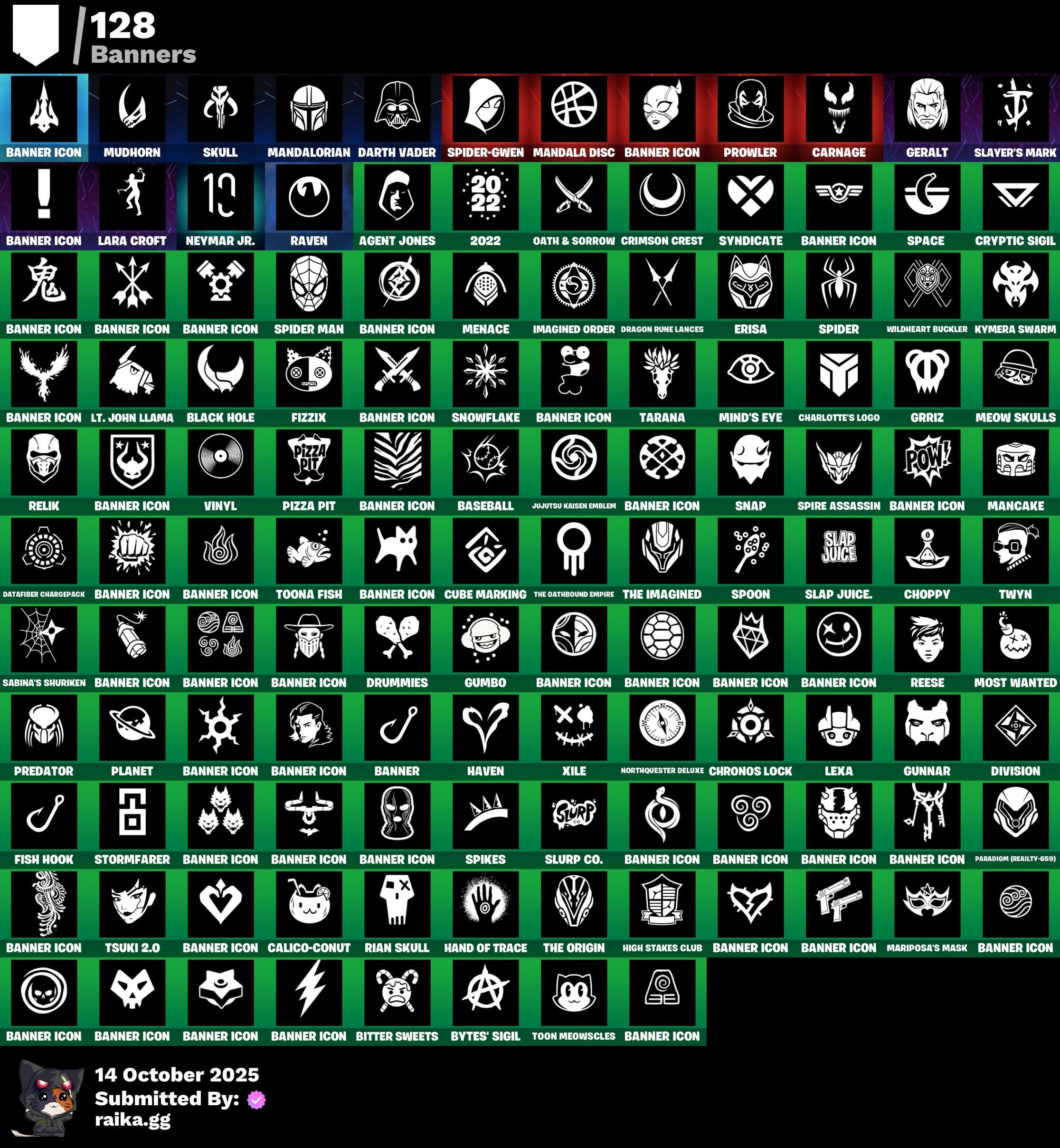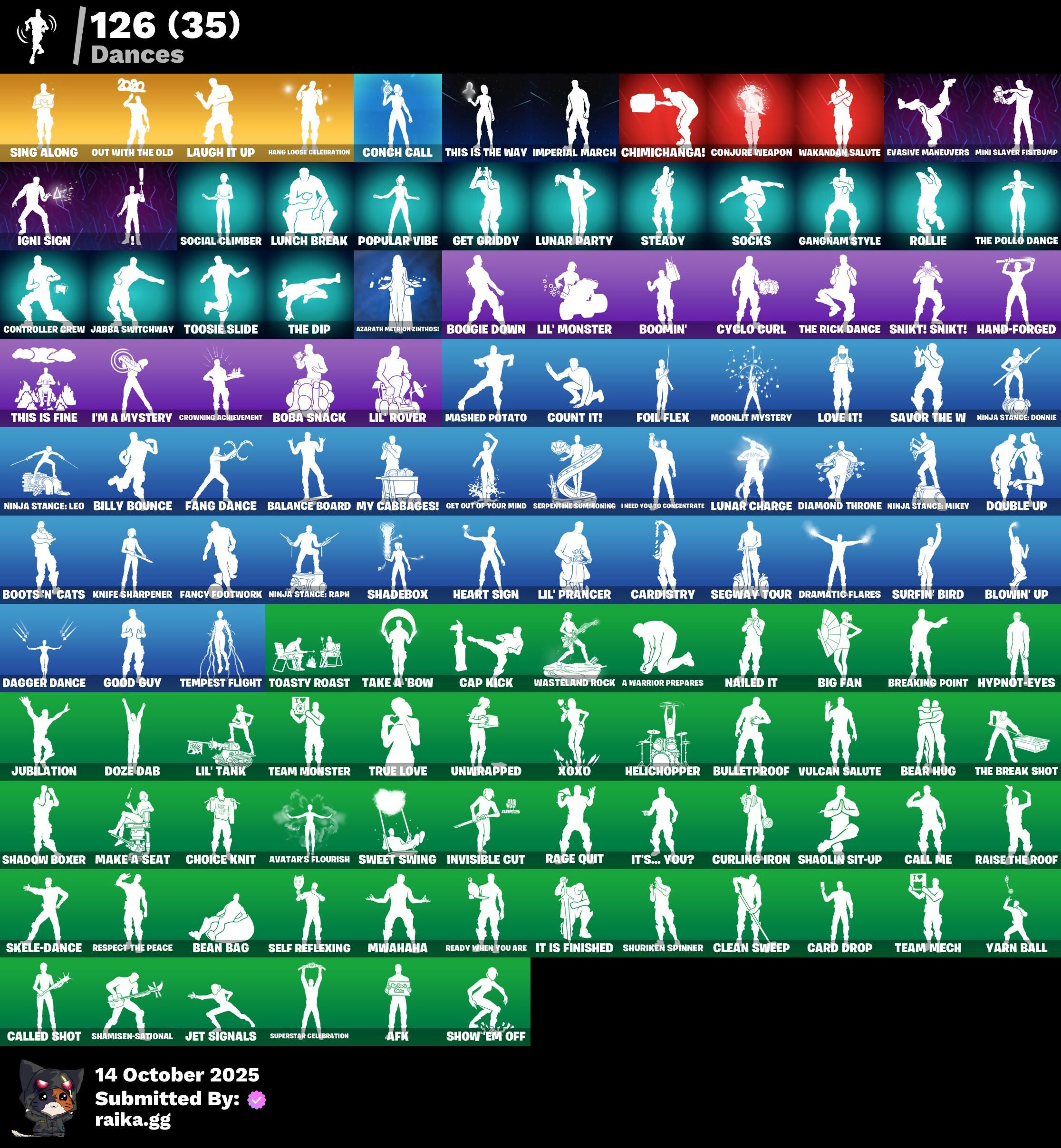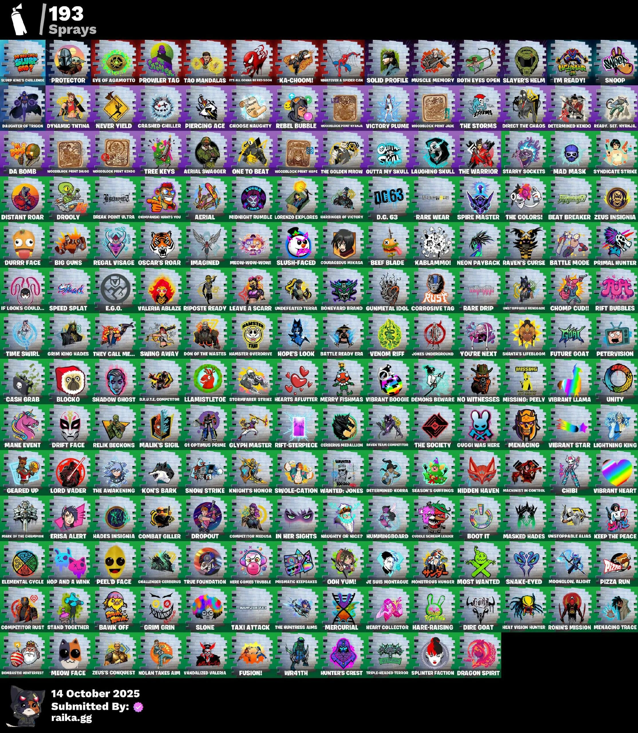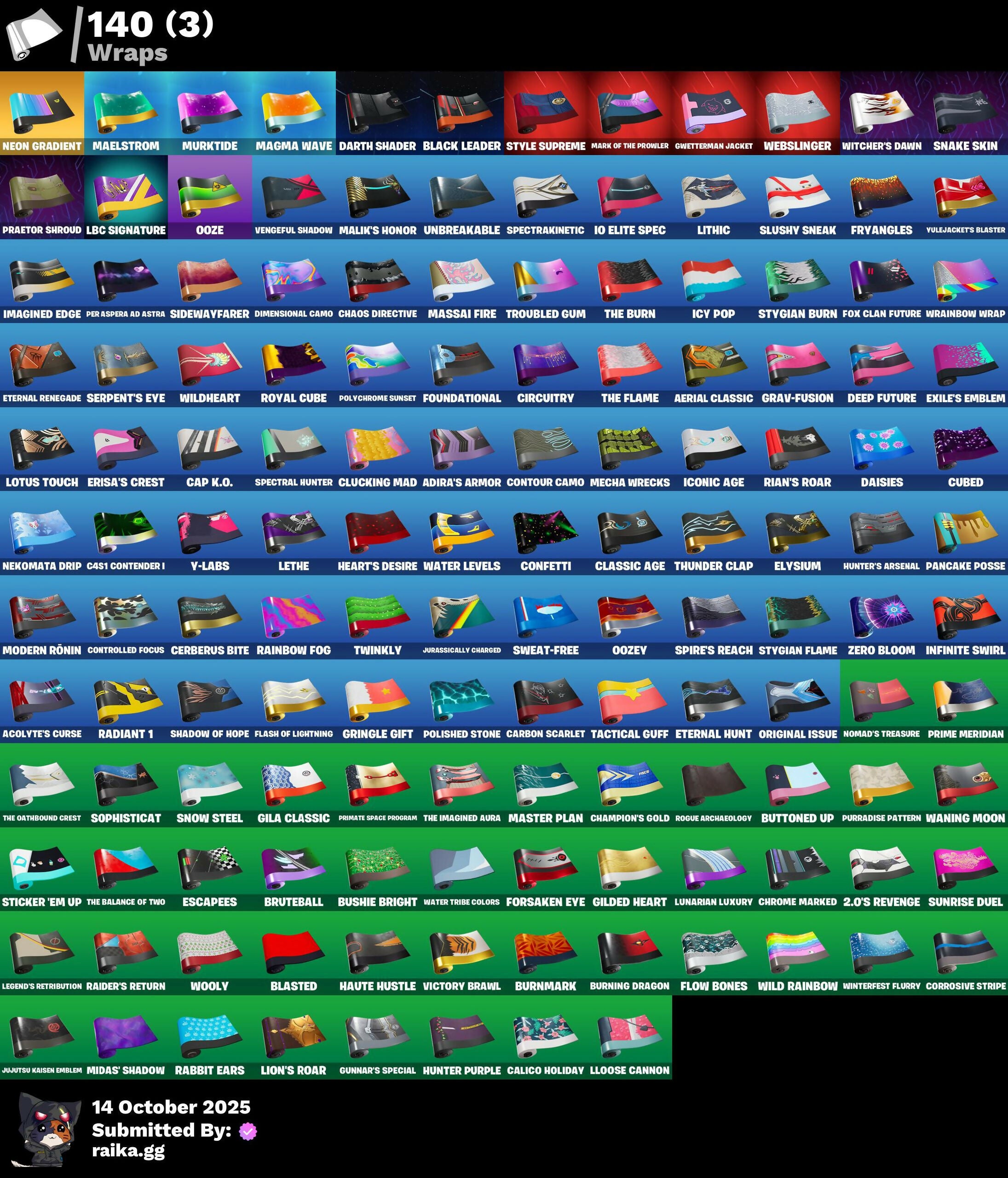 2.0's Revenge, 4 Me???, 8-Ball Janky, 999 Knives, A Warrior Prepares, A Weather Balloon, AFK, Absenz, Abyssal Blade, Acolyte's Curse, Adira, Adira (Battle Mask), Adira's Armor, Adira's Battle Flag, Adventure Aerial, Aerial, Aerial Assault Bomber, Aerial Assault Captain, Aerial Classic, Aerial Swagger, Agent Jones, Agent Jones (Jump 31), Aida's Edge, Alpha Trophy, Ancestral Bloom, Aphrodite, Apocalypse Shroud, Arctic Adeline, Arrowpoint Carver, Arroyo Pack, Artemis, Articulated Blade Wing, Ascension Nezumi, Astro Armor, Auto Clutch, Autobot Emblem, Avatar Cycle, Avatar's Flourish, Awr Pack, Axe-O, Axe-Tral Form, Azarath Metrion Zinthos!, B Splat, B.R.U.T.E Competitor, Backup Blades, Balance Board, Balanced, Balls Of Power, Baseball, Basic Basher, Battle Bloom, Battle Mode, Battle Ready Era, Battle Ruan, Bawk Off, Beach Breezer, Beacon Glass, Bean Bag, Bear Hug, Beastfang, Beat Breaker, Bedside Nanner, Beef Blade, Beep & Boop, Big Bite, Big Fan, Big Guns, Billy Bounce, Birdie, Birthstone Backplate, Bitter Sweets, Black Hole, Black Leader, Black One X-Wing, Blade Aria, Blade of the Waning Moon, Bladed Traypak, Blades of Light, Blasted, Blazing Fire Cerberus, Blocko, Blowin' Up, Blustery Bag, Board Breaker, Boba Bling, Boba Snack, Bobo, Bolt Blades, Bomb Bag, Bombastic Winterfest, Bone Patrol, Bonevard Brand, Boogie Down, Book Of Cagliostro, Boomin', Boot It, Boots'n'Cats, Both Eyes Open, Bounty 'Brella, Brain Freeze, Break Point Ultra, Breakfast Bounty, Breaking Point, Breakshore Trident, Breathless Blades, Bronzed Scimitars, Bruteball, Bubbloon, Bullen Brawler Dusty, Bullet Rider, Bulletproof, Burning Ambition Valeria, Burning Dragon, Burnmark, Bushie Bright, Buttoned Up, Buzz Pack, Buzzsaw Breacher, Bytes' Sigil, C4S1 Contender I, Cacodemon, Calico Holiday, Calico-Conut, Call Me, Called Shot, Cap K.O., Cap Kick, Caper, Caper (Bunny), Carbon Fiber Holster, Carbon Scarlet, Card Drop, Cardistry, Carnage, Carnage (Maximum), Carnage Cleaver, Cash Grab, Cash Stash, Cazadora, Cazadora Wings, Cerberus, Cerberus Bite, Cerberus Medallion, Chain Surfer, Chainsaur, Challenger Cerberus, Challenger's Staff, Champion's Gold, Chaos Directive, Charlotte, Charlotte (Golden Rune), Chibi, Chica, Chica's Star, Chimichanga!, Chimpanski Wants You, Choice Knit, Chomp Cudi!, Choose Naughty, Choppy, Chow Down, Chrome Marked, Chromebrella, Chronos Lock, Chuck Pack, Circuitry, Clara, Classic Age, Clawbox, Clawz Retro, Clean Sweep, Cliffside Soarer, Clip Show Carry-All, Cloud Llama Board, Cloud Striker, Club President Helsie, Cluck, Cluck (Slurpy), Clucking Mad, Cold Snap, Combat Giller, Comfy Cats, Commander's Descent, Competitor Medusa, Competitor Rust, Competitor's Time Brella, Conch Call, Confetti, Conjure Weapon, Contour Camo, Contract Giller, Controlled Focus, Controller Crew, Corrosive Stripe, Corrosive Tag, Count It!, Coupé Sashi, Courageous Mikasa, Cozy Conch, Crashed Chiller, Crescent Shroom, Crimson Crest, Crimson Polestar, Crimson Scythe, Crimson Wish, Crossfade's Equalizer, Crowning Achievement, Crucible Blade, Cryptic Sigil, Crystal Axe of the Masters, Cube Aether, Cube Marking, Cubed, Cubic Scepter, Cubic Vortex, Cuddle Scream Leader, Cuddly Cloudcruiser, Curling Iron, Cybertronian Axe, Cyclo Curl, D'Ark, D-O-Double G, D.C. 63, DYNAMIC TNTINA, Da Bomb, Dagger Dance, Daigo, Daisies, Dark Bag, Dark Blessing, Dark Bomber, Dark Symbiote, Darth Shader, Darth Vader, Datafiber Chargepack, Daughter Of Trigon, Dawn Duelist Nisha, Dealer's Deck, Death Star 'Brella, Deca-Glosted Shane's Tank, Deep Future, Demons Beware, Demonslayer Blade, Designated Hitters, Determined Kendo, Determined Korra, Diamond Throne, Diamondclaw Picker, Dimensional Camo, Dimensional Gate, Dino Deck, Dire Goat, Direct The Chaos, Disguise, Distant Roar, Division, Dizzie, Doctor Strange, Doctor Strange (Stealth Silver), Dogg Treat, Doggo, Don Of The Wastes, Doom Slayer, Dorsal Destroyer, Double Header, Double Tags, Double Up, Doze Dab, Dragon Radar, Dragon Rider, Dragon Rune Lance, Dragon Rune Lances, Dragon Spirit, Dramatic Flares, Dramvin, Dramyin, Drift Face, Driver, Drooly, Dropout, Drummies, Duelist's Foil, Dune Scooper, Durrr Face, Durrr Taisho, Dusty, Dynamo Grav-Suit, E.G.O., Eagle's Form, Eclipse Brella, Eggar, Elder Fox Crest, Electric Shredder, Electro Pairing Blades, Elemental Cycle, Elevation, Elite Servo, Elysian Artemis, Elysium, Ember Pick, Enchanted Lifebloom, Endless Scroll, Energy Claw, Epic Blade of Floof, Era, Erisa, Erisa (Stealth Silver), Erisa Alert, Erisa's Crest, Escapees, Eternal Hunt, Eternal Ranker, Eternal Renegade, Evasive Maneuvers, Evie, Exile's Emblem, Experts Bonebag, Exploding Axis, Extra Round, Eye Of Agamotto, Fa-La-La-Llama, Fabio Sparklemane, Fabio Sparklemane (Golden Rune), Fancy Footwork, Fancy Peter Griffin, Fang Dance, Fanged Foresight, Fangs of Hesk, Felina, Felina's Claw, Ffrosty, Fish Hook, Fishstick Janky, Fizzix, Flambago, Flapjack Flyer, Flash Of Lightning, Flavor-Dusted Sparklings, Flip Flyer, Flow Bones, Fluffle Bag, Flux Silvera, Focus, Foil Flex, Forsaken Eve, Foundation's Mantle, Foundation's Plasma Spike, Foundational, Foundational Brella, Four Elements Banner, Fox Clan Future, Fox Wayfinder, Frost Squad, Frostburn, Frosted Frets, Frosty Globes, Fryangles, Fusion!, Future Goat, Future Relic Scythe, G-Funk '93, G1 Optimus Prime, GRRIZ, Galaxy Crossfade, Gangnam Style, Geared Up, Geralt, Geralt of Rivia, Get Griddy, Get Out Of Your Mind, Ghoul Portal, Gila Classic, Gilded Heart, Gilded Pinscher, Gingerbread Raider, Glorious Giftblade, Glowunicorn Llamaxes, Glyph Master, Golden Nemesis, Golden Scythe, Good Guy, Gorgon's Aegis, Gorgonik Mic, Grand Glacier Glider, Grav-Fusion, Griffin's Talon, Grim Grin, Grim King Hades, Grind Bag, Gringle Gift, Guardian Daggers, Guardian Jade, Gucci Was Here, Guff, Gum Brawler, Gumbo, Gumbo (Sour), Gummy Sack, Gunmetal Idol, Gunn-Brella, Gunnar, Gunnar (Stealth Silver), Gunnar's Special, Gwetterman Jacket, Hadean Chariot, Hadean Gate, Hadean Key, Hades, H