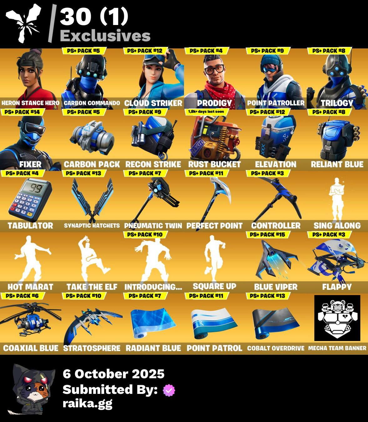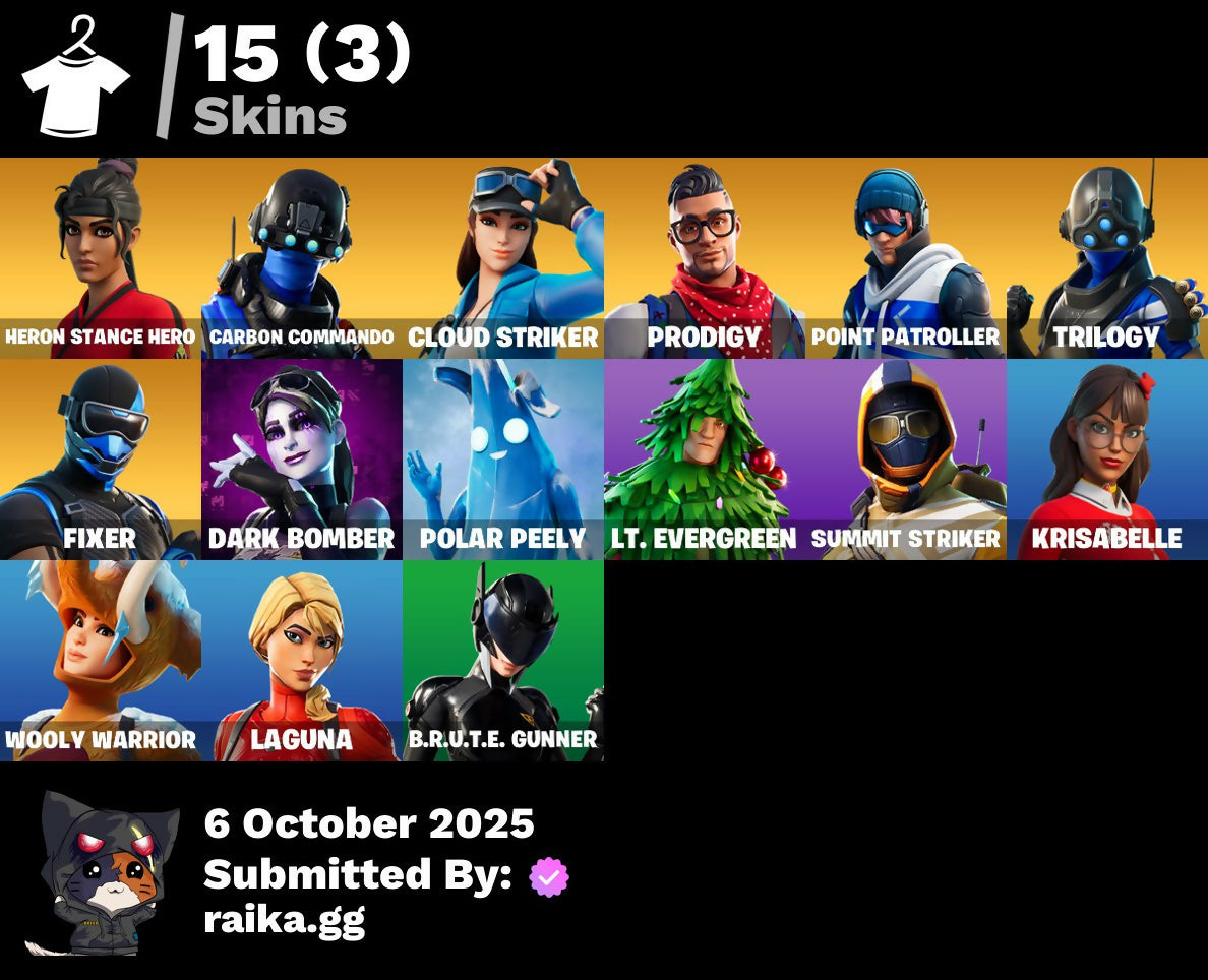 [PC/PSN/XBOX] 15 skins | Heron Stance Hero | Carbon Commando | Cloud Striker | Prodigy | Point Patroller | Trilogy | Fixer | Dark Bomber | Polar Peely | 0 VB / FN