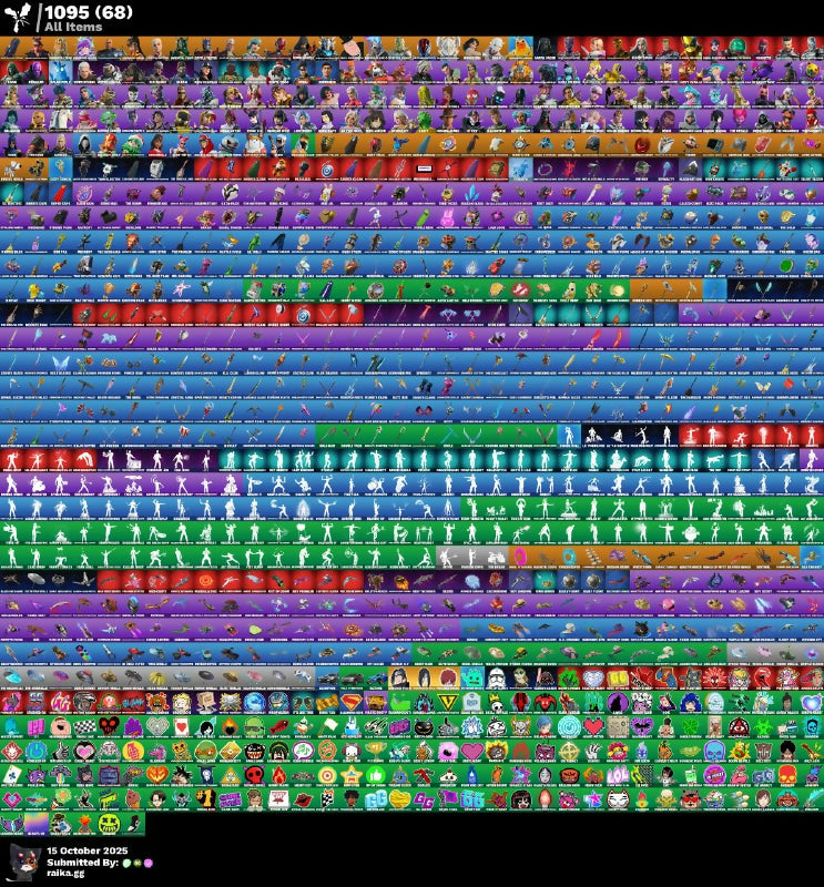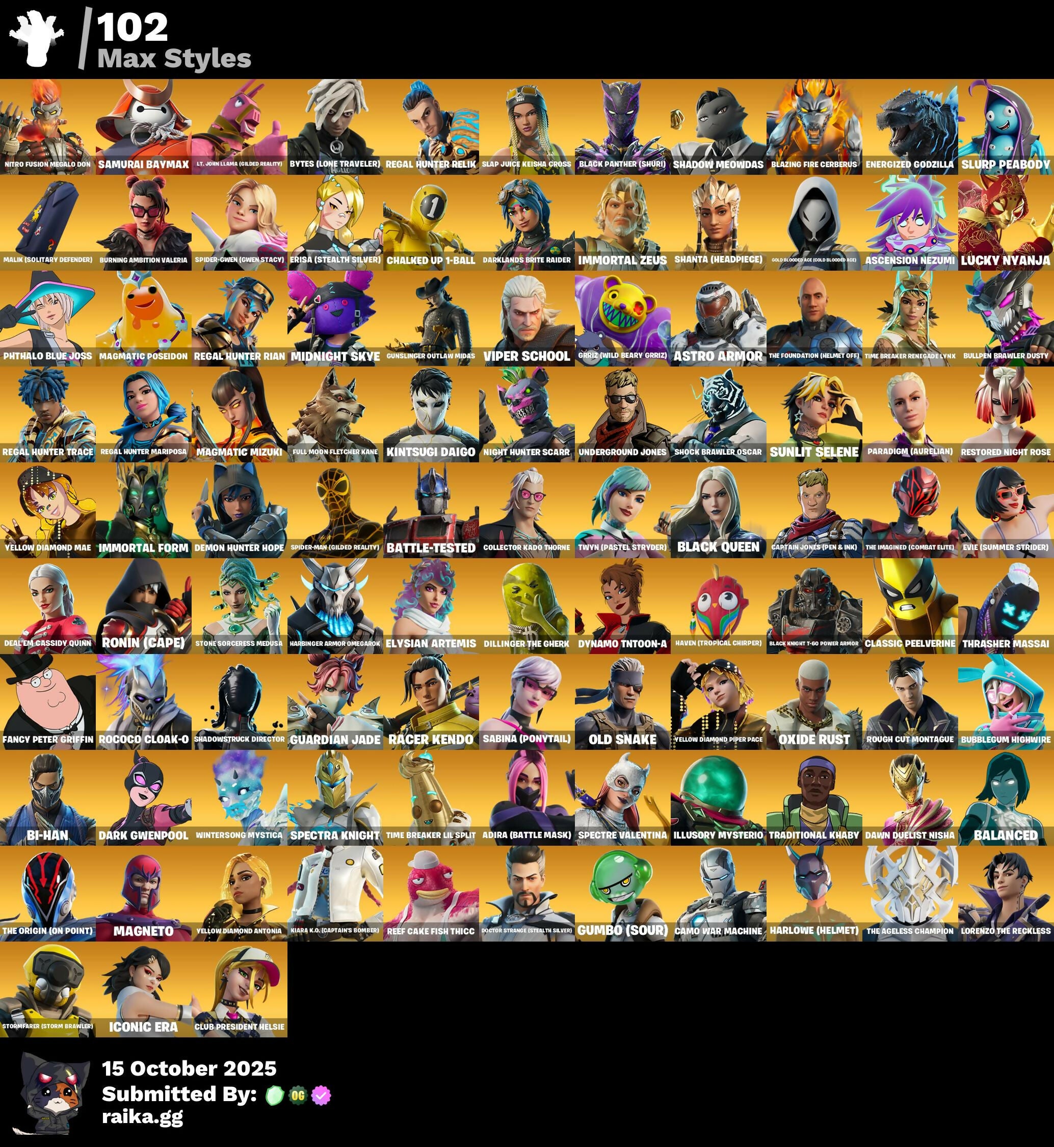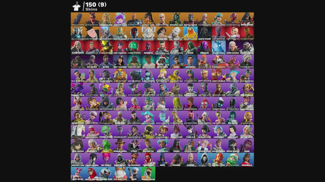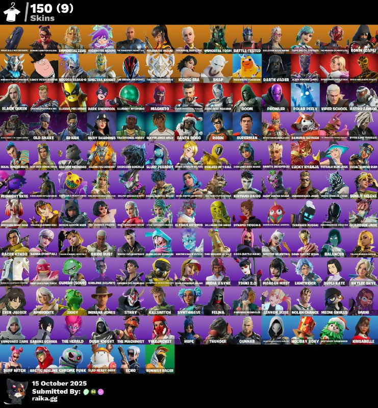 Adira (Battle Mask), Adira Battle Mask, Agent Jones, Agent Peely, Aphrodite, Aquaman, Arctic Adeline, Ascension Nezumi, Ascension Rezumi, Assault Rifle, Astro Armor, Balanced, Bandage, Base Jumper, Batman, Battle-Tested, Bi-Han, Big Shield, Black Knight, Black Knight T-60 Power Armor, Black Panther (Shuri), Black Queen, Blazing Fire Cerberus, Blizzard Brella, Boogie Bomb, Brainiac, Brat, Brave Secret Warstein, Brite Bomber, Brutus, Bubblegum Highwire, Buddy, Bug Spray, Bullpen Brawler Dusty, Bunker Jonesy, Burning Ambition Valeria, Burst Assault Rifle, Bush, Bytes (Lone Traveler), Bytes Come Traveler, Calamity, Camo War Machine, Campfire, Captain Jones (Pen & Ink), Celestial Kiju Ryoko, Chalked Up 1-Ball, Chilled Up T-Ball, Chrome Punk, Chug Jug, Classic Devil Versio, Classic Peelverine, Club President Helsie, Codename Elf, Collector Kado Thorne, Combat Shotgun, Convergence, Crossbow, Crowbar, Cuddle Team Leader, Cyber Panther, DJ Yonder, Dark Gwenpool, Dark Killing Bot X11, Dark Knight Kiera, Darklands Brite Raider, Darth Vader, Dawn Duelist Nisha, Deadpool, Deal'em Cassidy Quinn, Demon Hunter Hope, Demon Hunter Rose, Desperado, Dillinger The Gherk, Doctor Doom, Doctor Strange, Doctor Strange (Stealth Silver), Dollar Sign The Seeker, Doom, Doomcycle, Double Barrel, Doublecross, Dragon Strike, Drift, Dual Pistols, Dupli-Kate, Durrr Burger, Dusk Knight, Dynamo, Dynamo Tinhead-x, Dynamo Tntoon-A, Echo, Echo Quiet Mothface, Echo Side Hackin, Elysiah Artemis, Elysian Artemis, Energized Godzilla, Era Steeljaw Silver, Eren Jaeger, Erisa (Stealth Silver), Espresso Reptile Joe, Etheral, Evie (Summer Strider), Evil Peely, Fable, Fancy Peter, Fancy Peter Griffin, Felina, Female Hylos Zack Retro, Fish Scales, Fishstick, Flame Wings, Flamethrower, Fogwalker, Full Moon Fletcher Kane, Future Soldier Rada, Gaze, Glided Loki, Glider, Gold Bloodclaw Ace (Gold Bloodclaw RCG), Grandpa Kuma, Grappler, Great Artist, Green Activated Tiger, Grenade Launcher, Groove Jam, Grriz (Wild Beary Grriz), Guardian Jade, Guggimon, Gumbo (Sour), Gumbo Sour, Gunnar, Gunslinger Outlaw Midas, Hakuro Kamen Haku, Hand Cannon, Harbinger Armor OmegaRok, Harlowe (Helmet), Harlowe Helmet, Harpoon Gun, Haven (Tropical Chirper), Haylee Skye, Heavy Sniper, Hikobeon, Holiday Boxy, Hope, Hybrid, Iconic Era, Illusion Mysterio, Illusory Mysterio, Imani, Immortal Form, Immortal Zeus, Impulse Grenade, Indiana Jones, Infinity Gauntlet, Ireida Vayne, Iron Man, Iron Man's Gauntlet, John Wick, Jolly Roger, Judas Specter, Jules, K Troubleshooter, Katana, Kiara K.O. (Captain's Bomber), Kiju Hades Prime, Killswitch, Kintsugi Daigo, Komplex, Kratos, Krisabelle, Lara Croft, Launch Pad, Lennox Rose, Lever Action, Lightbrider, Llama Launcher, Lord of The Sea, Lorenzo The Reckless, Lt. Evergreen, Lt. John Llama (Gilded Reality), Lucky Nyanja, Luna Fire, Luxe, Lynx, Madcap, Magmatic Mizuki, Magmatic Poseidon, Magneto, Magnus, Main Soldier Officer Red, Main Stream Cajun, Malik (Solitary Defender), Mancake, Mashing Possum, Mechanical Legs, Medkit, Meowi Smulls, Meowscles, Mermaid, Midas, Midnight Skye, Mini Shield, Mints Bot Mk. II, Mission 5, Mjolnir, Monstersonic Knight, Morgan Myst, Ms Groove, Mystique, Night Hunter Black, Night Hunter Scarr, Nightshade, Nitro Fusion Megalo Don, Nolan Chance, Obi Wan Kenobi, Old Snake, Omega, Oxide Rust, Pandamon Shurikron, Pandamonium Donkeykong, Paradigm (Aurelian), Phthalo Blue Joss, Poisoned Flower Cherry, Poke, Polar Peely, Power Glove, Prowler, Pump Shotgun, Punk, Pythalo Blue Boss, Quad Launcher, Rabble Legion Mcgraves, Racer Kendo, Raptor, Red Knight, Reef Cake Fish Thicc, Regal Hunter Mariposa, Regal Hunter Rain, Regal Hunter Relik, Regal Hunter Rian, Regal Hunter Royal, Regal Hunter Trace, Restored Night Rose, Rift-To-Go, Robin, Robo Runner, Rocket Launcher, Rococo Cloak-O, Rogodo Cloak-Q, Ronin (Cape), Ronin Cape, Rough Cut Montague, Rox, Ruby Shadows, Runway Racer, Sabina (Ponytail), Salina Ponytail, Samurai Baymax, Santa Dogg, Sasuke Uchina, Scoundrel, Sergeant Winter, Serona Artemis Yumi, Sgt. Winter, Shadow Bomb, Shadow Mammoth, Shadow Meowdas, Shadowstruck Director, Shanta (Headpiece), Shanta (Inaporka), Shatter Dark, Shiny Selected, Shock Brawler Oscar, Shockwave Grenade, Silenced SMG, Siona, Sizzle, Skye, Slap Juice Keisha Cross, Slayer Janke Wildclaw, Sled Ready Guff, Slurp, Slurp Juice, Slurp Peabody, Snap, Snowmando, Solid Gold Midas, Sonic Wave, Spectra Knight, Spectre Valentina, Spider-Gwen (Gwen Stacy), Spider-Man, Spider-Man (Gilded Reality), Stone Sorceress Medusa, Stormfarer (Storm Brawler), Stray, Submachine Gun, Summit Seeker, Sundust Szelene, Sunlit Selene, Sunstrider, Super Ripped, Superman, Suppressed Pistol, Suppressed SMG, Surf Witch, Surf's Up, Synthwave, TNTina, Tactical Bow, Tactical Pistol, Tactical Shotgun, Teddy Bear, Teen Punk Styx, The Ageless Champion, The Builder Leader, The Foundation, The Foundation (Helmet Off), The Harbinger Obsidian, The Herald, The Ice King, The Imagined (Combat Elite), The Machinist, The Mandalorian, The Orbish Dev Point, The Origin (On Point), The Reaper, The Scientist, The Sleepless Surfer, The Wonder Years Ryu, Thor, Thrasher Massai, Thunder, Thundurance Nyree Pick, Time Breaker Lil'Split, Time Breaker Renegade Lynx, Toxic Trooper, Traditional Khaby, Traditional Mask, Trog, Tsunki 2.0, Twyn (Pastel Stryder), Umbrella, Underground Jones, Valhalla Ice Mizuki, Valkyrie Shogun, Valor, Vanguard Zadie, Victory Umbrella, Viper School, Viral Lord, Wintersong Mystica, Wolverine, Wolverine Claws, Yellow Diamond Antonia, Yellow Diamond Mae, Yellow Diamond Piper Pace, Yulejacket, Ziggy, Zypher