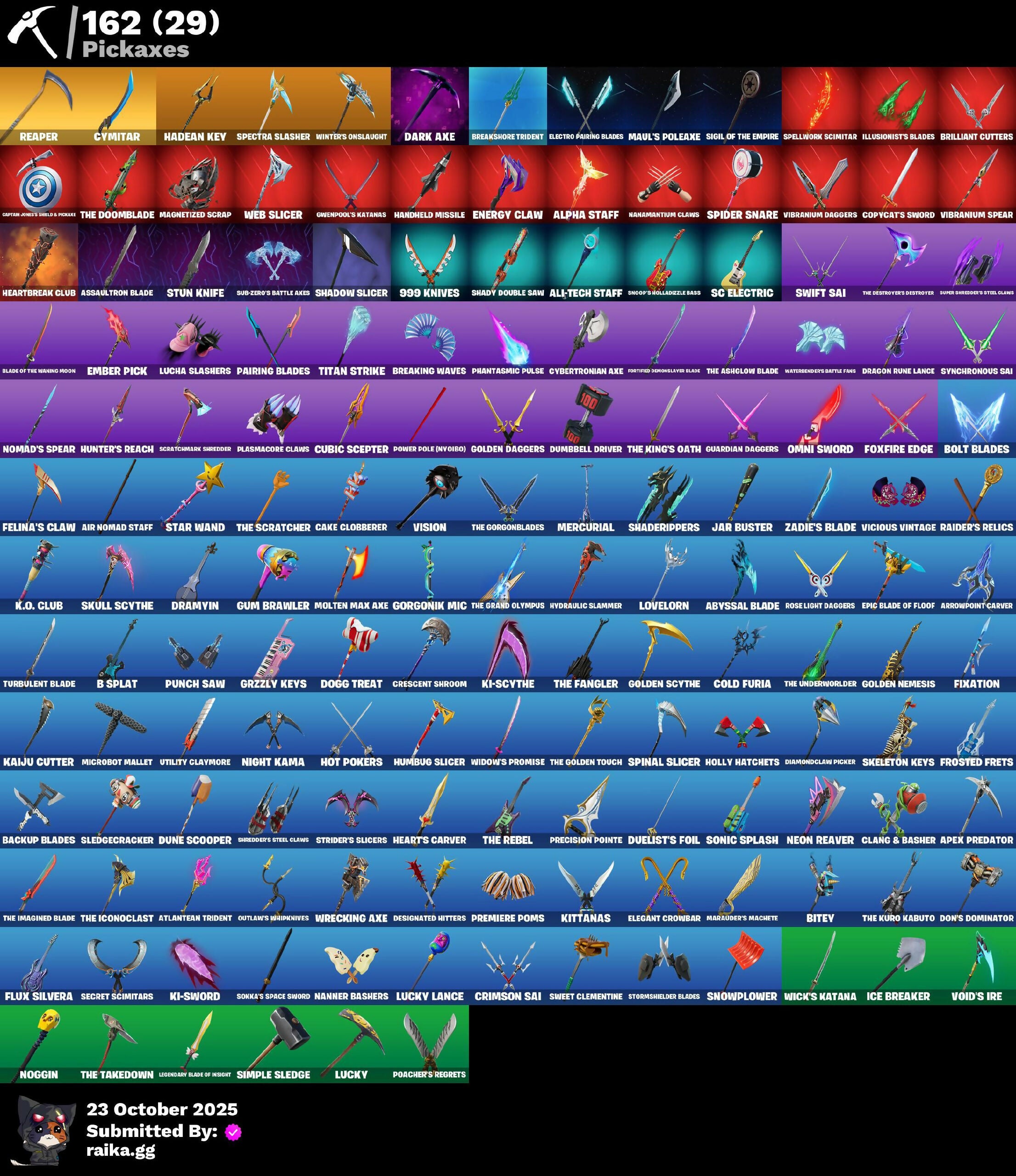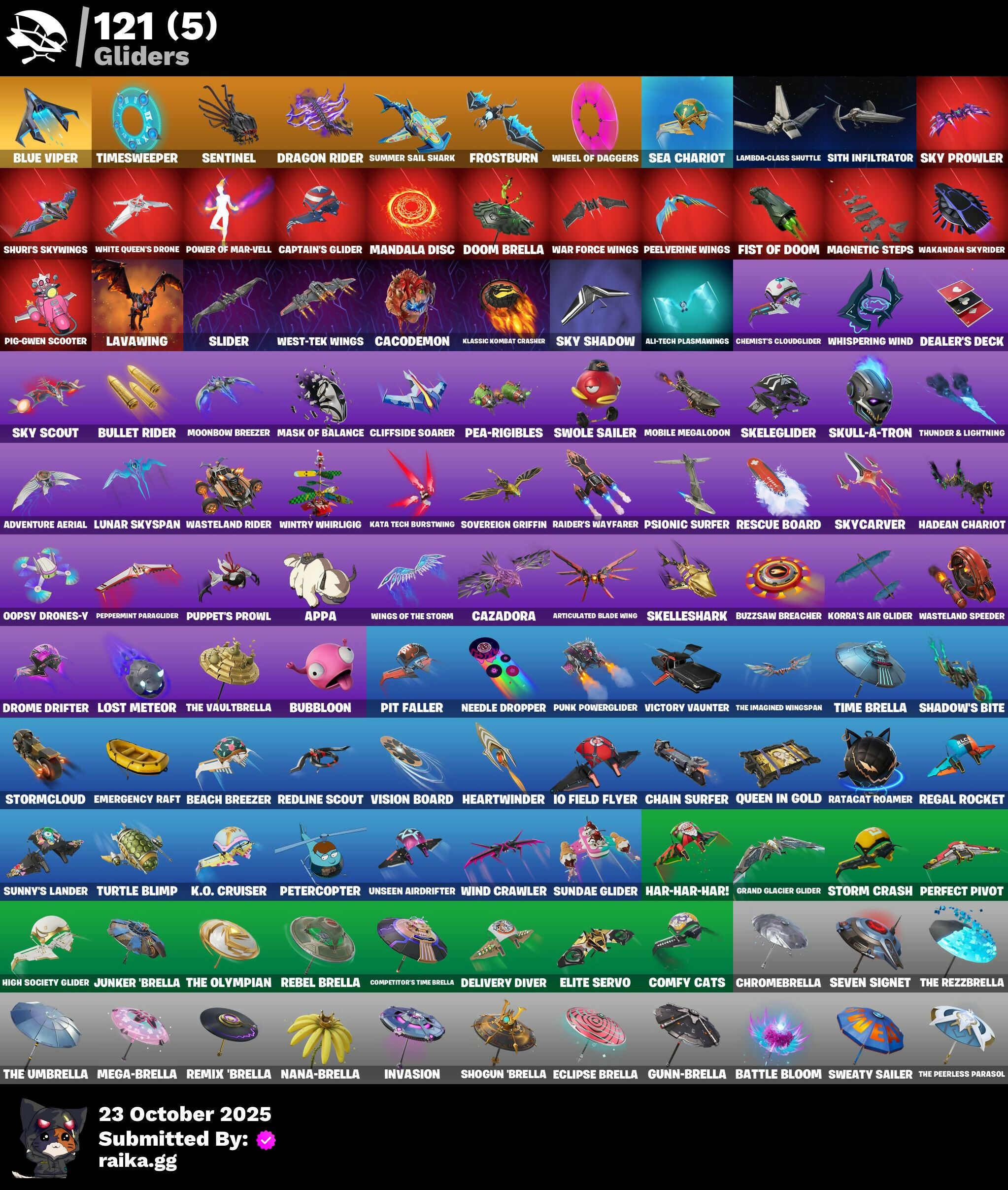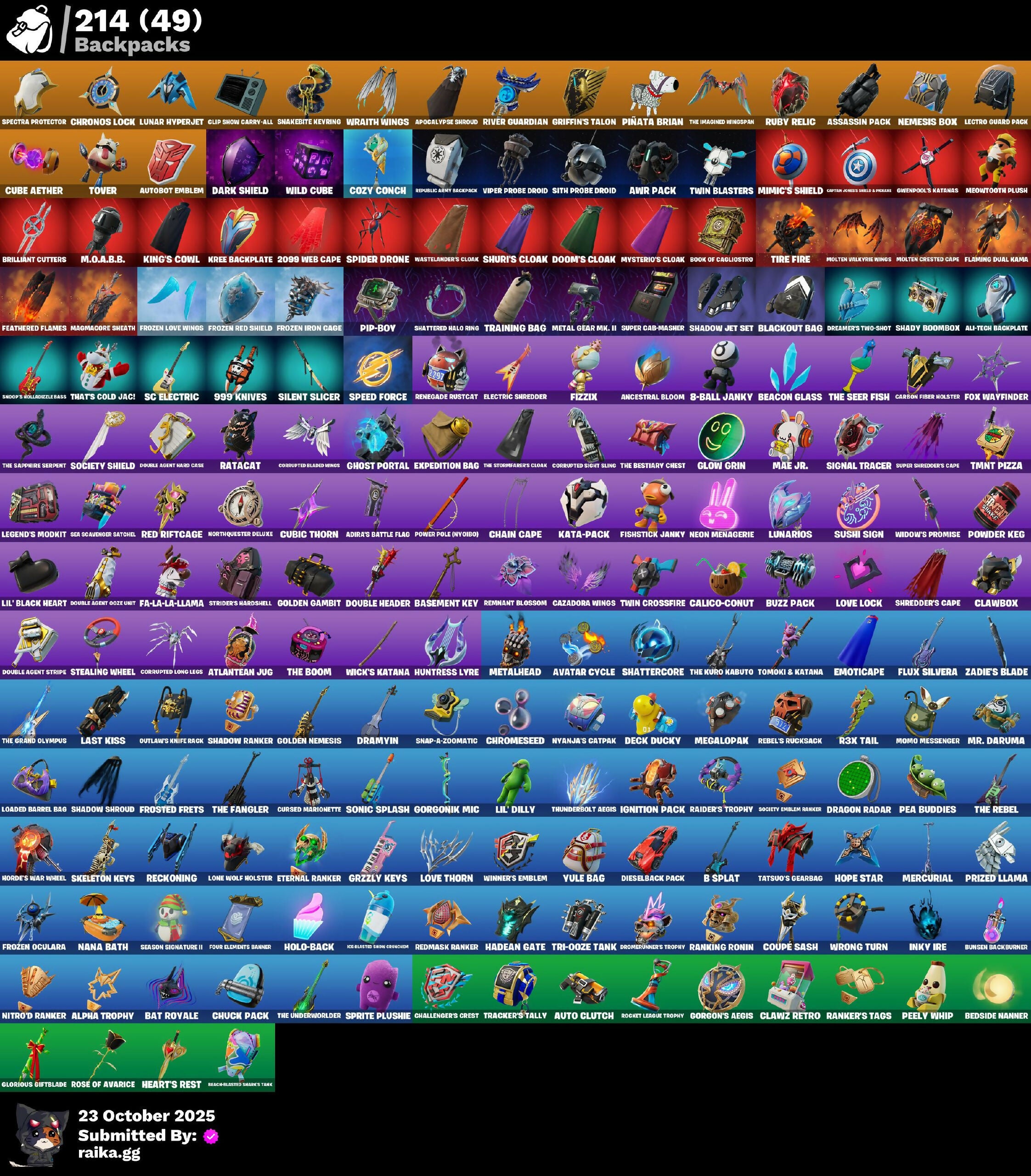 (Snikt!), 10 Field Flyer, 2.O'S Revenge, 2022, 2099 Web Cape, 8-Ball Janky, 999 Knives, AFK, AWR Pack, Aang, Aang's Air Sphere, Absenz, Abyssal Blade, Adira, Adira's Armor, Adira's Battle Flag, Adventure Aerial, Aerial, Aerial Classic, Aerial Swagger, Ahsoka's Clone Trooper, Air Nomad Staff, Ali-A, Ali-Tech Staff, All-Nighter, All-Tech Backplate, All-Tech Plasmawings, Alpha Staff, Alpha Trophy, Ancestral Bloom, Apex Predator, Aphrodite, Apocalypse Shroud, Appa, Arcade Cat, Arctic Adeline, Armored Victory, Arrowpoint Carver, Artemis, Articulated Blade Wing, Assassin, Assassin Pack, Assault Trooper, Assaultron Blade, Atlantean Jug, Atlantean Trident, Auntie Dot, Auto Clutch, Autobot, Autobot Emblem, Avatar Aang, Avatar Cycle, Avatar State Aang, Avatar's Flourish, B Splat, B.R.U.T.E. Competitor, Backup Blades, Balanced, Baron's Hoard, Basement Key, Bat Royale, Battle Bloom, Battle Mode, Battle Prep, Battle Prep: Super, Battle Ready Era, Battle-Tested, Beach Breezer, Beach-Busted Shark's Tank, Beacon Glass, Bear Hug, Bedside Nanner, Beerus, Big Fan, Big Guns, Bike To Go, Birthday Bud, Bitey, Bitter Sweets, Black Panther, Black Panther (Shuri), Black Queen, Blackout Bag, Blade Of The Waning Moon, Blazing Fire Cerberus, Blocko, Blowin' Up, Blue Viper, Bolt Blades, Bombastic Winterfest, Book of Cagliostro, Boosting Ki, Boot It, Breaking Waves, Breakshore Trident, Brilliant Cutters, Bring It, Brite & Speedy, Brite Moves, Brite Raider, Bubblegum Highwire, Bubbloon, Bullet Rider, Bumgen Backburner, Burning Ambition Valeria, Bushie Bright, Buttoned Up, Buzz Pack, Buzzsaw Breacher, Bytes' Sigil, Cacodemon, Cake Clobberer, Calico Holiday, Calico-Conut, Camo War Machine, Cap K.O., Captain Jesse's Shield & Pickax, Captain Jones, Captain Jones's Shield & Pickaxe, Captain Llamerica, Captain Marvel, Captain's Glider, Carbon Fiber Holster, Card Drop, Cazadora, Cazadora Wings, Cerberus, Cerberus Bite, Cerberus Medallion, Chain Cape, Chain Surfer, Challenger Cerberus, Challenger's Crest, Chaos Directive, Chaos Double Agent, Charlotte's Logo, Chef's Special, Chemist's Cloudglider, Choice Knit, Chomp Cudi!, Choose Naughty, Choppy, Chrome Marked, Chrome Punk, Chromebrella, Chromeseed, Chronos Lock, Chuck Pack, Chun-Li, Clang & Basher, Clara, Clash, Classic Age, Classic Peelverine, Clawbox, Clawz Retro, Cliffside Soarer, Clip Show Carry-All, Clone Trooper, Codsworth's Cleanup, Cold Furia, Combat Elite, Combat Giller, Comfy Cats, Competitor Medusa, Competitor's Time Brella, Conch Call, Conjure Weapon, Conjuring Mysterio, Contour Camo, Controlled Focus, Copines, Copycat's Sword, Corrosive Stripe, Corrosive Tag, Corrupted Arachne, Corrupted Bladed Wings, Corrupted Insight, Corrupted Long Legs, Corrupted Shogun, Corrupted Sight Sling, Coruscant Guard, Count It!, Coupé Sash, Courageous Mikasa, Cozy Conch, Crash Test, Crashed Chiller, Crashed Shield, Crescent Shroom, Crimson Sai, Crowning Achievement, Cube Aether, Cubic Scepter, Cubic Thorn, Cuddle's Garden, Curling Iron, Cursed Marionette, Cybertronian Axe, Cyclo Curl, Cymitar, D.C. 63, Dagger Dance, Daisies, Dark Axe, Dark Gwenpool, Dark Jonesy, Dark Red Knight, Dark Shield, Dark Side Rising, Dark Wild Card, Darth Maul, Darth Shader, Darth Vader, Dawn Duelist Nisha, Dealer's Deck, Deck Ducky, Deku, Delivery Diver, Demons Beware, Designated Hitters, Destroyer Signature, Determined Korra, Determined Renegade, Diamond Throne, Diamondclaw Picker, Dieselback Pack, Disassemble, Do The Split, Doctor Strange, Dogg Treat, Don Target, Don of the Wastes, Don's Dominator, Doom, Doom Brella, Doom's Cloak, Double Agent Hard Case, Double Agent Hush, Double Agent Ooze Unit, Double Agent Stripe, Double Agent Wildcard, Double Header, Doze Dab, Dragon Radar, Dragon Rider, Dragon Rune Lance, Dragon Rune Lances, Dragon Spirit, Dramatic Flares, Dramyin, Dreamer's Two-Shot, Drome Drifter, Dromedriver's Trophy, Drones-V View, Duelist's Foil, Dumbbell Driver, Dummy, Dune Scooper, Dynamic Tintina, Eclipse Brella, Electric Shredder, Electro Pairing Blades, Elegant Crowbar, Elemental Cycle, Elite Servo, Elysian Artemis, Elysium, Ember Pick, Emergency Raft, Emma Frost, Emma's Influence, Emoticape, Empress Fan Dance, Energy Claw, Ensnared, Epic Blade Of Floof, Era, Eren Jaeger, Eren's Faceoff, Erisa, Erisa Alert, Erisa's Crest, Eternal Hunt, Eternal Ranker, Everybody Loves Me, Evie, Expedition Bag, Expressionism, Eye of Agamotto, Fa-La-La-Llama, Fan Attack, Fancy Peter Griffin, Fang Dance, Feathered Flames, Felina, Felina's Claw, Feral Finisher, Final Eclipse, Final Harbinger, Fire Show, Fireworks Salvo, Fishdrift, Fishstick Janky, Fist Bump, Fist Of Doom, Fixation, Fixer, Fizzix, Flaming Dual Kama, Flash of Lightning, Flashback Breakdown, Flood, Flux Silvera, Focus, Foil Flex, Forsaken Eye, Fortified Demonslayer Blade, Four Elements Banner, Fox Wayfinder, Foxfire Edge, Frostburn, Frosted Frets, Frozen Iron Cage, Frozen Love Ranger, Frozen Love Wings, Frozen Oculara, Frozen Over, Frozen Raven, Frozen Red Knight, Frozen Red Shield, Full Tilt, Fusion!, G1 Optimus Prime, GG Cuddlez, Galactic Roundel, Geared Up, Get Griddy, Get Out Of Your Mind, Ghost Portal, Gila Classic, Gilded Heart, Glorious Giftblade, Glory to Latveria, Glow Grin, Goku Black, Golden Daggers, Golden Gambit, Golden Goal, Golden Nemesis, Golden Scythe, Golden Wolf, Gorgon's Aegis, Gorgonik Mic, Grand Glacier Glider, Griffin's Talon, Grim King Hades, Gringle Gift, Grizzly Keys, Ground Pound, Grriz, Grzzly Keys, Guardian Daggers, Gucci Was Here, Gum Brawler, Gumbo, Gunmetal Idol, Gunn-Brella, Gunnar, Gunnar's Special, Gwen-Step, Gwenpool, Gwenpool's Glee, Gwenpool's Katanas, Gwettermann Jacket, Hadean Chariot, Hadean Gate, Hadean Key, Hades, Hades Insignia, Hand Of Trace, Hand Signals, Handheld Missile, Har-Har-Har!, Harbinger Armor Omegakok, Harbinger of Victory, Haute Hustle, Haven, Heart Collector, Heart's Carver, Heart's Desire, Heart's Rest, Heartbreak Club, Heartbreak Ranger, Heartbreaker Aphrodite, Heartburst, Heartwinder, H