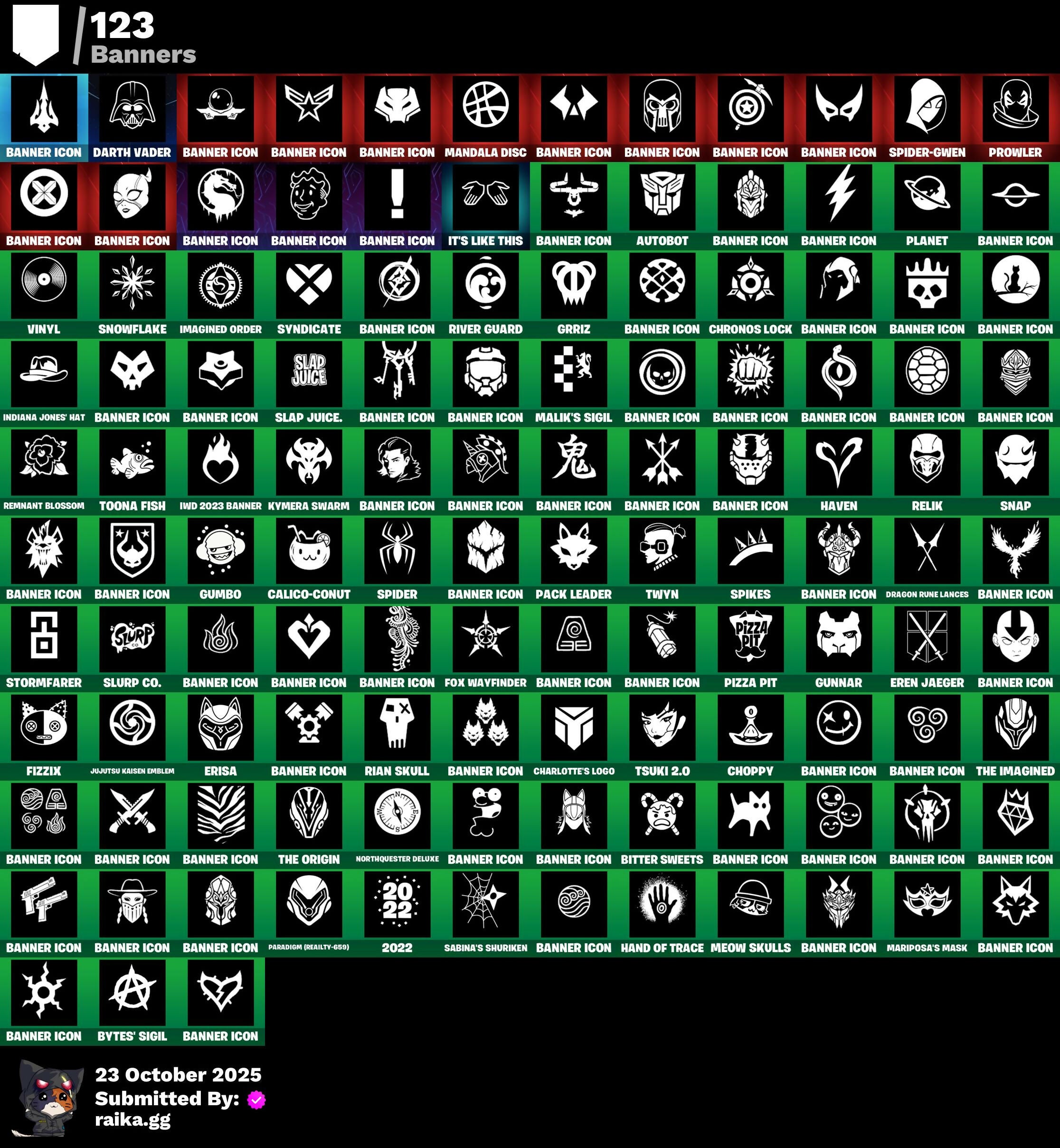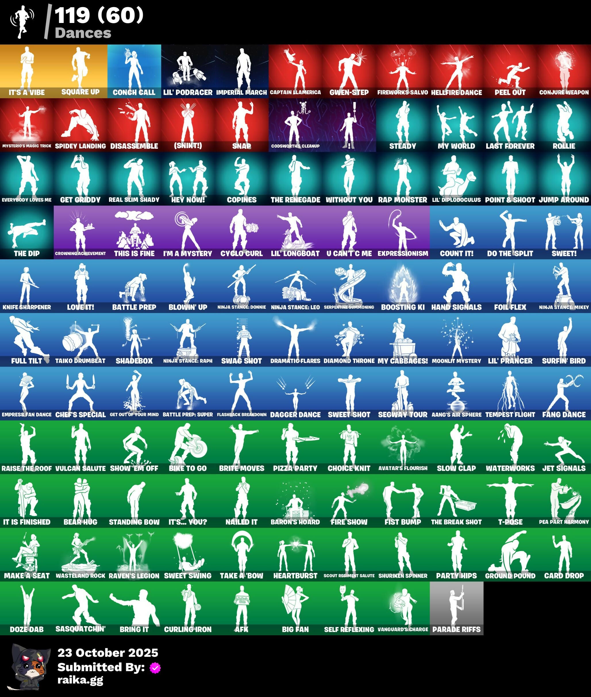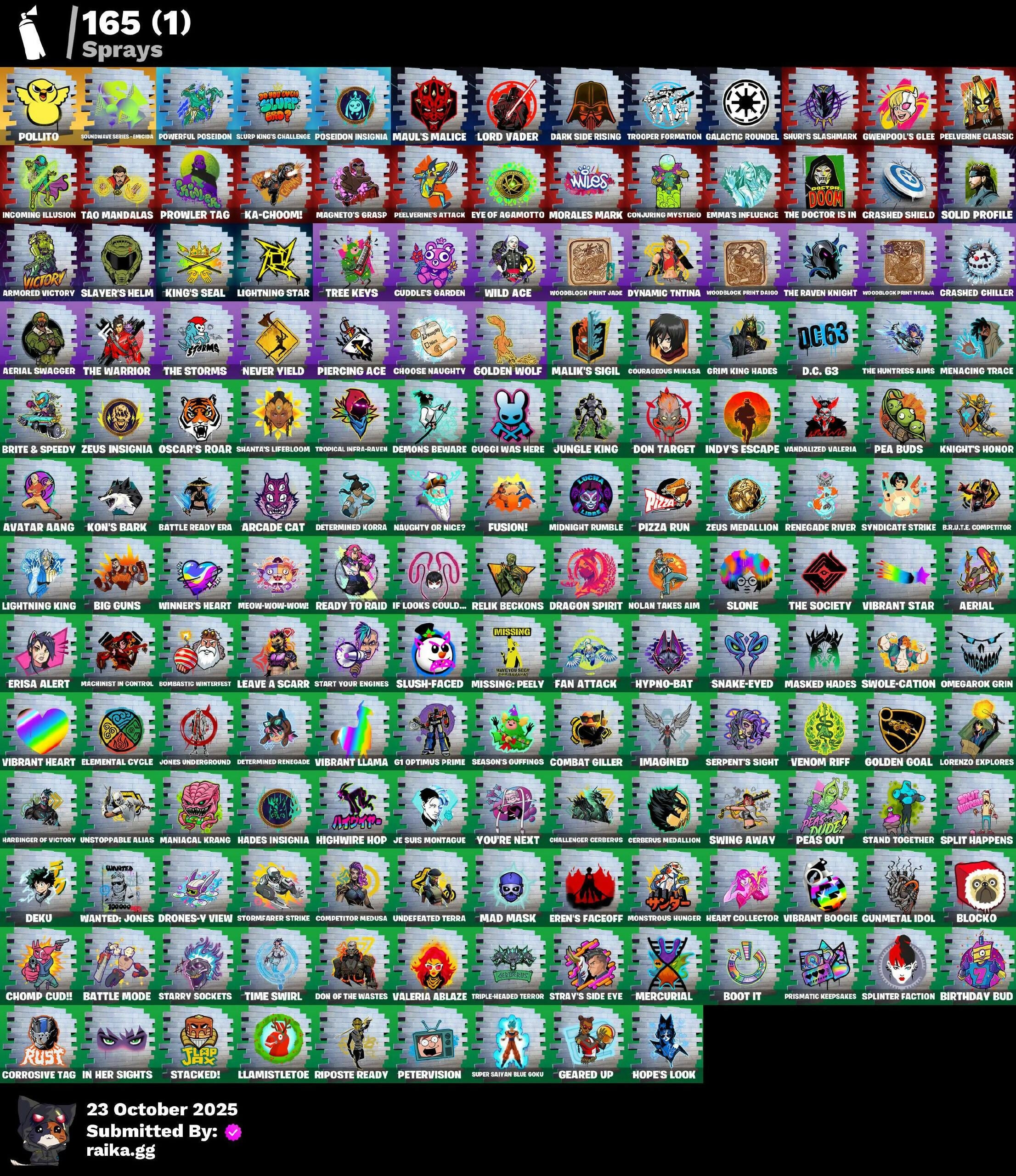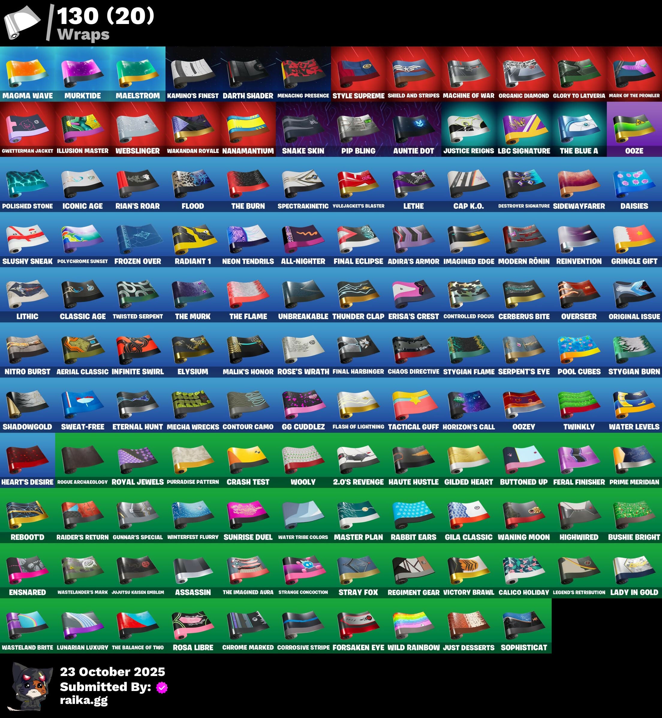 (Snikt!), 10 Field Flyer, 2.O'S Revenge, 2022, 2099 Web Cape, 8-Ball Janky, 999 Knives, AFK, AWR Pack, Aang, Aang's Air Sphere, Absenz, Abyssal Blade, Adira, Adira's Armor, Adira's Battle Flag, Adventure Aerial, Aerial, Aerial Classic, Aerial Swagger, Ahsoka's Clone Trooper, Air Nomad Staff, Ali-A, Ali-Tech Staff, All-Nighter, All-Tech Backplate, All-Tech Plasmawings, Alpha Staff, Alpha Trophy, Ancestral Bloom, Apex Predator, Aphrodite, Apocalypse Shroud, Appa, Arcade Cat, Arctic Adeline, Armored Victory, Arrowpoint Carver, Artemis, Articulated Blade Wing, Assassin, Assassin Pack, Assault Trooper, Assaultron Blade, Atlantean Jug, Atlantean Trident, Auntie Dot, Auto Clutch, Autobot, Autobot Emblem, Avatar Aang, Avatar Cycle, Avatar State Aang, Avatar's Flourish, B Splat, B.R.U.T.E. Competitor, Backup Blades, Balanced, Baron's Hoard, Basement Key, Bat Royale, Battle Bloom, Battle Mode, Battle Prep, Battle Prep: Super, Battle Ready Era, Battle-Tested, Beach Breezer, Beach-Busted Shark's Tank, Beacon Glass, Bear Hug, Bedside Nanner, Beerus, Big Fan, Big Guns, Bike To Go, Birthday Bud, Bitey, Bitter Sweets, Black Panther, Black Panther (Shuri), Black Queen, Blackout Bag, Blade Of The Waning Moon, Blazing Fire Cerberus, Blocko, Blowin' Up, Blue Viper, Bolt Blades, Bombastic Winterfest, Book of Cagliostro, Boosting Ki, Boot It, Breaking Waves, Breakshore Trident, Brilliant Cutters, Bring It, Brite & Speedy, Brite Moves, Brite Raider, Bubblegum Highwire, Bubbloon, Bullet Rider, Bumgen Backburner, Burning Ambition Valeria, Bushie Bright, Buttoned Up, Buzz Pack, Buzzsaw Breacher, Bytes' Sigil, Cacodemon, Cake Clobberer, Calico Holiday, Calico-Conut, Camo War Machine, Cap K.O., Captain Jesse's Shield & Pickax, Captain Jones, Captain Jones's Shield & Pickaxe, Captain Llamerica, Captain Marvel, Captain's Glider, Carbon Fiber Holster, Card Drop, Cazadora, Cazadora Wings, Cerberus, Cerberus Bite, Cerberus Medallion, Chain Cape, Chain Surfer, Challenger Cerberus, Challenger's Crest, Chaos Directive, Chaos Double Agent, Charlotte's Logo, Chef's Special, Chemist's Cloudglider, Choice Knit, Chomp Cudi!, Choose Naughty, Choppy, Chrome Marked, Chrome Punk, Chromebrella, Chromeseed, Chronos Lock, Chuck Pack, Chun-Li, Clang & Basher, Clara, Clash, Classic Age, Classic Peelverine, Clawbox, Clawz Retro, Cliffside Soarer, Clip Show Carry-All, Clone Trooper, Codsworth's Cleanup, Cold Furia, Combat Elite, Combat Giller, Comfy Cats, Competitor Medusa, Competitor's Time Brella, Conch Call, Conjure Weapon, Conjuring Mysterio, Contour Camo, Controlled Focus, Copines, Copycat's Sword, Corrosive Stripe, Corrosive Tag, Corrupted Arachne, Corrupted Bladed Wings, Corrupted Insight, Corrupted Long Legs, Corrupted Shogun, Corrupted Sight Sling, Coruscant Guard, Count It!, Coupé Sash, Courageous Mikasa, Cozy Conch, Crash Test, Crashed Chiller, Crashed Shield, Crescent Shroom, Crimson Sai, Crowning Achievement, Cube Aether, Cubic Scepter, Cubic Thorn, Cuddle's Garden, Curling Iron, Cursed Marionette, Cybertronian Axe, Cyclo Curl, Cymitar, D.C. 63, Dagger Dance, Daisies, Dark Axe, Dark Gwenpool, Dark Jonesy, Dark Red Knight, Dark Shield, Dark Side Rising, Dark Wild Card, Darth Maul, Darth Shader, Darth Vader, Dawn Duelist Nisha, Dealer's Deck, Deck Ducky, Deku, Delivery Diver, Demons Beware, Designated Hitters, Destroyer Signature, Determined Korra, Determined Renegade, Diamond Throne, Diamondclaw Picker, Dieselback Pack, Disassemble, Do The Split, Doctor Strange, Dogg Treat, Don Target, Don of the Wastes, Don's Dominator, Doom, Doom Brella, Doom's Cloak, Double Agent Hard Case, Double Agent Hush, Double Agent Ooze Unit, Double Agent Stripe, Double Agent Wildcard, Double Header, Doze Dab, Dragon Radar, Dragon Rider, Dragon Rune Lance, Dragon Rune Lances, Dragon Spirit, Dramatic Flares, Dramyin, Dreamer's Two-Shot, Drome Drifter, Dromedriver's Trophy, Drones-V View, Duelist's Foil, Dumbbell Driver, Dummy, Dune Scooper, Dynamic Tintina, Eclipse Brella, Electric Shredder, Electro Pairing Blades, Elegant Crowbar, Elemental Cycle, Elite Servo, Elysian Artemis, Elysium, Ember Pick, Emergency Raft, Emma Frost, Emma's Influence, Emoticape, Empress Fan Dance, Energy Claw, Ensnared, Epic Blade Of Floof, Era, Eren Jaeger, Eren's Faceoff, Erisa, Erisa Alert, Erisa's Crest, Eternal Hunt, Eternal Ranker, Everybody Loves Me, Evie, Expedition Bag, Expressionism, Eye of Agamotto, Fa-La-La-Llama, Fan Attack, Fancy Peter Griffin, Fang Dance, Feathered Flames, Felina, Felina's Claw, Feral Finisher, Final Eclipse, Final Harbinger, Fire Show, Fireworks Salvo, Fishdrift, Fishstick Janky, Fist Bump, Fist Of Doom, Fixation, Fixer, Fizzix, Flaming Dual Kama, Flash of Lightning, Flashback Breakdown, Flood, Flux Silvera, Focus, Foil Flex, Forsaken Eye, Fortified Demonslayer Blade, Four Elements Banner, Fox Wayfinder, Foxfire Edge, Frostburn, Frosted Frets, Frozen Iron Cage, Frozen Love Ranger, Frozen Love Wings, Frozen Oculara, Frozen Over, Frozen Raven, Frozen Red Knight, Frozen Red Shield, Full Tilt, Fusion!, G1 Optimus Prime, GG Cuddlez, Galactic Roundel, Geared Up, Get Griddy, Get Out Of Your Mind, Ghost Portal, Gila Classic, Gilded Heart, Glorious Giftblade, Glory to Latveria, Glow Grin, Goku Black, Golden Daggers, Golden Gambit, Golden Goal, Golden Nemesis, Golden Scythe, Golden Wolf, Gorgon's Aegis, Gorgonik Mic, Grand Glacier Glider, Griffin's Talon, Grim King Hades, Gringle Gift, Grizzly Keys, Ground Pound, Grriz, Grzzly Keys, Guardian Daggers, Gucci Was Here, Gum Brawler, Gumbo, Gunmetal Idol, Gunn-Brella, Gunnar, Gunnar's Special, Gwen-Step, Gwenpool, Gwenpool's Glee, Gwenpool's Katanas, Gwettermann Jacket, Hadean Chariot, Hadean Gate, Hadean Key, Hades, Hades Insignia, Hand Of Trace, Hand Signals, Handheld Missile, Har-Har-Har!, Harbinger Armor Omegakok, Harbinger of Victory, Haute Hustle, Haven, Heart Collector, Heart's Carver, Heart's Desire, Heart's Rest, Heartbreak Club, Heartbreak Ranger, Heartbreaker Aphrodite, Heartburst, Heartwinder, H