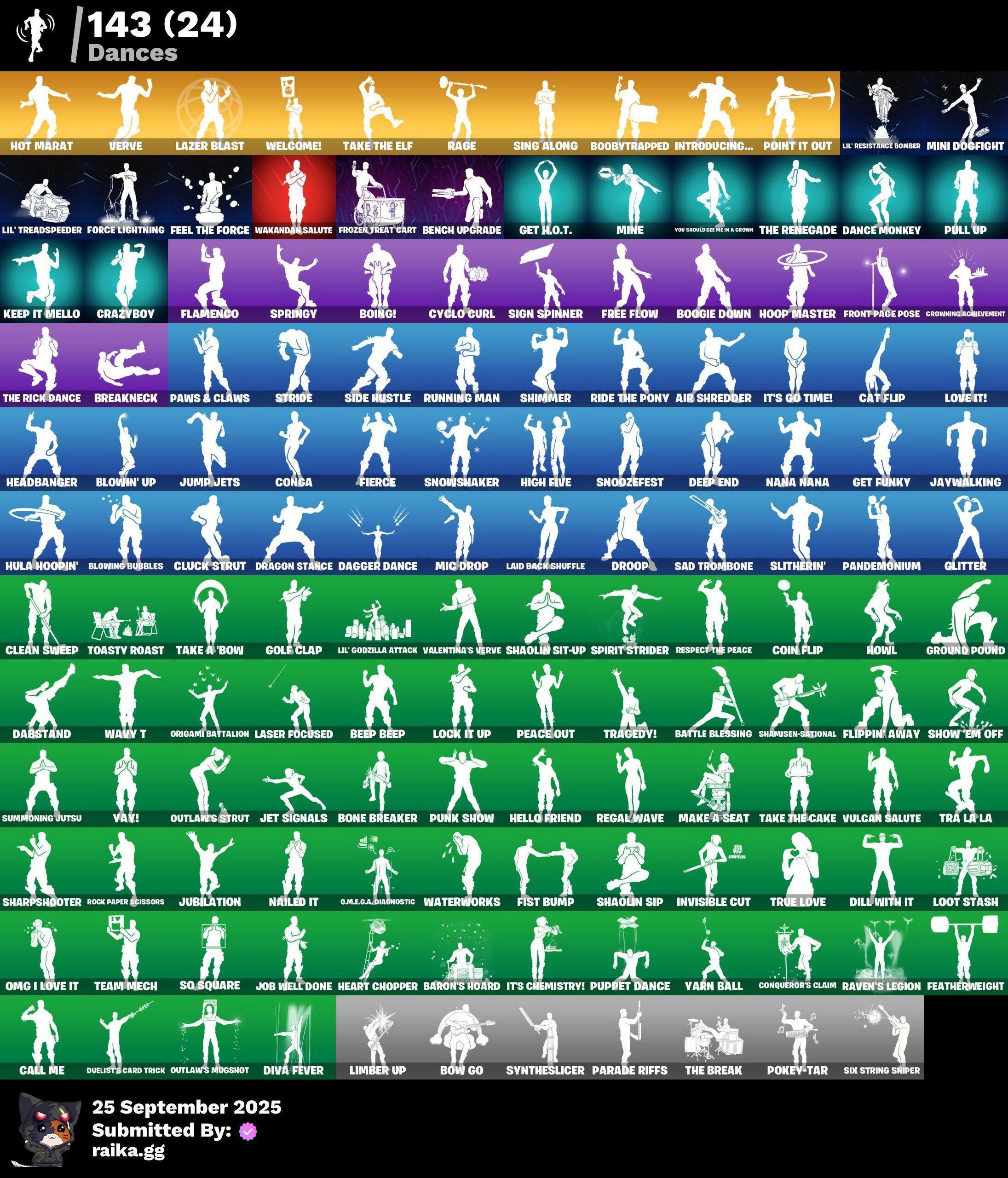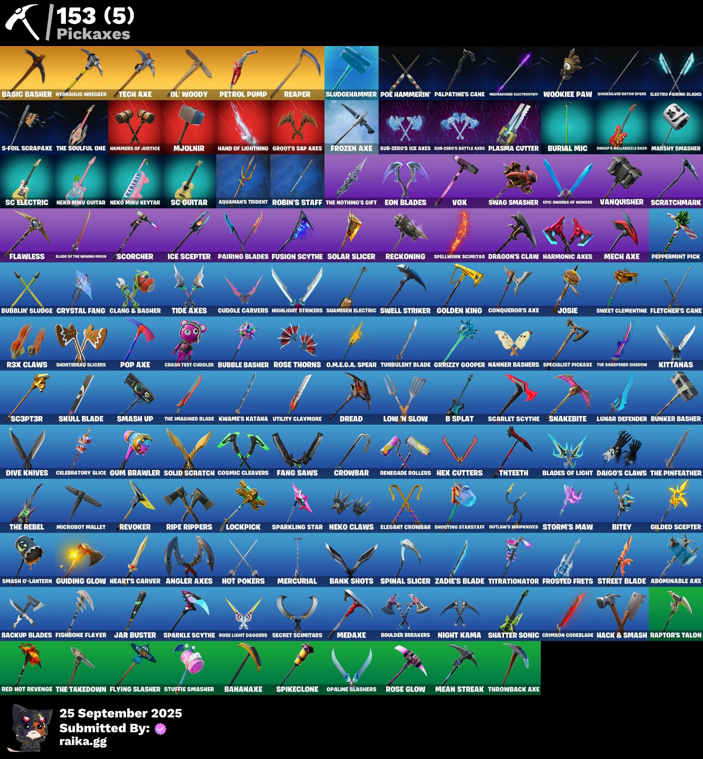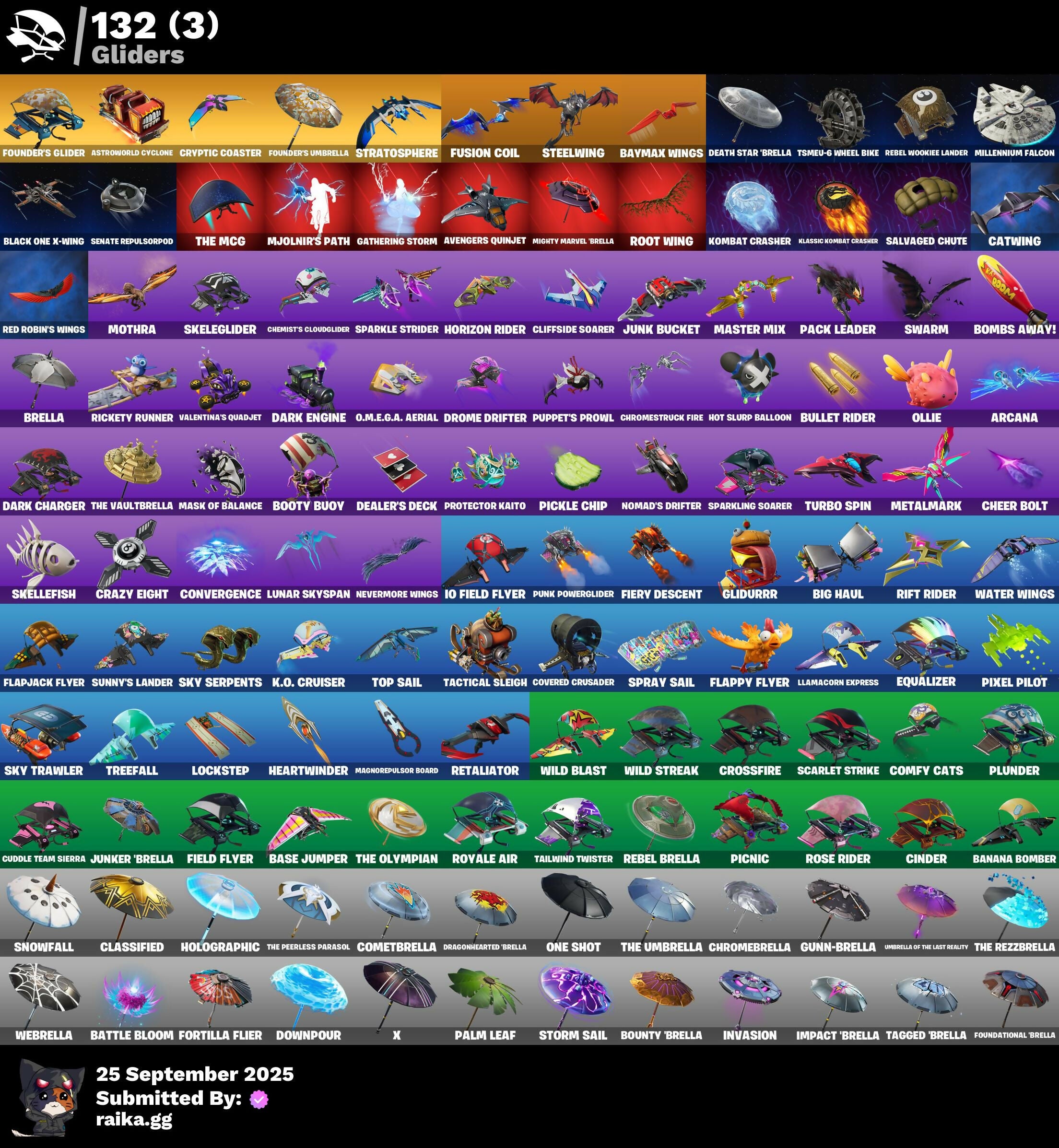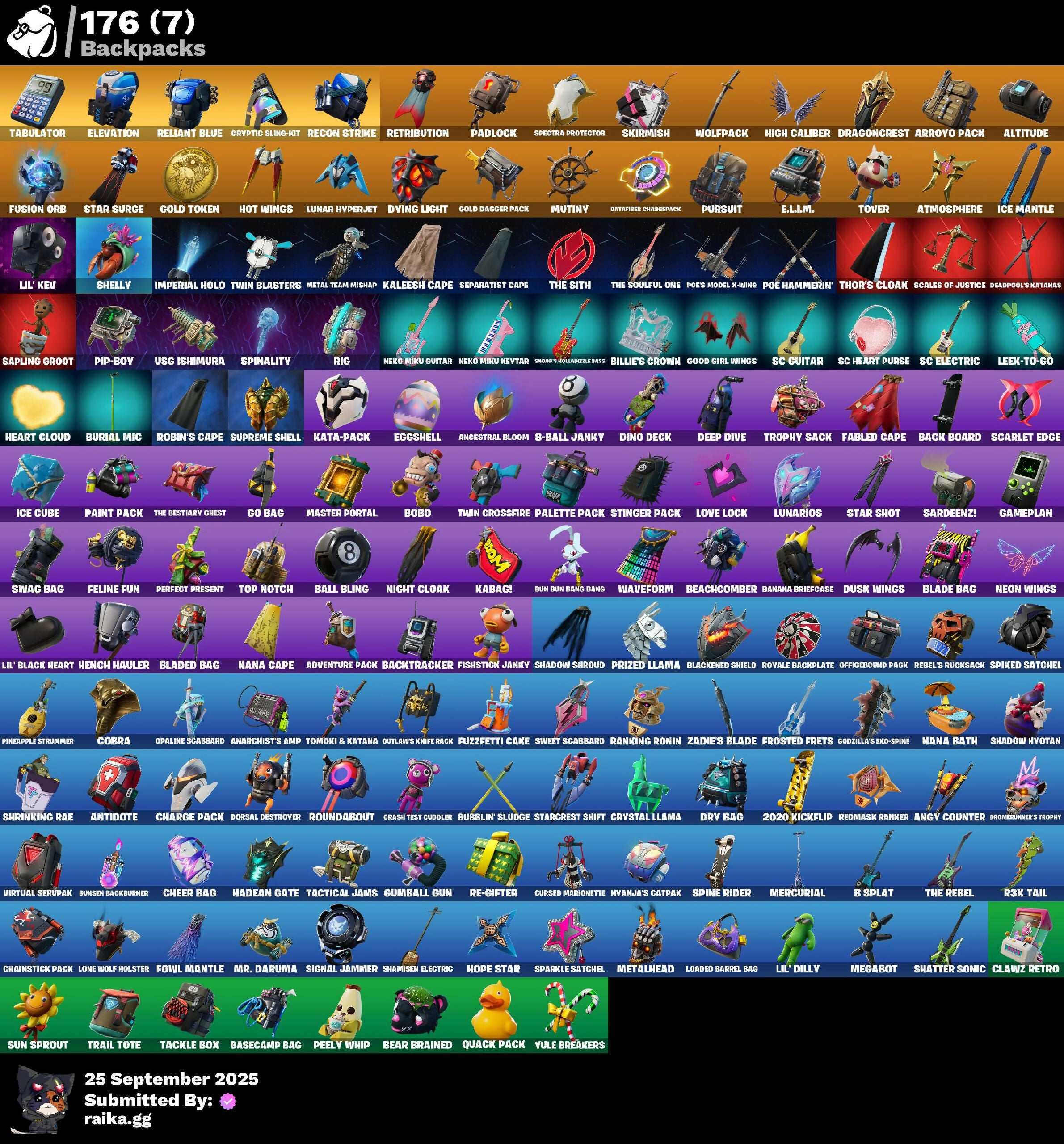 2020 Kickflip, 8-Ball Janky, 8-Ball Vs Scratch, A.I.M., Abominable Axe, Adventure Pack, Agent Peely, Air Shredder, Altitude, Anarchist's Amp, Ancestral Bloom, Angler Axes, Angy Counter, Antidote, Apprentice Evie, Aquaman, Aquaman's Trident, Arcana, Arroyo Pack, Astroworld Cyclone, Atmosphere, Aura, Avengers Quinjet, Ayla Winn, B Splat, Back Board, Backtracker, Backup Blades, Ball Bling, Banana Bomber, Banana Briefcase, Bananaxe, Bank Shots, Baron's Hoard, Base Jumper, Basecamp Bag, Basic Basher, Battle Blessing, Battle Bloom, Baymax Wings, Beachcomber, Bear Brained, Beep Beep, Bench Upgrade, Big Dill, Big Haul, Billie's Crown, Bitev, Black One X-Wing, Blackened Shield, Blackheart, Blade Bag, Blade of the Waning Moon, Bladed Bag, Blades of Light, Blowin' Up, Blowing Bubbles, Bobo, Boing!, Bombs Away!, Bone Breaker, Bones, Boobytrapped, Boogie Down, Booty Buoy, Boulder Breakers, Bounty 'Brella, Bow Go, Breakneck, Breakpoint, Brella, Bubble Basher, Bubblin' Sludge, Bullet Rider, Bun Bun Bang Bang, Bunker Basher, Bunker Jonesy, Bunny Brawler, Bunsen Backburner, Burial Mic, Bytes, Calamity, Call Me, Cameo Vs Chic, Captain Phasma, Carmine Rosso, Cassidy Quinn, Cat Flip, Catalyst, Catwing, Celebratory Slice, Chainstick Pack, Charge Pack, Cheer Bag, Cheer Bolt, Chemist's Cloudglider, Chromebrella, Chromestruck Fire, Cinder, Clang & Basher, Classified, Clawz Retro, Clean Sweep, Cliffside Soarer, Cloud Striker, Cluck Strut, Cobra, Coin Flip, Cometbrella, Comfy Cats, Conga, Conqueror's Axe, Conqueror's Claim, Contract Giller, Convergence, Cosmic Cleavers, Covered Crusader, Crash Test Cuddler, Crazy Eight, Crazyboy, Crimson Codeblade, Crossfire, Crowbar, Crowning Achievement, Cryptic Coaster, Cryptic Sling-Kit, Crystal Fang, Crystal Llama, Cuddle Carvers, Cuddle Team Sierra, Cuddle Team Specialist, Culture Club Commander, Cursed Marionette, Cyclo Curl, DJ Yonder, Dabstand, Dagger Dance, Daigo, Daigo's Claws, Dance Monkey, Dark Charger, Dark Engine, Datafiber Chargepack, Deadpool, Deadpool's Katanas, Dealer's Deck, Death Star 'Brella, Deep Dive, Deep End, Demi, Dill With It, Dino Deck, Dire, Diva Fever, Dive Knives, Dorsal Destroyer, Downpour, Dragon Stance, Dragon's Claw, Dragoncrest, Dragonhearted 'Brella, Dread, Drome Drifter, Dromerunner's Trophy, Droop, Dry Bag, Duelist's Card Trick, Dusk, Dusk Wings, Dying Light, E.L.I.M., Eggshell, Electro Pairing Blades, Elegant Crowbar, Elevation, Ember, Emperor Palpatine, Eon Blades, Epic Swords of Wonder, Equalizer, Eternal Voyager, Evie, Fable, Fabled Cape, Fade, Fang Saws, Featherweight, Feel The Force, Feline Fun, Field Flyer, Fierce, Fiery Descent, Finesse Finisher, Fishbone Flayer, Fishstick Janky, Fist Bump, Flamenco, Flapjack Flyer, Flappy Flyer, Flawless, Fletcher Kane, Fletcher's Cane, Flippin' Away, Flying Slasher, Force Lightning, Fortilla Flier, Foundational 'Brella, Founder's Glider, Founder's Umbrella, Fowl Mantle, Free Flow, Front Page Pose, Frosted Frets, Frozen Axe, Frozen Treat Cart, Fusion, Fusion Coil, Fusion Orb, Fusion Scythe, Fuzzfetti Cake, Gameplan, Gathering Storm, Gear Specialist Maya, General Grievous, Get Funky, Get H.O.T., Ghoul Trooper, Giddy-Up, Gilded Scepter, Glidurrr, Glitter, Glow, Go Bag, Godzilla Evolved, Godzilla's Exo-Spine, Gold Brutus, Gold Dagger Pack, Gold Midas, Gold Token, Golden King, Golf Clap, Good Girl Wings, Green Roots Billie, Groot, Groot's Sap Axes, Ground Pound, Grriz, Grrizzy Gooper, Guiding Glow, Gum Brawler, Gumball Gun, Gunn-Brella, Hack & Smash, Hadean Gate, Hammers of Justice, Hand of Lightning, Harmonic Axes, Haruka of the Masks, Headbanger, Heart Chopper, Heart Cloud, Heart's Carver, Heartwinder, Hello Friend, Hench Hauler, Hero Baymax, Hex Cutters, High Caliber, High Five, Highlight Strikers, Holographic, Hoop Master, Hope Star, Horizon Rider, Hot Marat, Hot Pokers, Hot Slurp Balloon, Hot Wings, Howl, Hula Hoopin', Hybrid, Hydraulic Wrecker, IO Field Flyer, Ice Cube, Ice Mantle, Ice Scepter, Impact 'Brella, Imperial Holo, Introducing..., Invasion, Invisible Cut, Iris, Isaac Clarke, It's Chemistry!, It's Go Time!, Jade, Jar Buster, Jaywalking, Jennifer Walters, Jet Signals, Job Well Done, Josie, Joss, Journey Vs Hazard, Jubilation, Jules, Jump Jets, Junk Bucket, Junker 'Brella, K.O. Cruiser, Kabag!, Kaleesh Cape, Kata-Pack, Keep It Mello, Keisha Cross, Kendo, Kittanas, Klassic Kombat Crasher, Knight Conqueror, Kombat Crasher, Kwame, Kwame's Katana, Laguna, Laid Back Shuffle, Laser Focused, Lazer Blast, Leek-To-Go, Lennox Rose, Lil' Black Heart, Lil' Dilly, Lil' Godzilla Attack, Lil' Kev, Lil' Resistance Bomber, Lil' Treadspeeder, Limber Up, Llamacorn Express, Loaded Barrel Bag, Lock It Up, Lockpick, Lockstep, Lone Wolf Holster, Loot Stash, Love It!, Love Lock, Low 'N Slow, Lt. Evergreen, Lunar Defender, Lunar Hyperjet, Lunar Skyspan, Lunarios, Luxe, Lynx, Magnaguard Electrostaff, Magnorepulsor Board, Make A Seat, Marceline, Marshy Smasher, Mask of Balance, Master Key, Master Mix, Master Portal, Mean Streak, Mech Axe, Mecha R3X, Medaxe, Megabot, Meow Skulls, Meowscles, Mercurial, Metal Team Mishap, Metalhead, Metalmark, Mic Drop, Microbot Mallet, Mighty Marvel 'Brella, Millennium Falcon, Mine, Mini Dogfight, Mjolnir, Mjolnir's Path, Mothra, Mr. Daruma, Mutiny, Nailed It, Nana Bath, Nana Cape, Nana Nana, Nanner Bashers, Neko Claws, Neko Hatsune Miku, Neko Miku Guitar, Neko Miku Keytar, Neon Wings, Nevermore Wings, Night Cloak, Night Kama, Nightshade, Nitelite, Nomad's Drifter, Nyangelica, Nyanja, Nyanja's Catpak, O.M.E.G.A. Aerial, O.M.E.G.A. Diagnostic, O.M.E.G.A. Spear, O.M.E.G.A. Suit Alpha, Ocean, Officebound Pack, Ol' Woody, Ollie, Omg I Love It, One Shot, Onesie, Opaline Scabbard, Opaline Slashers, Origami Battalion, Outlaw Midas, Outlaw's Mugshot, Outlaw's Strut, Outlaw's Whipknives, Outlaws Knife Rack, Pack Leader, Padlock, Paint Pack, Pairing Blades, Palette Pack, Palm Leaf, Palpatine's Cane, Pandemonium, Parade Riffs, Paradigm (Reality-659), Paws & Claws, Peace Out, Peely, Peely Whip, P