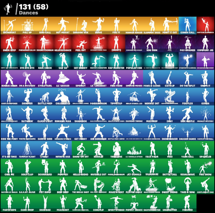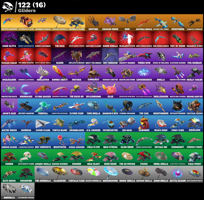 (Snarl), 1-Ball, 100 Percent Angry, 999 Knives, 999 Needles, Abominable Axe, Adventure Pack, Agent Peely, Aile Shredder, Airie, All Right For Dancing, Altitude, Ancestral Bloom, Aphrodite, Apocalyptic Shroud, Arroyo Pack, Articulated Blade Wing, Assaultron Blade, Astronomical Cyclone, Atlas, Auto Clutch, B.E.A.S.T Glove, Back Bloom, Backstabber, Bad Joke, Bait Bones, Balloon Axe, Banana Bomber, Banana Briefcase, Bananaxe, Barber the Showman, Basic Basher, Battle Bloom, Battle Call, Battle Prep, Battle Prep Super, Battlepass Cobra Kit, Baymax Wings, Beach Umbrella, Beachcomber, Beamer, Bedside Manner, Beef Bone, Beef Boss, Beep Beep, Behold!, Big Haul, Bird Call, Blackheart, Blackout Bag, Blades of Light, Bogey Bag, Bolt Blades, Bomb Bouquet, Bombs Away!, Bone Boss, Bone Ravage, Bone Wings, Boogie Down, Brave Bag, Brella, Brilliant Cutters, Brutus, Bunker Jonesy, Bunny Bag, Bye Bye Bye, Calamity, Calculated Nina Stonell Bonus, Call Me, Captain Jones, Captain's Glider, Carbon Fiber Gillette, Card Drop, Catflip, Cc3o Showing Offloaded, Cerberus, Chaos Director, Chaos Scythe, Chaotic Crawler, Charlotte, Chilli-Axe, Cinder, Cinemapolis Katana, Clang & Basher, Classified, Clawbox, Clawz Retro, Cliffside Soarer, Cluck' Strut, Cobalt, Cobra, Coin Flip, Cold Front, Columbus Breakdance, Combat Cue, Company Jig, Competitor's Skyblades, Congh Call, Congha, Conquest, Contract Killer, Convergence, Coral Cruiser, Covered Crusader, Cozy Conch, Creep Fried, Crescent Shroom, Crimson Sai, Crimson Scythe, Crossfire, Cruiser, Cryptic Coaster, Crypto Sling-Out, Crystal Fang, Cuddly Bones, Cuffy 6-String, Cursed Marionette, Cyclo Curl, Dagger Dance, Daigo, Daigo's Claws, Dark Glyph, Deadpool, Deadpool's Katanas, Deep Dive, Deep Fried, Demogorgon, Diamond Throne, Dieselback Pack, Dinamic Movement, Dive Knives, Dj Yonder, Do The Split, Dogg Treat, Donatello, Donnie's Bo Staff, Doom, Doom Brella, Doom's Cloak, Doom's Domain, Dooms Damager, Dorsal Destroyer, Downshift, Doze Dab, Dragon Rider, Dragon Rune Lance, Dragon Stance, Dragon's Claw, Dragon's Roar, Dragonclaw Picker, Drift, Drome Drifter, Drone-Activated Stella, Dry Bag, Duelist's Foil, Dura, Dusk Wings, Dynamo Tntina, Eddie Brock, Elite Servo, Ember Pick, Emma Frost, Empty Overcoast, Enforcer Disciple, Eon Blades, Epic Blade of Floof, Epic Blades of Wonder, Equalizer, Evie, Fable, Fabled Cape, Face Palm, Fade, Fastest Fastball, Feel It, Felina, Felina's Claw, Feline Dagger, Feline Fun, Field Flyer, Fire Show, Fireworks Salvo, Fishskull, Fishstick Janky, Fishy Flier, Fist Bump, Fist of Doom, Flakey's Snowman, Flippin' Away, Flux Silvera, Flying Carp, Flying Saucer, Focused, Foil Flex, Fortilla Flier, Founder's Glider, Founder's Umbrella, Free Flow, Freezing Point, Frostbite, Frostburn, Frosted Frets, Gaptan Lamerica, Gas Up Pack, Generator's The Brella, Gentleman's Dab, Geralt of Rivia, Get Griddy, Get Grony, Ghost Portal, Giddy-Up, Glidurr, Glorious Giftflame, Glow Rider, Godzilla Evolved, Goku Black, Gold Dagger Pack, Gold Midas, Golden King, Golden Nemesis, Golden Scythe, Golf Clap, Goozler's Eco-Pine, Gordon's Aeons, Grand Glacier Glider, Grogu, Guffy 6-String, Guiding Glow, Gunn-Brella, Gwen-Step, Gwendol, Hack & Smash, Hammers of Justice, Handheld Missile, Hard Boiled, Harpoon Axe, Heart's Carver, Heart's Rest, Heartbreak Club, Heartsbreaker Ranger, Heartspan, Heartwinder, Hellfire Dance, Hellfire's Plush, Hello Friend, Hench Hauler, Herdo Baymax, High Society Glider, Holiday Boxy, Holographic, Hoodie's Milk Swirl, Hope, Hope Star, Hopper, Hot Marat, Hot Wings, Humbug Slicer, Hunter's Onslaught, Huntress, Hybrid, Hydraulic Slammer, I'm A Mystery, Ice Cube, Ice Mantle, Ice Scepter, Igni Sign, Ignition Pack, Illusionist's Blades, Inferno, Infinite Bloom, Infinite Dab, Inflate-a-Roach, Inky, Invavain, Invisible Cut, Iris, It's Go Time!, Ivy Axe, Jack Skellington, Jack's Sled, Jade, Jason Skywalker, Jedi Holocron, Jennifer Walters, Jet Signals, Joker's Revenge, Juice Wrld, Jules, Junker 'Brella, K.O. Cruiser, Kabagi, Kata-Pack, Kendo, Ki-Scythe, Ki-Sword, King's Battle Axe, Kingmaker, Kit, Knife & Harppener, Knights Treachery, Knuckle Dagger, Kong, Kraang, Kymera, Kymera's Plasma Purge, Laguna, Laugh Riot, Legend's Midkit, Legendary Ranger of Mystery, Leo's Katana, Leo's Saya, Leonardo, Lil Spicy, Lil' Black Heart Twin Crossfire, Lil' Godzilla Attack, Lil' Kev, Lil' Longboat, Lil' Saucer, Lina Scorch, Llamacorn Express, Long Touch And Battle It Up, Love Lock, Lucky Coins, Lug Axe, Lunar Glow, Lunarios, Lynx, M.O.A.B.B., Madhouse's Death, Magnetic Steps, Magnetized Scrap, Make a Seat, Mandalorian, Mara Woman's Mace, Mask of Balance, Master Portal, Maximilian Seaborn, Maxx Drop, Maxx Stacks, Mean Streak, Mediatoon Austin, Medusa, Megaboodzilla, Megabot, Meowscles, Mercurial, Messenger Of The Sands, Metal Gear Mk. II, Metalhead, Michelangelo, Micro Drop, Microbot Mallet, Midas Crest, Midas Rex, Mighty Marvel Brella, Mikey's Nunchucks, Mjolnir, Mjolnir's Path, Montague, Moonglide, Moonlight Mystery, Moonwight Bounce, Mothra, Mr. Daruma, Mutiny, Mysterio, Mysteriso's Radio Trick, Mystero's Cloak, Nadean Gate, Nanamythium Claws, Nanner Bashers, Nanner Ringer, Neko Claws, Neon Reaver, Neon Wings, Night Kama, Ninety Bags & Coins, Ninja Stance Leo, Ninja Stance Mikey, Ninja Stance Raphi, Nisha, Nomad's Drifter, Nyanjas Catpak, Ocean, Ohm, Ol' Woody, Old Snow Carry-All, Ollie, Ome-Run Ember Cape, Omegarok, Omni-Man, Omni-Man's Cape, One-Popeye & Stash, Onesie, Oscar, Ouroboros, Spear, Shield & Dr. Strange Shield, Oxygen Tank, Pac-Brained, Pairing Blades, Palette Pack, Pandemonium, Paper Plane, Party Hips, Paws & Claws, Pea Buddies, Pea-Rigibles, Peabody, Peace Out, Peel Out, Peely Whip, Pellegrine, Pelvevrine Wings, Peppermint Paraglider, Peppermint Parasol, Peppermint Pick, Perfect Pivot, Perfect Present, Peter Griffin, Petercopter, Picnic, Pinata Brian, Pineapple Stammies, Pink Plushie, Pip-Boy, Poacher's Riggorts, Point It Out, Poison Ivy, Pool Party, Pop Axe, P