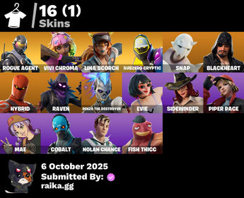 [PC/PSN/XBOX] 16 skins | Rogue Agent | Vivi Chroma | Lina Scorch | Subzero Cryptic | Snap | Blackheart | Hybrid | Raven | Renzo the Destroyer | Evie | 450 VB / FN