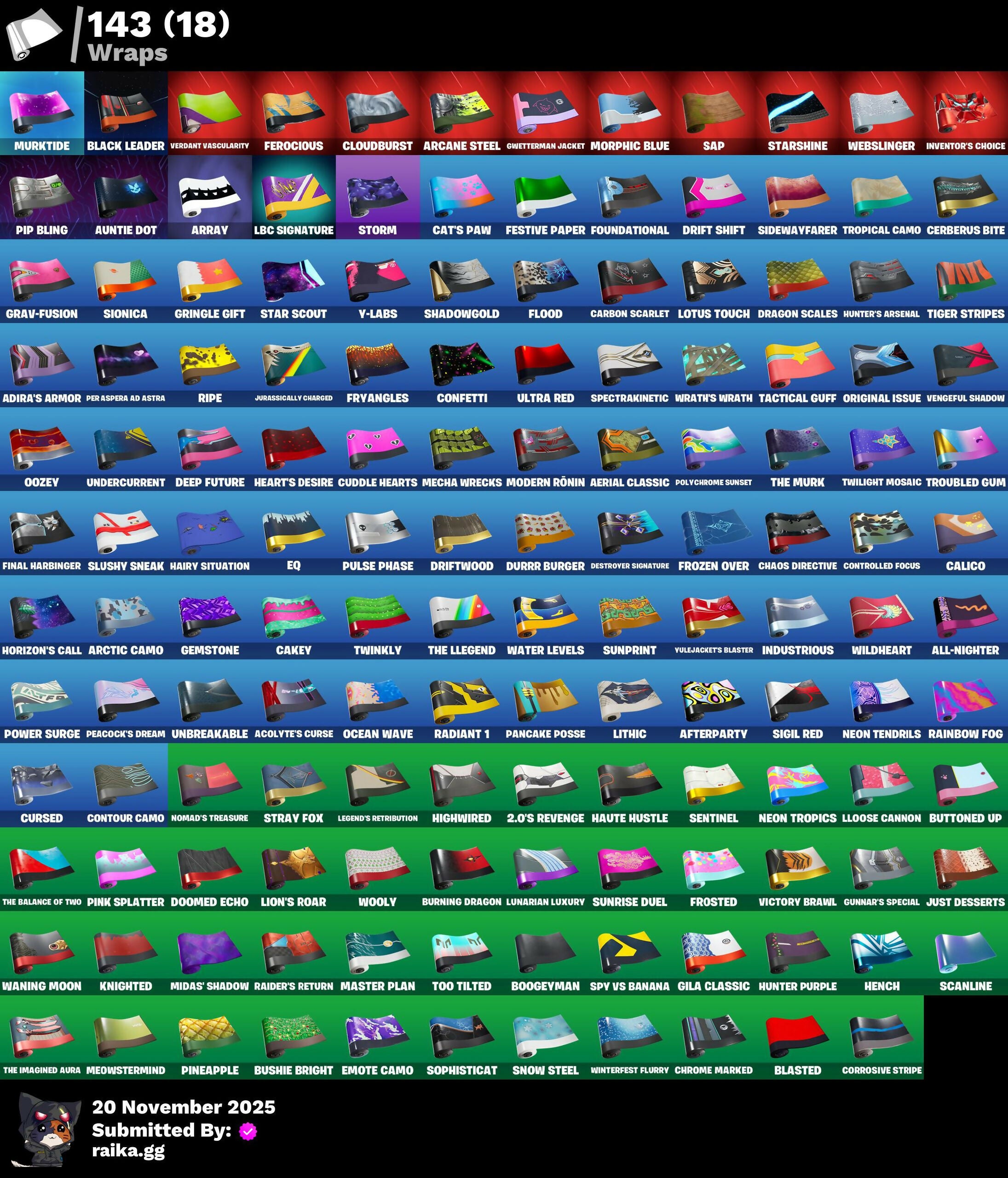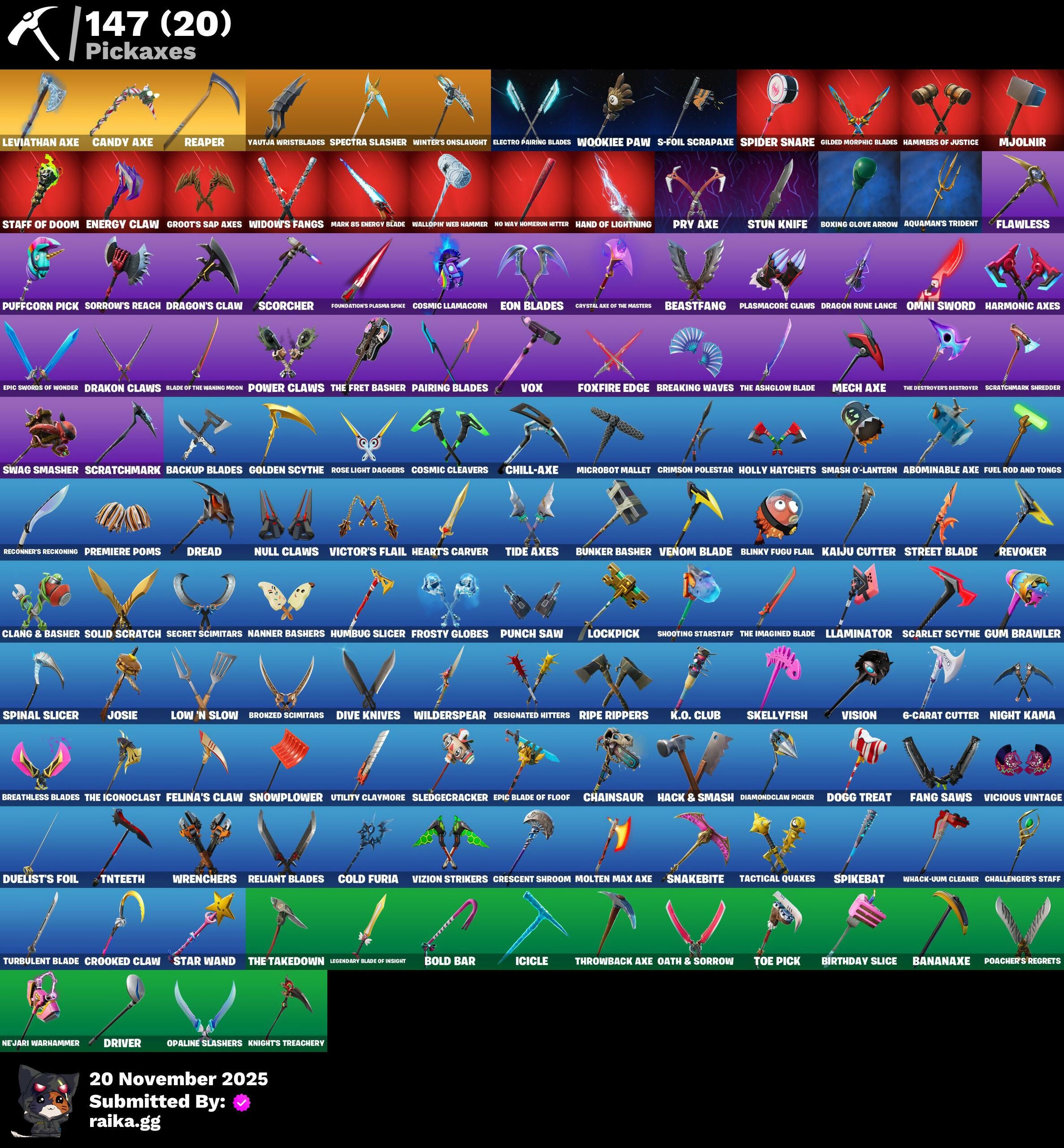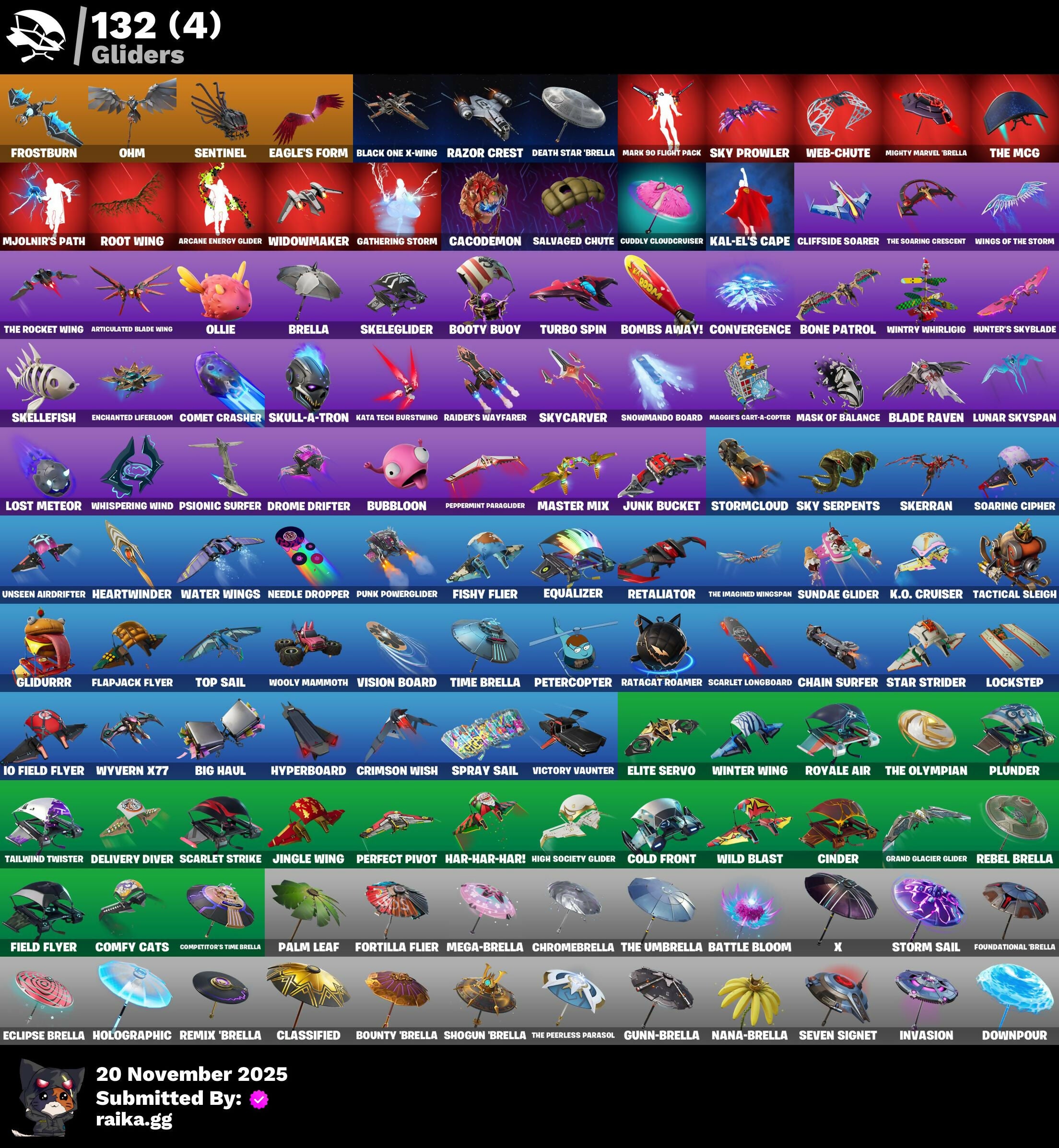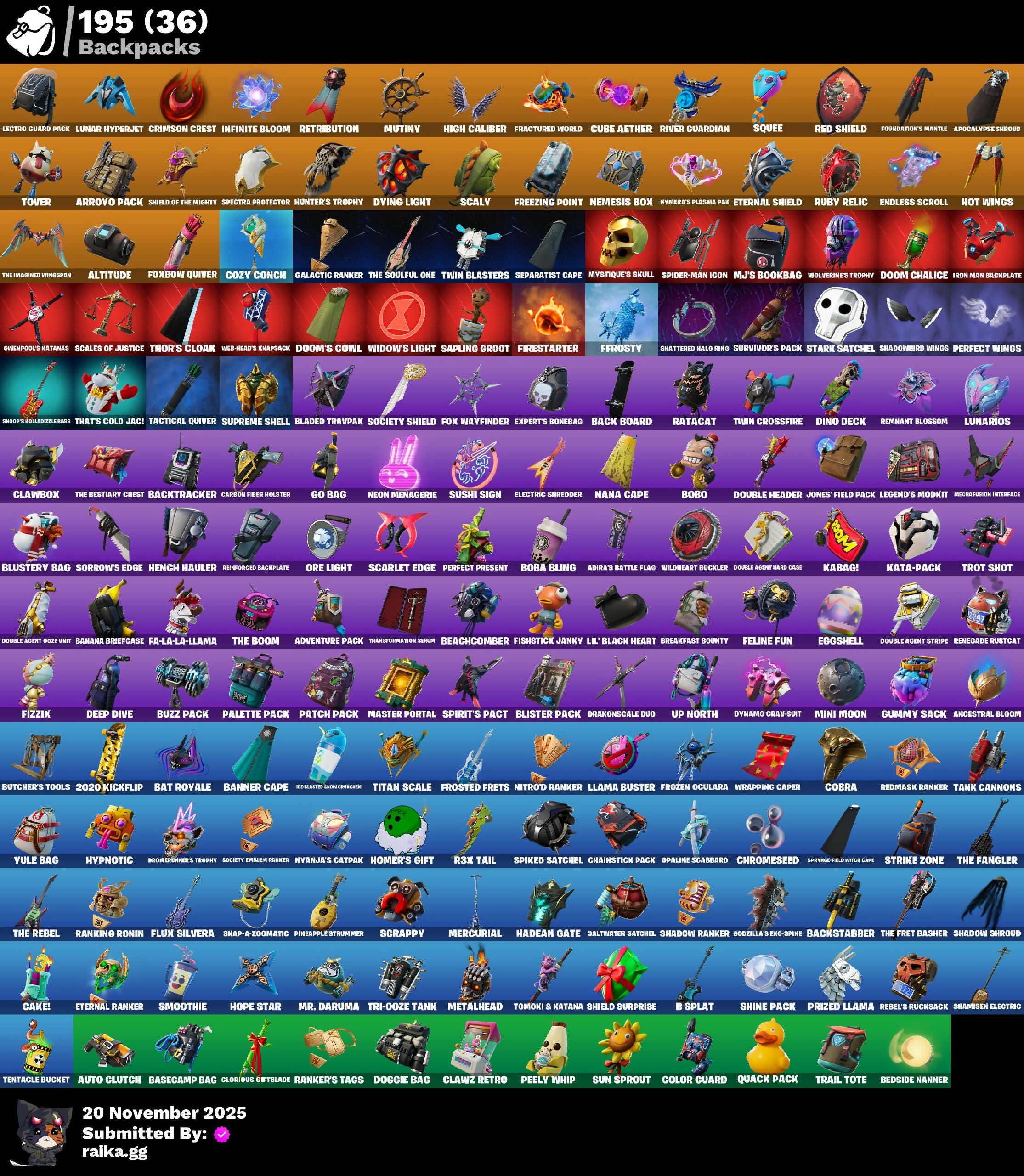 2.0’s Revenge, 2020 Kickflip, 2022, 6-Carat Cutter, A Warrior Prepares, Abduction, Abominable Axe, Acolyte’s Curse, Adira, Adira's Armor, Adira's Battle Flag, Adventure Pack, Aerial, Aerial Classic, Aerial Swagger, Aerial Threat, Afterparty, Agent Jones, Agent Nana, Agent Peely, Air Horn, Air Shredder, All-Nighter, Alli, Altitude, Ancestral Bloom, Apocalypse Shroud, Aquaman, Aquaman's Trident, Arcade Cat, Arcane Energy Glider, Arcane Steel, Arctic Adeline, Arctic Camo, Ark, Array, Arrovo Pack, Art The Hack, Arthur Curry, Articulated Blade Wing, Atlantean Fishstick, Auntie Dot, Aura, Auto Clutch, Avengers Logo, B Splat, B.R.U.T.E. Competitor, B.R.U.T.E. Gunner, Back Board, Backstabber, Backtracker, Backup Blades, Bacon, Bag Of Coal, Banana Briefcase, Bananaxe, Banner, Banner Cape, Banner Icon, Basecamp Bag, Bat Royale, Batman, Battle Bloom, Battle Bus Balloon, Battle Mode, Beach Chair, Beachcomber, Beastfang, Bedside Nanner, Beef Blade, Beep Beep, Berserker Barrage, Big Guns, Big Haul, Billy Bounce, Birthday Slice, Bitter Sweets, Black Eternal Knight, Black Leader, Black One X-Wing, Black Widow (Snow Suit), Blackheart, Blade Raven, Blade of the Waning Moon, Bladed Travpak, Blasted, Blaze, Blinky Fishstick, Blinky Fugu Flail, Blinky Kick, Blister Pack, Blocko, Blowin' Up, Blustery Bag, Boba Bling, Bobo, Bold Bar, Bold Stance, Bombastic Winterfest, Bombs Away!, Bone, Bone Patrol, Boogeyman, Boogie Down, Boomin', Boot It, Booty Buoy, Bot, Both Eyes Open, Bounty Brella, Boxing Glove Arrow, Breakfast Bounty, Breaking Point, Breaking Waves, Breathless Blades, Breezy, Brella, Brite Bomber, Bronzed Scimitars, Brutus, Bubbloon, Bunker Basher, Bunker Jonesy, Bunny Brawler, Burning Dragon, Bush Peek, Bushie Bright, Butcher's Tools, Butterfly, Buttoned Up, Buzz Pack, Bytes' Sigil, Cacodemon, Cake!, Cakey, Calico, Call Me, Candy Axe, Captain America's Shield, Captain Levi, Carbon Fiber Holster, Carbon Scarlet, Cardistry, Cash Grab, Cat Flip, Cat's Paw, Catalyst, Cerberus Bite, Chain Surfer, Chainsaur, Chainstick Pack, Challenger Cerberus, Challenger Menace - Flame, Challenger's Staff, Chaos Directive, Chaos Double Agent, Charlotte's Logo, Chef's Special, Chibi, Chill-Axe, Choice Knit, Chomp Cud!!, Choose Naughty, Chrome Marked, Chrome Punk, Chromebrella, Chromeseed, Cinder, Clang & Basher, Classic Wolverine, Classified, Clawbox, Clawz Retro, Clean Sweep, Cliffside Soarer, Cloudburst, Cluck Strut, Clutch, Cobalt, Cobra, Coconuts, Cold Front, Cold Furia, Color Guard, Combat Elite, Combat Giller, Comet, Comet Crasher, Comfy Cats, Compass, Competitor Medusa, Competitor's Time Brella, Confetti, Confident Iridia, Conga, Contour Camo, Controlled Focus, Convergence, Corrosive Stripe, Cosmic Cleavers, Cosmic Llamacorn, Courageous Mikasa, Cowboy Chat, Cozy Conch, Crabby, Crabby King, Crashed Chiller, Crazy Feet, Crescent Shroom, Crimson Crest, Crimson Polestar, Crimson Wish, Criss Cross, Crooked Claw, Crystal, Crystal Axe of the Masters, Crystal Llama, Cube, Cube Aether, Cube Marking, Cuddle Hearts, Cuddly Cloudcruiser, Curling Iron, Cursed, Cyclo Curl, D.C. 63, Dabstand, Dance Mat, Dark, Deadpool, Death Star 'Brella, Deep Dab, Deep Dive, Deep End, Deep Future, Deimos, Delivery Diver, Demi, Demons Beware, Designated Hitters, Destroyer Signature, Determined Renegade, Diamond Diva, Diamond Throne, Diamondclaw Picker, Dino Deck, Dive Knives, Do The 'Split, Doctor Doom, Dogg Treat, Doggie Bag, Dolphin, Doom Chalice, Doom's Cowl, Doomed Echo, Double Agent Hard Case, Double Agent Hush, Double Agent Ooze Unit, Double Agent Stripe, Double Agent Wildcard, Double Header, Double Up, Downpour, Doze Dab, Dragon Rune Lance, Dragon Rune Lances, Dragon Scales, Dragon Spirit, Dragon Stance, Dragon's Claw, Drakon Claws, Drakon Steel Hybrid, Drakonscale Duo, Dread, Dribblin', Drift Shift, Driftwood, Driver, Drome Drifter, Dromerunner's Trophy, Dropout, Duelist's Foil, Durrr Burger, Dying Light, Dynamic Tintina, Dynamite, Dynamo Grav-Suit, E.G.O., EQ, Eagle's Form, Eclipse Brella, Eggshell, El Barto Was Here, Electric Shredder, Electro Pairing Blades, Elite Servo, Ember, Emote Camo, Empress Fan Dance, Enchanted Lifebloom, Endless Scroll, Energy Claw, Eon Blades, Epic Blade of Floof, Epic Swords of Wonder, Equalizer, Eren Jaeger, Eternal Emblem, Eternal Knight, Eternal Ranker, Eternal Shield, Evasive Maneuvers, Everything's Fine, Evie, Expert's Bonebag, Explosion, Expressionism, Eye Of Agamotto, Fa-La-La-Llama, Fade, Fade Out, Fallen Love Ranger, Fan Attack, Fang Saws, Fate, Felina's Claw, Feline Fun, Ferocious, Festive Paper, Ffrosty, Field Flyer, Fierce, Final Harbinger, Fire V Ice, Firestarter, Fish Hook, Fishbone, Fishstick, Fishstick Janky, Fishy Flier, Fist, Fist Bump, Fizzix, Flapjack Flyer, Flawless, Flippin' Away, Flood, Flux Silvera, Foil Flex, Fortilla Flier, Foundation's Mantle, Foundation's Plasma Spike, Foundational, Foundational 'Brella, Fox, Fox Wayfinder, Foxbow Quiver, Foxfire Edge, Fractured World, Freezing Point, Frost Squad, Frostbite, Frostburn, Frosted, Frosted Frets, Frostwing, Frosty Globes, Frozen Oculiara, Frozen Over, Fry Angles, Fuel Rod and Tongs, GG Ornament, GG Snakes, GG Snowman, Galactic Ranker, Galaxia, Gameface, Gathering Storm, Gear Specialist Maya, Geared Up, Gemstone, Get Griddy, Gila, Gila Classic, Gilded Morphic Blades, Glidurrr, Glorious Giftblade, Glyph Master, Go Bag, Go For The Goal, Go Mufasa, God Emperor Doom, Godzilla's Exo-Spine, Gold, Golden Scythe, Golf Clap, Grand Glacier Glider, Grav-Fusion, Green Arrow, Grill, Grim King Hades, Grind, Gringle Gift, Groot, Groot Glow, Groot's Sap Axes, Grriz, Grumpy Tree, Gum Brawler, Gumbo, Gummy Sack, Gunn-Brella, Gunnar, Gunnar's Special, Gwenpool's Katanas, Gwertterman Jacket, Hack & Smash, Hadean Gate, Hades Insignia, Hairy Situation, Half-Court Hero, Ham, Hammerhead, Hammers of Justice, Hand of Lightning, Hand of Trace, Hang Loose, Happy Kit, Har-Har-Har!, Harbinger Armor Omegarok, Harbinger Of Victory, Harlowe, Harmonic Axes, Haute Hust