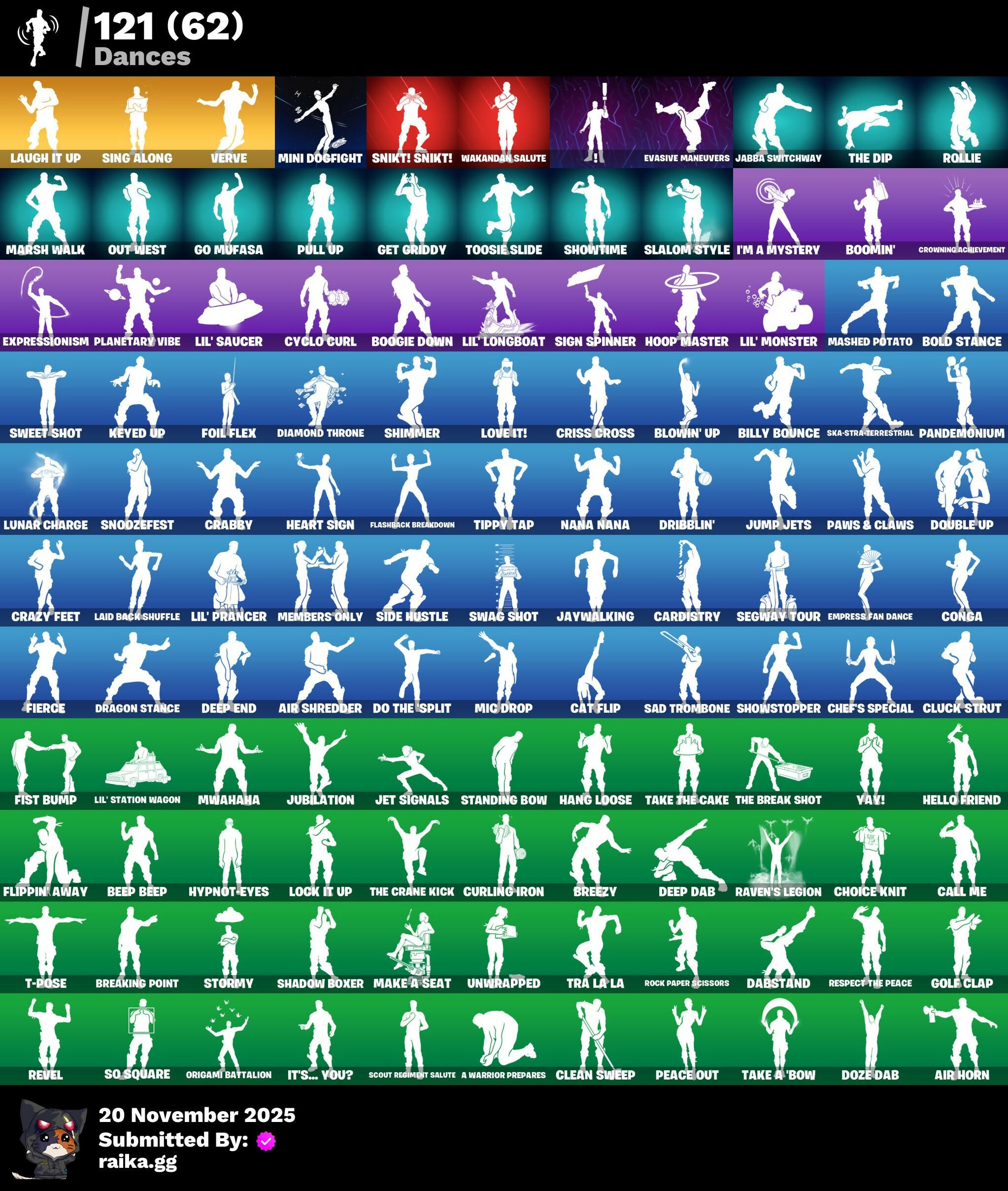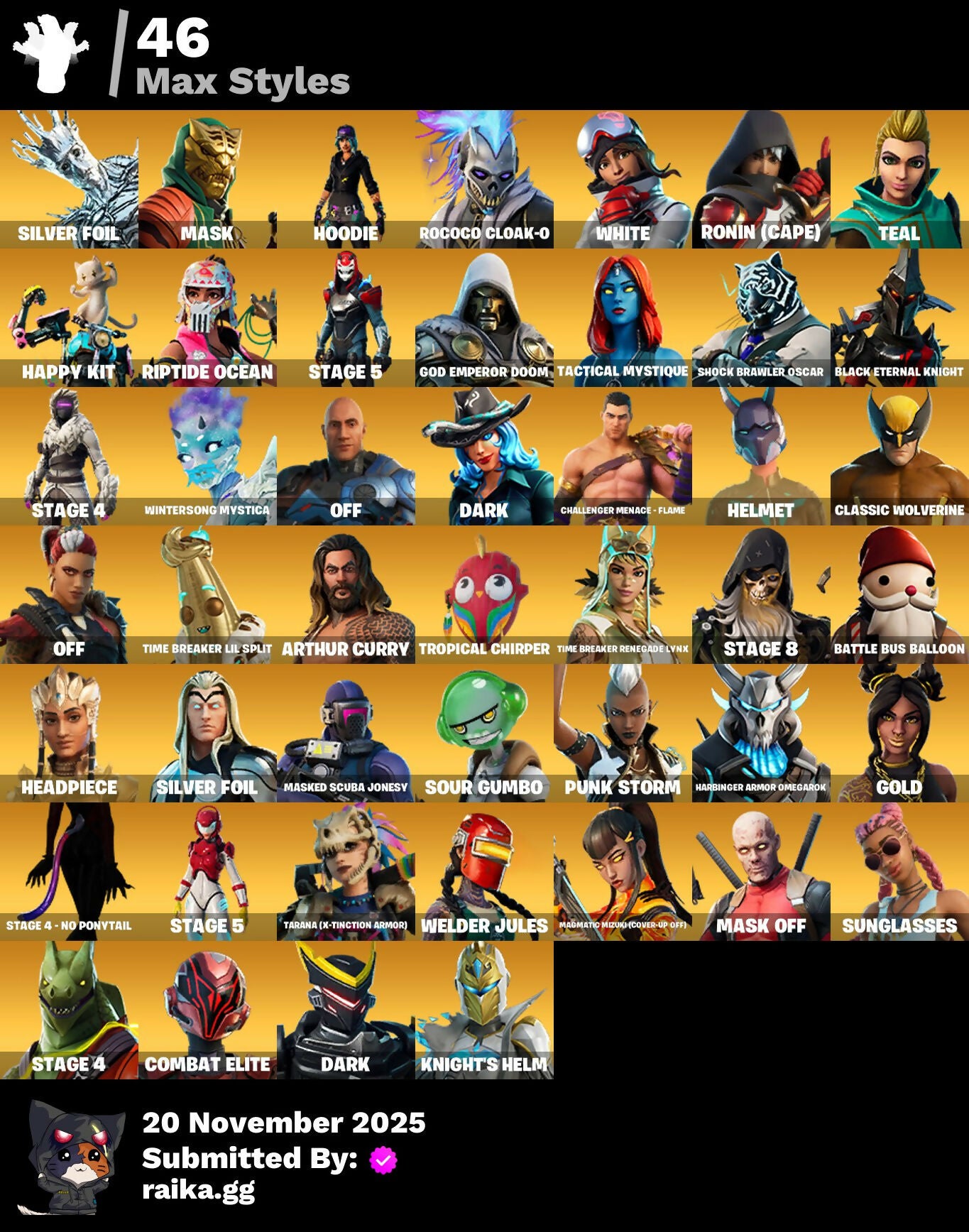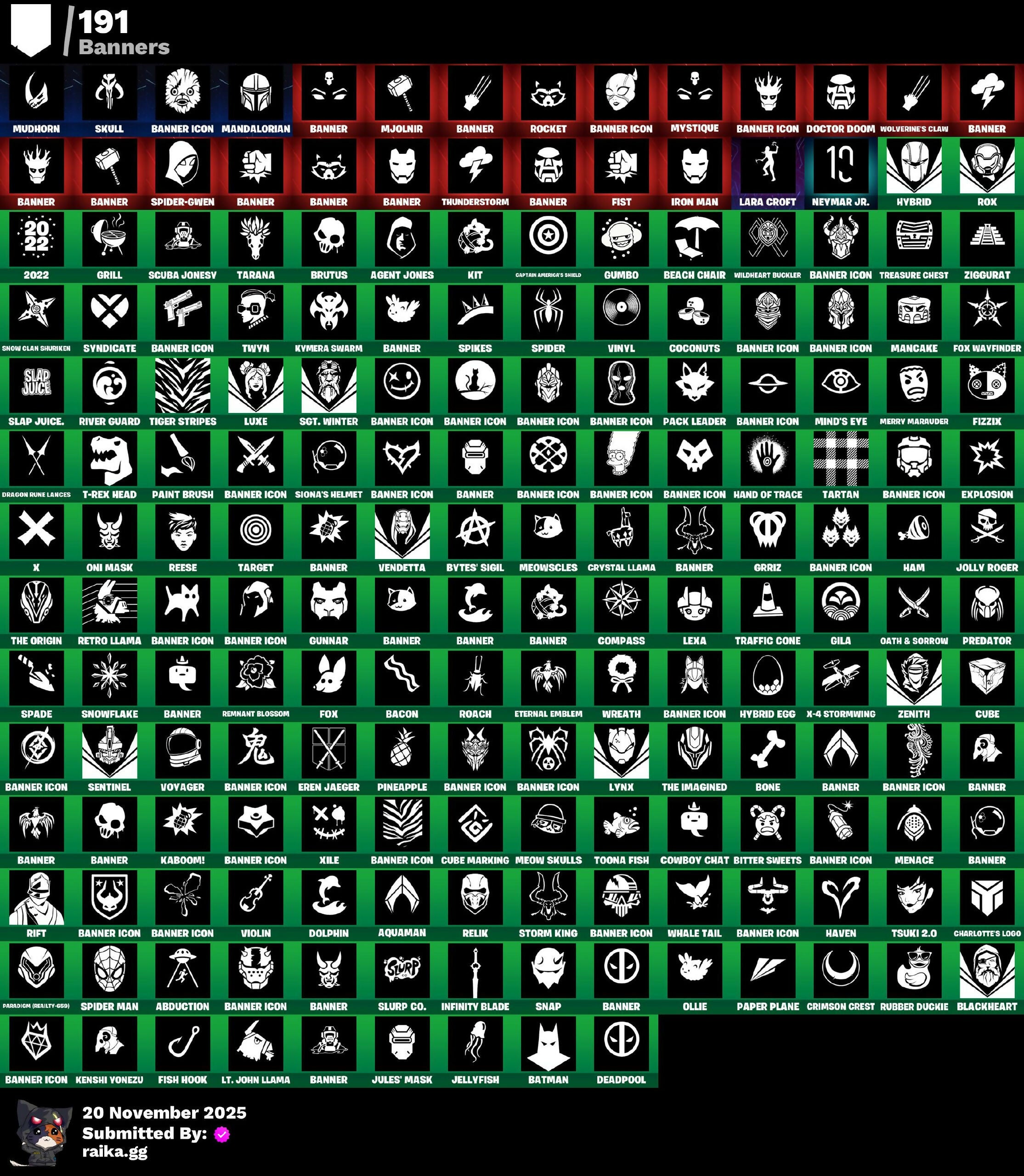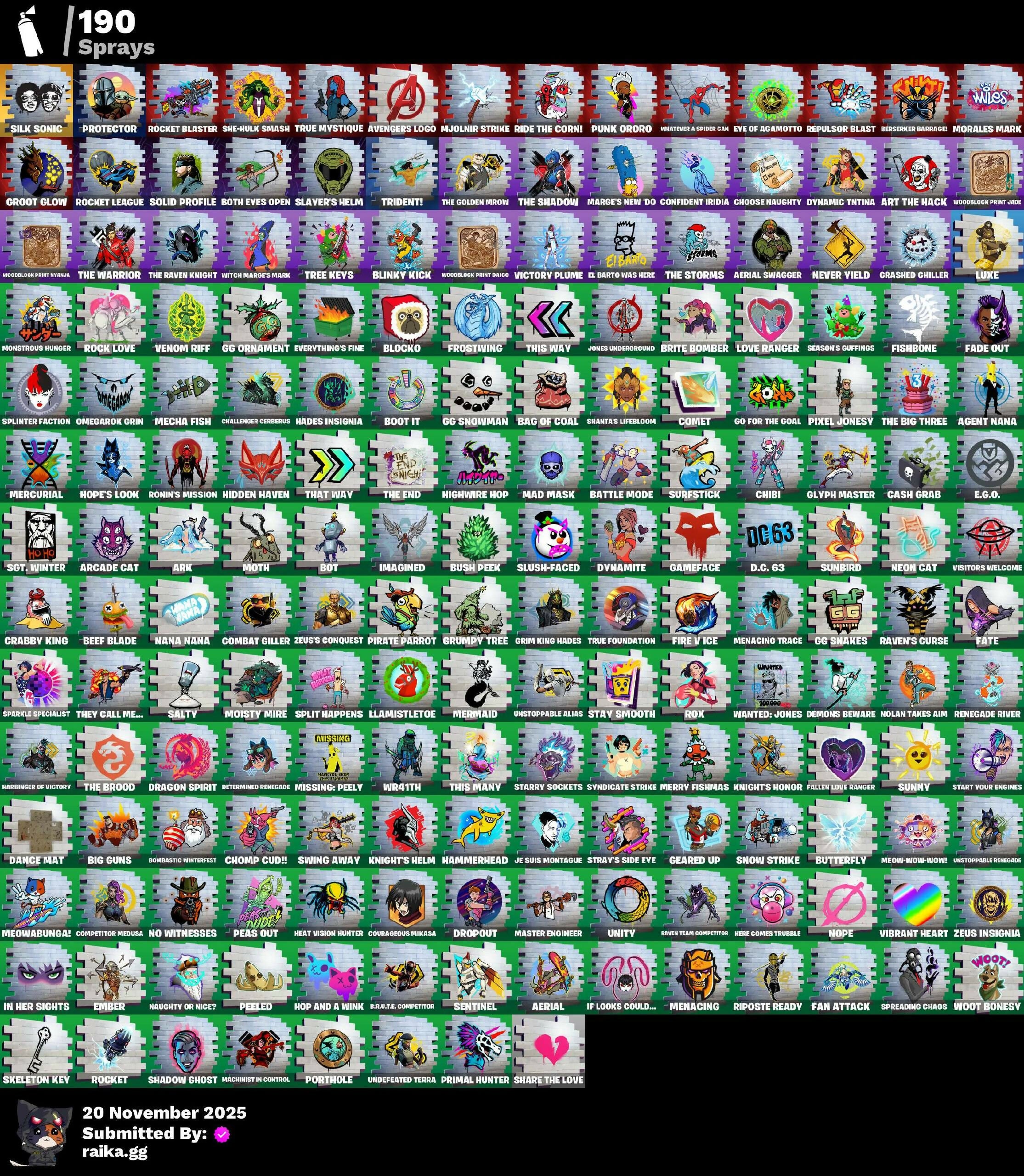 2.0’s Revenge, 2020 Kickflip, 2022, 6-Carat Cutter, A Warrior Prepares, Abduction, Abominable Axe, Acolyte’s Curse, Adira, Adira's Armor, Adira's Battle Flag, Adventure Pack, Aerial, Aerial Classic, Aerial Swagger, Aerial Threat, Afterparty, Agent Jones, Agent Nana, Agent Peely, Air Horn, Air Shredder, All-Nighter, Alli, Altitude, Ancestral Bloom, Apocalypse Shroud, Aquaman, Aquaman's Trident, Arcade Cat, Arcane Energy Glider, Arcane Steel, Arctic Adeline, Arctic Camo, Ark, Array, Arrovo Pack, Art The Hack, Arthur Curry, Articulated Blade Wing, Atlantean Fishstick, Auntie Dot, Aura, Auto Clutch, Avengers Logo, B Splat, B.R.U.T.E. Competitor, B.R.U.T.E. Gunner, Back Board, Backstabber, Backtracker, Backup Blades, Bacon, Bag Of Coal, Banana Briefcase, Bananaxe, Banner, Banner Cape, Banner Icon, Basecamp Bag, Bat Royale, Batman, Battle Bloom, Battle Bus Balloon, Battle Mode, Beach Chair, Beachcomber, Beastfang, Bedside Nanner, Beef Blade, Beep Beep, Berserker Barrage, Big Guns, Big Haul, Billy Bounce, Birthday Slice, Bitter Sweets, Black Eternal Knight, Black Leader, Black One X-Wing, Black Widow (Snow Suit), Blackheart, Blade Raven, Blade of the Waning Moon, Bladed Travpak, Blasted, Blaze, Blinky Fishstick, Blinky Fugu Flail, Blinky Kick, Blister Pack, Blocko, Blowin' Up, Blustery Bag, Boba Bling, Bobo, Bold Bar, Bold Stance, Bombastic Winterfest, Bombs Away!, Bone, Bone Patrol, Boogeyman, Boogie Down, Boomin', Boot It, Booty Buoy, Bot, Both Eyes Open, Bounty Brella, Boxing Glove Arrow, Breakfast Bounty, Breaking Point, Breaking Waves, Breathless Blades, Breezy, Brella, Brite Bomber, Bronzed Scimitars, Brutus, Bubbloon, Bunker Basher, Bunker Jonesy, Bunny Brawler, Burning Dragon, Bush Peek, Bushie Bright, Butcher's Tools, Butterfly, Buttoned Up, Buzz Pack, Bytes' Sigil, Cacodemon, Cake!, Cakey, Calico, Call Me, Candy Axe, Captain America's Shield, Captain Levi, Carbon Fiber Holster, Carbon Scarlet, Cardistry, Cash Grab, Cat Flip, Cat's Paw, Catalyst, Cerberus Bite, Chain Surfer, Chainsaur, Chainstick Pack, Challenger Cerberus, Challenger Menace - Flame, Challenger's Staff, Chaos Directive, Chaos Double Agent, Charlotte's Logo, Chef's Special, Chibi, Chill-Axe, Choice Knit, Chomp Cud!!, Choose Naughty, Chrome Marked, Chrome Punk, Chromebrella, Chromeseed, Cinder, Clang & Basher, Classic Wolverine, Classified, Clawbox, Clawz Retro, Clean Sweep, Cliffside Soarer, Cloudburst, Cluck Strut, Clutch, Cobalt, Cobra, Coconuts, Cold Front, Cold Furia, Color Guard, Combat Elite, Combat Giller, Comet, Comet Crasher, Comfy Cats, Compass, Competitor Medusa, Competitor's Time Brella, Confetti, Confident Iridia, Conga, Contour Camo, Controlled Focus, Convergence, Corrosive Stripe, Cosmic Cleavers, Cosmic Llamacorn, Courageous Mikasa, Cowboy Chat, Cozy Conch, Crabby, Crabby King, Crashed Chiller, Crazy Feet, Crescent Shroom, Crimson Crest, Crimson Polestar, Crimson Wish, Criss Cross, Crooked Claw, Crystal, Crystal Axe of the Masters, Crystal Llama, Cube, Cube Aether, Cube Marking, Cuddle Hearts, Cuddly Cloudcruiser, Curling Iron, Cursed, Cyclo Curl, D.C. 63, Dabstand, Dance Mat, Dark, Deadpool, Death Star 'Brella, Deep Dab, Deep Dive, Deep End, Deep Future, Deimos, Delivery Diver, Demi, Demons Beware, Designated Hitters, Destroyer Signature, Determined Renegade, Diamond Diva, Diamond Throne, Diamondclaw Picker, Dino Deck, Dive Knives, Do The 'Split, Doctor Doom, Dogg Treat, Doggie Bag, Dolphin, Doom Chalice, Doom's Cowl, Doomed Echo, Double Agent Hard Case, Double Agent Hush, Double Agent Ooze Unit, Double Agent Stripe, Double Agent Wildcard, Double Header, Double Up, Downpour, Doze Dab, Dragon Rune Lance, Dragon Rune Lances, Dragon Scales, Dragon Spirit, Dragon Stance, Dragon's Claw, Drakon Claws, Drakon Steel Hybrid, Drakonscale Duo, Dread, Dribblin', Drift Shift, Driftwood, Driver, Drome Drifter, Dromerunner's Trophy, Dropout, Duelist's Foil, Durrr Burger, Dying Light, Dynamic Tintina, Dynamite, Dynamo Grav-Suit, E.G.O., EQ, Eagle's Form, Eclipse Brella, Eggshell, El Barto Was Here, Electric Shredder, Electro Pairing Blades, Elite Servo, Ember, Emote Camo, Empress Fan Dance, Enchanted Lifebloom, Endless Scroll, Energy Claw, Eon Blades, Epic Blade of Floof, Epic Swords of Wonder, Equalizer, Eren Jaeger, Eternal Emblem, Eternal Knight, Eternal Ranker, Eternal Shield, Evasive Maneuvers, Everything's Fine, Evie, Expert's Bonebag, Explosion, Expressionism, Eye Of Agamotto, Fa-La-La-Llama, Fade, Fade Out, Fallen Love Ranger, Fan Attack, Fang Saws, Fate, Felina's Claw, Feline Fun, Ferocious, Festive Paper, Ffrosty, Field Flyer, Fierce, Final Harbinger, Fire V Ice, Firestarter, Fish Hook, Fishbone, Fishstick, Fishstick Janky, Fishy Flier, Fist, Fist Bump, Fizzix, Flapjack Flyer, Flawless, Flippin' Away, Flood, Flux Silvera, Foil Flex, Fortilla Flier, Foundation's Mantle, Foundation's Plasma Spike, Foundational, Foundational 'Brella, Fox, Fox Wayfinder, Foxbow Quiver, Foxfire Edge, Fractured World, Freezing Point, Frost Squad, Frostbite, Frostburn, Frosted, Frosted Frets, Frostwing, Frosty Globes, Frozen Oculiara, Frozen Over, Fry Angles, Fuel Rod and Tongs, GG Ornament, GG Snakes, GG Snowman, Galactic Ranker, Galaxia, Gameface, Gathering Storm, Gear Specialist Maya, Geared Up, Gemstone, Get Griddy, Gila, Gila Classic, Gilded Morphic Blades, Glidurrr, Glorious Giftblade, Glyph Master, Go Bag, Go For The Goal, Go Mufasa, God Emperor Doom, Godzilla's Exo-Spine, Gold, Golden Scythe, Golf Clap, Grand Glacier Glider, Grav-Fusion, Green Arrow, Grill, Grim King Hades, Grind, Gringle Gift, Groot, Groot Glow, Groot's Sap Axes, Grriz, Grumpy Tree, Gum Brawler, Gumbo, Gummy Sack, Gunn-Brella, Gunnar, Gunnar's Special, Gwenpool's Katanas, Gwertterman Jacket, Hack & Smash, Hadean Gate, Hades Insignia, Hairy Situation, Half-Court Hero, Ham, Hammerhead, Hammers of Justice, Hand of Lightning, Hand of Trace, Hang Loose, Happy Kit, Har-Har-Har!, Harbinger Armor Omegarok, Harbinger Of Victory, Harlowe, Harmonic Axes, Haute Hust