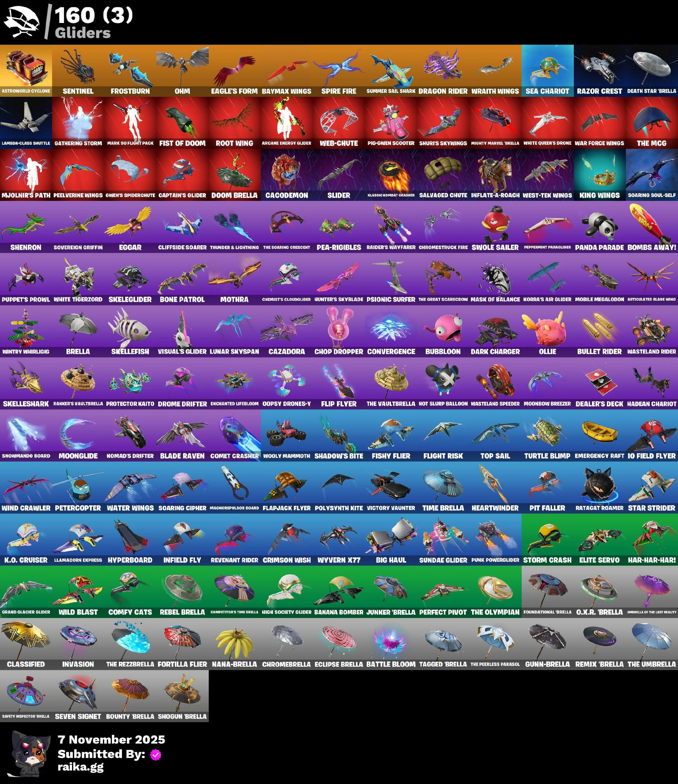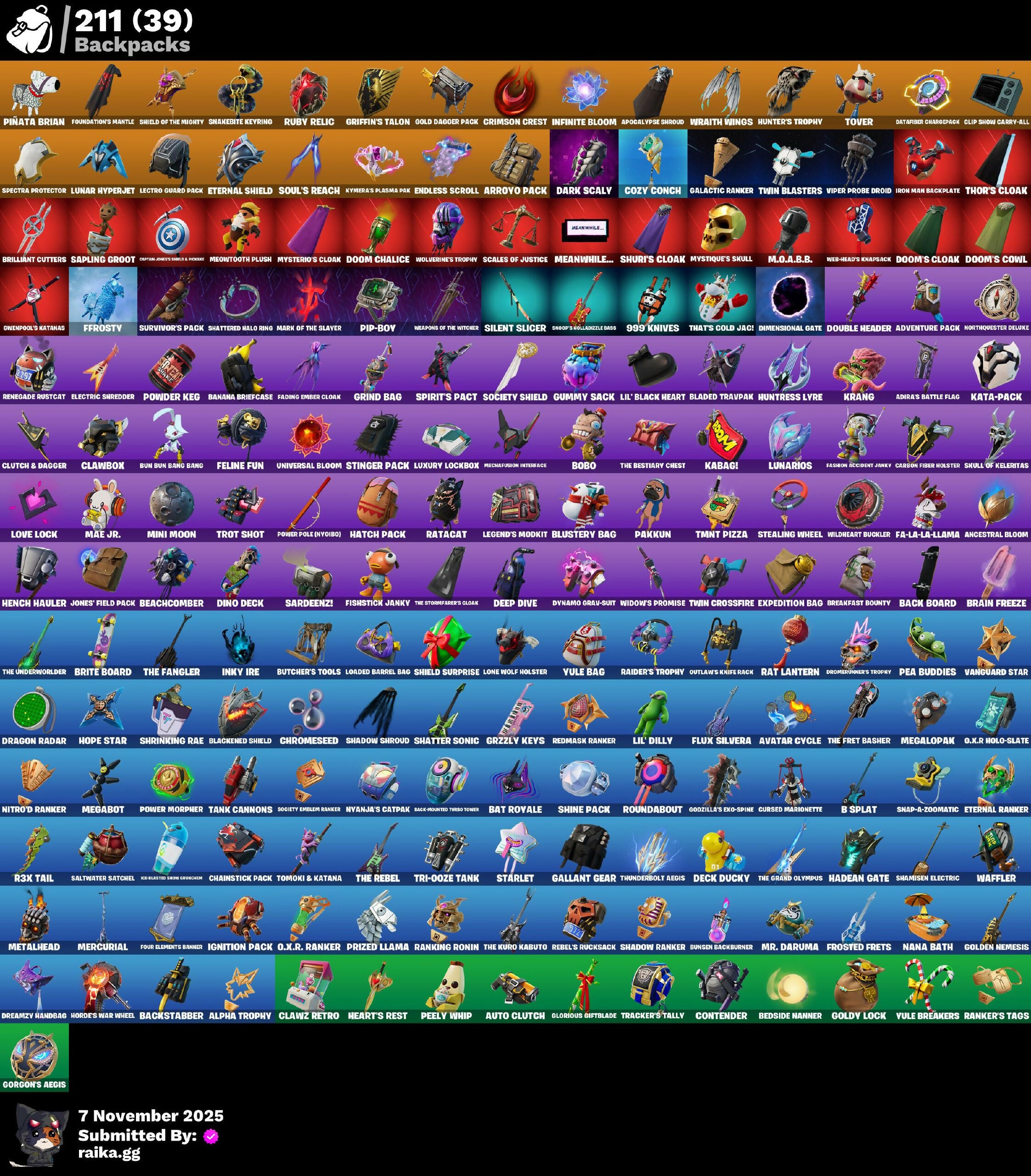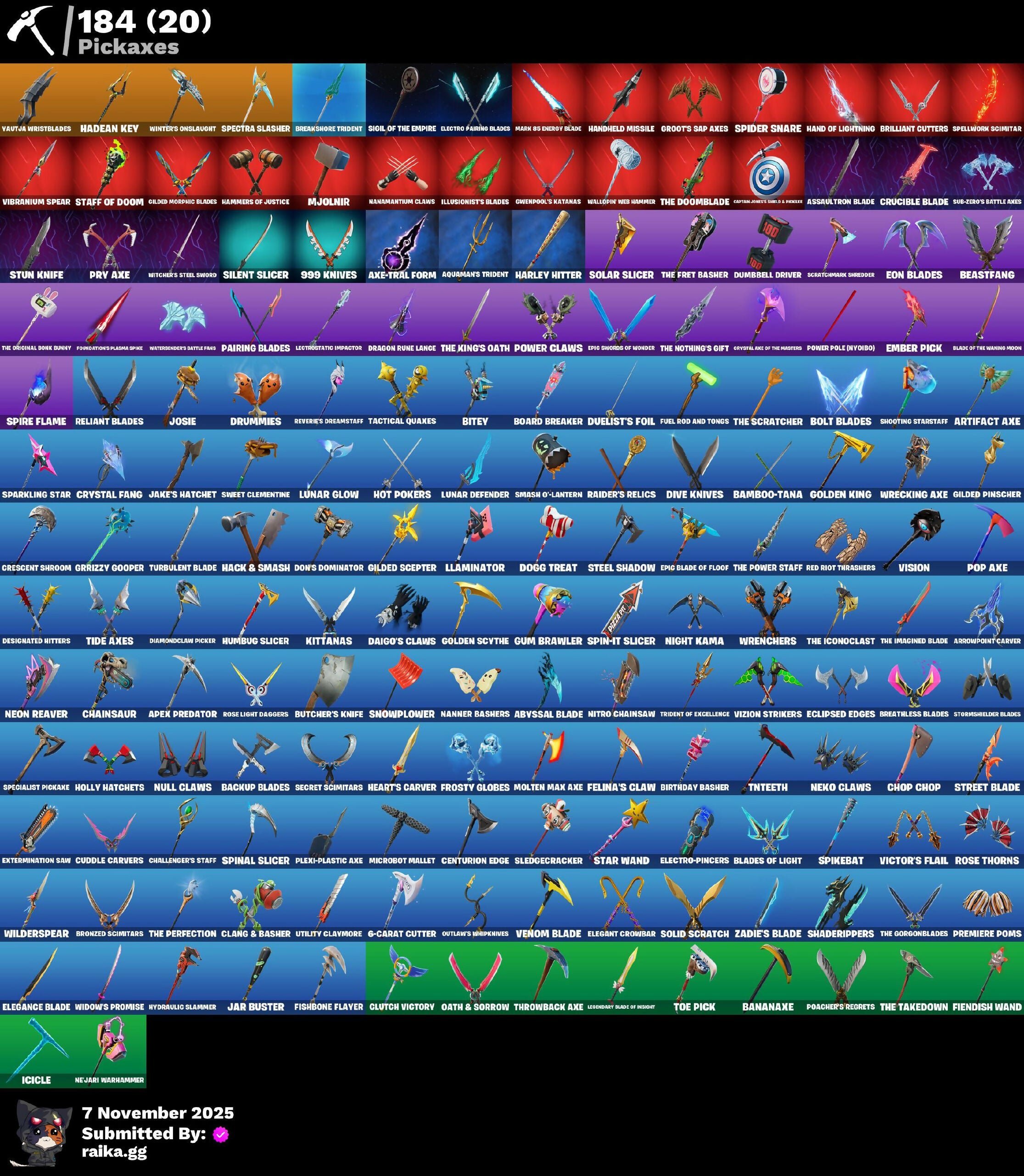 (Snikt!), 10 Field Flyer, 2022, 6-Carat Cutter, 999 Knives, A Warrior Prepares, Abduction, Absenz, Abyssal Blade, Acolyte's Curse, Ad Victoriam!, Adira, Adira's Armor, Adira's Battle Flag, Adventure Pack, Aerial, Aerial Classic, Aerial Swagger, Afterparty, Agent Jones, Agent Jones (Jump 31), Agent Nana, Agent Peely, Air Shredder, Alpha Trophy, Ancestral Bloom, Antonia, Antonia In Action, Apex Predator, Aphrodite, Apocalypse Shroud, Aquaman, Aquaman's Trident, Arcane Energy Glider, Arcane Steel, Arctic Achiever, Arctic Adeline, Armored Victory, Arrowpoint Carver, Arroyo Pack, Art The Hack, Artemis, Articulated Blade Wing, Artifact Axe, Assaultron Blade, Astro Armor, Astro Jack, Astroworld Cyclone, Auntie Dot, Aurelian, Auto Clutch, Avatar Cycle, Avatar's Flourish, Axe-Tral Form, Axo's Big Moment, Azarath Metrion Zinthos!, B Splat, B.R.U.T.E. Gunner, Back Board, Back-Mounted Turbo Toner, Backstabber, Backup Blades, Balance Board, Balanced, Bamboo-Tana, Banana Bomber, Banana Briefcase, Bananaxe, Banner, Banner Icon, Baron Kane, Baron's Hoard, Baseball, Basketball Hoop, Bat Royale, Battle Blessing, Battle Bloom, Battle Call, Battle Mode, Bawk Off, Baymax Wings, Be The Mastermind, Beach Bomber, Beachcomber, Bean Bag, Beastfang, Beat Breaker, Beatzbunny, Bedside Nanner, Beef Blade, Beep Beep, Belt It!, Berserker Barrage, Big Guns, Big Haul, Birthday Basher, Birthday Dash, Bitey, Bitter Sweets, Black Hole, Black Knight T-60 Power Armor, Black Panther (Shuri), Black Queen, Blackened Shield, Blade Of The Waning Moon, Blade Raven, Bladed Travpak, Blades Of Light, Blasted, Blazing Fire Cerberus, Blocko, Blowin' Up, Blue Shock, Blustery Bag, Board Breaker, Bobo, Bolt Blades, Bombastic Winterfest, Bombs Away!, Bone Patrol, Boomin', Boosting Ki, Boots 'N' Cats, Both Eyes Open, Bounty 'Brella, Brain Freeze, Break Point Ultra, Breakaway, Breakfast Bounty, Breakshore Trident, Breathless Blades, Brella, Brilliant Cutters, Brite Board, Brite Competitor, Brite Moves, Brite Raider, Bronzed Scimitars, Brutus, Bubbloon, Buffer Fish, Bullet Rider, Bun Bun Bang Bang, Bun Bun Blast, Bunsen Backburner, Burning Ambition Valeria, Bushie Bright, Butcher's Knife, Butcher's Tools, Buttoned Up, By The Horns, Bytes, Bytes' Sigil, C3S2 Contender III, C3S3 Contender I, C4S1 Contender I, Cacodemon, Calico, Call Me, Cap Attack, Caper, Captain Jones, Captain Jones’ Swords & Picker, Captain Lamerica, Captain's Glider, Carbon Fiber Holster, Card Drop, Cardistry, Cash Grab, Cauldron Chill, Cazadora, Centurion, Centurion Edge, Cerberus, Cerberus Bite, Chainsaur, Chainstick Pack, Challenger Cerberus, Challenger Menace - Flame, Challenger's Staff, Chaos Directive, Chapter 5 Season 4 Level 104, Chapter 5 Season 4 Level 150, Charlotte's Logo, Chemist's Cloudglider, Chibi, Chimp Malson Wants You, Choice Knit, Chomp Cudi!, Choose Naughty, Chop Chop, Chop Dropper, Chrome Marked, Chrome Punk, Chromebrella, Chromeseed, Chromestruck Fire, Chronos Lock, Clang & Basher, Classic Peelverine, Classified, Clawbox, Clawz Retro, Clean Sweep, Cliffside Soarer, Clip Show Carry-All, Cloudburst, Cluck, Cluck (Slurpy), Clucking Mad, Clutch & Dagger, Clutch Victory, Codsworth's Cleanup, Coin Flip, Collector Kado Thorne, Combat Giller, Comet, Comet Crasher, Comfy Cats, Competitor Medusa, Competitor Rust, Competitor's Time Brella, Conch Call, Conjuring Mystero, Console Cup, Contender, Contour Camo, Convergence, Coral Crush, Corrosive Stripe, Corrosive Tag, Count It!, Cowboy Chat, Cozy Commander, Cozy Conch, Cozy Holidays, Crabby King, Crack It, Crashed Chiller, Crashed Shield, Crescent Shroom, Crimson Crest, Crimson Wish, Cross Your Heart, Crowning Achievement, Crucible Blade, Crystal, Crystal Axe Of The Masters, Crystal Fang, Cube Marking, Cubed, Cuddle Carvers, Cuddles' Garden, Cursed Marionette, Cyclo Curl, D.C. 63, Dagger Dance, Daigo, Daigo's Claws, Daisies, Dark Charger, Dark Rex, Dark Scaly, Dark Side Rising, Darth Shader, Darth Vader, Datafiber Chargepack, Datasider Charged Pack, Daughter Of Trigon, Dawn Duelist Nisha, Deadpool, Dealer's Deck, Death Star 'Brella, Deck Ducky, Deep Dive, Deep Future, Demon Hunter Hope, Demons Beware, Denim Destiny, Designated Hitters, Determined Kendo, Determined Korra, Determined Renegade, Diamond Diva, Diamond Throne, Diamondclaw Picker, Dice Roll, Dimensional Gate, Dino Deck, Dire Goat, Direct The Chaos, Diva's Grin, Dive Knives, Do The |Split, Doctor Doom, Dogg Treat, Dolphin, Don Of The Wastes, Don Target, Don's Dominator, Doom, Doom Brella, Doom Chalice, Doom Slayer, Doom's Cloak, Doom's Cowl, Double Header, Doze Dab, Dragon Radar, Dragon Rider, Dragon Rune Lance, Dragon Rune Lances, Dragon Spirit, Dream Feet, Dreamzy Handbag, Drift Face, Droggerunner's Trophy, Drome Drifter, Drones-V View, Dropout, Drummies, Duelist's Foil, Dumbbell Driver, Dumbell Driver, Durr Face, Dusty, Dynamic Tinctina, Dynamite, Dynamo Grav-Suit, Eagle's Form, Eclipse Brella, Eclipsed Edges, Eggar, Electric Shredder, Electro Pairing Blades, Electro Swing, Electro-Pincers, Elegance Blade, Elegant Crowbar, Elemental Cycle, Elite Servo, Elite's Sigil, Elvsium, Ember Pick, Emergency Raft, Emma Frost, Emma's Influence, Enchanted Lifebloom, Endless Scroll, Energized Godzilla, Ensnared, Eon Blades, Epic Blade Of Floof, Epic Swords Of Wonder, Erisa Alert, Eternal Emblem, Eternal Knight, Eternal Ranker, Eternal Shield, Evasive Maneuvers, Everything's Fine, Evie, Evolved Heat Ray, Expedition Bag, Extermination Saw, Eye Of Agamotto, Fa-La-La-Llama, Fade, Fade Out, Fading Ember Cloak, Fancy Peter Griffin, Fashion Accident Junky, Felina, Felina's Claw, Feline Fun, Feral Finisher, Ferocious, Ffrosty, Fiendish Wand, Final Eclipse, Final Harbinger, Fire Show, Fireworks Salvo, Fish Thicc, Fishbone, Fishbone Flayer, Fishstick, Fishstick Janky, Fishy Flier, Fist, Fist Bump, Fist of Doom, Fizzix, Flaky Feast, Flapjack Flyer, Flash Of Lightning, Flashback Breakdown, Flight Risk, Flip Flyer, Flippin' Away, Flux Silvera, Foil Flex, Fortilla Flier, Foundatio