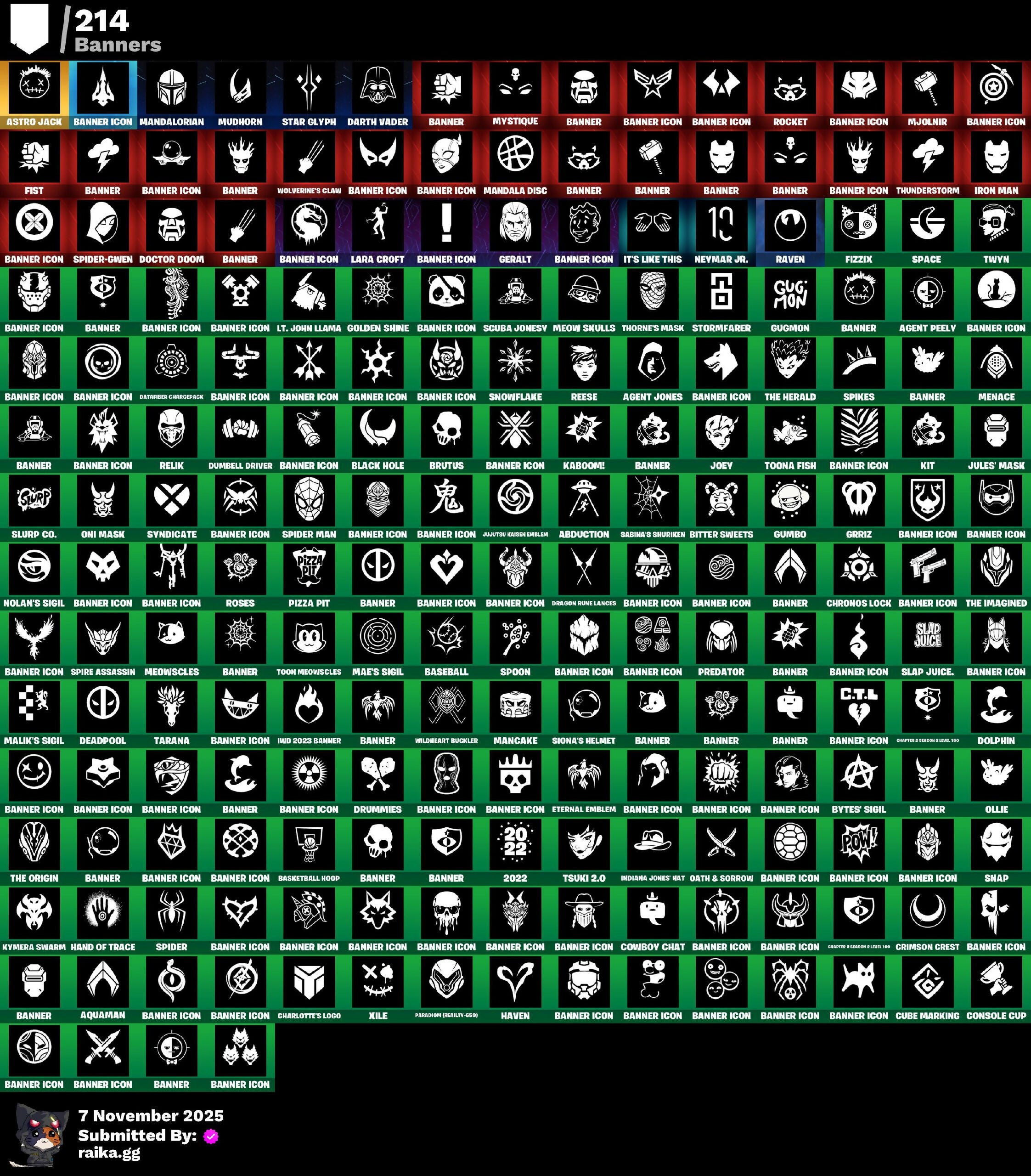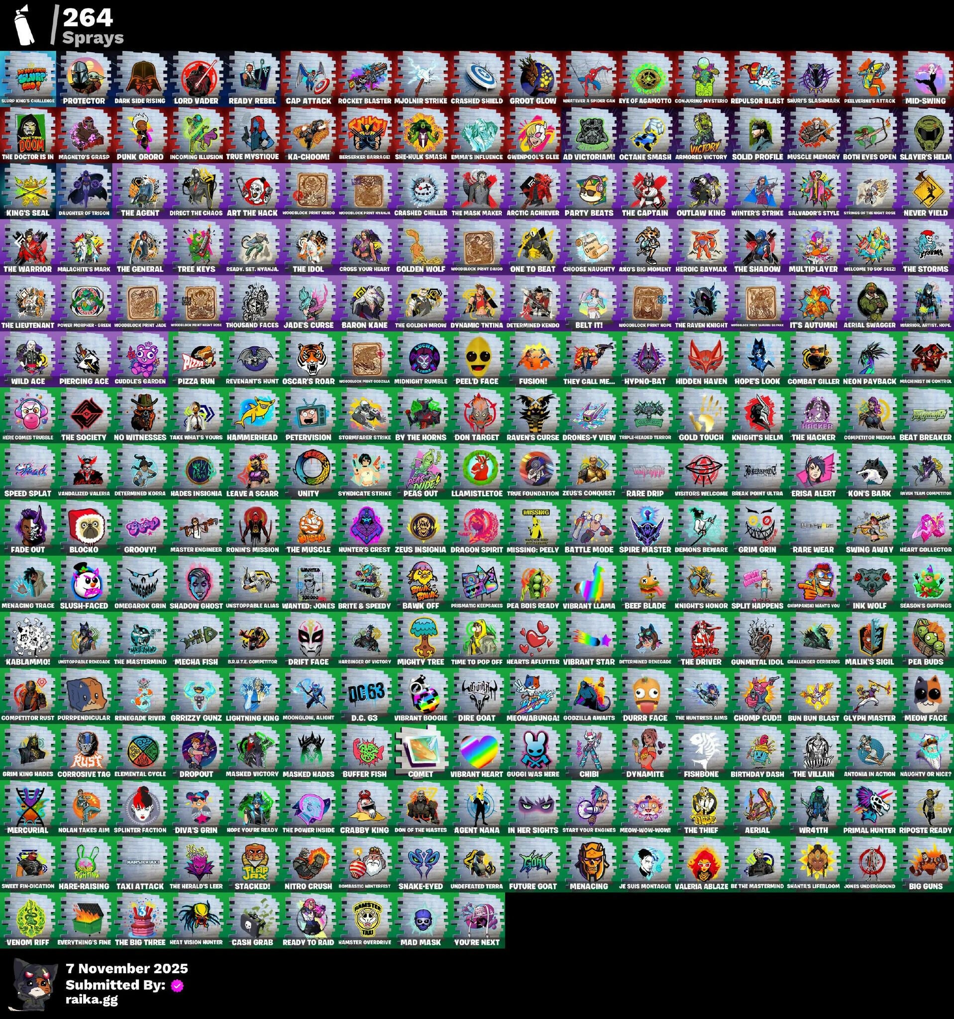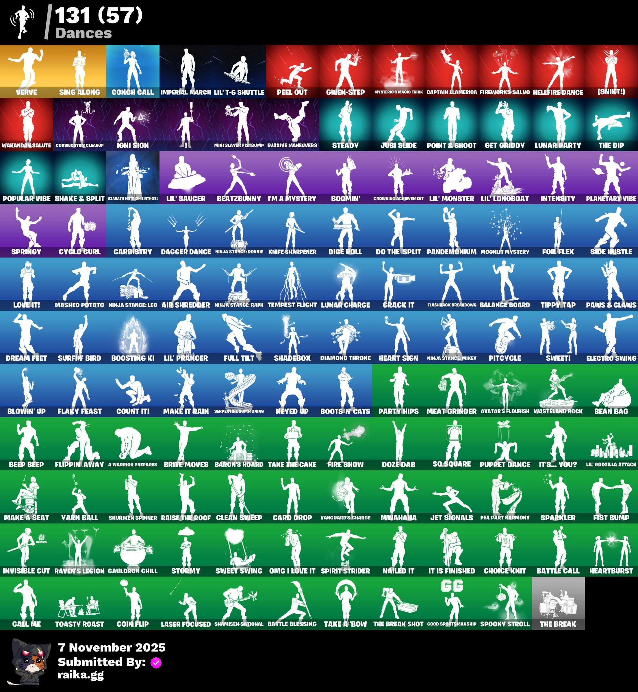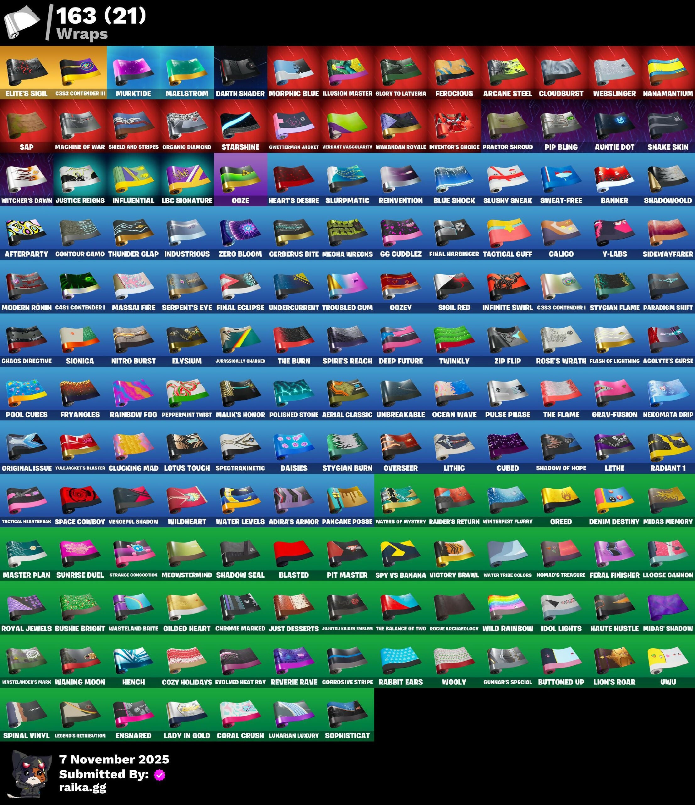 (Snikt!), 10 Field Flyer, 2022, 6-Carat Cutter, 999 Knives, A Warrior Prepares, Abduction, Absenz, Abyssal Blade, Acolyte's Curse, Ad Victoriam!, Adira, Adira's Armor, Adira's Battle Flag, Adventure Pack, Aerial, Aerial Classic, Aerial Swagger, Afterparty, Agent Jones, Agent Jones (Jump 31), Agent Nana, Agent Peely, Air Shredder, Alpha Trophy, Ancestral Bloom, Antonia, Antonia In Action, Apex Predator, Aphrodite, Apocalypse Shroud, Aquaman, Aquaman's Trident, Arcane Energy Glider, Arcane Steel, Arctic Achiever, Arctic Adeline, Armored Victory, Arrowpoint Carver, Arroyo Pack, Art The Hack, Artemis, Articulated Blade Wing, Artifact Axe, Assaultron Blade, Astro Armor, Astro Jack, Astroworld Cyclone, Auntie Dot, Aurelian, Auto Clutch, Avatar Cycle, Avatar's Flourish, Axe-Tral Form, Axo's Big Moment, Azarath Metrion Zinthos!, B Splat, B.R.U.T.E. Gunner, Back Board, Back-Mounted Turbo Toner, Backstabber, Backup Blades, Balance Board, Balanced, Bamboo-Tana, Banana Bomber, Banana Briefcase, Bananaxe, Banner, Banner Icon, Baron Kane, Baron's Hoard, Baseball, Basketball Hoop, Bat Royale, Battle Blessing, Battle Bloom, Battle Call, Battle Mode, Bawk Off, Baymax Wings, Be The Mastermind, Beach Bomber, Beachcomber, Bean Bag, Beastfang, Beat Breaker, Beatzbunny, Bedside Nanner, Beef Blade, Beep Beep, Belt It!, Berserker Barrage, Big Guns, Big Haul, Birthday Basher, Birthday Dash, Bitey, Bitter Sweets, Black Hole, Black Knight T-60 Power Armor, Black Panther (Shuri), Black Queen, Blackened Shield, Blade Of The Waning Moon, Blade Raven, Bladed Travpak, Blades Of Light, Blasted, Blazing Fire Cerberus, Blocko, Blowin' Up, Blue Shock, Blustery Bag, Board Breaker, Bobo, Bolt Blades, Bombastic Winterfest, Bombs Away!, Bone Patrol, Boomin', Boosting Ki, Boots 'N' Cats, Both Eyes Open, Bounty 'Brella, Brain Freeze, Break Point Ultra, Breakaway, Breakfast Bounty, Breakshore Trident, Breathless Blades, Brella, Brilliant Cutters, Brite Board, Brite Competitor, Brite Moves, Brite Raider, Bronzed Scimitars, Brutus, Bubbloon, Buffer Fish, Bullet Rider, Bun Bun Bang Bang, Bun Bun Blast, Bunsen Backburner, Burning Ambition Valeria, Bushie Bright, Butcher's Knife, Butcher's Tools, Buttoned Up, By The Horns, Bytes, Bytes' Sigil, C3S2 Contender III, C3S3 Contender I, C4S1 Contender I, Cacodemon, Calico, Call Me, Cap Attack, Caper, Captain Jones, Captain Jones’ Swords & Picker, Captain Lamerica, Captain's Glider, Carbon Fiber Holster, Card Drop, Cardistry, Cash Grab, Cauldron Chill, Cazadora, Centurion, Centurion Edge, Cerberus, Cerberus Bite, Chainsaur, Chainstick Pack, Challenger Cerberus, Challenger Menace - Flame, Challenger's Staff, Chaos Directive, Chapter 5 Season 4 Level 104, Chapter 5 Season 4 Level 150, Charlotte's Logo, Chemist's Cloudglider, Chibi, Chimp Malson Wants You, Choice Knit, Chomp Cudi!, Choose Naughty, Chop Chop, Chop Dropper, Chrome Marked, Chrome Punk, Chromebrella, Chromeseed, Chromestruck Fire, Chronos Lock, Clang & Basher, Classic Peelverine, Classified, Clawbox, Clawz Retro, Clean Sweep, Cliffside Soarer, Clip Show Carry-All, Cloudburst, Cluck, Cluck (Slurpy), Clucking Mad, Clutch & Dagger, Clutch Victory, Codsworth's Cleanup, Coin Flip, Collector Kado Thorne, Combat Giller, Comet, Comet Crasher, Comfy Cats, Competitor Medusa, Competitor Rust, Competitor's Time Brella, Conch Call, Conjuring Mystero, Console Cup, Contender, Contour Camo, Convergence, Coral Crush, Corrosive Stripe, Corrosive Tag, Count It!, Cowboy Chat, Cozy Commander, Cozy Conch, Cozy Holidays, Crabby King, Crack It, Crashed Chiller, Crashed Shield, Crescent Shroom, Crimson Crest, Crimson Wish, Cross Your Heart, Crowning Achievement, Crucible Blade, Crystal, Crystal Axe Of The Masters, Crystal Fang, Cube Marking, Cubed, Cuddle Carvers, Cuddles' Garden, Cursed Marionette, Cyclo Curl, D.C. 63, Dagger Dance, Daigo, Daigo's Claws, Daisies, Dark Charger, Dark Rex, Dark Scaly, Dark Side Rising, Darth Shader, Darth Vader, Datafiber Chargepack, Datasider Charged Pack, Daughter Of Trigon, Dawn Duelist Nisha, Deadpool, Dealer's Deck, Death Star 'Brella, Deck Ducky, Deep Dive, Deep Future, Demon Hunter Hope, Demons Beware, Denim Destiny, Designated Hitters, Determined Kendo, Determined Korra, Determined Renegade, Diamond Diva, Diamond Throne, Diamondclaw Picker, Dice Roll, Dimensional Gate, Dino Deck, Dire Goat, Direct The Chaos, Diva's Grin, Dive Knives, Do The |Split, Doctor Doom, Dogg Treat, Dolphin, Don Of The Wastes, Don Target, Don's Dominator, Doom, Doom Brella, Doom Chalice, Doom Slayer, Doom's Cloak, Doom's Cowl, Double Header, Doze Dab, Dragon Radar, Dragon Rider, Dragon Rune Lance, Dragon Rune Lances, Dragon Spirit, Dream Feet, Dreamzy Handbag, Drift Face, Droggerunner's Trophy, Drome Drifter, Drones-V View, Dropout, Drummies, Duelist's Foil, Dumbbell Driver, Dumbell Driver, Durr Face, Dusty, Dynamic Tinctina, Dynamite, Dynamo Grav-Suit, Eagle's Form, Eclipse Brella, Eclipsed Edges, Eggar, Electric Shredder, Electro Pairing Blades, Electro Swing, Electro-Pincers, Elegance Blade, Elegant Crowbar, Elemental Cycle, Elite Servo, Elite's Sigil, Elvsium, Ember Pick, Emergency Raft, Emma Frost, Emma's Influence, Enchanted Lifebloom, Endless Scroll, Energized Godzilla, Ensnared, Eon Blades, Epic Blade Of Floof, Epic Swords Of Wonder, Erisa Alert, Eternal Emblem, Eternal Knight, Eternal Ranker, Eternal Shield, Evasive Maneuvers, Everything's Fine, Evie, Evolved Heat Ray, Expedition Bag, Extermination Saw, Eye Of Agamotto, Fa-La-La-Llama, Fade, Fade Out, Fading Ember Cloak, Fancy Peter Griffin, Fashion Accident Junky, Felina, Felina's Claw, Feline Fun, Feral Finisher, Ferocious, Ffrosty, Fiendish Wand, Final Eclipse, Final Harbinger, Fire Show, Fireworks Salvo, Fish Thicc, Fishbone, Fishbone Flayer, Fishstick, Fishstick Janky, Fishy Flier, Fist, Fist Bump, Fist of Doom, Fizzix, Flaky Feast, Flapjack Flyer, Flash Of Lightning, Flashback Breakdown, Flight Risk, Flip Flyer, Flippin' Away, Flux Silvera, Foil Flex, Fortilla Flier, Foundatio
