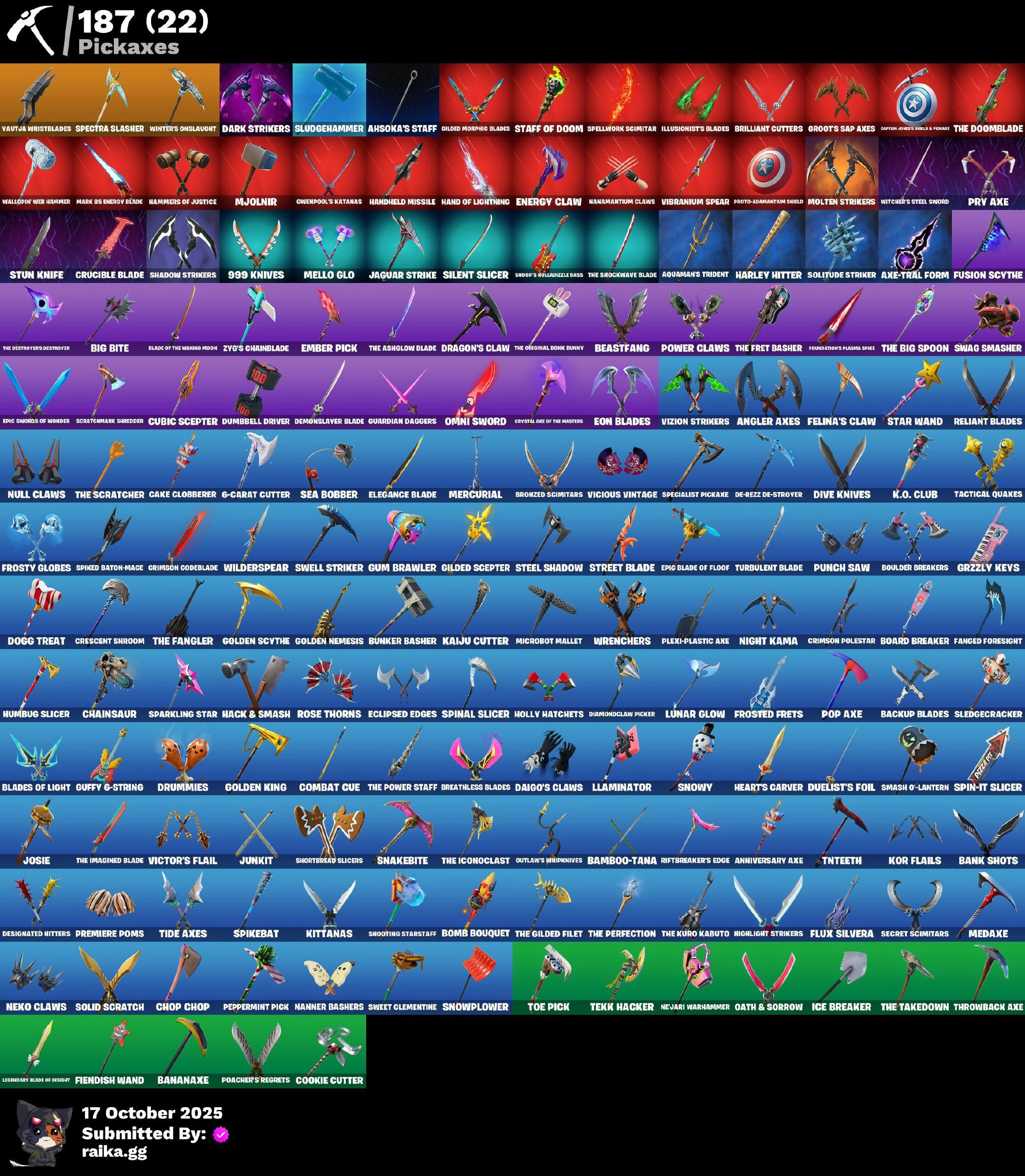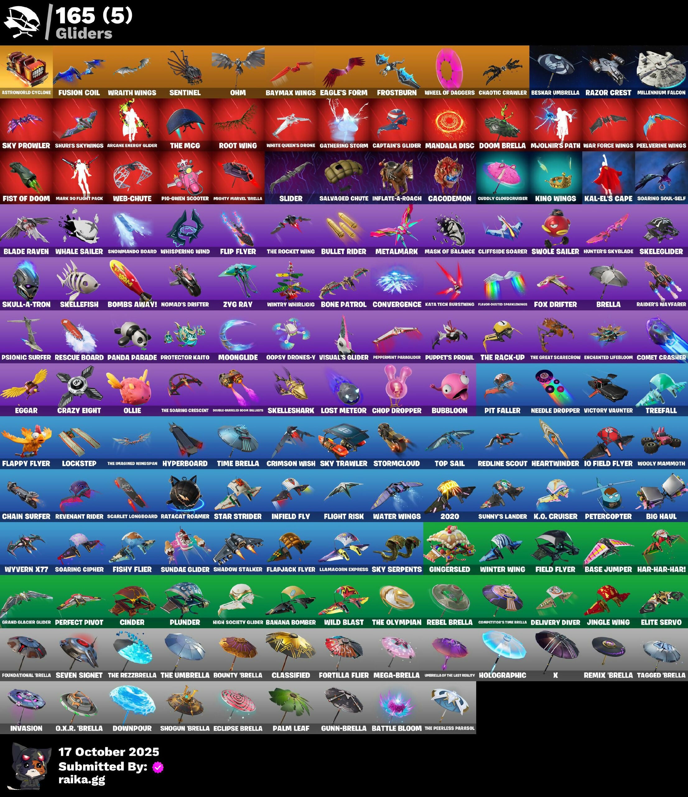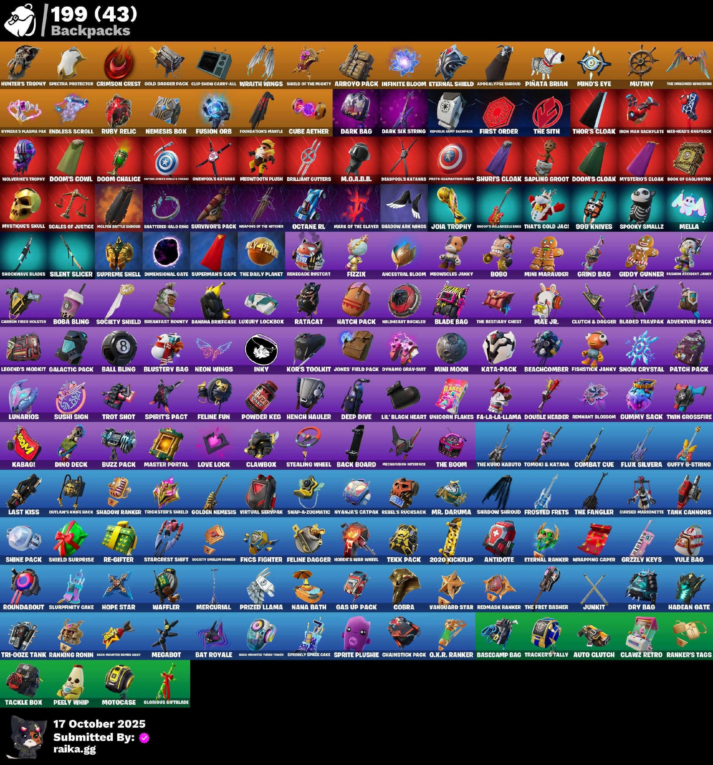 'I'm Ready!', (Snikt!), 1-Ball, 2.0's Revenge, 2020, 2020 Kickflip, 6-Carat Cutter, 8-Ball, 8-Ball Vs Scratch, 999 Knives, A Warrior Prepares, A.L.T.E.R., Abduction, Acolyte's Curse, Adventure Pack, Aerial, Aerial Classic, Aerial Swagger, Afterparty, Agent Jones, Agent Jones (Jump 31), Agent Nana, Agent Peely, Ahsoka Tano, Ahsoka's Staff, Air Shredder, All-Nighter, Ancestral Bloom, Angler Axes, Anniversary Axe, Antidote, Antonia, Antonia In Action, Apocalypse Shroud, Aquaman, Aquaman’s Trident, Arcade Cat, Arcane Energy Glider, Arcane Steel, Arctic Adeline, Arroyo Pack, Arthur Curry, Astro Antidote, Astro Armor, Astro Jack, Astroworld Cyclone, Auntie Dot, Aura, Auto Clutch, Axe-Tral Form, Azarath Metrion Zinthos!, Babygirl!!!, Back Board, Backup Blades, Balance Board, Ball Bling, Bamboo-Tana, Banana Bomber, Banana Briefcase, Bananaxe, Bank Shots, Banner, Banner Icon, Base Jumper, Baseball, Basecamp Bag, Bat Royale, Batman, Battle Bloom, Bawk Off, Baymax Wings, Beachcomber, Bean Bag, Beastfang, Beef Blade, Beep Beep, Bees!, Behold!, Belt It!, Berserker Barrage, Beskar, Beskar Umbrella, Big Bite, Big Guns, Big Haul, Bike To Go, Birthday Bud, Black Hole, Black Panther (Shuri), Black Queen, Blackheart, Blade Bag, Blade Raven, Blade of the Waning Moon, Bladed Travpak, Blades of Light, Blasted, Blocko, Blustery Bag, Board Breaker, Boba Bling, Boba Snack, Bobo, Boing!, Bomb Bouquet, Bombastic Winterfest, Bombs Away!, Bone Patrol, Boobytrapped, Boogie Down, Book Of Cagliostro, Boomin', Boots'n Cats, Both Eyes Open, Boulder Breakers, Bounty 'Brella, Breakfast Bounty, Breakin', Breathless Blades, Brella, Brilliant Cutters, Bring It Around, Bronzed Scimitars, Brute Competitor, Brutus, Bubbloon, Bullet Rider, Bulletproof, Bunker Basher, Burning Ambition Valeria, Burning Dragon, Bushie Bright, Buzz Pack, By The Horns, CG Snakes, Cacodemon, Cake Clobberer, Calico, Call Me, Callsign Skull, Cameo, Cameo Vs Chic, Camo War Machine, Cap Kick, Captain America, Captain Jones, Captain Jones (Pen & Ink), Captain Jones's Shield & Pickaxe, Captain Llamerica, Captain's Glider, Carbon Fiber Holster, Carbon Scarlet, Card Drop, Cardistry, Cash Grab, Cauldron Chill, Cerberus Bite, Cerberus Medallion, Chain Surfer, Chainsaur, Chainstick Pack, Chalked Up 1-Ball, Challenger Menace - Flame, Chaos Directive, Chaos Director, Chaotic Crawler, Charlotte, Charlotte's Logo, Chef's Special, Chibi, Chic, Chicken Wing It, Chillshot, Chimichanga!, Chimpianski Wants You, Choice Knit, Chomp Cudi!, Choose Naughty, Chop Chop, Chop Dropper, Choppy, Cinder, Clark Kent, Classic Peelverine, Classic Wolverine, Classified, Clawbox, Clawz Retro, Clean Sweep, Cliffside Soarer, Clip Show Carry-All, Cloudburst, Cluck, Cluck (Slurpy), Clucking Mad, Clutch & Dagger, Cobra, Coconuts, Coin Flip, Combat Cue, Combat Elite, Combat Giller, Comet, Comet Crasher, Compass, Competitor's Time Brella, Confetti, Conga, Conjure Weapon, Conjuring Mysterio, Controlled Chaos, Controller Crew, Convergence, Cookie Cutter, Coral Crush, Corrupted, Courageous Mikasa, Cowboy Chat, Crabby King, Crack It, Crashed Chiller, Crashed Shield, Crazy Eight, Crescent Shroom, Crimson Codelade, Crimson Crest, Crimson Polestar, Crimson Wish, Crowning Achievement, Crucible Blade, Crystal Axe of the Masters, Cube Aether, Cube Marking, Cubic Scepter, Cuddly Cloudcruiser, Curling Iron, Cursed, Cursed Marionette, Cyclo Curl, D.C. 63, Dagger Dance, Daigo, Daigo's Claws, Dance Mat, Dance Monkey, Dark Angular Shift, Dark Bag, Dark Bomber, Dark Gwenpool, Dark Power Chord, Dark Six String, Dark Strikers, Daughter Of Trigon, De-Rezz De-Stroyer, Deadpool, Deadpool's Katanas, Deep Dab, Deep Dive, Deep Future, Deku, Delivery Diver, Demons Beware, Demonslayer Blade, Denim Destiny, Designated Hitters, Destroyer Signature, Determined Kendo, Determined Renegade, Diamond Diva, Diamond Shapes, Diamond Throne, Diamondclaw Picker, Dice Roll, Dimensional Gate, Dino Deck, Direct The Chaos, Diva's Grin, Dive Knives, Do The Split, Doctor Doom, Doctor Strange, Dogg Treat, Doggo, Dolphin, Doom, Doom Brella, Doom Chalice, Doom Slayer, Doom's Cloak, Doom's Cowl, Doom's Domain, Double Header, Double-Barreled Boom Ballasts, Downpour, Doze Dab, Dragon Stance, Dragon's Claw, Driftwood, Drones-Y View, Droop, Droopy, Dropout, Drummies, Dry Bag, Duelist's Foil, Dumbbell Driver, Dumbell Driver, Dusty, Dyna-Boom!, Dynamic Tntina, Dynamite, Dynamo, Dynamo Grav-Suit, Dynamo Tntina, Dynamo Tntoon-A, E.G.O., Eagle, Eagle's Form, Eclipse Brella, Eclipsed Edges, Eggar, Electro Swing, Elegance Blade, Elite Servo, Ember Pick, Emma Frost, Emma's Influence, Enchanted Lifebloom, Endless Scroll, Energy Claw, Eon Blades, Epic Blade of Floof, Epic Swords of Wonder, Erisa, Erisa Alert, Erisa's Crest, Eternal Emblem, Eternal Knight, Eternal Ranker, Eternal Shield, Evasive Maneuvers, Everything's Fine, Evie, Exile's Emblem, Expressionism, Eye Of Agamotto, FNCS Fighter, Fa-La-La-Llama, Fabio Sparklemane, Fade, Fade Out, Falling Leaf, Falling Snow, Fancy Peter Griffin, Fanged Foresight, Fashion Accident Janky, Felina, Felina's Claw, Feline Dagger, Feline Fun, Ferocious, Field Flyer, Fiendish Wand, Final Eclipse, Final Harbinger, Fireworks Salvo, First Order, Fish Hook, Fish Thicc, Fishbone, Fishstick Janky, Fishy Flier, Fist, Fist Bump, Fist Of Doom, Fizzix, Flaky Feast, Flapjack Flyer, Flappy Flyer, Flashback Breakdown, Flavor-Dusted Sparklewings, Flight Risk, Flip Flyer, Flippin' Away, Flippin' Sexy, Flux Silvera, Foil Flex, Fortilla Flier, Foundation's Mantle, Foundational, Foundational 'Brella, Foundations Plasma Spike, Fox Drifter, Frost Squad, Frostburn, Frosted, Frosted Frets, Frosty Globes, Fryangles, Fully Charged Drift, Fusion, Fusion Coil, Fusion Orb, Fusion Scythe, Galactic Pack, Gangnam Style, Gas Up Pack, Gathering Storm, Gear Specialist Maya, Geared Up, Geralt, Geralt Of Rivia, Giddy Gunner, Gila Classic, Gilded Morphic Blades, Gilded Scepter, Ginger Gunner, Gingersled, Glorious Giftblade, Glory To Latveria, Glyph Master,
