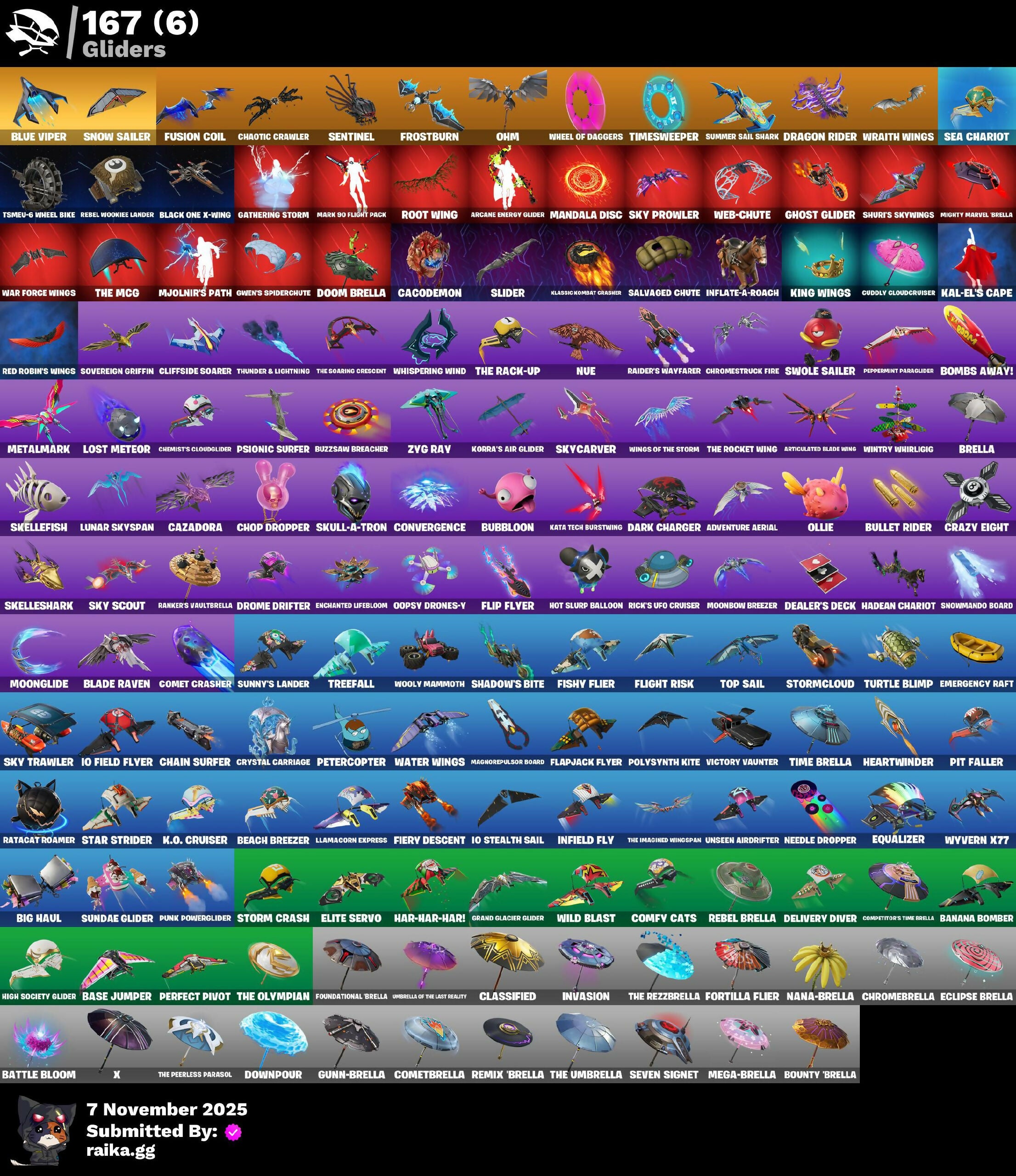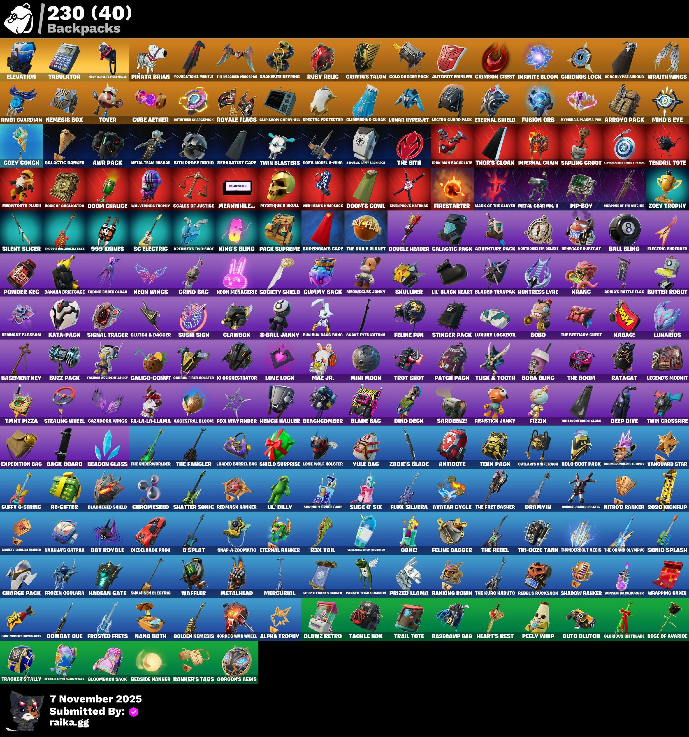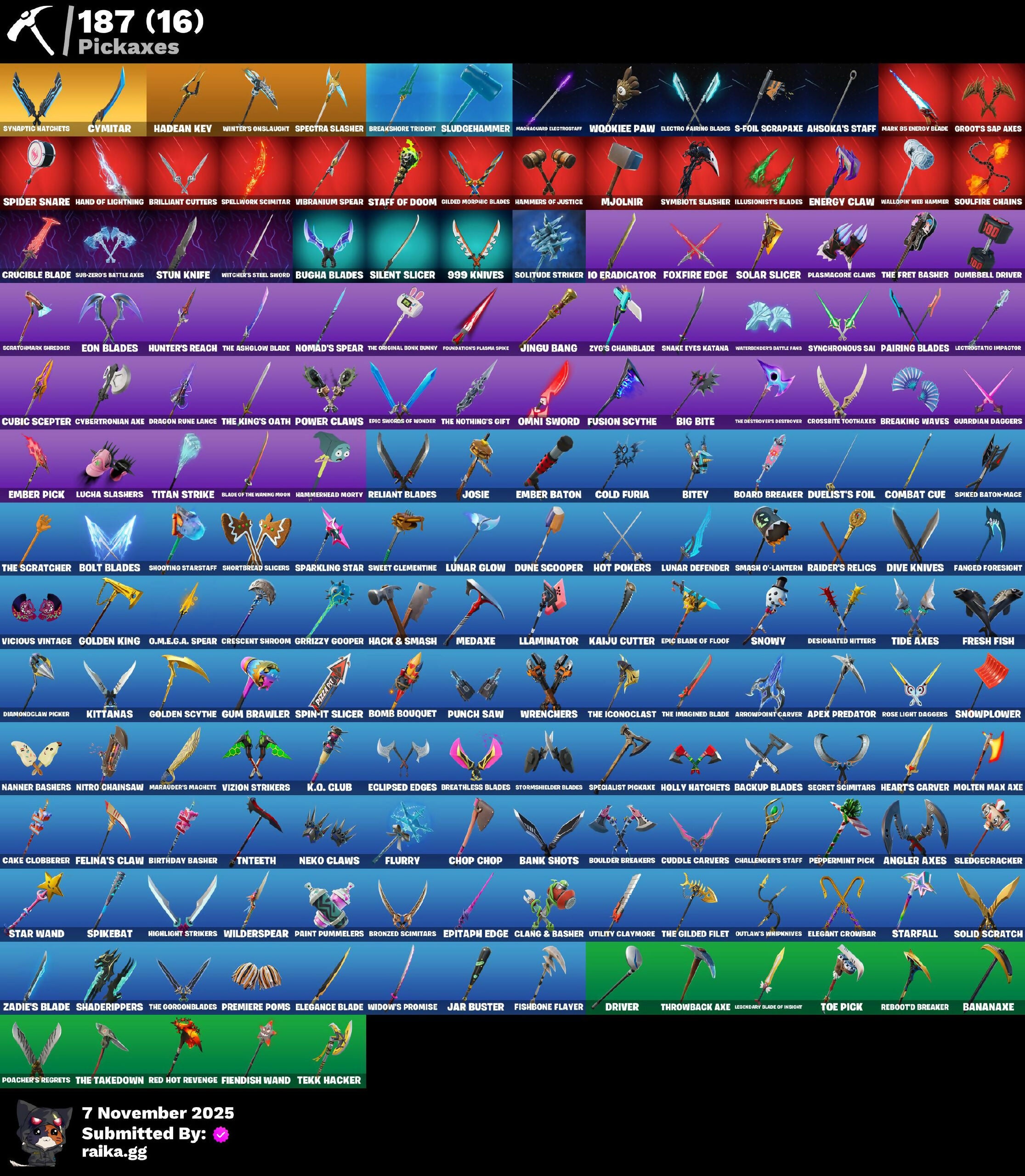 1-Ball, 2.0's Revenge, 2020 Kickflip, 2022, 8-Ball, 8-Ball Janky, 8-Ball vs Scratch, 999 Knives, A.L.T.E.R., AWR Pack, Abduction, Ace Pilot Poe, Adira, Adira's Armor, Adira's Battle Flag, Adventure Aerial, Adventure Pack, Aerial, Afterparty, Agent Jones, Agent Nana, Agent Peely, Ahsoka Tano, Ahsoka's Staff, Air Shredder, All-Nighter, Alpha Trophy, Amazing Cube, Ancestral Bloom, Angler Axes, Antidote, Antonia, Antonia In Action, Apex Predator, Aphrodite, Apocalypse Shroud, Apprentice Evie, Aquaman, Arachrobatics, Arcade Cat, Arcane Energy Glider, Arcane Steel, Arctic Achiever, Arctic Adeline, Arrowpoint Carver, Arroyo Pack, Artemis, Articulated Blade Wing, Astro Armor, Aura, Aurelian, Auto Clutch, Autobot, Autobot Emblem, Avatar Cycle, Avatar's Flourish, Avengers, Avengers Logo, B Splat, B.R.U.T.E. Competitor, Babygirl!!!, Back Board, Back-Rooted Bombs Away, Backup Blades, Balance Board, Balanced, Ball Bling, Banana Bomber, Banana Briefcase, Bananaxe, Bank Shots, Baron Kane, Baron's Hoard, Base Jumper, Baseball, Basecamp Bag, Basement Key, Bat Royale, Batman, Battle Bloom, Battle Mode, Battle Ready Era, Battle Ready Poe, Battle-Tested, Beach Breezer, Beachblasted Swami's Takk, Beachcomber, Beacon Glass, Beamers, Bear Hug, Beatzbunny, Bedside Manner, Beep Beep, Bees!, Berserker Barrage, Big Bite, Big Fan, Big Flake, Big Guns, Big Haul, Birthday Basher, Birthday Bud, Birthday Dash, Bitey, Bitter Sweets, Black Hole, Black Leader, Black One X-Wing, Blackened Shield, Blade Bag, Blade Raven, Blade of the Waning Moon, Bladed Travpak, Blasted, Blaze, Blazing Fire Cerberus, Blizzard Bomber, Blocko, Bloomback Sack, Blowin' Up, Blue Viper, Board Breaker, Boba Bling, Bobo, Boing!, Bolt Blades, Bomb Bouquet, Bombastic Winterfest, Bombs Away!, Boogie Down, Book Of Cagliostro, Boot It, Both Eyes Open, Boulder Breakers, Bounty Brella, Breaking Point, Breaking Waves, Breakshore Trident, Breathless Blades, Brella, Brilliant Cutters, Bring It Around, Brite & Speedy, Bronzed Scimitars, Brutus, Bubbloon, Buffer Fish, Bugha, Bugha Blades, Bullet Rider, Bun Bun Bang Bang, Bun Bun Blast, Bunsen Backburner, Burning Ambition Valeria, Burning Ember, Burning Ember Holster, Bushie Bright, Butter Robot, Buttoned Up, Buzz Pack, Buzzsaw Breacher, By The Horns, Bytes, Bytes' Sigil, Cacodemon, Cake Clobberer, Cake!, Cakey, Calico, Calico Holiday, Calico-Conut, Call Me, Callsign Skull, Cameo, Cameo vs Chic, Cap K.O., Cap Kick, Captain America's Shield, Captain America's Shield & Pickaxe, Captain Slamerica, Carbon Fiber Holster, Card Drop, Cash Grab, Cauldron Chill, Cazadora, Cazadora Wings, Cerberus, Cerberus Bite, Cerberus Medallion, Chain Surfer, Chalked Up 1-Ball, Challenger Cerberus, Challenger's Staff, Chaos Directive, Chaos Director, Chaotic Crawler, Charge Pack, Charlotte's Logo, Chef's Special, Chemist's Cloudglider, Chic, Chillshot, Chimpanski Wants You, Chocolatey, Choice Knit, Chomp Cud!!, Choose Naughty, Chop Chop, Chop Dropper, Choppy, Chrome Marked, Chrome Punk, Chromebrella, Chromeseed, Chromestruck Fire, Chronos Lock, Clang & Basher, Clark Kent, Classic Age, Classic Wolverine, Classified, Clawbox, Clawz Retro, Clean Sweep, Cliffside Soarer, Clip Show Carry-All, Cloud Striker, Cloudburst, Clutch & Dagger, Cobalt Overdrive, Coin Flip, Cold Furia, Collector Kado Thorne, Combat Cue, Combat Elite, Combat Giller, Comet, Comet Crasher, Cometbrella, Comfy Cats, Competitor Medusa, Competitor Rust, Competitor's Time Brella, Conch Call, Confetti, Conjure Weapon, Contour Camo, Controlled Chaos, Convergence, Coral Crush, Corrosive Stripe, Corrupted, Coruscant Guard, Count It!, Courageous Mikasa, Cowboy Chat, Cozy Conch, Crabby King, Crack It, Crashed Chiller, Crashed Shield, Crazy Eight, Crescent Shroom, Crimson Crest, Cross Your Heart, Crossbite Toothaxes, Crowning Achievement, Crucible Blade, Crystal Carriage, Cube Aether, Cubed, Cubic Scepter, Cuddle Carvers, Cuddles’ Garden, Cuddly Cloudcruiser, Cybertronian Axe, Cyclo Curl, Cyvitar, D.C. 63, Dagger Dance, Daisies, Dark Charger, Datafriser Chargepack, Datapad Charquack, Dawn Duelist Nisha, Deadpool, Deadpool's Katanas, Dealer's Deck, Deep Dive, Deep Future, Delivery Diver, Demons Beware, Denim Destiny, Designated Hitters, Destroyer Signature, Determined Korra, Determined Renegade, Diamond Shapes, Diamond Throne, Diamondclaw Picker, Dice Roll, Dieselback Pack, Dino Deck, Direct The Chaos, Diva’s Grin, Dive Knives, Do The Split, Doctor Doom, Doctor Slone, Doctor Strange, Doggo, Dolphin, Don Of The Wastes, Doom Brella, Doom Chalice, Doom Slayer, Doom's Cowl, Doomrunner's Trophy, Double Header, Downpour, Doze Dab, Dragon Rider, Dragon Rune Lance, Dragon Rune Lances, Dragon Spirit, Dramatic Flares, Dramyin, Dreamer's Two-Shot, Driver, Drome Drifter, Drones-y View, Droop, Dropout, Duelist's Foil, Dumbbell Driver, Dumbell Driver, Dune Scooper, Dusty, Dyna-Boom!, Dynamic Tntna, Dynamite, Dynamo, Dynamo TNTina, E.G.O., Easter Egg, Eclipse Brella, Eclipsed Edges, Electric Shredder, Electro Pairing Blades, Elegance Blade, Elegant Crowbar, Elemental Cycle, Elevation, Elite Servo, Elysium, Ember Baton, Ember Pick, Emergency Raft, Emma’s Influence, Empress Fan Dance, Enchanted Lifebloom, Energy Claw, Eon Blades, Epic Blade of Floof, Epic Swords of Wonder, Epitaph Edge, Equalizer, Era, Eren Jaeger, Eren’s Faceoff, Erisa, Erisa Alert, Erisa's Crest, Escapees, Eternal Emblem, Eternal Hunt, Eternal Knight, Eternal Ranker, Eternal Shield, Everything’s Fine, Evie, Exile's Emblem, Expedition Bag, Expressionism, Eye Of Agamotto, Fa-La-La-Llama, Fade, Fade Out, Fading Ember Cloak, Falling Leaf, Falling Snow, Fan Attack, Fancy Peter Griffin, Fang Dance, Fanged Foresight, Fashion Accident Janky, Feel The Force, Felina, Felina's Claw, Feline Dagger, Feline Fun, Ferocious, Fiendish Wand, Fiery Descent, Final Eclipse, Final Harbinger, Firestarter, Fish Hook, Fish Thicc, Fishbone, Fishbone Flayer, Fishstick Janky, Fishy Flier, Fist, Fixer, Fizzik, Fizzix, Flaky Feast, Flapjack Flyer, 